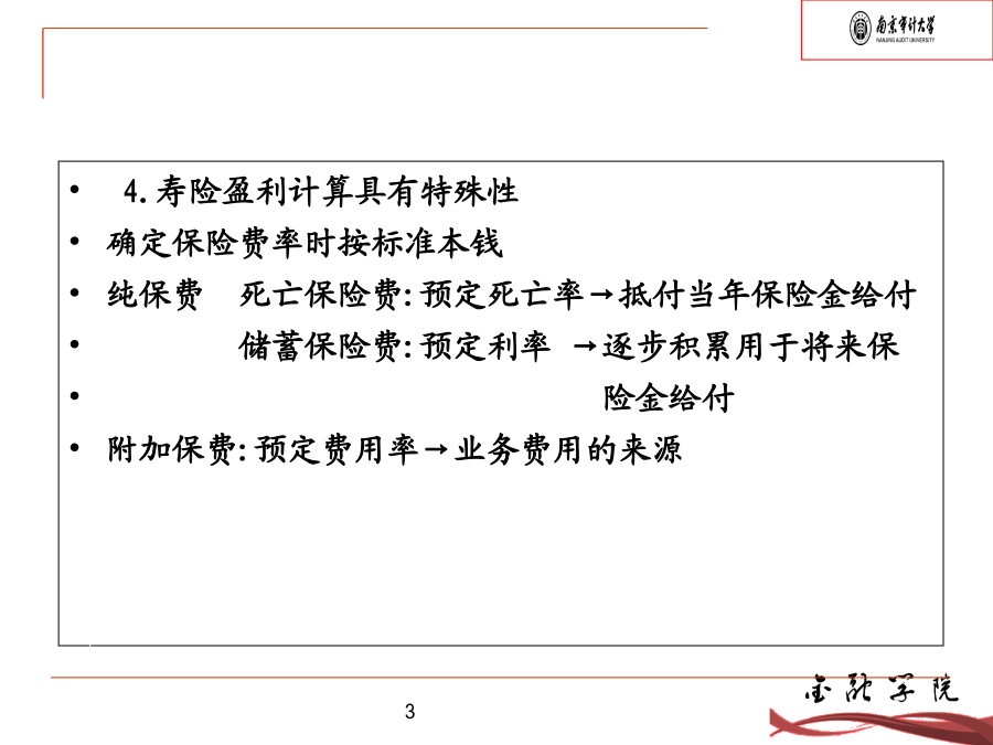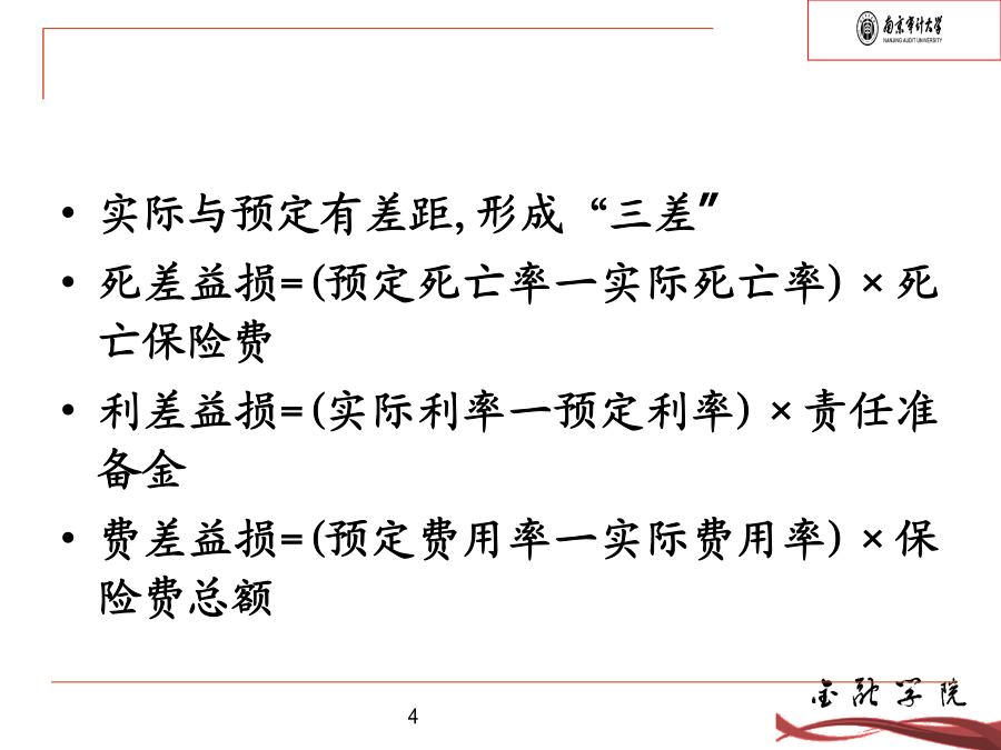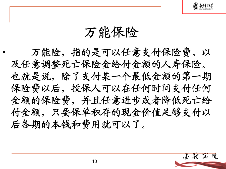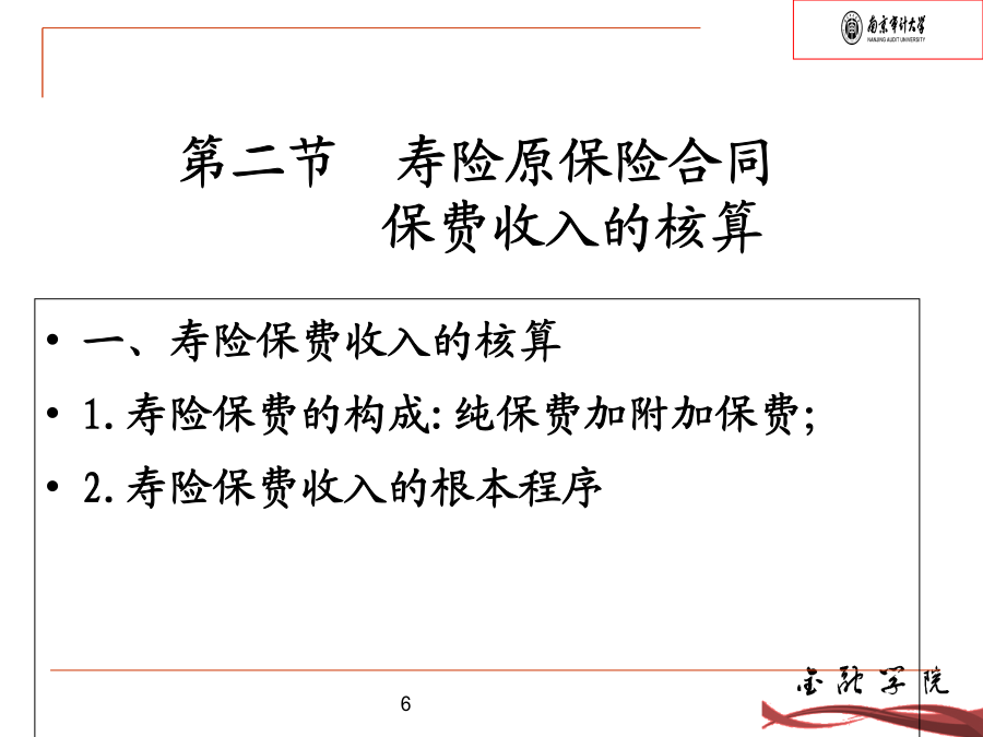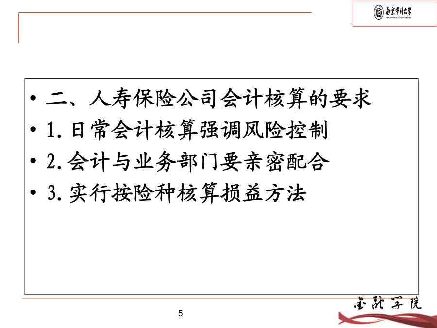 第五章寿险原保险合同的核算第一节寿险原保险合同的核算特点和要求4.寿险盈利计算具有特殊性确定保险费率时按标准本钱纯保费死亡保险费:预定死亡率→抵付当年保险金给付储蓄保险费:预定利率→逐步积累用于将来保险金给付附加保费:预定费用率→业务费用的来源二、人寿保险公司会计核算的要求1.日常会计核算强调风险控制2.会计与业务部门要亲密配合3.实行按险种核算损益方法第二节寿险原保险合同保费收入的核算保费收入的业务程序〔2〕分红保险合同保费收入确实认分红保险合同向保险人转移了保险风险,认定为保险合同。与普通寿险类似,在满足保费收入确认条件时,确认保费收入。万能保险和投资连结保险属于金融工具万能保险连结保险〔1〕实收保费的核算借:库存现金(银行存款)贷:保费收入〔2〕预收保费的核算预收保费时:借:库存现金(银行存款)贷:保费收入预收保费〔3〕应收保费对于寿险保费,保单宽限期内欠缴的保费,作应收保费处理。实际收到且属于约定金额范围的保费时冲减应收保费。保单失效后,将应收保费冲减当期保费收入。同时,将冲减的应收保费和超过宽限期后的应收保费转作表外工程核算。收到首期保费时:借:银行存款〔库存现金〕贷:保费收入宽限期内保户欠缴保费时:借:应收保费贷:保费收入收到欠缴保费时:借:银行存款〔库存现金〕贷:应收保费(4)失效保单收入宽限期外仍未补缴保费及利息的保单丧失保单效力,二年内补缴,保单可以恢复效力。借:银行存款〔库存现金〕贷:保费收入利息收入(5)自动垫缴保费假如保单保费已有现金价值,假如投保人逾期未继续缴费,保险人按其现金价值自动垫缴,使保单继续有效。垫缴保费不计提佣金,垫缴从应缴日开始计息。公司垫缴保费时:借:垫缴保费贷:保费收入〔6〕趸交保费的核算一次性确认保费收入。年终决算对不属于本年度的保费收入部分通过寿险责任准备金调整。〔7〕追溯保单的核算追溯保单是指保险合同签订日晚于约定生效日期的保单。追溯保单的保费收入应于保险合同成立日确认。在合同签订之前已收取了相关保费的,按照正常的新单承保流程,通过暂收保费进展核算。先签订合同后收取保费的,在合同签订日确认保费收入,在保费实际收取入账日冲减应收保费。第三节寿险原保险合同保险金给付的核算应设置“赔付支出〞科目进展核算。该科目属于损益类〔费用〕科目,该科目应按保险合同和险种设置明细账。保险公司也可单独设置“满期给付〞、“死亡给付〞、“伤残给付〞、“医疗给付〞和“年金给付〞科目进展核算。“死亡给付〞、“伤残给付〞、“医疗给付〞这三个科目也可合并为“死伤医疗给付〞一个科目。给付保险金时:借:赔付支出—××给付贷:银行存款〔库存现金〕如有保单质押贷款未归还:借:赔付支出—××给付贷:保户质押贷款利息收入银行存款〔库存现金〕第四节寿险原保险合同解约金业务的核算支付退保金时:借:退保金贷:银行存款〔库存现金〕如有保单质押贷款未归还:借:退保金贷:保户质押贷款利息收入银行存款〔库存现金〕第五节寿险原保险合同保险准备金的核算四、科目设置1.“保险责任准备金〞负债类科目“保险责任准备金〞科目核算保险人为尚未终止的人寿保险责任提取的准备金。再保险承受人提取的再保险合同寿险责任准备金,也在本科目核算。该科目应按保险合同及险种设置明细账。公司也可以单独设置“寿险责任准备金〞和“长期安康险责任准备金〞科目。2.“提取保险责任准备金〞损益类(费用)科目“提取保险险责任准备金〞科目核算公司按规定对寿险合同提取的责任准备金。再保险承受人提取的再保险合同寿险责任准备金,也在本科目核算。该科目应按保险合同及险种设置明细账。公司也可以单独设置“提取寿险责任准备金〞和“提取长期安康险责任准备金〞科目。五、账务处理经精算部门计算,本期提取寿险责任准备金〔长期安康险责任准备金〕时:借:提取保险责任准备金—提取寿险责任准备金〔长期安康险责任准备金〕贷:保险责任准备金—寿险责任准备金〔长期安康险责任准备金〕保户现调入本地工作,保险公司办理保险关系转移手续时:借:银行存款贷:保费收入保险责任准备金—寿险责任准备金〔长期安康险责任准备金〕第六节分红保险业务的核算二、分红保险收入分配原那么三、分红保险的费用分摊四、分红保险业务收益确实认六、账务处理基层公司收到投资收益后,计入相应分红险种中,借记“存出保证金〞科目,贷记“投资收益〞科目。分红的一般会计处理〔1〕计算出当年应支付的红利,借记“保单红利支出〞科目,贷记“应付保单红利〞、“长期应付款—应付累计生息〞科目。〔2〕红利到期支付,借记“应付保单红利〞科目,贷记“银行存款〞、“保费收入〞等科目。①对于选择现金支付方式的保户,在其保单年生效对应日领取红