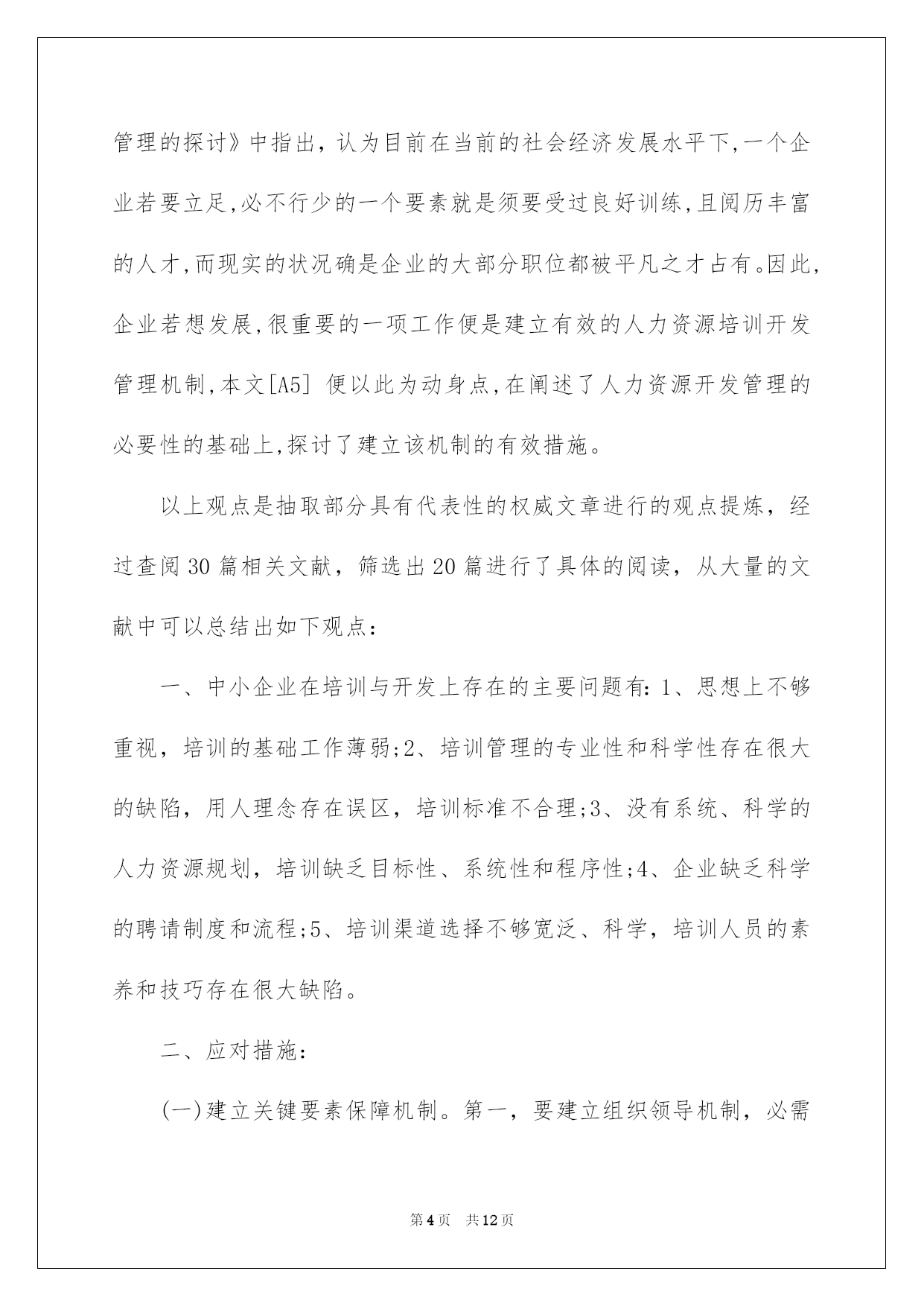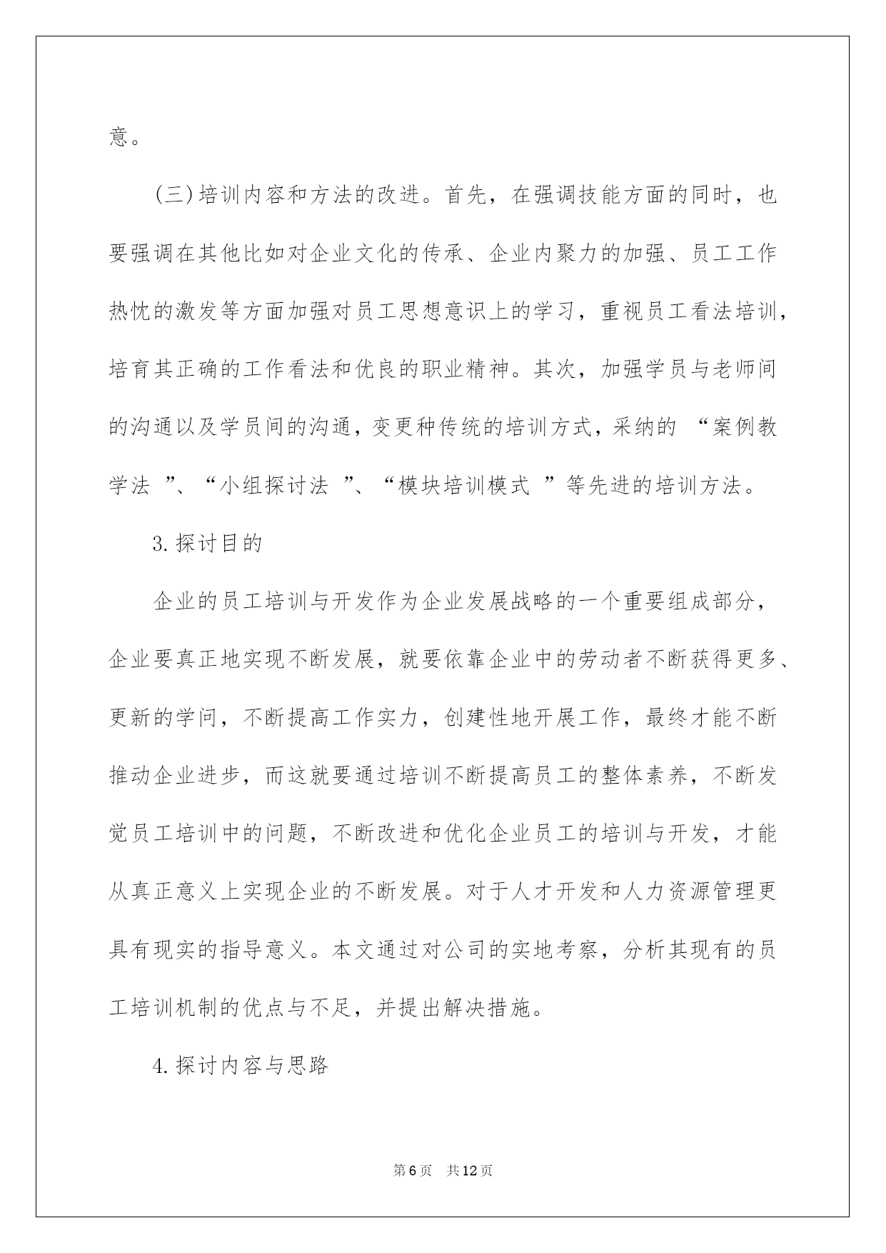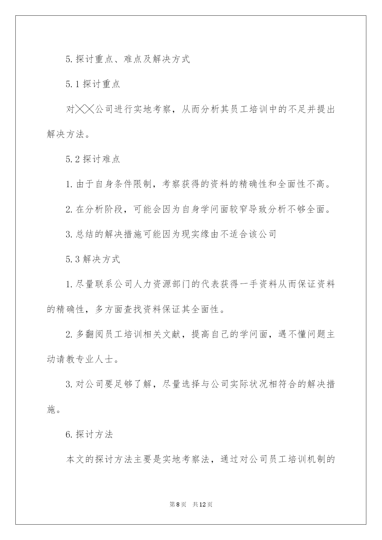 第PAGE\*Arabic\*MERGEFORMAT12页共NUMPAGES\*Arabic\*MERGEFORMAT12页第PAGE\*MERGEFORMAT12页共NUMPAGES\*MERGEFORMAT12页第PAGE\*MERGEFORMAT12页共NUMPAGES\*MERGEFORMAT12页第PAGE\*MERGEFORMAT12页共NUMPAGES\*MERGEFORMAT12页第PAGE\*MERGEFORMAT12页共NUMPAGES\*MERGEFORMAT12页第PAGE\*MERGEFORMAT12页共NUMPAGES\*MERGEFORMAT12页第PAGE\*MERGEFORMAT12页共NUMPAGES\*MERGEFORMAT12页第PAGE\*MERGEFORMAT12页共NUMPAGES\*MERGEFORMAT12页第PAGE\*MERGEFORMAT12页共NUMPAGES\*MERGEFORMAT12页第PAGE\*MERGEFORMAT12页共NUMPAGES\*MERGEFORMAT12页第PAGE\*MERGEFORMAT12页共NUMPAGES\*MERGEFORMAT12页2022员工培训与开发方向开题报告员工培训与开发方向开题报告现代培训与开发是人力资源管理中的一项重要内容,那么大家了解员工培训与开发的开题报告范文是如何的?1.选题背景及意义1.1选题背景进入二十一世纪,经济全球化给我国企业打来了巨大的挑战,随着我国加入WTO和世界经济一体化,企业从来没有象现在那样重视培训。在这种严峻的情形下,╳╳公司如何才能立足并快速占据市场?其关键在于人才,在于拥有一批忠诚、稳定的高素养服务人员和管理人员。企业员工培训,作为干脆提高经营管理者实力水平和员工技能,为企业供应新的工作思路、学问、信息、技能,增长员工才能和敬业、创新精神的根本途径和极好方式,是最为重要的人力资源开发,是比物质资本投资更重要的人力资本投资。人力资源部门作为╳╳公司的重要组成部分,是公司管理的核心和基础。从某种意义上讲,企业的管理主要是通过对人的管理来实现的。因此,人力资源部的工作是╳╳公司能否取得胜利的关键。下面是本论文网站的我搜集的公司员工培训探讨开题报告1.2选题意义员工入职培训,是企业培训工作的一个重要组成部分,是沟通企业与新员工的一座桥梁。员工通过入职培训,能驾驭到任职所需的基本技能,能更快的融入企业文化中,能相识到自己是否真的适合该公司、该岗位,能增加员工对企业的归属感和主子翁责任感;而企业也可通过员工入职培训,来确保新员工进入公司后,能真正的为企业做事,为企业创效益,同时,也可以让企业对员工有进一步的了解,能真正做到用其所长,避其所短,真正达到双赢,促进企业与员工、管理层与员工层的双向沟通,增加企业向心力和凝合力,塑造优秀的企业文化;同时,顺应实事的培训可以使企业更好的适应市场改变从而增加竞争优势,培育企业的后备力气,保持企业永继经营的生命力。松下曾有一句培训名言:“培训是要付出代价的,但没有培训所付出的代价却远远大于要培训所付出的代价!新员工的培训是最好做的,也是最难做的。”从中我们可以看出培训的重要性,特殊是员工入职培训的重要性,所以分析其现状,并提出改进措施有其现实意义。2.文献综述对于许多国内企业来说,培训就是来场讲座、考察学习等快餐式的,很少依据企业自身须要来培训员工,更多的为培训而培训,流于表面。而且,现在中小企业在人才员工培训中依旧存在着诸多问题,导致培训效果不志向。以下是国内、外学者对中小企业员工培训问题探讨的相关观点:1、山东科技高校经管学院[A1]发表的《企业与员工双重视角下的新员工入职培训中的问题探讨》中指出,认为目前新员工入职培训的有效性问题始终是企业培训部门的难题之一,但绝大部分文献仅从企业的角度探讨其中的问题,文章首次从企业与员工的双重视角,对新员工入职培训中的问题进行了分析,指出了企业在新员工培训中存在的八类问题及新员工正确对待培训的方法。2、蚌埠学院发表[A2]的《论基于心理契约的企业员工培训》中指出,认为目前员工培训是保持企业基业长青,获得持续竞争优势的重要途径。本文[A3]从企业员工培训现状入手,基于心理契约理论,提出员工培训动态管理的五点措施。3、长安保险经纪有限公司[A4]发表的《关于人力资源培训开发管理的探讨》中指出,认为目前在当前的社会经济发展水平下,一个企业若要立足,必不行少的一个要素就是须要受过良好训练,且阅历丰富的人才,而现实的状况确是企业的大部分职位都被平凡之才占有。因此,企业若想发展,很