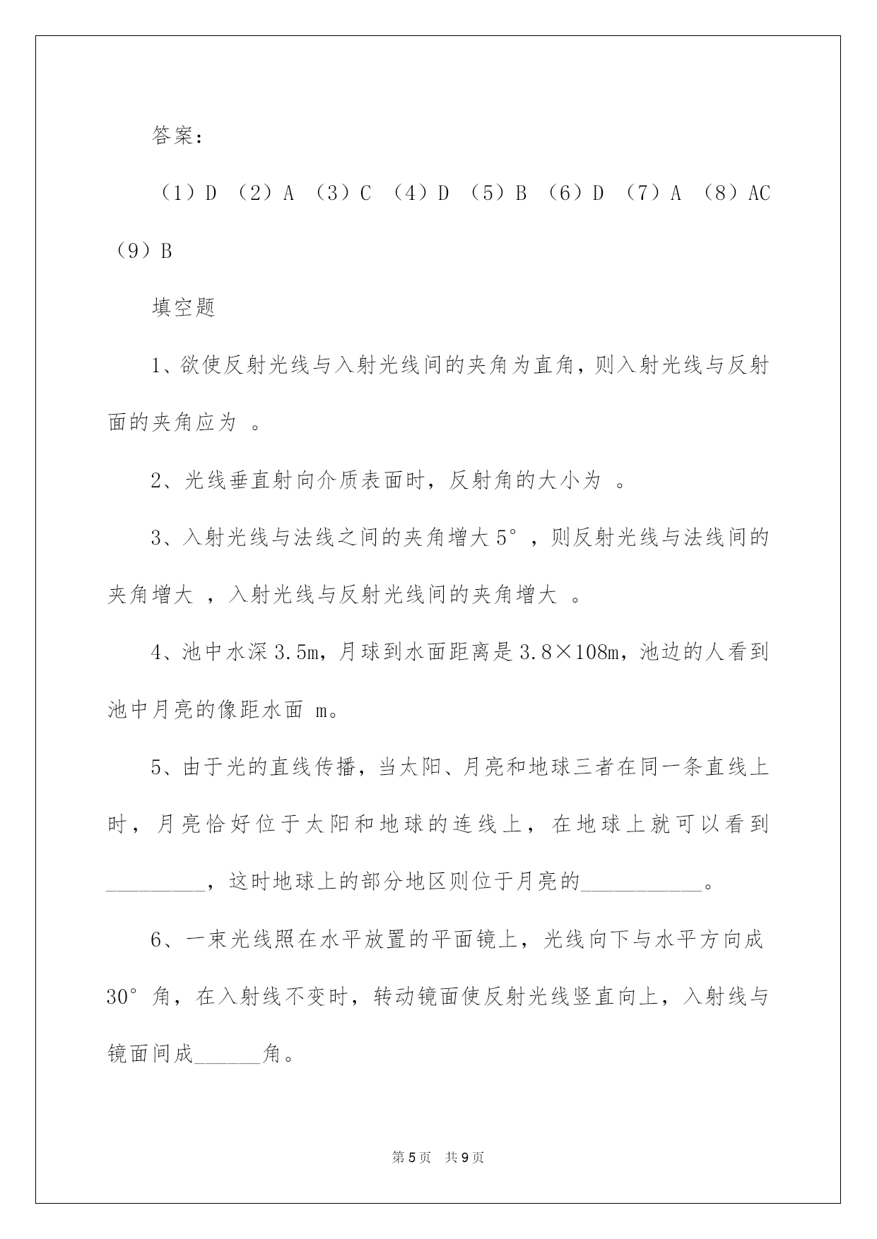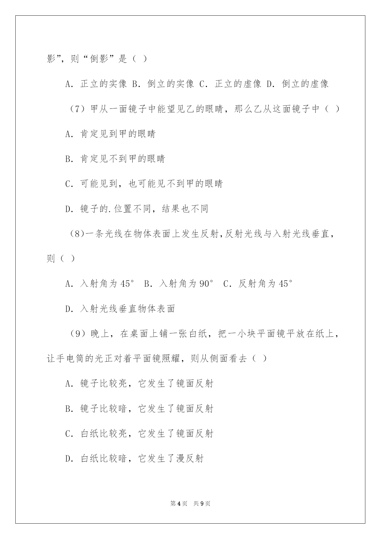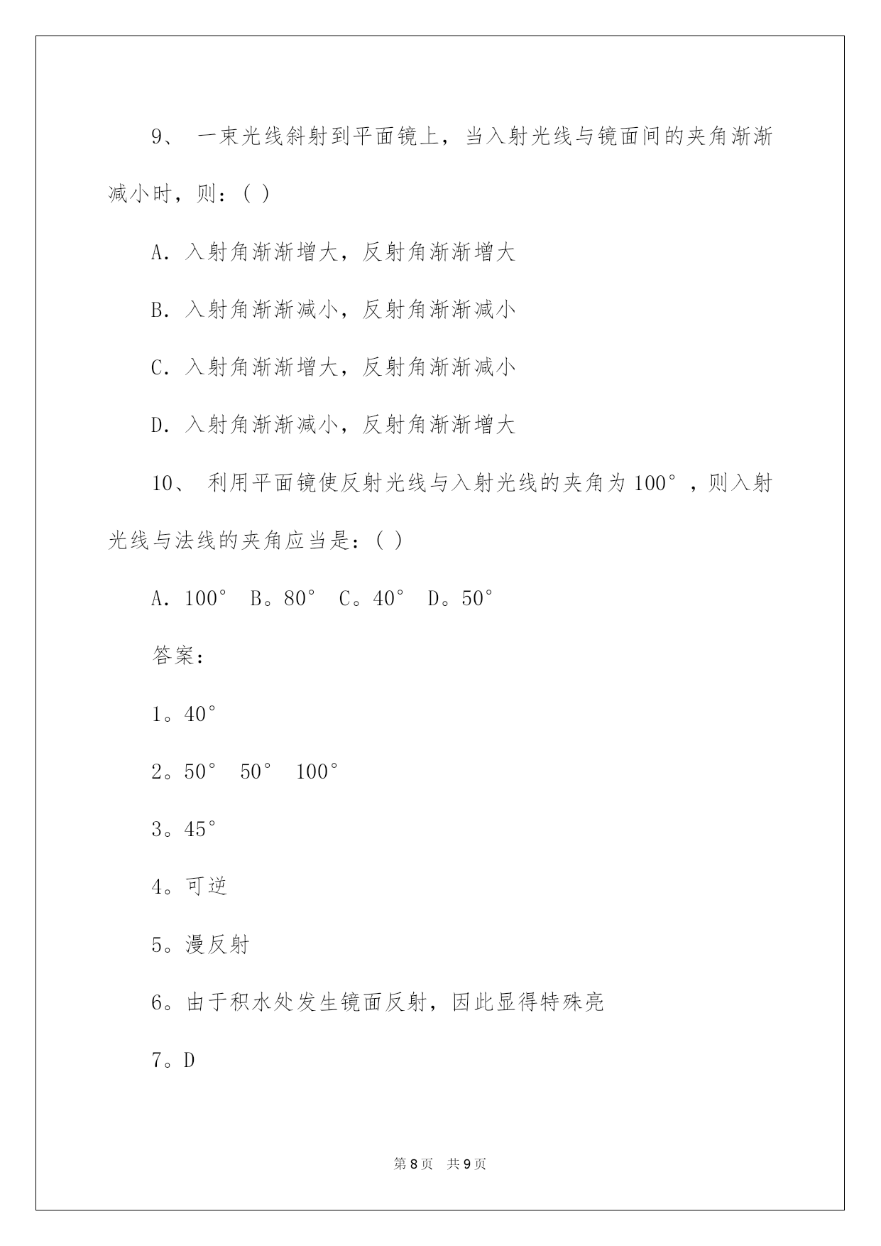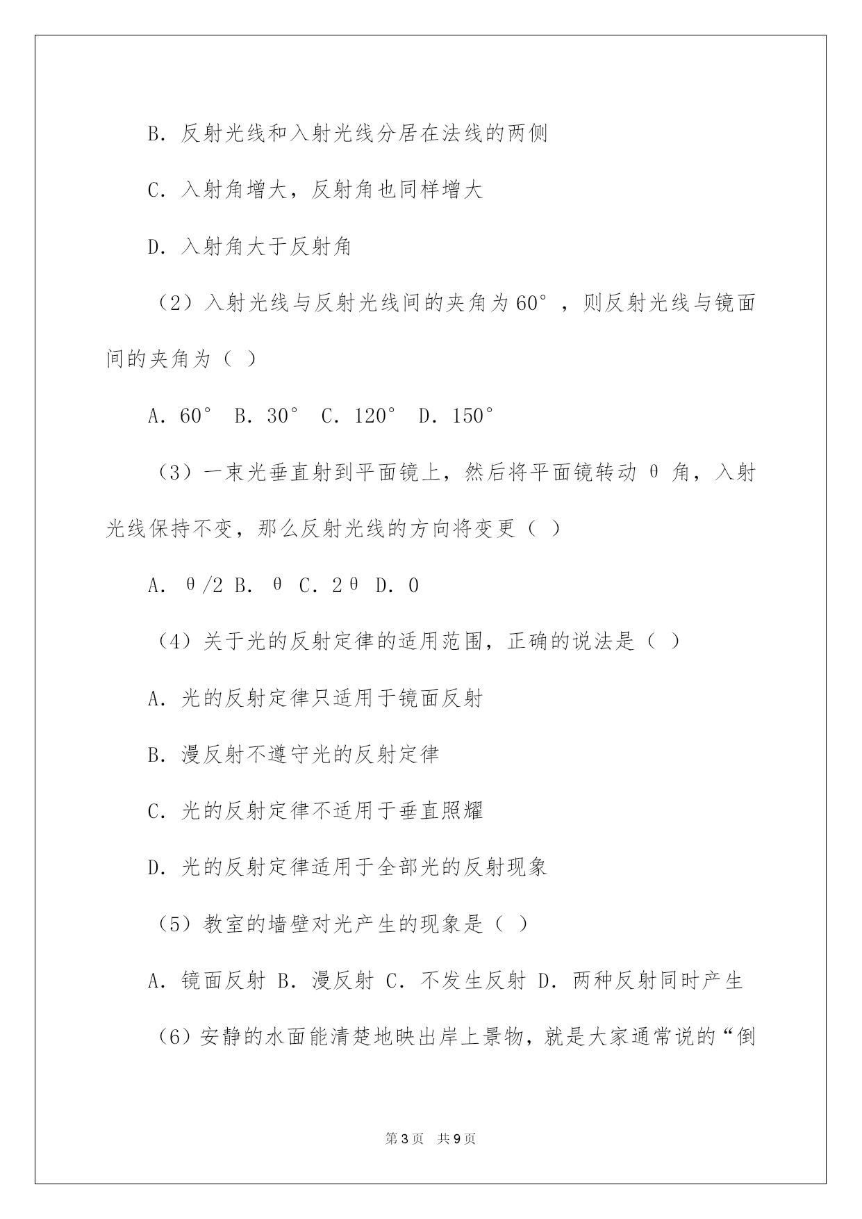 第PAGE\*Arabic\*MERGEFORMAT9页共NUMPAGES\*Arabic\*MERGEFORMAT9页第PAGE\*MERGEFORMAT9页共NUMPAGES\*MERGEFORMAT9页第PAGE\*MERGEFORMAT9页共NUMPAGES\*MERGEFORMAT9页第PAGE\*MERGEFORMAT9页共NUMPAGES\*MERGEFORMAT9页第PAGE\*MERGEFORMAT9页共NUMPAGES\*MERGEFORMAT9页第PAGE\*MERGEFORMAT9页共NUMPAGES\*MERGEFORMAT9页第PAGE\*MERGEFORMAT9页共NUMPAGES\*MERGEFORMAT9页第PAGE\*MERGEFORMAT9页共NUMPAGES\*MERGEFORMAT9页第PAGE\*MERGEFORMAT9页共NUMPAGES\*MERGEFORMAT9页第PAGE\*MERGEFORMAT9页共NUMPAGES\*MERGEFORMAT9页第PAGE\*MERGEFORMAT9页共NUMPAGES\*MERGEFORMAT9页2022初中物理中考的压轴题初中物理中考的压轴题精选光的反射练习题推断题(1)树在河里形成的倒影,树在地面形成的影子本质上没有区分.()(2)发生漫反射时,反射光线,入射光线和法线也在同一平面内.()(3)雨后晴朗的夜晚,人迎着或背着月光走时,看到地上发亮处都应是水.()答案:(1)×(2)√(3)×填空题(1)入射光线与镜面夹角是60°,入射光线与反射光线的夹角是_______.若入射角增大10°,则入射光线与反射光线的夹角变更了_______.(2)太阳光线与水平面成45°角,现用一平面镜把太阳光线反射到竖直向下的水井中,则平面镜镜面与水平面的夹角为_______.(3)光的反射有___________和___________两种.我们能从不同方向看到本身不发光的物体,是因为光在物体表面上发生_____反射的原因;在教室里,因“反光”从某个角度看不清黑板上的字,这是光的__________现象.(4)以相等的入射角射到镜面上某点的光线可以有______条,以某一角度入射到镜面上某点的一条光线,有______条反射光线.(5)一束光线垂直射向平面镜,反射角是______.答案:(1)60°,20°(2)67.5°(3)镜面反射,漫反射,漫,镜面反射(4)多数,一(5)0°(6)75°,130°选择题(1)关于光的反射,下列说法错误的是()A.反射光线跟入射光线和法线在同一平面内B.反射光线和入射光线分居在法线的两侧C.入射角增大,反射角也同样增大D.入射角大于反射角(2)入射光线与反射光线间的夹角为60°,则反射光线与镜面间的夹角为()A.60°B.30°C.120°D.150°(3)一束光垂直射到平面镜上,然后将平面镜转动θ角,入射光线保持不变,那么反射光线的方向将变更()A.θ/2B.θC.2θD.0(4)关于光的反射定律的适用范围,正确的说法是()A.光的反射定律只适用于镜面反射B.漫反射不遵守光的反射定律C.光的反射定律不适用于垂直照耀D.光的反射定律适用于全部光的反射现象(5)教室的墙壁对光产生的现象是()A.镜面反射B.漫反射C.不发生反射D.两种反射同时产生(6)安静的水面能清楚地映出岸上景物,就是大家通常说的“倒影”,则“倒影”是()A.正立的实像B.倒立的实像C.正立的虚像D.倒立的虚像(7)甲从一面镜子中能望见乙的眼睛,那么乙从这面镜子中()A.肯定见到甲的眼睛B.肯定见不到甲的眼睛C.可能见到,也可能见不到甲的眼睛D.镜子的.位置不同,结果也不同(8)一条光线在物体表面上发生反射,反射光线与入射光线垂直,则()A.入射角为45°B.入射角为90°C.反射角为45°D.入射光线垂直物体表面(9)晚上,在桌面上铺一张白纸,把一小块平面镜平放在纸上,让手电筒的光正对着平面镜照耀,则从侧面看去()A.镜子比较亮,它发生了镜面反射B.镜子比较暗,它发生了镜面反射C.白纸比较亮,它发生了镜面反射D.白纸比较暗,它发生了漫反射答案:(1)D(2)A(3)C(4)D(5)B(6)D(7)A(8)AC(9)B填空题1、欲使反射光线与入射光线间的夹角为直角,则入射光线与反射面的夹角应为。2、光线垂直射向介质表面时,反射角的大小为。3、入射光线与法线之间的夹角增大5°,则反射光线与法线间的夹角增大,入射光线与反射光线间的夹角增大。4、池中水深3.5m,月球到水面距离是3.8×108m,池边
