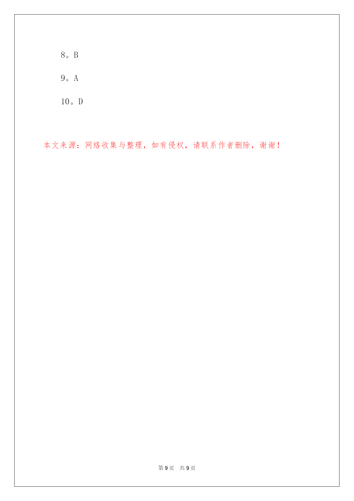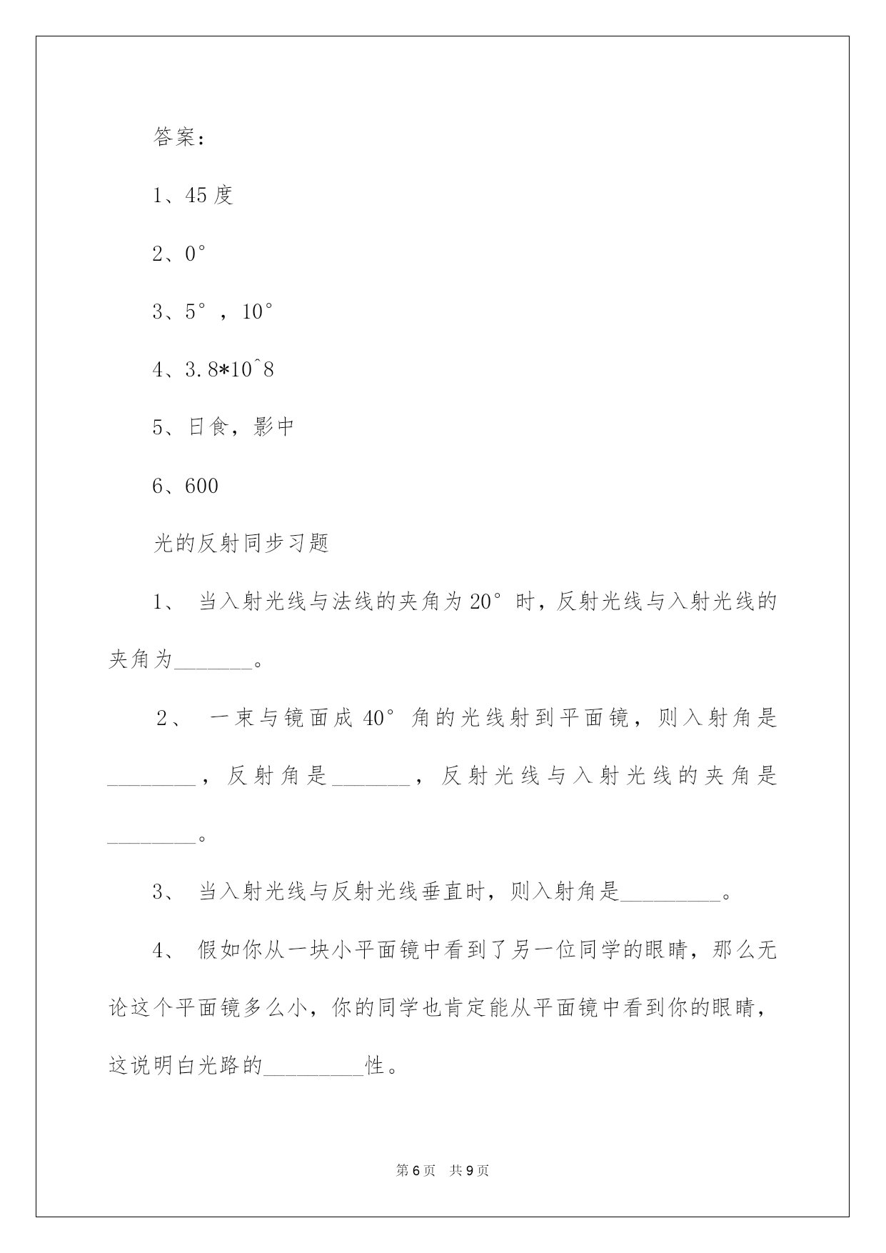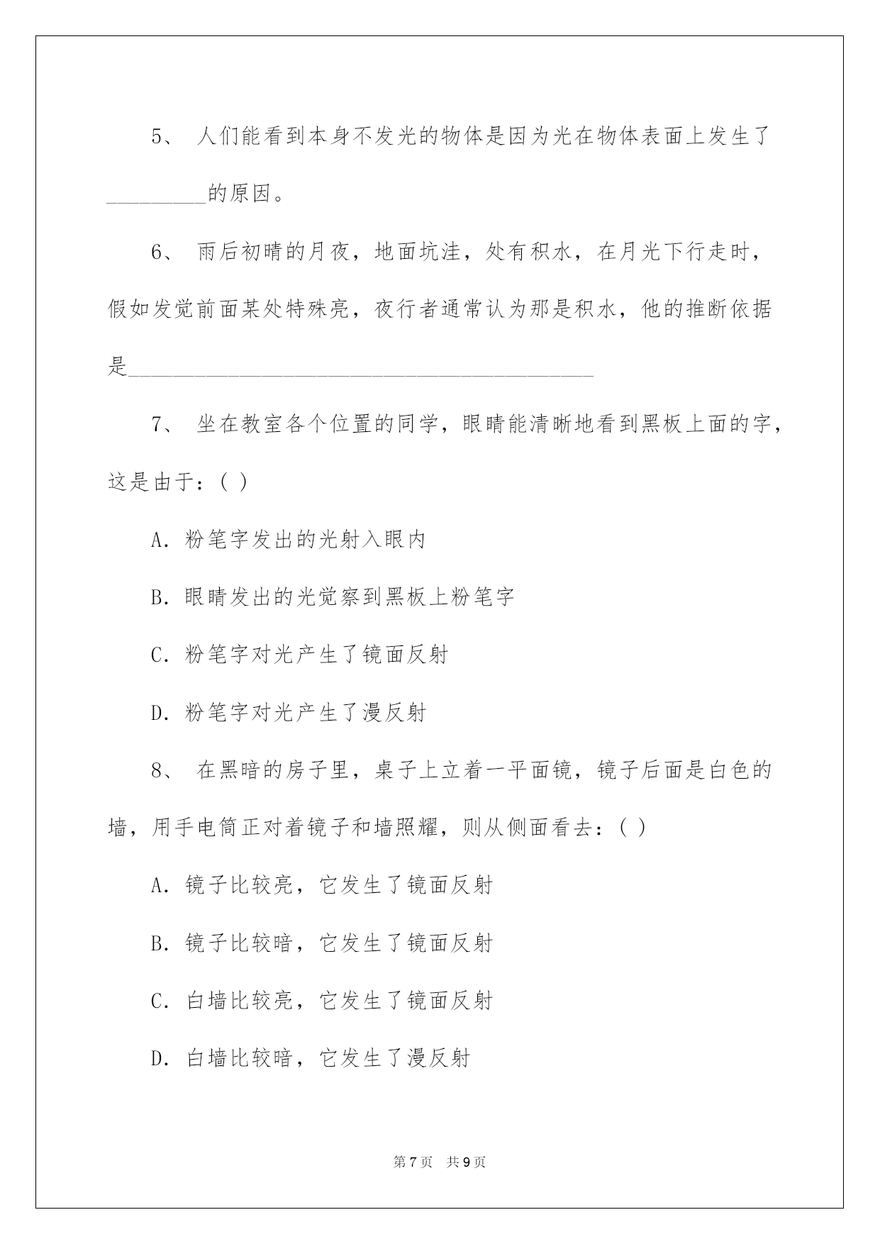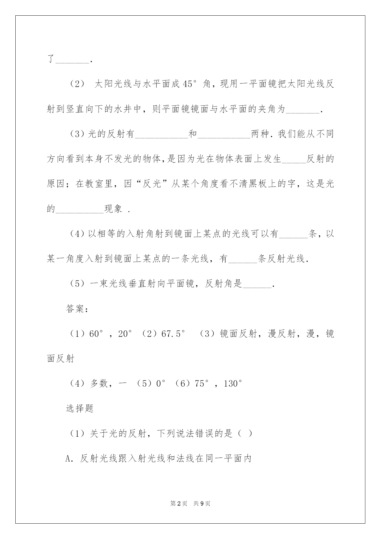 第PAGE\*Arabic\*MERGEFORMAT9页共NUMPAGES\*Arabic\*MERGEFORMAT9页第PAGE\*MERGEFORMAT9页共NUMPAGES\*MERGEFORMAT9页第PAGE\*MERGEFORMAT9页共NUMPAGES\*MERGEFORMAT9页第PAGE\*MERGEFORMAT9页共NUMPAGES\*MERGEFORMAT9页第PAGE\*MERGEFORMAT9页共NUMPAGES\*MERGEFORMAT9页第PAGE\*MERGEFORMAT9页共NUMPAGES\*MERGEFORMAT9页第PAGE\*MERGEFORMAT9页共NUMPAGES\*MERGEFORMAT9页第PAGE\*MERGEFORMAT9页共NUMPAGES\*MERGEFORMAT9页第PAGE\*MERGEFORMAT9页共NUMPAGES\*MERGEFORMAT9页第PAGE\*MERGEFORMAT9页共NUMPAGES\*MERGEFORMAT9页第PAGE\*MERGEFORMAT9页共NUMPAGES\*MERGEFORMAT9页2022初中物理中考的压轴题初中物理中考的压轴题精选光的反射练习题推断题(1)树在河里形成的倒影,树在地面形成的影子本质上没有区分.()(2)发生漫反射时,反射光线,入射光线和法线也在同一平面内.()(3)雨后晴朗的夜晚,人迎着或背着月光走时,看到地上发亮处都应是水.()答案:(1)×(2)√(3)×填空题(1)入射光线与镜面夹角是60°,入射光线与反射光线的夹角是_______.若入射角增大10°,则入射光线与反射光线的夹角变更了_______.(2)太阳光线与水平面成45°角,现用一平面镜把太阳光线反射到竖直向下的水井中,则平面镜镜面与水平面的夹角为_______.(3)光的反射有___________和___________两种.我们能从不同方向看到本身不发光的物体,是因为光在物体表面上发生_____反射的原因;在教室里,因“反光”从某个角度看不清黑板上的字,这是光的__________现象.(4)以相等的入射角射到镜面上某点的光线可以有______条,以某一角度入射到镜面上某点的一条光线,有______条反射光线.(5)一束光线垂直射向平面镜,反射角是______.答案:(1)60°,20°(2)67.5°(3)镜面反射,漫反射,漫,镜面反射(4)多数,一(5)0°(6)75°,130°选择题(1)关于光的反射,下列说法错误的是()A.反射光线跟入射光线和法线在同一平面内B.反射光线和入射光线分居在法线的两侧C.入射角增大,反射角也同样增大D.入射角大于反射角(2)入射光线与反射光线间的夹角为60°,则反射光线与镜面间的夹角为()A.60°B.30°C.120°D.150°(3)一束光垂直射到平面镜上,然后将平面镜转动θ角,入射光线保持不变,那么反射光线的方向将变更()A.θ/2B.θC.2θD.0(4)关于光的反射定律的适用范围,正确的说法是()A.光的反射定律只适用于镜面反射B.漫反射不遵守光的反射定律C.光的反射定律不适用于垂直照耀D.光的反射定律适用于全部光的反射现象(5)教室的墙壁对光产生的现象是()A.镜面反射B.漫反射C.不发生反射D.两种反射同时产生(6)安静的水面能清楚地映出岸上景物,就是大家通常说的“倒影”,则“倒影”是()A.正立的实像B.倒立的实像C.正立的虚像D.倒立的虚像(7)甲从一面镜子中能望见乙的眼睛,那么乙从这面镜子中()A.肯定见到甲的眼睛B.肯定见不到甲的眼睛C.可能见到,也可能见不到甲的眼睛D.镜子的.位置不同,结果也不同(8)一条光线在物体表面上发生反射,反射光线与入射光线垂直,则()A.入射角为45°B.入射角为90°C.反射角为45°D.入射光线垂直物体表面(9)晚上,在桌面上铺一张白纸,把一小块平面镜平放在纸上,让手电筒的光正对着平面镜照耀,则从侧面看去()A.镜子比较亮,它发生了镜面反射B.镜子比较暗,它发生了镜面反射C.白纸比较亮,它发生了镜面反射D.白纸比较暗,它发生了漫反射答案:(1)D(2)A(3)C(4)D(5)B(6)D(7)A(8)AC(9)B填空题1、欲使反射光线与入射光线间的夹角为直角,则入射光线与反射面的夹角应为。2、光线垂直射向介质表面时,反射角的大小为。3、入射光线与法线之间的夹角增大5°,则反射光线与法线间的夹角增大,入射光线与反射光线间的夹角增大。4、池中水深3.5m,月球到水面距离是3.8×108m,池边