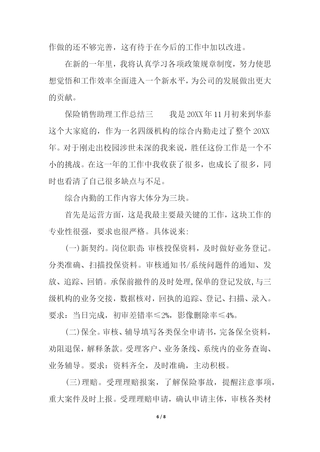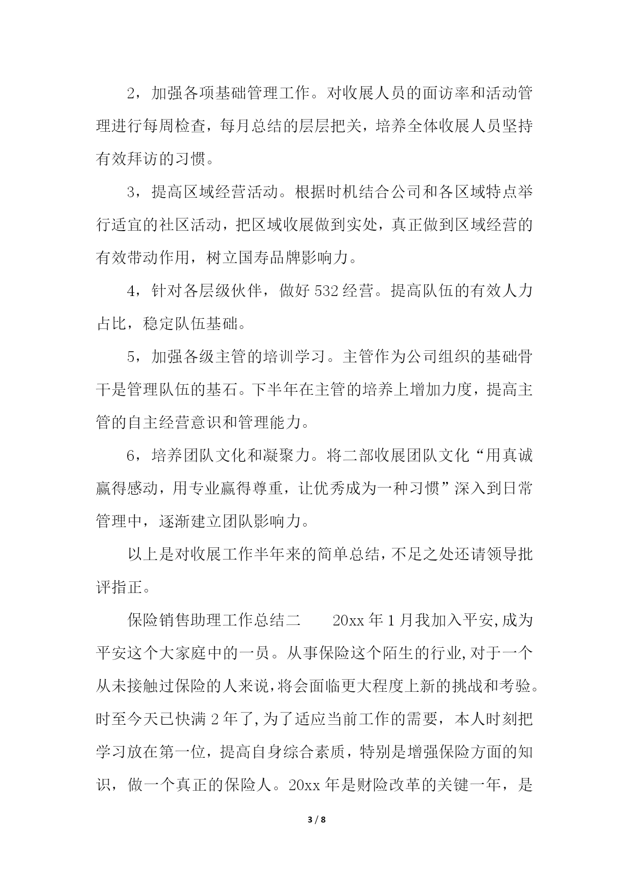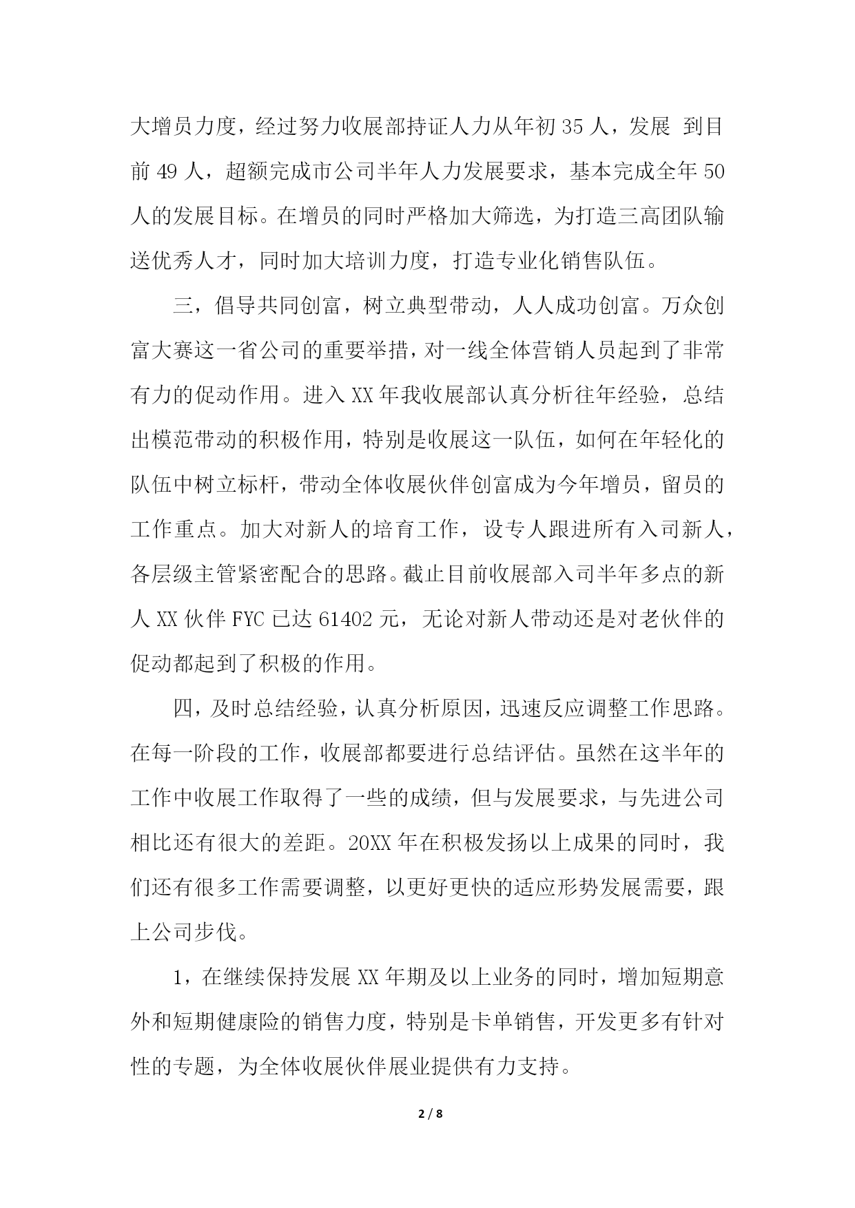 PAGE8/NUMPAGES8保险销售助理工作总结保险销售助理工作总结一营销二部收展渠道XX年半年以来在公司经理室的正确领导和支持下,紧密围绕市公司总经理室贯彻的“保增长,调结构,防风险,促稳定”的工作指导方针,全体收展内外勤人员不断进取,共同奋斗经过半年的努力各项主要工作取得了一定的效果。一,坚决积极调整保费结构,提高保费内涵价值,稳定收展队伍。进入XX年以来,收展部紧密围绕公司工作指导方向,以10年期及以上期交产品为XX年的主要业务指标,深挖XX年期及以上期交产品的卖点及价值,及时向全体收展伙伴贯彻宣导,销售XX年期及以上产品的意义,全体收展伙伴积极响应,截止6月27日,二部收展部已完成XX年期及以上险种保费为101.58万,完成全年计划的65.54%,按时完成了市公司要求的60%的半年进度。通过半年的XX年期及以上险种的销售,在提高公司内涵价值的同时对稳定队伍起到了积极作用,很多收展伙伴通过销售以上险种认清的寿险保障的本质,也在公司的广大孤单客户资源中很好的树立的公司的美誉度。二,夯实组织基础,扩大组织发展,建立三高团队。组织人力发展是寿险不断发展主题。XX年以来收展部深刻认识到这一点。在年初就积极通过人才市场,网络招聘,同业引进等方式加大增员力度,经过努力收展部持证人力从年初35人,发展到目前49人,超额完成市公司半年人力发展要求,基本完成全年50人的发展目标。在增员的同时严格加大筛选,为打造三高团队输送优秀人才,同时加大培训力度,打造专业化销售队伍。三,倡导共同创富,树立典型带动,人人成功创富。万众创富大赛这一省公司的重要举措,对一线全体营销人员起到了非常有力的促动作用。进入XX年我收展部认真分析往年经验,总结出模范带动的积极作用,特别是收展这一队伍,如何在年轻化的队伍中树立标杆,带动全体收展伙伴创富成为今年增员,留员的工作重点。加大对新人的培育工作,设专人跟进所有入司新人,各层级主管紧密配合的思路。截止目前收展部入司半年多点的新人XX伙伴FYC已达61402元,无论对新人带动还是对老伙伴的促动都起到了积极的作用。四,及时总结经验,认真分析原因,迅速反应调整工作思路。在每一阶段的工作,收展部都要进行总结评估。虽然在这半年的工作中收展工作取得了一些的成绩,但与发展要求,与先进公司相比还有很大的差距。20XX年在积极发扬以上成果的同时,我们还有很多工作需要调整,以更好更快的适应形势发展需要,跟上公司步伐。1,在继续保持发展XX年期及以上业务的同时,增加短期意外和短期健康险的销售力度,特别是卡单销售,开发更多有针对性的专题,为全体收展伙伴展业提供有力支持。2,加强各项基础管理工作。对收展人员的面访率和活动管理进行每周检查,每月总结的层层把关,培养全体收展人员坚持有效拜访的习惯。3,提高区域经营活动。根据时机结合公司和各区域特点举行适宜的社区活动,把区域收展做到实处,真正做到区域经营的有效带动作用,树立国寿品牌影响力。4,针对各层级伙伴,做好532经营。提高队伍的有效人力占比,稳定队伍基础。5,加强各级主管的培训学习。主管作为公司组织的基础骨干是管理队伍的基石。下半年在主管的培养上增加力度,提高主管的自主经营意识和管理能力。6,培养团队文化和凝聚力。将二部收展团队文化“用真诚赢得感动,用专业赢得尊重,让优秀成为一种习惯”深入到日常管理中,逐渐建立团队影响力。以上是对收展工作半年来的简单总结,不足之处还请领导批评指正。保险销售助理工作总结二20xx年1月我加入平安,成为平安这个大家庭中的一员。从事保险这个陌生的行业,对于一个从未接触过保险的人来说,将会面临更大程度上新的挑战和考验。时至今天已快满2年了,为了适应当前工作的需要,本人时刻把学习放在第一位,提高自身综合素质,特别是增强保险方面的知识,做一个真正的保险人。20xx年是财险改革的关键一年,是面对新变化、落实新机制、执行新规定的一年。二年里,我在公司领导和同事的帮助下不断的成长。下面结合我的具体情况对20xx年的工作做一下小结。一、工作思想方面。积极贯彻公司关于发展的一系列重要指示,与时俱进,勤奋工作,积极认真参加公司组织的各项学习,并且细心领会,转化为自己的思想武器。作为一名内勤人员,自己的一言一行也同时代表了公司的形象,所以更要提高自身的素质水平,高标准的要求自己,加强自己的专业知识和技能。同时做到遵纪守法,爱岗敬业,具有强烈的责任感和事业心。二、业务方面。我主要负责柜面单证的打印和整理归档工作,每到值班周早晨8:30分上班先打扫办公区卫生,月初把所要申领的有价和无价单证数量发邮件向公司财务人员申报,公司单证管理人员每月规定1号和16号为我们的领单日,每次只能申领半个月的用单量。我在申领时都要根据近期的客户出单数估算出下半个月的一个数量来申领,尽量