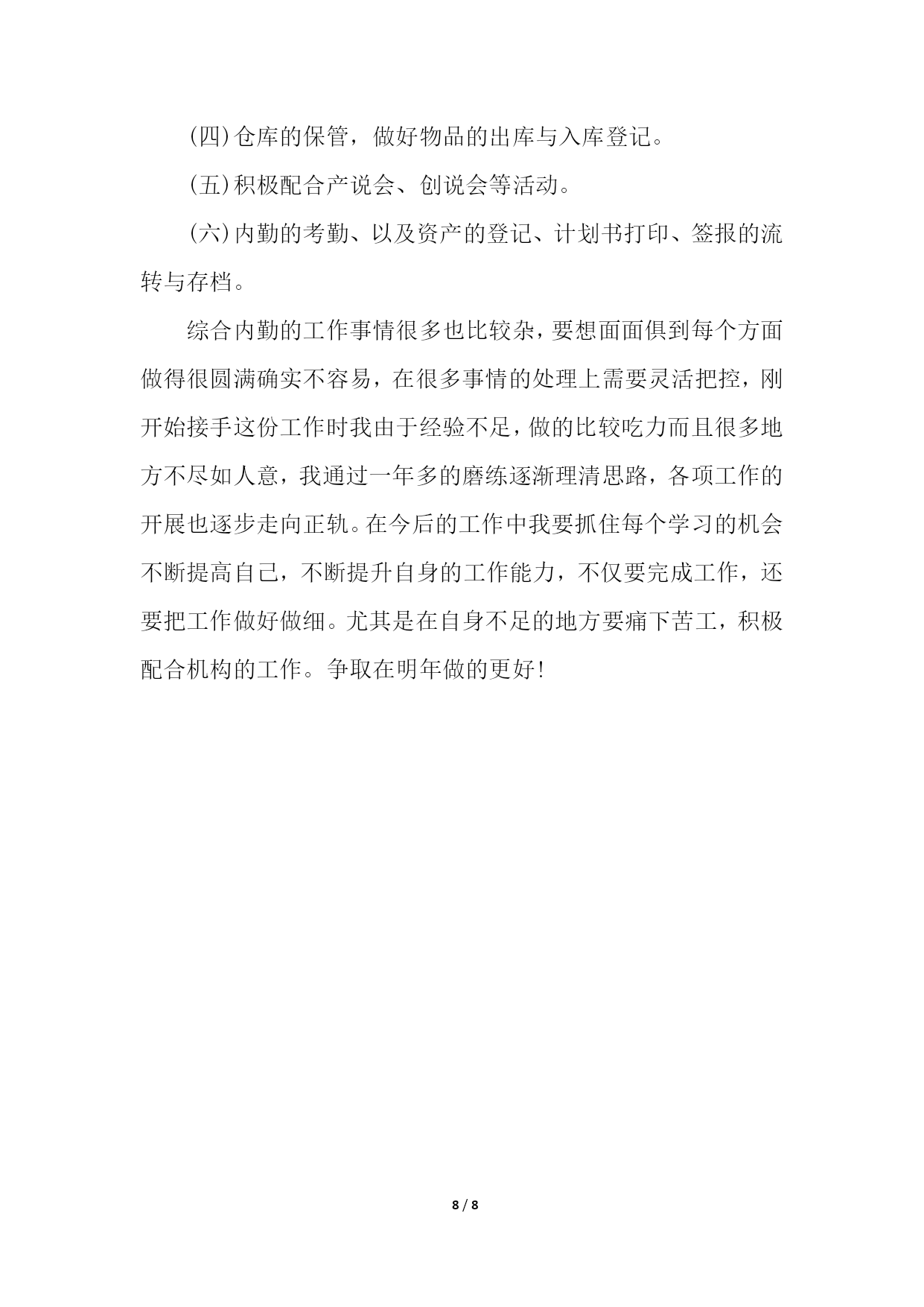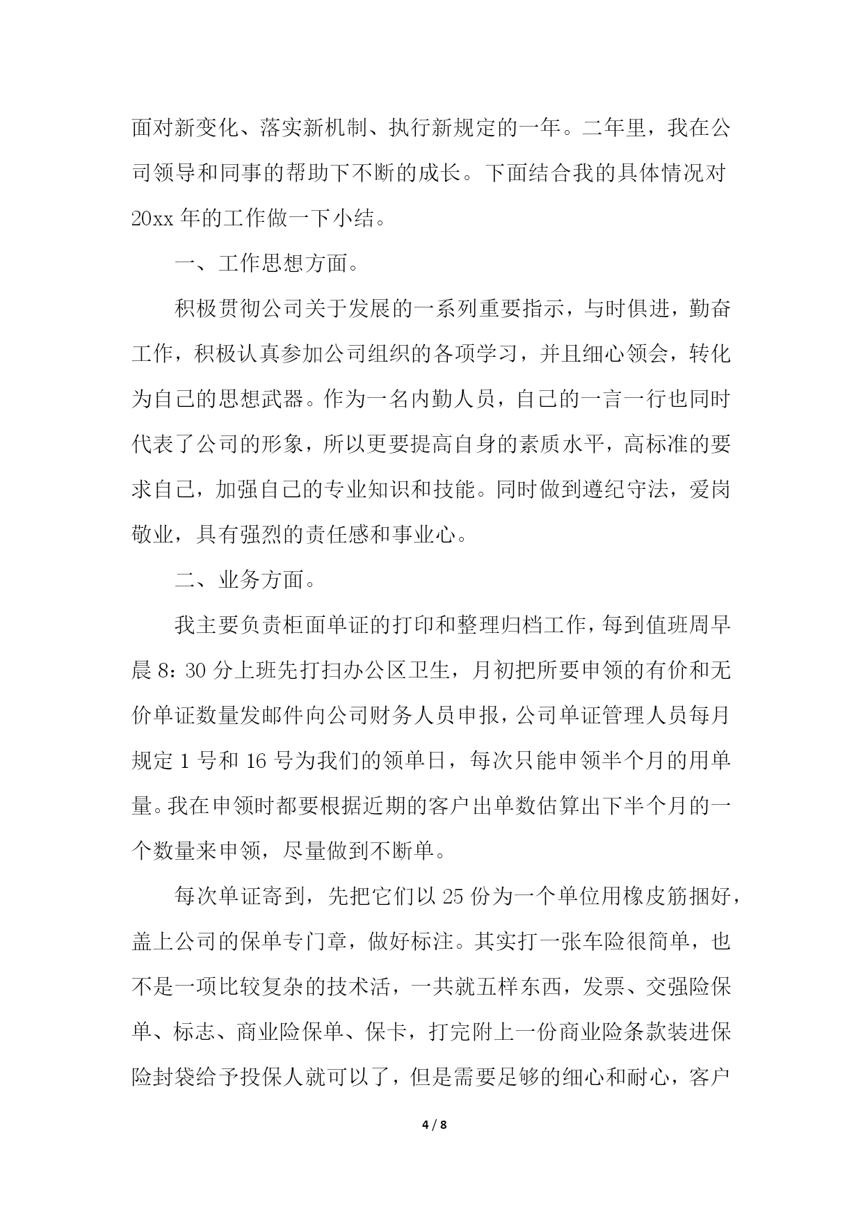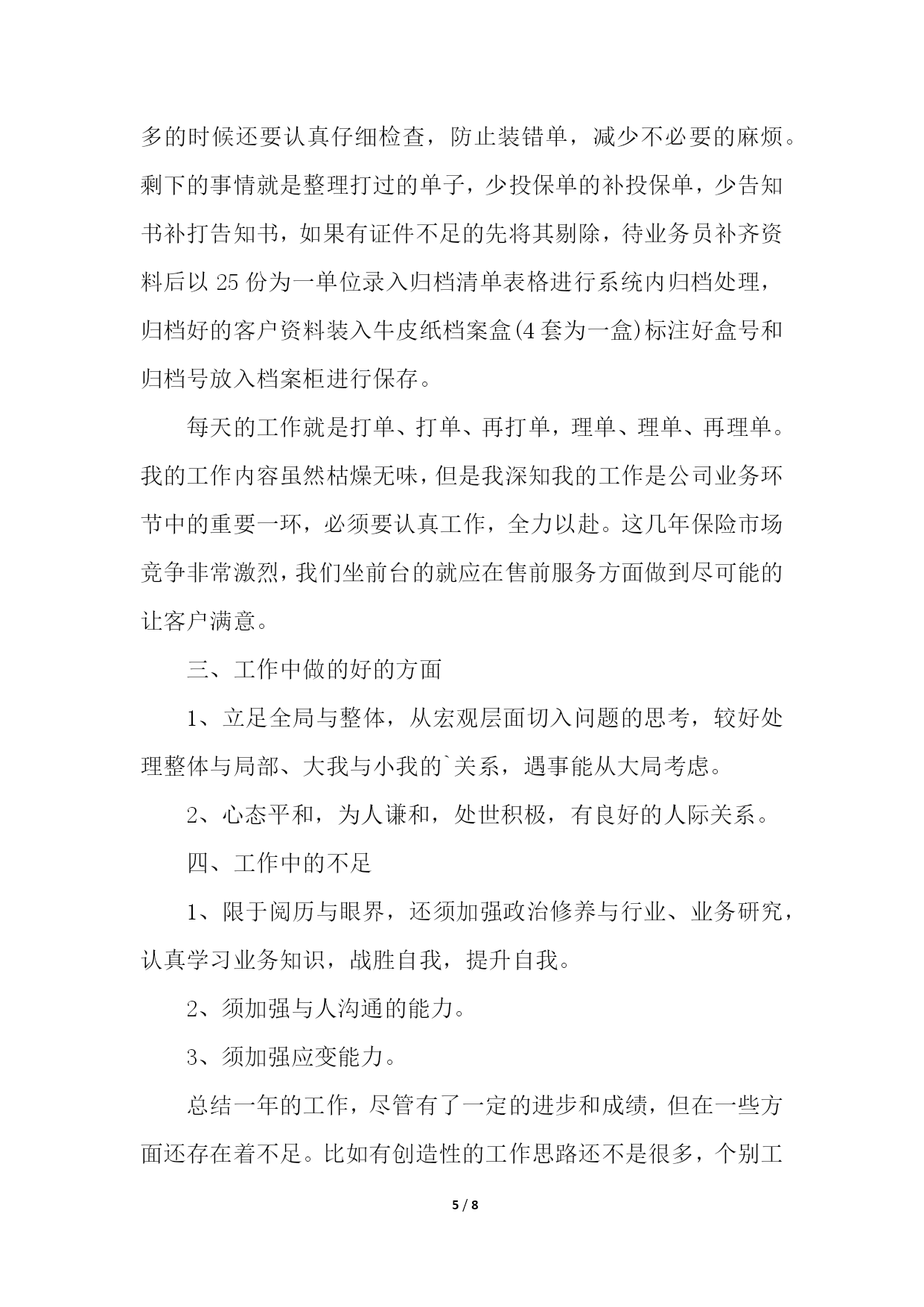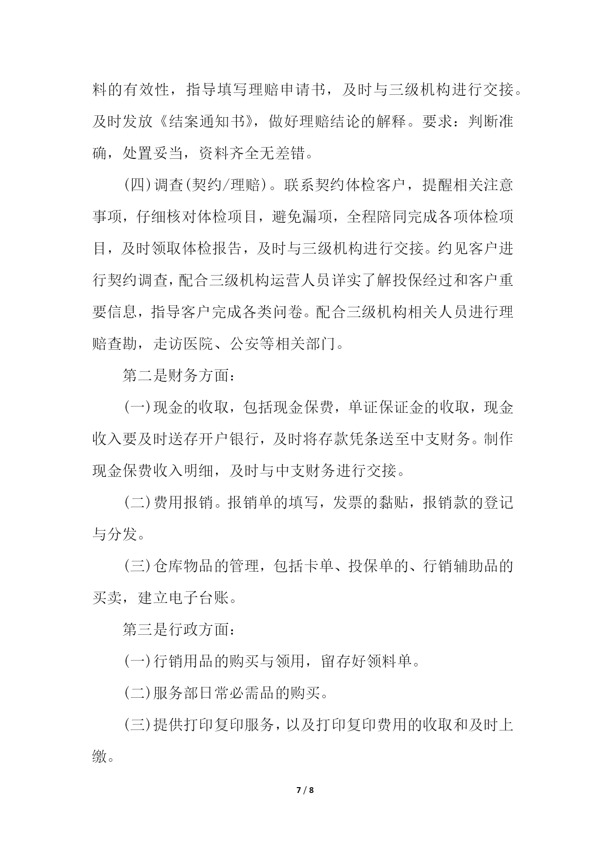 PAGE8/NUMPAGES8保险销售助理工作总结保险销售助理工作总结一营销二部收展渠道XX年半年以来在公司经理室的正确领导和支持下,紧密围绕市公司总经理室贯彻的“保增长,调结构,防风险,促稳定”的工作指导方针,全体收展内外勤人员不断进取,共同奋斗经过半年的努力各项主要工作取得了一定的效果。一,坚决积极调整保费结构,提高保费内涵价值,稳定收展队伍。进入XX年以来,收展部紧密围绕公司工作指导方向,以10年期及以上期交产品为XX年的主要业务指标,深挖XX年期及以上期交产品的卖点及价值,及时向全体收展伙伴贯彻宣导,销售XX年期及以上产品的意义,全体收展伙伴积极响应,截止6月27日,二部收展部已完成XX年期及以上险种保费为101.58万,完成全年计划的65.54%,按时完成了市公司要求的60%的半年进度。通过半年的XX年期及以上险种的销售,在提高公司内涵价值的同时对稳定队伍起到了积极作用,很多收展伙伴通过销售以上险种认清的寿险保障的本质,也在公司的广大孤单客户资源中很好的树立的公司的美誉度。二,夯实组织基础,扩大组织发展,建立三高团队。组织人力发展是寿险不断发展主题。XX年以来收展部深刻认识到这一点。在年初就积极通过人才市场,网络招聘,同业引进等方式加大增员力度,经过努力收展部持证人力从年初35人,发展到目前49人,超额完成市公司半年人力发展要求,基本完成全年50人的发展目标。在增员的同时严格加大筛选,为打造三高团队输送优秀人才,同时加大培训力度,打造专业化销售队伍。三,倡导共同创富,树立典型带动,人人成功创富。万众创富大赛这一省公司的重要举措,对一线全体营销人员起到了非常有力的促动作用。进入XX年我收展部认真分析往年经验,总结出模范带动的积极作用,特别是收展这一队伍,如何在年轻化的队伍中树立标杆,带动全体收展伙伴创富成为今年增员,留员的工作重点。加大对新人的培育工作,设专人跟进所有入司新人,各层级主管紧密配合的思路。截止目前收展部入司半年多点的新人XX伙伴FYC已达61402元,无论对新人带动还是对老伙伴的促动都起到了积极的作用。四,及时总结经验,认真分析原因,迅速反应调整工作思路。在每一阶段的工作,收展部都要进行总结评估。虽然在这半年的工作中收展工作取得了一些的成绩,但与发展要求,与先进公司相比还有很大的差距。20XX年在积极发扬以上成果的同时,我们还有很多工作需要调整,以更好更快的适应形势发展需要,跟上公司步伐。1,在继续保持发展XX年期及以上业务的同时,增加短期意外和短期健康险的销售力度,特别是卡单销售,开发更多有针对性的专题,为全体收展伙伴展业提供有力支持。2,加强各项基础管理工作。对收展人员的面访率和活动管理进行每周检查,每月总结的层层把关,培养全体收展人员坚持有效拜访的习惯。3,提高区域经营活动。根据时机结合公司和各区域特点举行适宜的社区活动,把区域收展做到实处,真正做到区域经营的有效带动作用,树立国寿品牌影响力。4,针对各层级伙伴,做好532经营。提高队伍的有效人力占比,稳定队伍基础。5,加强各级主管的培训学习。主管作为公司组织的基础骨干是管理队伍的基石。下半年在主管的培养上增加力度,提高主管的自主经营意识和管理能力。6,培养团队文化和凝聚力。将二部收展团队文化“用真诚赢得感动,用专业赢得尊重,让优秀成为一种习惯”深入到日常管理中,逐渐建立团队影响力。以上是对收展工作半年来的简单总结,不足之处还请领导批评指正。保险销售助理工作总结二20xx年1月我加入平安,成为平安这个大家庭中的一员。从事保险这个陌生的行业,对于一个从未接触过保险的人来说,将会面临更大程度上新的挑战和考验。时至今天已快满2年了,为了适应当前工作的需要,本人时刻把学习放在第一位,提高自身综合素质,特别是增强保险方面的知识,做一个真正的保险人。20xx年是财险改革的关键一年,是面对新变化、落实新机制、执行新规定的一年。二年里,我在公司领导和同事的帮助下不断的成长。下面结合我的具体情况对20xx年的工作做一下小结。一、工作思想方面。积极贯彻公司关于发展的一系列重要指示,与时俱进,勤奋工作,积极认真参加公司组织的各项学习,并且细心领会,转化为自己的思想武器。作为一名内勤人员,自己的一言一行也同时代表了公司的形象,所以更要提高自身的素质水平,高标准的要求自己,加强自己的专业知识和技能。同时做到遵纪守法,爱岗敬业,具有强烈的责任感和事业心。二、业务方面。我主要负责柜面单证的打印和整理归档工作,每到值班周早晨8:30分上班先打扫办公区卫生,月初把所要申领的有价和无价单证数量发邮件向公司财务人员申报,公司单证管理人员每月规定1号和16号为我们的领单日,每次只能申领半个月的用单量。我在申领时都要根据近期的客户出单数估算出下半个月的一个数量来申领,尽量