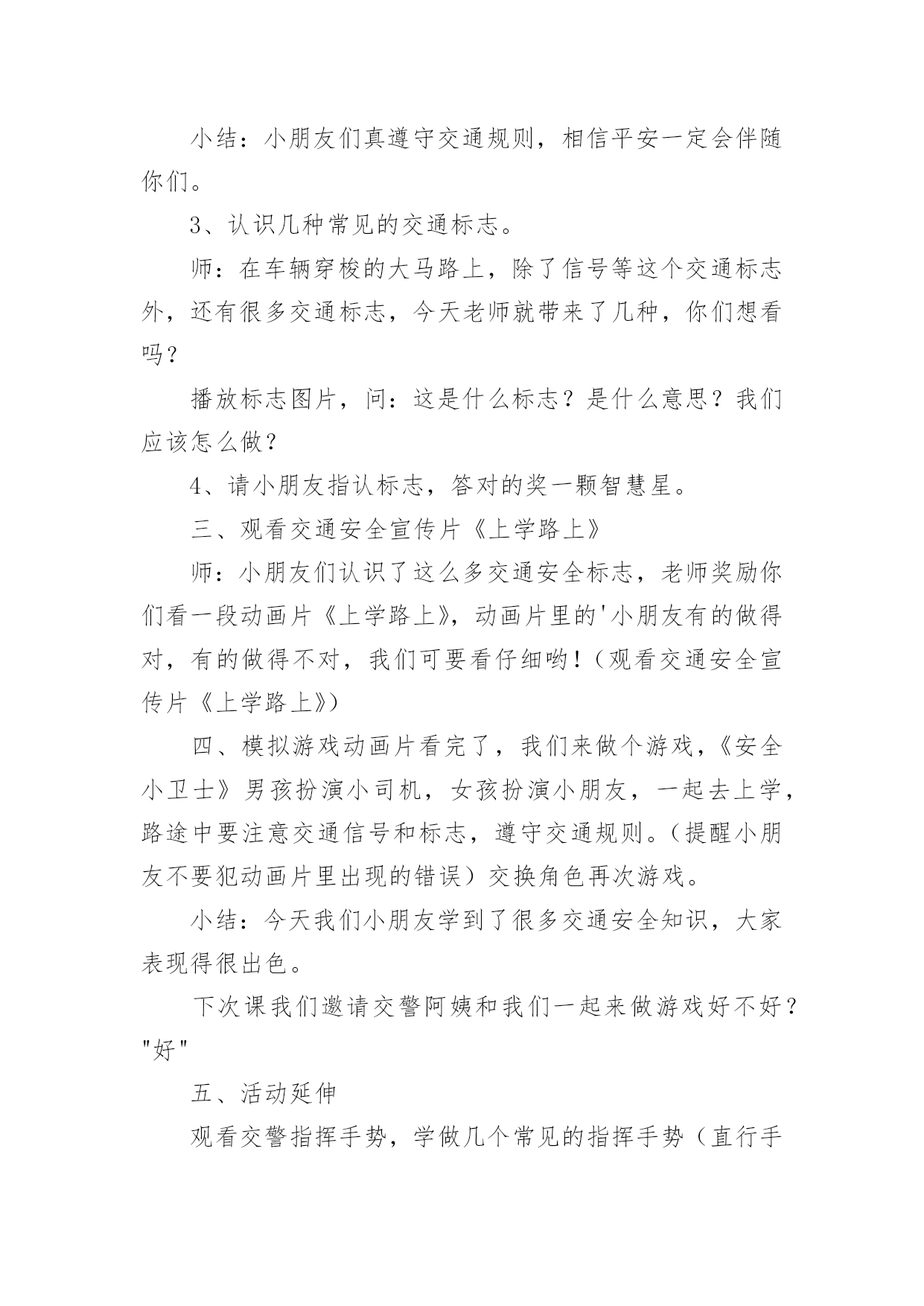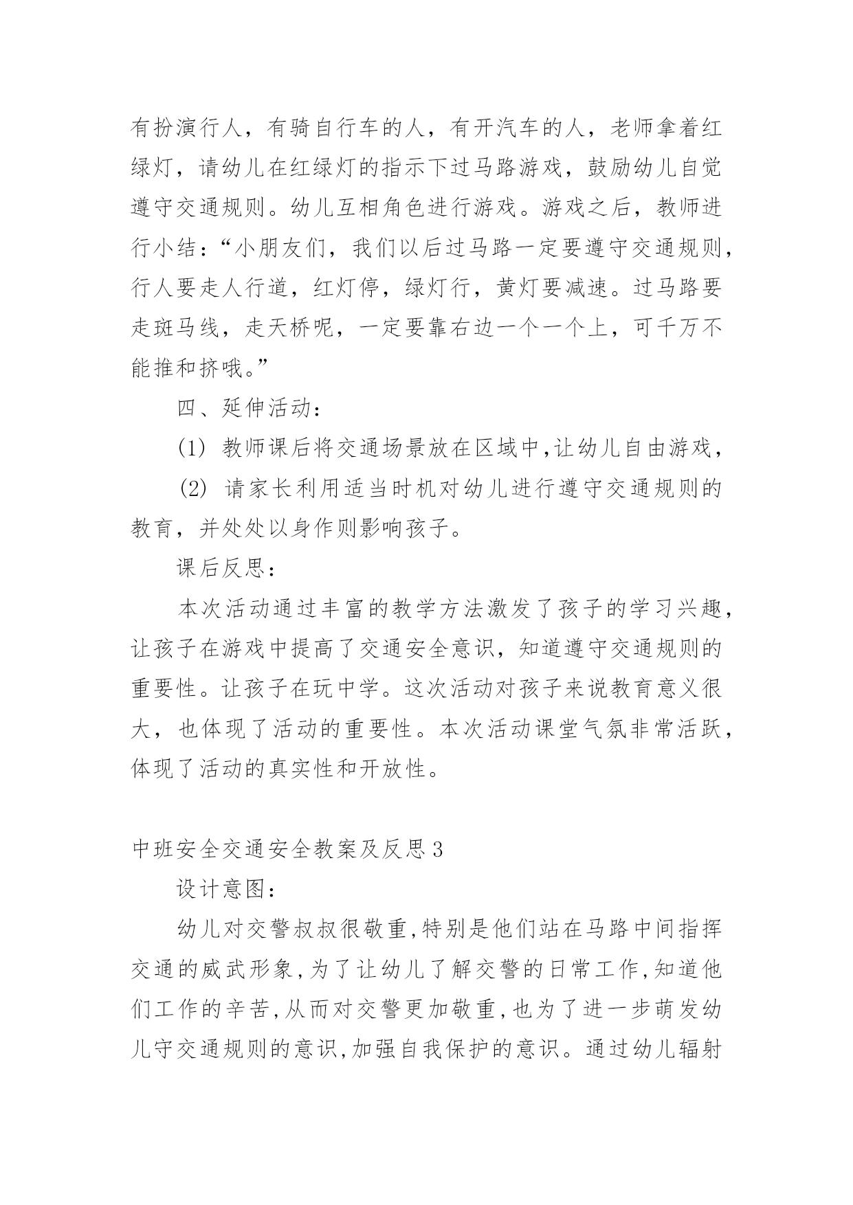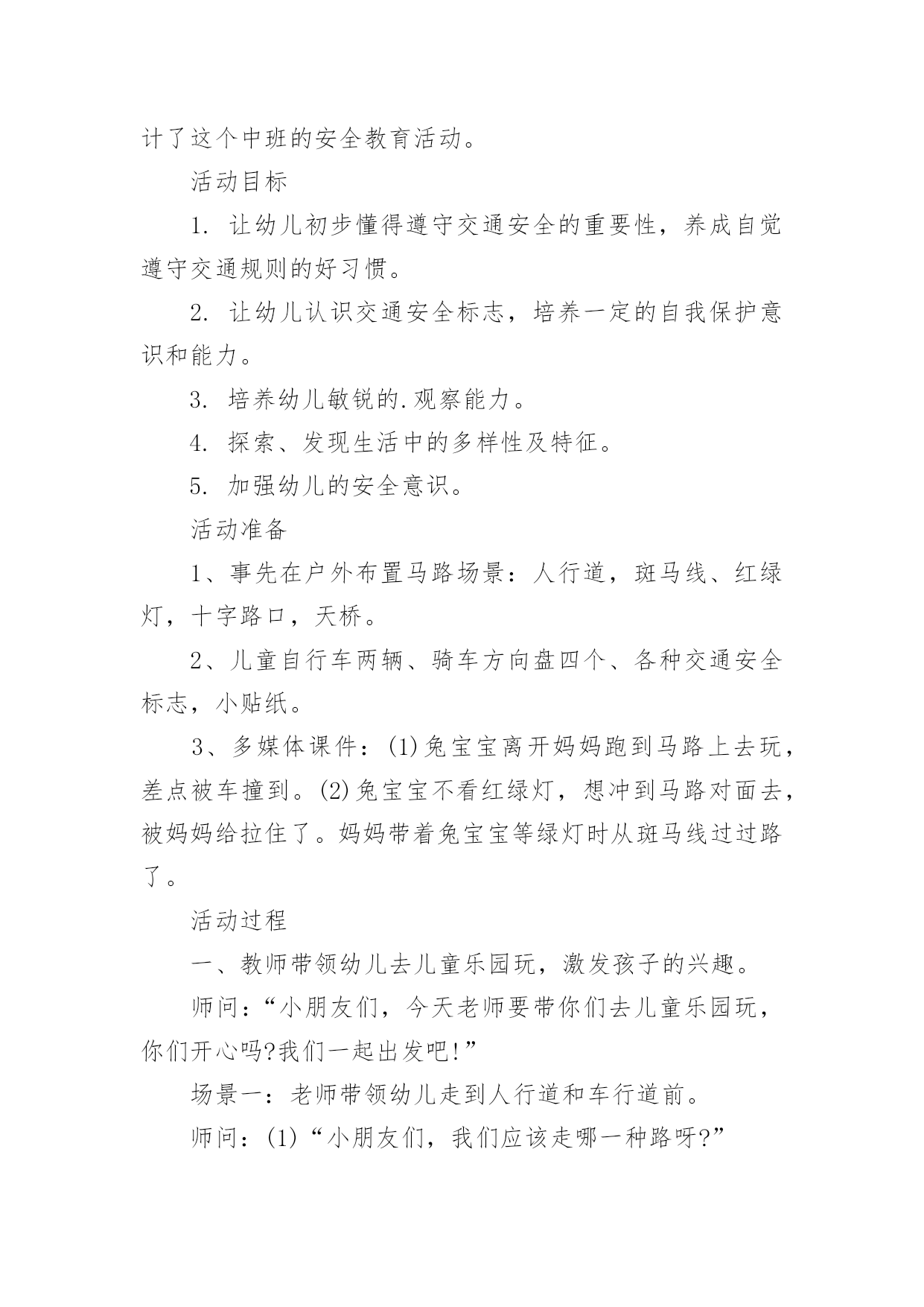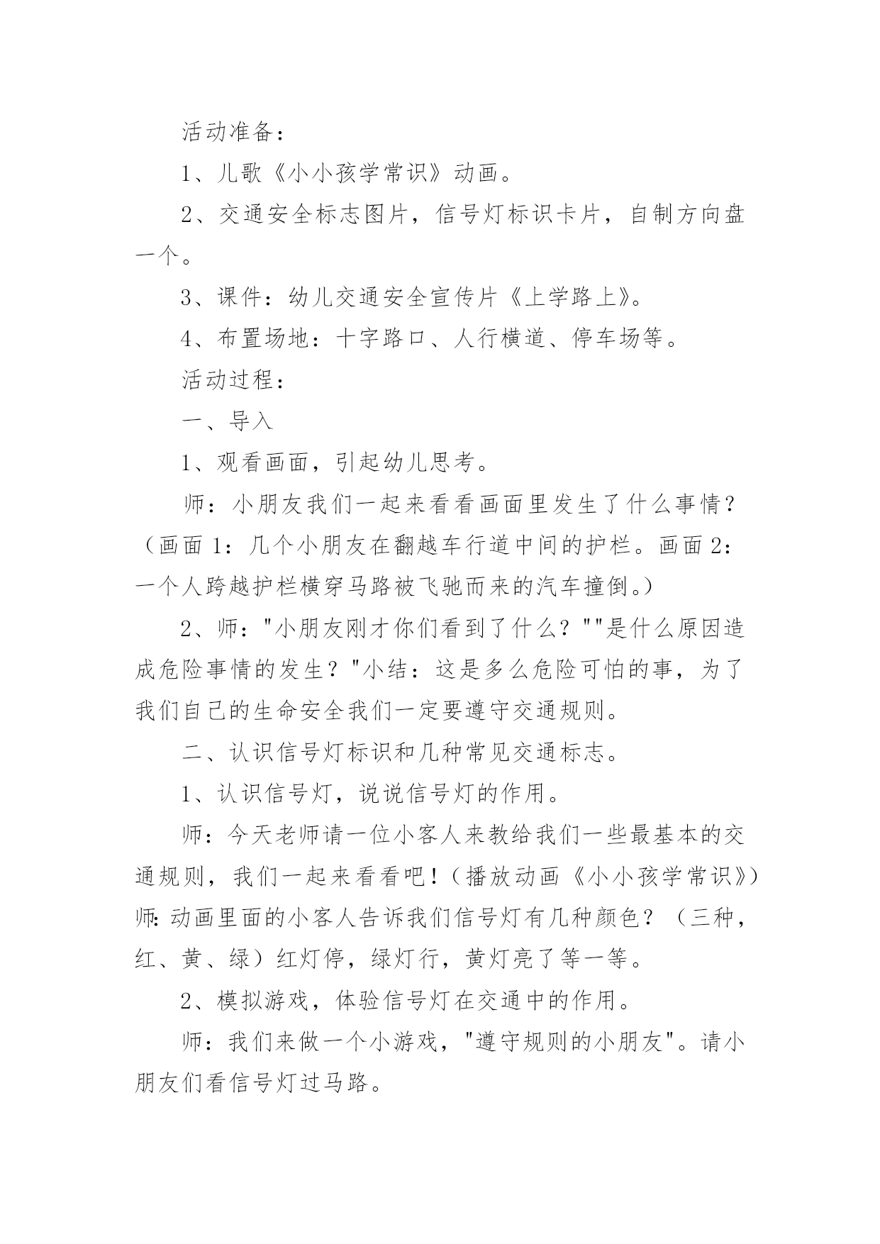 中班安全交通安全教案及反思作为一名辛苦耕耘的教育工作者,就有可能用到教案,借助教案可以提高教学质量,收到预期的教学效果。那么你有了解过教案吗?以下是小编为大家收集的中班安全交通安全教案及反思,欢迎阅读与收藏。中班安全交通安全教案及反思1设计意图:中班年龄阶段的幼儿,具有活泼好动、好奇、模仿力强等特点,是最容易引发交通事故的群体。虽然他们出去一般都有成人监护,但稍有不慎,就会严重影响幼儿的身心健康甚至酿成悲剧,独自穿越马路,独自活动的机会增多了。通过此次活动,让幼儿了解交通信号灯及安全标志与人们生活的密切关系。初步养成自觉遵守交通规则的意识,提高自我安全防护能力。活动目标:1、认识信号等标识了解基本的交通规则。2、认识几种常见的交通标志,了解交通安全标志与人们生活的密切关系。3、在游戏活动中体验交通规则的重要性,养成自觉遵守交通规则的意识,提高自我安全防护能力。4、培养幼儿勇敢、活泼的个性。5、鼓励幼儿大胆说话和积极应答。活动准备:1、儿歌《小小孩学常识》动画。2、交通安全标志图片,信号灯标识卡片,自制方向盘一个。3、课件:幼儿交通安全宣传片《上学路上》。4、布置场地:十字路口、人行横道、停车场等。活动过程:一、导入1、观看画面,引起幼儿思考。师:小朋友我们一起来看看画面里发生了什么事情?(画面1:几个小朋友在翻越车行道中间的护栏。画面2:一个人跨越护栏横穿马路被飞驰而来的汽车撞倒。)2、师:"小朋友刚才你们看到了什么?""是什么原因造成危险事情的发生?"小结:这是多么危险可怕的事,为了我们自己的生命安全我们一定要遵守交通规则。二、认识信号灯标识和几种常见交通标志。1、认识信号灯,说说信号灯的作用。师:今天老师请一位小客人来教给我们一些最基本的交通规则,我们一起来看看吧!(播放动画《小小孩学常识》)师:动画里面的小客人告诉我们信号灯有几种颜色?(三种,红、黄、绿)红灯停,绿灯行,黄灯亮了等一等。2、模拟游戏,体验信号灯在交通中的作用。师:我们来做一个小游戏,"遵守规则的小朋友"。请小朋友们看信号灯过马路。小结:小朋友们真遵守交通规则,相信平安一定会伴随你们。3、认识几种常见的交通标志。师:在车辆穿梭的大马路上,除了信号等这个交通标志外,还有很多交通标志,今天老师就带来了几种,你们想看吗?播放标志图片,问:这是什么标志?是什么意思?我们应该怎么做?4、请小朋友指认标志,答对的奖一颗智慧星。三、观看交通安全宣传片《上学路上》师:小朋友们认识了这么多交通安全标志,老师奖励你们看一段动画片《上学路上》,动画片里的'小朋友有的做得对,有的做得不对,我们可要看仔细哟!(观看交通安全宣传片《上学路上》)四、模拟游戏动画片看完了,我们来做个游戏,《安全小卫士》男孩扮演小司机,女孩扮演小朋友,一起去上学,路途中要注意交通信号和标志,遵守交通规则。(提醒小朋友不要犯动画片里出现的错误)交换角色再次游戏。小结:今天我们小朋友学到了很多交通安全知识,大家表现得很出色。下次课我们邀请交警阿姨和我们一起来做游戏好不好?"好"五、活动延伸观看交警指挥手势,学做几个常见的指挥手势(直行手势、停止手势、左转弯手势、右转弯手势),学做小交警指挥交通。活动简评:活动中充分利用现有资源,使用多媒体课件展示,直观形象,孩子们易于接受。游戏的参与,孩子们有了亲身体会,真正了解了一些基本的交通规则,在快乐体验中,学到了交通安全知识。教学反思:为一名小班的教师,班上的孩子年龄幼小,缺乏保护自己的能力,老师就要将工作做到最细微处。在今后的工作中我要多学习,积累,调整。我想,随着教育改革的深入,我们一定会有越来越多的好方法,那时,幼儿的安全问题不会再成为困扰我们的一个难题。中班安全交通安全教案及反思2设计意图城市交通的不断发展促使我们加强交通安全教育,让幼儿了解一些危险因素,知道遵守交通规则的重要性,懂得如何保护自己。《新纲要》中指出:“幼儿园必须把保护幼儿的生命和促进幼儿的健康放在工作的首位”。从小让幼儿懂得交通安全知识,养成自觉遵守交通安全的好习惯,对孩子来说可以受益终生。这也符合《新纲要》所提到的“选择的教育内容既贴进幼儿的生活,符合幼儿的现实需要,又有利于其长远发展,为所有在园幼儿的健康成长服务。”为此我设计了这个中班的安全教育活动。活动目标1.让幼儿初步懂得遵守交通安全的重要性,养成自觉遵守交通规则的好习惯。2.让幼儿认识交通安全标志,培养一定的自我保护意识和能力。3.培养幼儿敏锐的.观察能力。4.探索、发现生活中的多样性及特征。5.加强幼儿的安全意识。活动准备1、事先在户外布置马路场景:人行道,斑马线、红绿灯,十字路口,天桥。2、儿童自行车两辆、骑车方向盘四个、各种交通安全标志,小贴纸。3、多媒体课件:(1)兔宝宝离开妈妈跑到马路上去玩,差点被车撞到。(2)兔宝宝