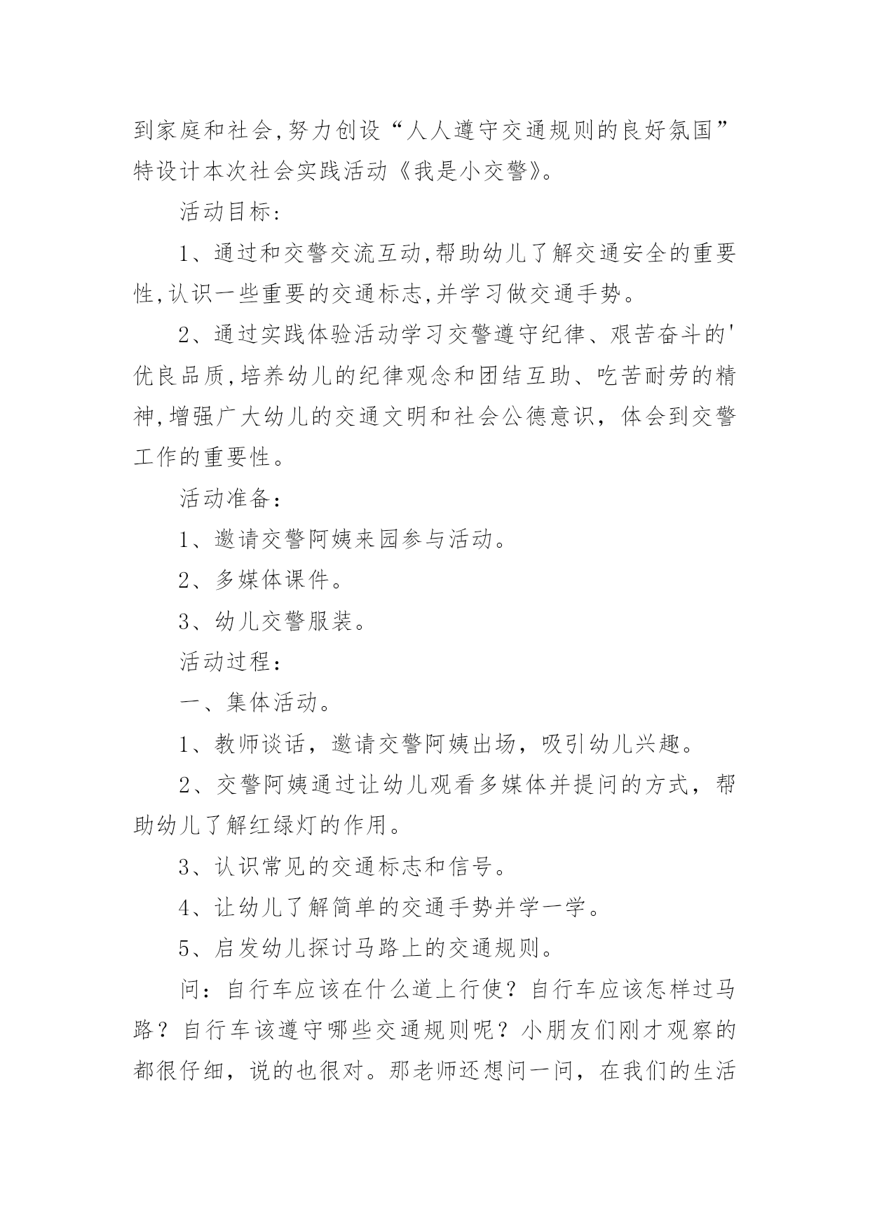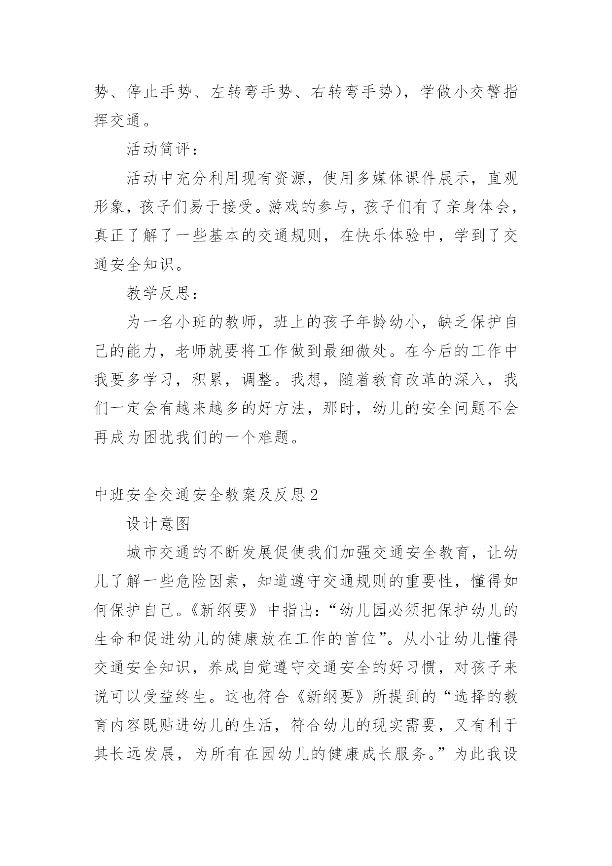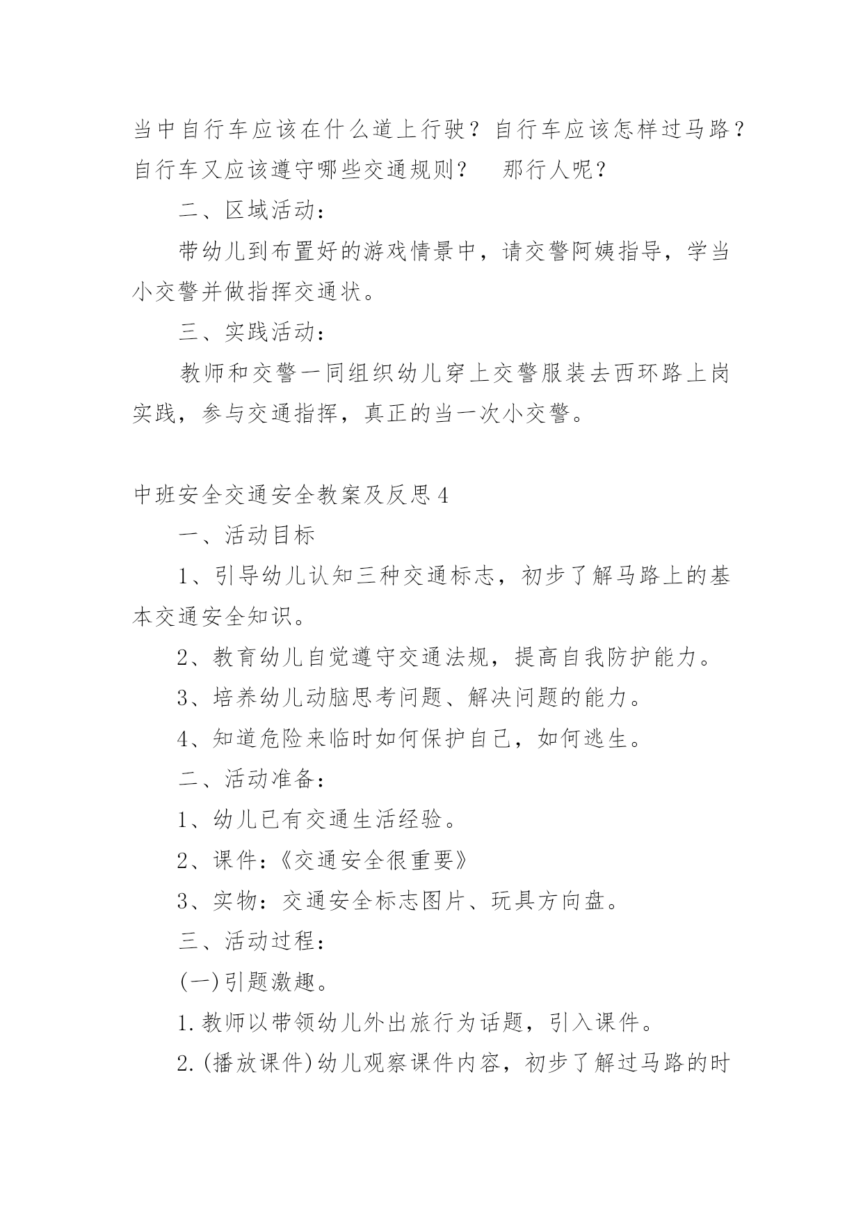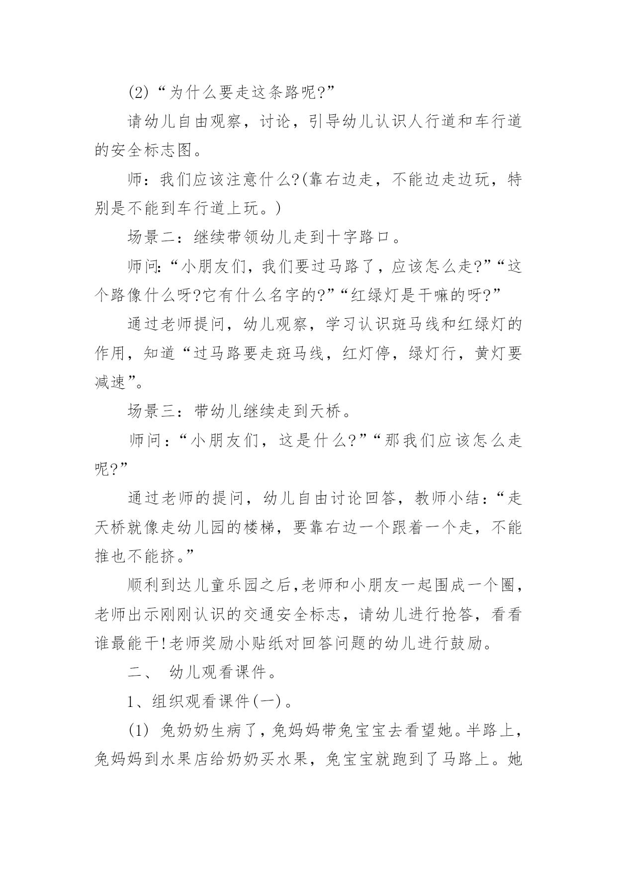 中班安全交通安全教案及反思作为一名辛苦耕耘的教育工作者,就有可能用到教案,借助教案可以提高教学质量,收到预期的教学效果。那么你有了解过教案吗?以下是小编为大家收集的中班安全交通安全教案及反思,欢迎阅读与收藏。中班安全交通安全教案及反思1设计意图:中班年龄阶段的幼儿,具有活泼好动、好奇、模仿力强等特点,是最容易引发交通事故的群体。虽然他们出去一般都有成人监护,但稍有不慎,就会严重影响幼儿的身心健康甚至酿成悲剧,独自穿越马路,独自活动的机会增多了。通过此次活动,让幼儿了解交通信号灯及安全标志与人们生活的密切关系。初步养成自觉遵守交通规则的意识,提高自我安全防护能力。活动目标:1、认识信号等标识了解基本的交通规则。2、认识几种常见的交通标志,了解交通安全标志与人们生活的密切关系。3、在游戏活动中体验交通规则的重要性,养成自觉遵守交通规则的意识,提高自我安全防护能力。4、培养幼儿勇敢、活泼的个性。5、鼓励幼儿大胆说话和积极应答。活动准备:1、儿歌《小小孩学常识》动画。2、交通安全标志图片,信号灯标识卡片,自制方向盘一个。3、课件:幼儿交通安全宣传片《上学路上》。4、布置场地:十字路口、人行横道、停车场等。活动过程:一、导入1、观看画面,引起幼儿思考。师:小朋友我们一起来看看画面里发生了什么事情?(画面1:几个小朋友在翻越车行道中间的护栏。画面2:一个人跨越护栏横穿马路被飞驰而来的汽车撞倒。)2、师:"小朋友刚才你们看到了什么?""是什么原因造成危险事情的发生?"小结:这是多么危险可怕的事,为了我们自己的生命安全我们一定要遵守交通规则。二、认识信号灯标识和几种常见交通标志。1、认识信号灯,说说信号灯的作用。师:今天老师请一位小客人来教给我们一些最基本的交通规则,我们一起来看看吧!(播放动画《小小孩学常识》)师:动画里面的小客人告诉我们信号灯有几种颜色?(三种,红、黄、绿)红灯停,绿灯行,黄灯亮了等一等。2、模拟游戏,体验信号灯在交通中的作用。师:我们来做一个小游戏,"遵守规则的小朋友"。请小朋友们看信号灯过马路。小结:小朋友们真遵守交通规则,相信平安一定会伴随你们。3、认识几种常见的交通标志。师:在车辆穿梭的大马路上,除了信号等这个交通标志外,还有很多交通标志,今天老师就带来了几种,你们想看吗?播放标志图片,问:这是什么标志?是什么意思?我们应该怎么做?4、请小朋友指认标志,答对的奖一颗智慧星。三、观看交通安全宣传片《上学路上》师:小朋友们认识了这么多交通安全标志,老师奖励你们看一段动画片《上学路上》,动画片里的'小朋友有的做得对,有的做得不对,我们可要看仔细哟!(观看交通安全宣传片《上学路上》)四、模拟游戏动画片看完了,我们来做个游戏,《安全小卫士》男孩扮演小司机,女孩扮演小朋友,一起去上学,路途中要注意交通信号和标志,遵守交通规则。(提醒小朋友不要犯动画片里出现的错误)交换角色再次游戏。小结:今天我们小朋友学到了很多交通安全知识,大家表现得很出色。下次课我们邀请交警阿姨和我们一起来做游戏好不好?"好"五、活动延伸观看交警指挥手势,学做几个常见的指挥手势(直行手势、停止手势、左转弯手势、右转弯手势),学做小交警指挥交通。活动简评:活动中充分利用现有资源,使用多媒体课件展示,直观形象,孩子们易于接受。游戏的参与,孩子们有了亲身体会,真正了解了一些基本的交通规则,在快乐体验中,学到了交通安全知识。教学反思:为一名小班的教师,班上的孩子年龄幼小,缺乏保护自己的能力,老师就要将工作做到最细微处。在今后的工作中我要多学习,积累,调整。我想,随着教育改革的深入,我们一定会有越来越多的好方法,那时,幼儿的安全问题不会再成为困扰我们的一个难题。中班安全交通安全教案及反思2设计意图城市交通的不断发展促使我们加强交通安全教育,让幼儿了解一些危险因素,知道遵守交通规则的重要性,懂得如何保护自己。《新纲要》中指出:“幼儿园必须把保护幼儿的生命和促进幼儿的健康放在工作的首位”。从小让幼儿懂得交通安全知识,养成自觉遵守交通安全的好习惯,对孩子来说可以受益终生。这也符合《新纲要》所提到的“选择的教育内容既贴进幼儿的生活,符合幼儿的现实需要,又有利于其长远发展,为所有在园幼儿的健康成长服务。”为此我设计了这个中班的安全教育活动。活动目标1.让幼儿初步懂得遵守交通安全的重要性,养成自觉遵守交通规则的好习惯。2.让幼儿认识交通安全标志,培养一定的自我保护意识和能力。3.培养幼儿敏锐的.观察能力。4.探索、发现生活中的多样性及特征。5.加强幼儿的安全意识。活动准备1、事先在户外布置马路场景:人行道,斑马线、红绿灯,十字路口,天桥。2、儿童自行车两辆、骑车方向盘四个、各种交通安全标志,小贴纸。3、多媒体课件:(1)兔宝宝离开妈妈跑到马路上去玩,差点被车撞到。(2)兔宝宝