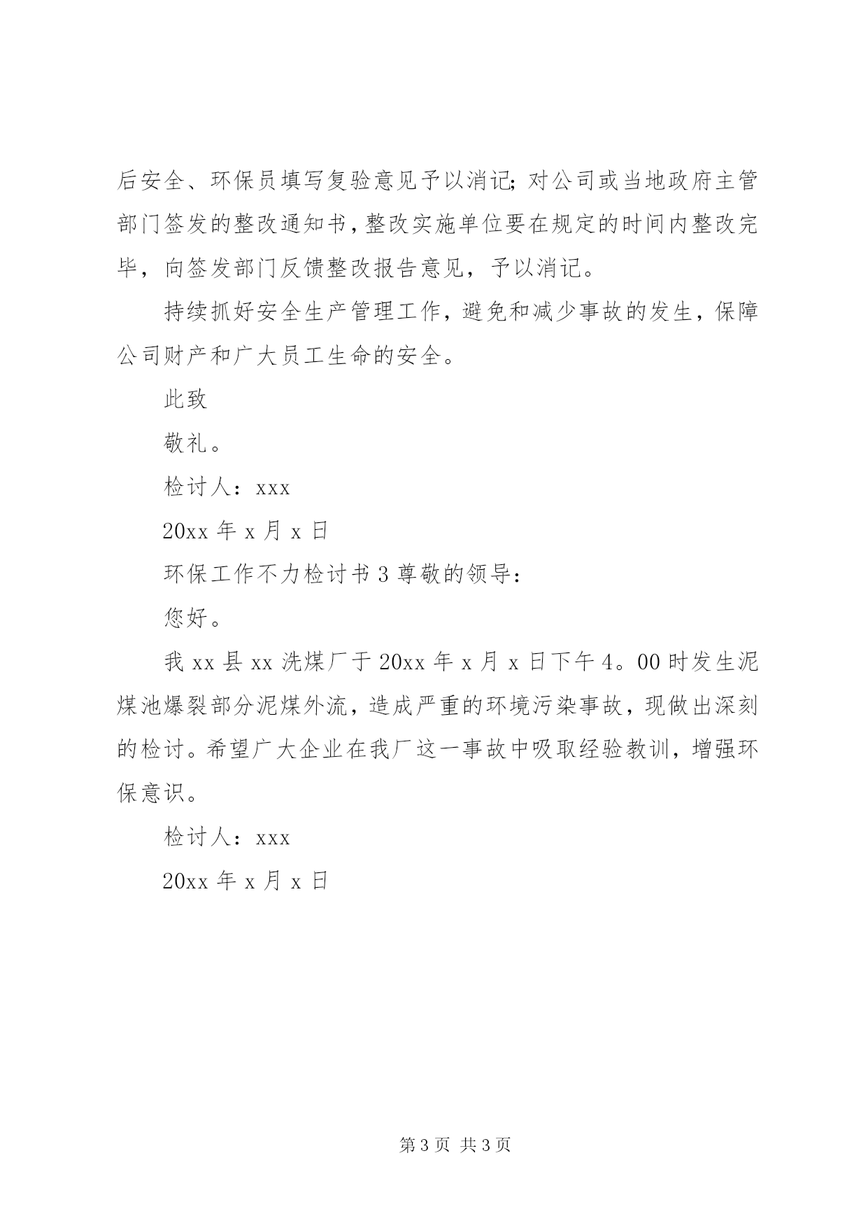 第PAGE\*Arabic\*MERGEFORMAT3页共NUMPAGES\*MERGEFORMAT3页环保工作不力检讨书在不小心犯错后,为了避免再犯,我们要通过写检讨书来悔过,在写检讨书时要表明改错的决心。什么样的检讨书才是好的检讨书呢。下面是小编收集整理的环保工作不力检讨书(精选3篇),欢迎阅读与收藏。环保工作不力检讨书1尊敬的领导:您好。x月x日各位领导亲临我司进行环境检查工作。对我司的基本情况及现场情况做了详细的检查工作,给我司提出很多的宝贵意见及发现我司现场有许多不足之处,我司将针对各位领导提出的问题积极配合做如下整改:1.对xx酒店未做环评,已开始准备资料找第三方做环评测试。2.针对木业车间喷漆废气未经处理排放已联系设备厂家安装净化装置,对废水建立污水处理池净化处理后再进入市政管网。3.陶粒车间购买常压固定床煤气发生炉,废气排放量达到国家排放标准。4.型钢车间废机油、废渣处理联系专业的环保公司进行回收处理。5.修建工业垃圾暂放区,将工业垃圾集中堆放。万分感谢各位领导为我司的发展提出了如此宝贵的意见,也希望在今后的日子中,给予我们更多的支持与指导,谢谢。此致敬礼。检讨人:xxx20xx年x月x日环保工作不力检讨书2尊敬的领导:您好。贵局于20xx年x月x日到我司进行环保检查,指出我司存在的问题,我司领导高度重视,立即组织相关部门进行了整改,现把整改情况汇报如下:进行了一次详细的安全生产大排查;对检查出的问题,立即落实整改责任人,第一时间进行了整改,确保安全生产我司将在贵局的正确领导下,继续把环保工作作为头等大事来抓,严抓日常监督管理,强化员工的环保设备操作技能教育和培训,完善环保各项规章制度,扎实做好环保隐患排查治理工作,避免环保事故的.发生,为xx市经济发展贡献一份微薄之力。项目部建立环保工作检查记录及安全、质量、环保违章整改通知书台帐,对查出的问题和整改情况做好日常记录。项目部签发的安全、质量、环保违章整改通知书,交由生产副经理、施工队长、施工作业队,由副经理、队长定人、定时、定措施及时地进行整改,在整改完成自验合格后,作业队在整改通知书上认真填写整改情况交安质部,由安质部组织相关人员进行验收,合格后安全、环保员填写复验意见予以消记;对公司或当地政府主管部门签发的整改通知书,整改实施单位要在规定的时间内整改完毕,向签发部门反馈整改报告意见,予以消记。持续抓好安全生产管理工作,避免和减少事故的发生,保障公司财产和广大员工生命的安全。此致敬礼。检讨人:xxx20xx年x月x日环保工作不力检讨书3尊敬的领导:您好。我xx县xx洗煤厂于20xx年x月x日下午4。00时发生泥煤池爆裂部分泥煤外流,造成严重的环境污染事故,现做出深刻的检讨。希望广大企业在我厂这一事故中吸取经验教训,增强环保意识。检讨人:xxx20xx年x月x日