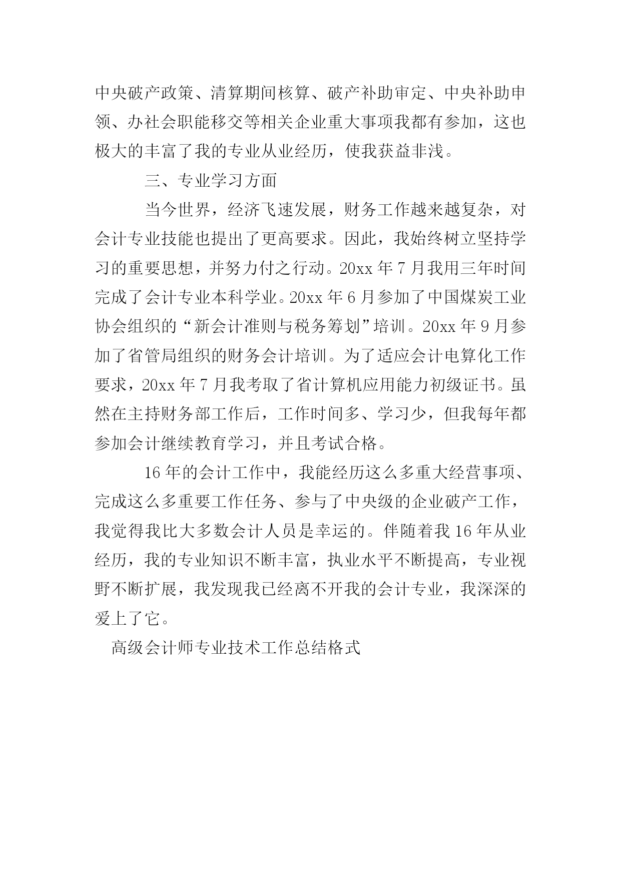 高级会计师专业技术工作总结格式1995年会计大专毕业分配后,我即开始从事会计工作,至今已在会计岗位工作16个年头。20xx年我考取会计中级专业技术资格,20xx年被所在集团公司聘为会计师。20xx年3月我被集团公司提拔至其控投子公司财务部工作,任公司财务部部长。任职会计师的七年时间里,无论在集团公司从事具体会计工作,还是在子公司财务部主持会计工作,我都坚持做到爱岗敬业,尽职尽责,执业谨慎,诚实守信,廉洁自律,遵纪守法,实事求是,坚持准则,不断学习,提高技能,参与管理,努力贡献。在我和财务部全体人员在共同努力下,我公司财务管理工作在集团公司连年名列前茅。现将七年任职期间的主要专业技术工作进行汇报:一、集团公司期间的主要工作情况我在集团公司财务处工作了四年,主要负责集团所属全部子分公司、直属单位及集团处室的财务预算编制与考核。本集团是国有重点煤炭集团,原煤年产量4000万吨以上,各种成员单位众多,包括原煤矿10座、洗煤厂8座、地面生产单位7所(水泥、机电、煤气、化工、建筑、电力、多种经营)、办社会机构几十个(学校、医院、生活后勤等)、以及集团直属单位和处室等。为了加强集团内部各单位经营管理,提高集团公司整体经济效益,集团把财务预算作为最重要的一项管理手段。面对每年近百家成员单位的财务预算编制任务,为了充分做到预算指标科学合理、预算考核恰当有效,真正发挥财务预算管理促进集团提升经济效益的作用,每年四季度我在财务处处长带领下到所有主业单位和主要辅业单位进行调研。听取汇报、收集数据、实地参观,在充分掌握各单位生产经营条件和状况后,第二年元月、二月根据集团公司确定的年度经营目标(产销量目标、利润目标等),以成本控制为财务预算编制重点,区别不同行业单位特点按照综合平衡预算法编制预算指标。二月中下旬,财务预算初稿与各单位交换意见,并向集团领导专题汇报,然后将基层和上层提出的合理意见进行预算修改。经上报集团董事会审议通过后,财务预算以文件形式下达执行。集团财务预算管理实行月度考核、半年奖罚。我在月度预算考核中,严格执行预算指标,对完不成的单位要求向集团领导提交报告,并帮助分析实际结果与预算标准的差异,提出改进意见和建议;对完成较好的单位分析其经营工作的优点,建议集团领导在集团内宣传推广,充分发挥预算事中控制功能。在财务处工作的四年里,我通过在财务预算工作上的不懈努力,实现了集团领导通过财务预算促管理、提效益、上水平的工作目标,受到集团领导表扬。20xx年被太原市经委评为“20xx年经济工作先进个人”。20xx年3月,经集团总会计师推荐,我被提拔至集团控股子公司任财务部部长。在集团财务处期间,我还负责每月集团利润会计核算、编报煤管局月度财务快报、为集团经营决策提供事前财务分析、撰写财务分析报告等。二、子公司期间的主要工作情况任子公司财务部部长后,我将重点放在财务工作统筹、组织和协调方面。首先,对财务部人员进行了适当调整,补充有专业技能的年青人到财务部,并安排在重要业务岗位,提升了财务部整体执业能力。支持大家考职称、学专业,鼓励参加集团内外的各类业务培训。我还将集团公司财务预算管理办法移植到本公司,组织本公司财务、生产、供应、机电等生产要素单位的专业人员,把集团对本公司财务预算指标按照生产要素分解到各内部单位,制定出内部单位财务预算,由各单位负责人与本公司董事长签定责任书,进行月度考核、抵押兑现,财务预算管理同样对本公司经济效益产生了积极作用。为了提升会计基础工作水平,我比照矿井安全生产标准化办法,组织编制了《会计基础标准化考核办法》,奖励会计人员干标准活、上标准岗。针对本公司煤炭销售在途煤量大的情况,我组织编制了《在途商品煤管理办法》,加强了在途煤量与销售部门、与集团公司、与相关部门的对帐工作,有效保护了企业的重要资产。在企业纳税方面,完成依法纳税义务,与税务部门保持良好关系,为本公司争取了税收优惠。积极配合各级审计,认真对待审计意见,连续五年获得无保留意见财务决算审计报告。在其他会计工作方面,本公司财务工作也多次受集团公司表扬。特别需说明的是,本公司是经中央批准,纳入全国第二批资源枯竭政策破产后而新成立的集团公司控股公司。我上任之时,正是破产公司清算收尾,新公司刚刚成立。因此,中央破产政策、清算期间核算、破产补助审定、中央补助申领、办社会职能移交等相关企业重大事项我都有参加,这也极大的丰富了我的专业从业经历,使我获益非浅。三、专业学习方面当今世界,经济飞速发展,财务工作越来越复杂,对会计专业技能也提出了更高要求。因此,我始终树立坚持学习的重要思想,并努力付之行动。20xx年7月我用三年时间完成了会计专业本科学业。20xx年6月参加了中国煤炭工业协会组织的“新会计准则与税务筹划”培训。20xx年9月参加了