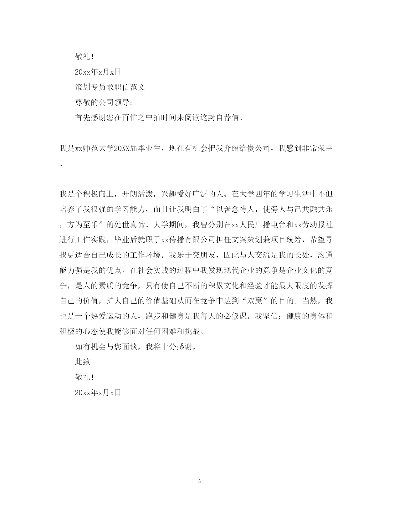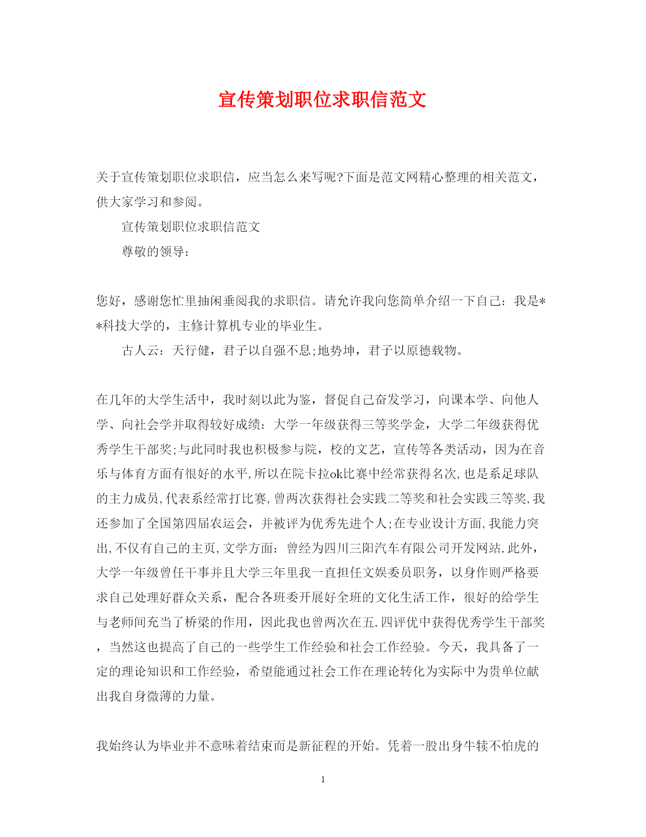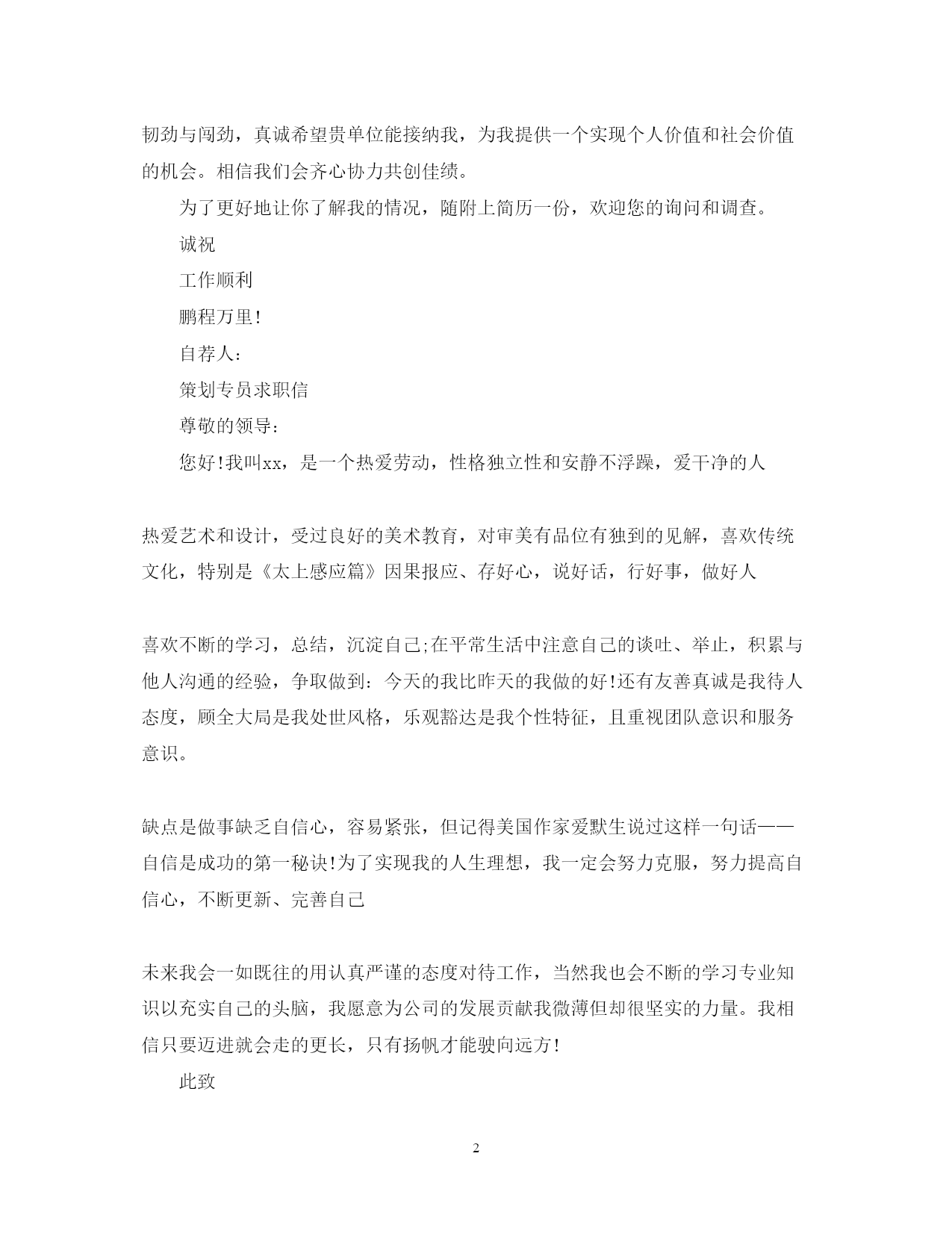 此资料由网络收集而来,如有侵权请告知上传者立即删除。资料共分享,我们负责传递知识。PAGEPAGE3宣传策划职位求职信范文关于宣传策划职位求职信,应当怎么来写呢?下面是范文网精心整理的相关范文,供大家学习和参阅。宣传策划职位求职信范文尊敬的领导:您好,感谢您忙里抽闲垂阅我的求职信。请允许我向您简单介绍一下自己:我是**科技大学的,主修计算机专业的毕业生。古人云:天行健,君子以自强不息;地势坤,君子以原德载物。在几年的大学生活中,我时刻以此为鉴,督促自己奋发学习,向课本学、向他人学、向社会学并取得较好成绩:大学一年级获得三等奖学金,大学二年级获得优秀学生干部奖;与此同时我也积极参与院,校的文艺,宣传等各类活动,因为在音乐与体育方面有很好的水平,所以在院卡拉ok比赛中经常获得名次,也是系足球队的主力成员,代表系经常打比赛,曾两次获得社会实践二等奖和社会实践三等奖,我还参加了全国第四届农运会,并被评为优秀先进个人;在专业设计方面,我能力突出,不仅有自己的主页,文学方面:曾经为四川三阳汽车有限公司开发网站.此外,大学一年级曾任干事并且大学三年里我一直担任文娱委员职务,以身作则严格要求自己处理好群众关系,配合各班委开展好全班的文化生活工作,很好的给学生与老师间充当了桥梁的作用,因此我也曾两次在五.四评优中获得优秀学生干部奖,当然这也提高了自己的一些学生工作经验和社会工作经验。今天,我具备了一定的理论知识和工作经验,希望能通过社会工作在理论转化为实际中为贵单位献出我自身微薄的力量。我始终认为毕业并不意味着结束而是新征程的开始。凭着一股出身牛犊不怕虎的韧劲与闯劲,真诚希望贵单位能接纳我,为我提供一个实现个人价值和社会价值的机会。相信我们会齐心协力共创佳绩。为了更好地让你了解我的情况,随附上简历一份,欢迎您的询问和调查。诚祝工作顺利鹏程万里!自荐人:策划专员求职信尊敬的领导:您好!我叫xx,是一个热爱劳动,性格独立性和安静不浮躁,爱干净的人热爱艺术和设计,受过良好的美术教育,对审美有品位有独到的见解,喜欢传统文化,特别是《太上感应篇》因果报应、存好心,说好话,行好事,做好人喜欢不断的学习,总结,沉淀自己;在平常生活中注意自己的谈吐、举止,积累与他人沟通的经验,争取做到:今天的我比昨天的我做的好!还有友善真诚是我待人态度,顾全大局是我处世风格,乐观豁达是我个性特征,且重视团队意识和服务意识。缺点是做事缺乏自信心,容易紧张,但记得美国作家爱默生说过这样一句话——自信是成功的第一秘诀!为了实现我的人生理想,我一定会努力克服,努力提高自信心,不断更新、完善自己未来我会一如既往的用认真严谨的态度对待工作,当然我也会不断的学习专业知识以充实自己的头脑,我愿意为公司的发展贡献我微薄但却很坚实的力量。我相信只要迈进就会走的更长,只有扬帆才能驶向远方!此致敬礼!20xx年x月x日策划专员求职信范文尊敬的公司领导:首先感谢您在百忙之中抽时间来阅读这封自荐信。我是xx师范大学20XX届毕业生。现在有机会把我介绍给贵公司,我感到非常荣幸。我是个积极向上,开朗活泼,兴趣爱好广泛的人。在大学四年的学习生活中不但培养了我很强的学习能力,而且让我明白了“以善念待人,使旁人与己共融共乐,方为至乐”的处世真谛。大学期间,我曾分别在xx人民广播电台和xx劳动报社进行工作实践,毕业后就职于xx传播有限公司担任文案策划兼项目统筹,希望寻找更适合自己成长的工作环境。我乐于交朋友,因此与人交流是我的长处,沟通能力强是我的优点。在社会实践的过程中我发现现代企业的竞争是企业文化的竞争,是人的素质的竞争,只有使自己不断的积累文化和经验才能最大限度的发挥自己的价值,扩大自己的价值基础从而在竞争中达到“双赢”的目的。当然,我也是一个热爱运动的人,跑步和健身是我每天的必修课。我坚信:健康的身体和积极的心态使我能够面对任何困难和挑战。如有机会与您面谈,我将十分感谢。此致敬礼!20xx年x月x日