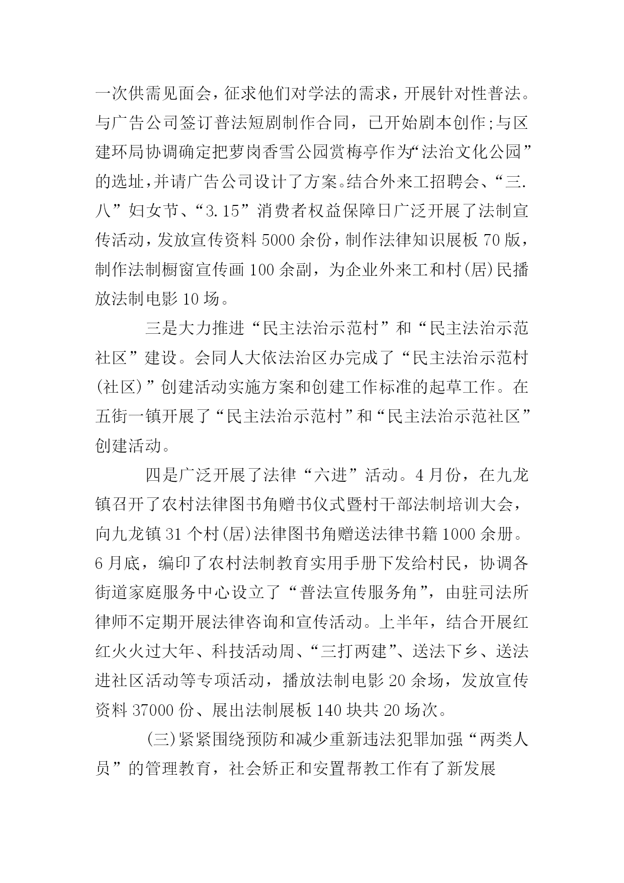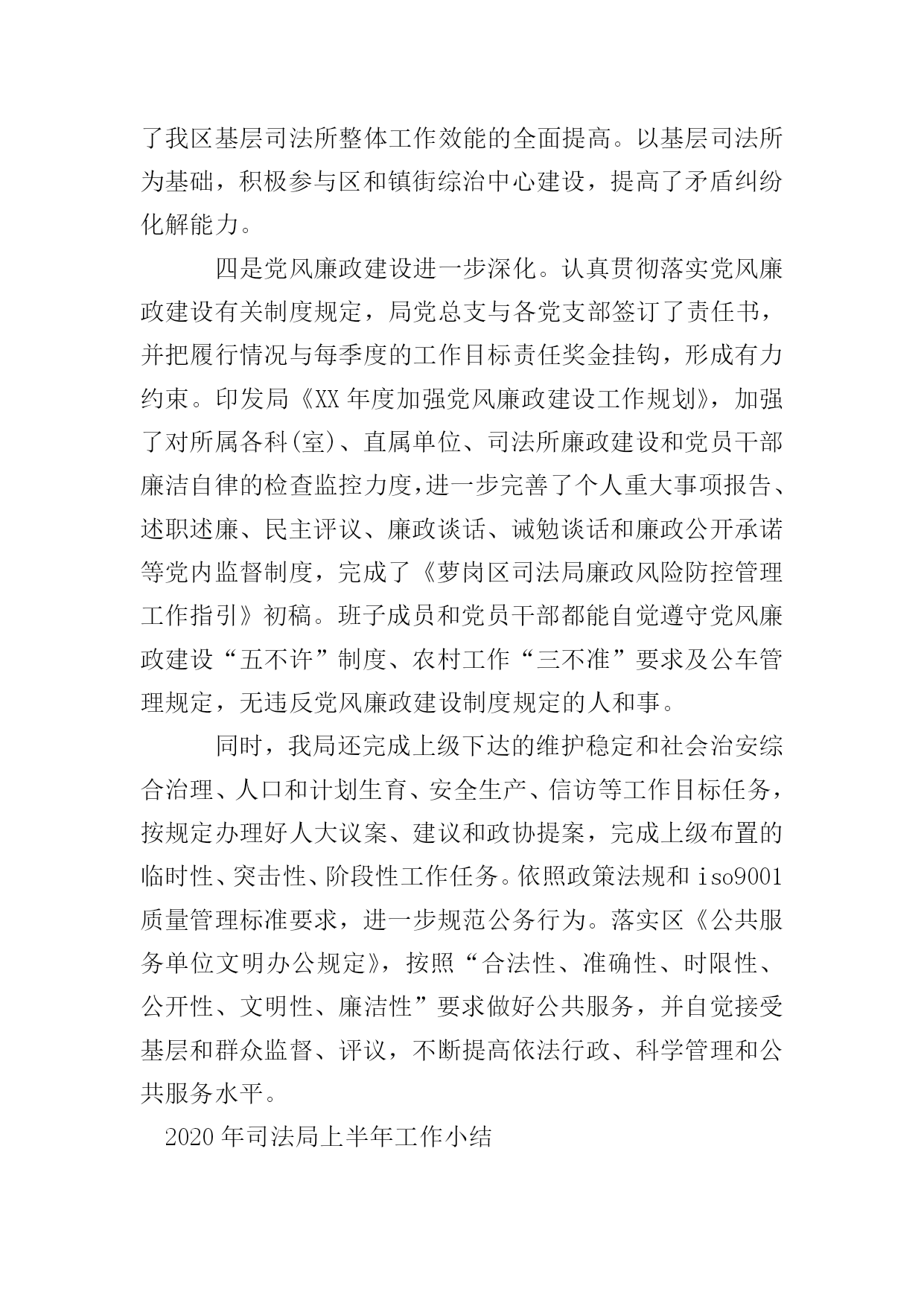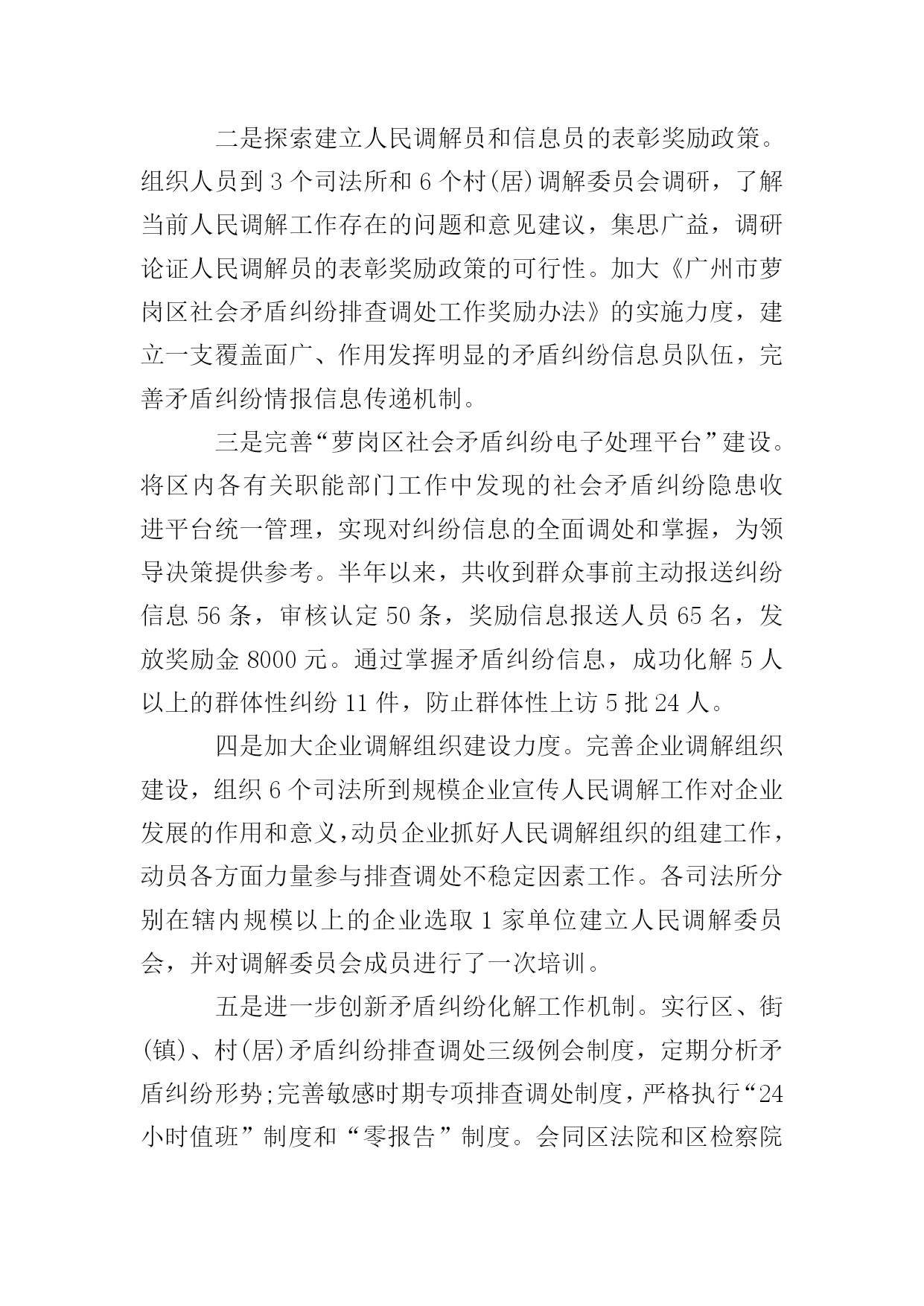 2020年司法局上半年工作小结XX年上半年,我局围绕区工作中心,突出重点,狠抓落实,圆满完成了开发区党委、管委会和萝岗区委、区政府下达的上半年工作任务、以及上级司法行政部门部署的阶段性工作任务。(一)紧紧围绕服务区委、区政府经济建设大局开展矛盾纠纷排查调处工作,社会矛盾化解工作取得新成效紧紧围绕区委、区政府经济建设及和谐稳定两个大局,充分发挥人民调解的优势,全力以赴开展矛盾纠纷排查调处工作。一是全力开展化解矛盾纠纷工作。及时调整了社会矛盾纠纷排查调处工作领导小组成员,加强调解调处工作的指导力度,突出抓好重大疑难矛盾纠纷的调处化解。先后在春节、“清明”“五一”、三次组织开展全区性社会矛盾纠纷排查调处工作,做到对重点问题、重点地区、重点对象和重点时段等各类不稳定因素心中有数,力争把矛盾纠纷消灭在萌芽状态。全力、快速抓好领导交办重大疑难案件的调处,市委常委、区委书记凌伟宪同志批示给我局的6件矛盾纠纷全部得到化解并有效稳控,李红卫区长交办的黄利强与罗雪君宅基地房屋买卖补偿纠纷得到有效调解。据统计,半年共排查各类矛盾纠纷286宗,调处成功271宗,民间纠纷调解率达到100%,成功率95%以上,其中5人以上的矛盾纠纷63宗,稳控61宗,实现无重大社会影响的恶性群体事件发生。二是探索建立人民调解员和信息员的表彰奖励政策。组织人员到3个司法所和6个村(居)调解委员会调研,了解当前人民调解工作存在的问题和意见建议,集思广益,调研论证人民调解员的表彰奖励政策的可行性。加大《广州市萝岗区社会矛盾纠纷排查调处工作奖励办法》的实施力度,建立一支覆盖面广、作用发挥明显的矛盾纠纷信息员队伍,完善矛盾纠纷情报信息传递机制。三是完善“萝岗区社会矛盾纠纷电子处理平台”建设。将区内各有关职能部门工作中发现的社会矛盾纠纷隐患收进平台统一管理,实现对纠纷信息的全面调处和掌握,为领导决策提供参考。半年以来,共收到群众事前主动报送纠纷信息56条,审核认定50条,奖励信息报送人员65名,发放奖励金8000元。通过掌握矛盾纠纷信息,成功化解5人以上的群体性纠纷11件,防止群体性上访5批24人。四是加大企业调解组织建设力度。完善企业调解组织建设,组织6个司法所到规模企业宣传人民调解工作对企业发展的作用和意义,动员企业抓好人民调解组织的组建工作,动员各方面力量参与排查调处不稳定因素工作。各司法所分别在辖内规模以上的企业选取1家单位建立人民调解委员会,并对调解委员会成员进行了一次培训。五是进一步创新矛盾纠纷化解工作机制。实行区、街(镇)、村(居)矛盾纠纷排查调处三级例会制度,定期分析矛盾纠纷形势;完善敏感时期专项排查调处制度,严格执行“24小时值班”制度和“零报告”制度。会同区法院和区检察院继续推进诉前联调、检调对接工作,一些劳资纠纷、医患纠纷、交通事故纠纷等突出性矛盾纠纷得以及时化解,促进了社会和谐稳定。六是继续构建和推进“大调解”格局。发挥司法行政机关在调处工作中的“总统筹”、“总督导”、“总牵头”的作用,全区实现了人民调解、司法调解和行政调解三调联动。特别是对于一些牵涉面大、矛盾复杂的人民内部矛盾纠纷,区公、检、法、司、综治、劳动、规划和各街、镇等相关部门通力合作,实行全方位的协同综合治理。3月份,会同农林水利局、国土规划局、九龙镇等单位部门,成功调解了九龙地区11宗群体性山林土地纠纷,维护了九龙地区稳定,确保了“知识城”建设的顺利推进。(二)紧紧围绕依法治区开展普法教育,法制宣传教育工作迈上新台阶大力抓好“xx”普法规划落实,起草了XX年萝岗区普法工作要点,推进“xx”普法深入开展。一是大力加强法制宣传教育队伍建设。完善机关事业单位普法联络员队伍,2月底在区内成立萝岗区“xx”普法联络员队伍,普法联络员共48人,覆盖全区机关企事业单位,形成了齐抓共管的“大普法”工作局面。积极探索法制宣传“社会化”运作模式,2月下旬,在区内各单位组建了48人的“xx”普法联络员队伍,在工会、妇联、残联、团委、社工组织成立了62人的“xx”普法小分队。二是继续推进“订单式”普法。组织普法对象召开了一次供需见面会,征求他们对学法的需求,开展针对性普法。与广告公司签订普法短剧制作合同,已开始剧本创作;与区建环局协调确定把萝岗香雪公园赏梅亭作为“法治文化公园”的选址,并请广告公司设计了方案。结合外来工招聘会、“三.八”妇女节、“3.15”消费者权益保障日广泛开展了法制宣传活动,发放宣传资料5000余份,制作法律知识展板70版,制作法制橱窗宣传画100余副,为企业外来工和村(居)民播放法制电影10场。三是大力推进“民主法治示范村”和“民主法治示范社区”建设。会同人大依法治区办完成了“民主法治示范村(社区)”创建活动实施方案和创建工作标准的起草工