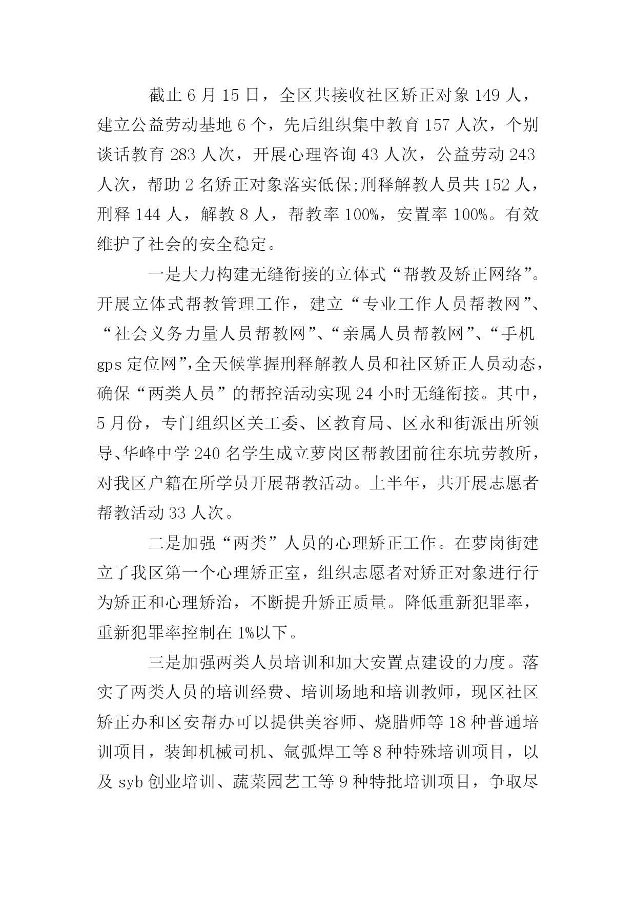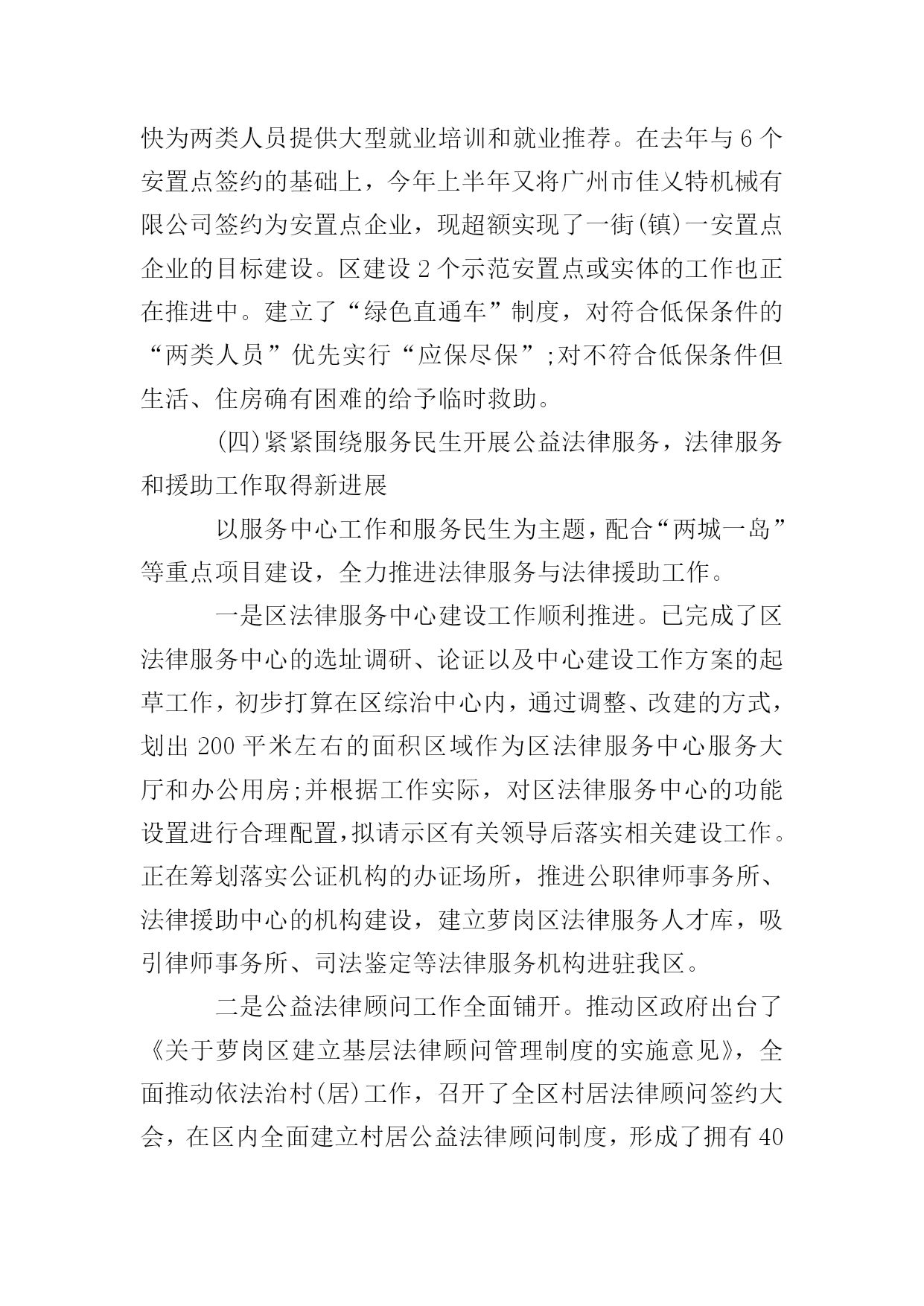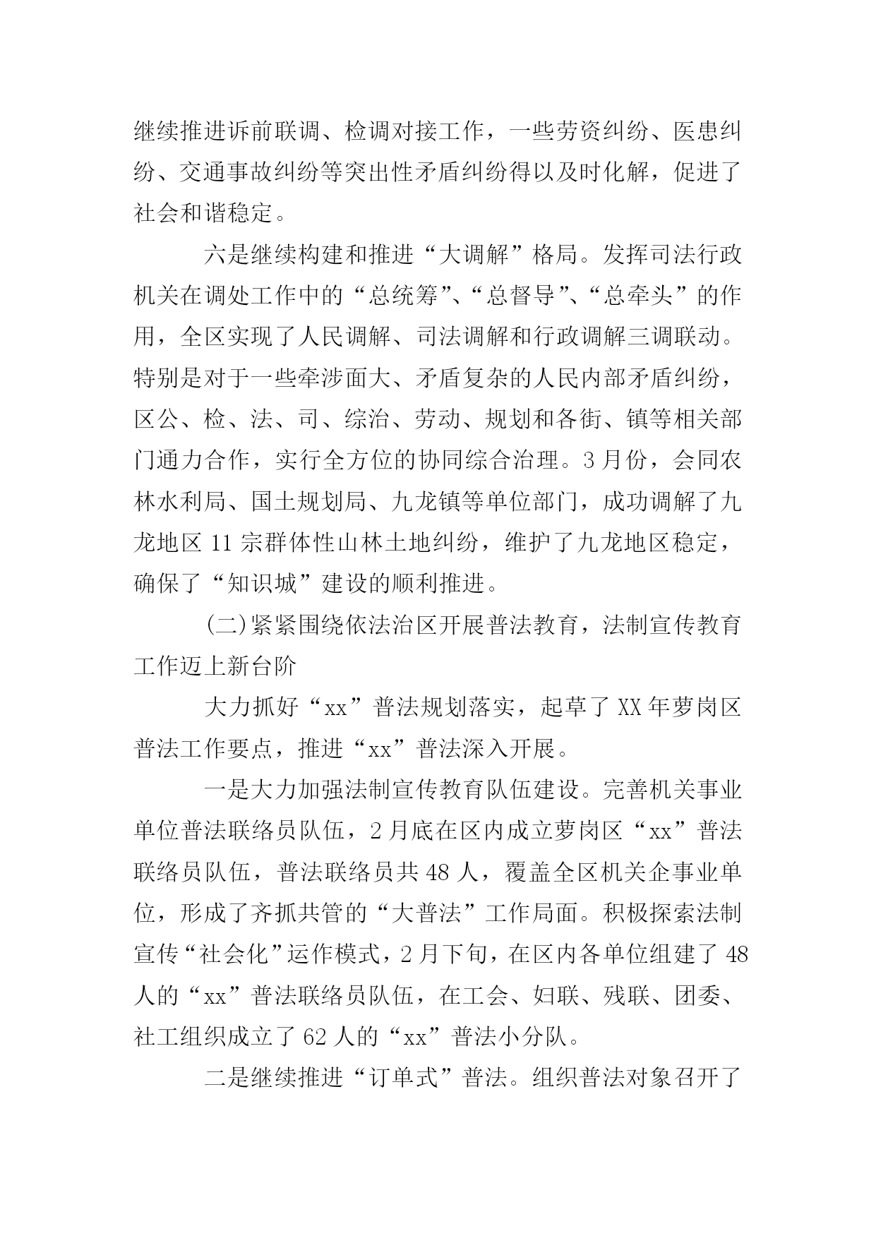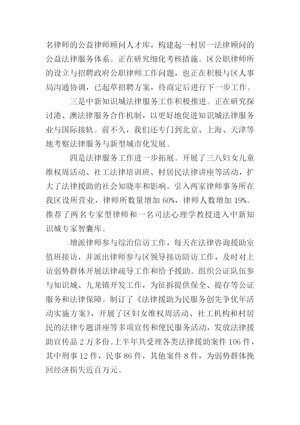 2020年司法局上半年工作小结XX年上半年,我局围绕区工作中心,突出重点,狠抓落实,圆满完成了开发区党委、管委会和萝岗区委、区政府下达的上半年工作任务、以及上级司法行政部门部署的阶段性工作任务。(一)紧紧围绕服务区委、区政府经济建设大局开展矛盾纠纷排查调处工作,社会矛盾化解工作取得新成效紧紧围绕区委、区政府经济建设及和谐稳定两个大局,充分发挥人民调解的优势,全力以赴开展矛盾纠纷排查调处工作。一是全力开展化解矛盾纠纷工作。及时调整了社会矛盾纠纷排查调处工作领导小组成员,加强调解调处工作的指导力度,突出抓好重大疑难矛盾纠纷的调处化解。先后在春节、“清明”“五一”、三次组织开展全区性社会矛盾纠纷排查调处工作,做到对重点问题、重点地区、重点对象和重点时段等各类不稳定因素心中有数,力争把矛盾纠纷消灭在萌芽状态。全力、快速抓好领导交办重大疑难案件的调处,市委常委、区委书记凌伟宪同志批示给我局的6件矛盾纠纷全部得到化解并有效稳控,李红卫区长交办的黄利强与罗雪君宅基地房屋买卖补偿纠纷得到有效调解。据统计,半年共排查各类矛盾纠纷286宗,调处成功271宗,民间纠纷调解率达到100%,成功率95%以上,其中5人以上的矛盾纠纷63宗,稳控61宗,实现无重大社会影响的恶性群体事件发生。二是探索建立人民调解员和信息员的表彰奖励政策。组织人员到3个司法所和6个村(居)调解委员会调研,了解当前人民调解工作存在的问题和意见建议,集思广益,调研论证人民调解员的表彰奖励政策的可行性。加大《广州市萝岗区社会矛盾纠纷排查调处工作奖励办法》的实施力度,建立一支覆盖面广、作用发挥明显的矛盾纠纷信息员队伍,完善矛盾纠纷情报信息传递机制。三是完善“萝岗区社会矛盾纠纷电子处理平台”建设。将区内各有关职能部门工作中发现的社会矛盾纠纷隐患收进平台统一管理,实现对纠纷信息的全面调处和掌握,为领导决策提供参考。半年以来,共收到群众事前主动报送纠纷信息56条,审核认定50条,奖励信息报送人员65名,发放奖励金8000元。通过掌握矛盾纠纷信息,成功化解5人以上的群体性纠纷11件,防止群体性上访5批24人。四是加大企业调解组织建设力度。完善企业调解组织建设,组织6个司法所到规模企业宣传人民调解工作对企业发展的作用和意义,动员企业抓好人民调解组织的组建工作,动员各方面力量参与排查调处不稳定因素工作。各司法所分别在辖内规模以上的企业选取1家单位建立人民调解委员会,并对调解委员会成员进行了一次培训。五是进一步创新矛盾纠纷化解工作机制。实行区、街(镇)、村(居)矛盾纠纷排查调处三级例会制度,定期分析矛盾纠纷形势;完善敏感时期专项排查调处制度,严格执行“24小时值班”制度和“零报告”制度。会同区法院和区检察院继续推进诉前联调、检调对接工作,一些劳资纠纷、医患纠纷、交通事故纠纷等突出性矛盾纠纷得以及时化解,促进了社会和谐稳定。六是继续构建和推进“大调解”格局。发挥司法行政机关在调处工作中的“总统筹”、“总督导”、“总牵头”的作用,全区实现了人民调解、司法调解和行政调解三调联动。特别是对于一些牵涉面大、矛盾复杂的人民内部矛盾纠纷,区公、检、法、司、综治、劳动、规划和各街、镇等相关部门通力合作,实行全方位的协同综合治理。3月份,会同农林水利局、国土规划局、九龙镇等单位部门,成功调解了九龙地区11宗群体性山林土地纠纷,维护了九龙地区稳定,确保了“知识城”建设的顺利推进。(二)紧紧围绕依法治区开展普法教育,法制宣传教育工作迈上新台阶大力抓好“xx”普法规划落实,起草了XX年萝岗区普法工作要点,推进“xx”普法深入开展。一是大力加强法制宣传教育队伍建设。完善机关事业单位普法联络员队伍,2月底在区内成立萝岗区“xx”普法联络员队伍,普法联络员共48人,覆盖全区机关企事业单位,形成了齐抓共管的“大普法”工作局面。积极探索法制宣传“社会化”运作模式,2月下旬,在区内各单位组建了48人的“xx”普法联络员队伍,在工会、妇联、残联、团委、社工组织成立了62人的“xx”普法小分队。二是继续推进“订单式”普法。组织普法对象召开了一次供需见面会,征求他们对学法的需求,开展针对性普法。与广告公司签订普法短剧制作合同,已开始剧本创作;与区建环局协调确定把萝岗香雪公园赏梅亭作为“法治文化公园”的选址,并请广告公司设计了方案。结合外来工招聘会、“三.八”妇女节、“3.15”消费者权益保障日广泛开展了法制宣传活动,发放宣传资料5000余份,制作法律知识展板70版,制作法制橱窗宣传画100余副,为企业外来工和村(居)民播放法制电影10场。三是大力推进“民主法治示范村”和“民主法治示范社区”建设。会同人大依法治区办完成了“民主法治示范村(社区)”创建活动实施方案和创建工作标准的起草工