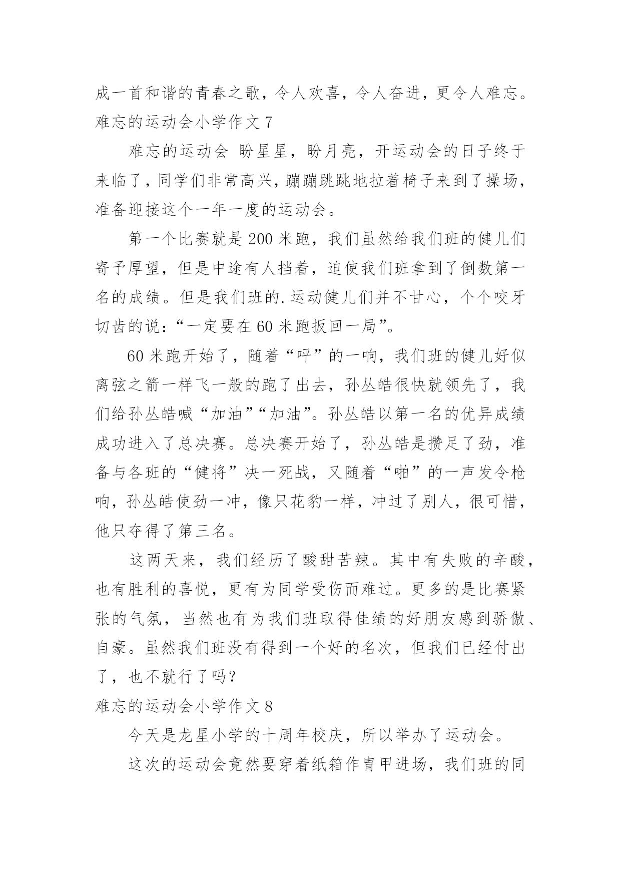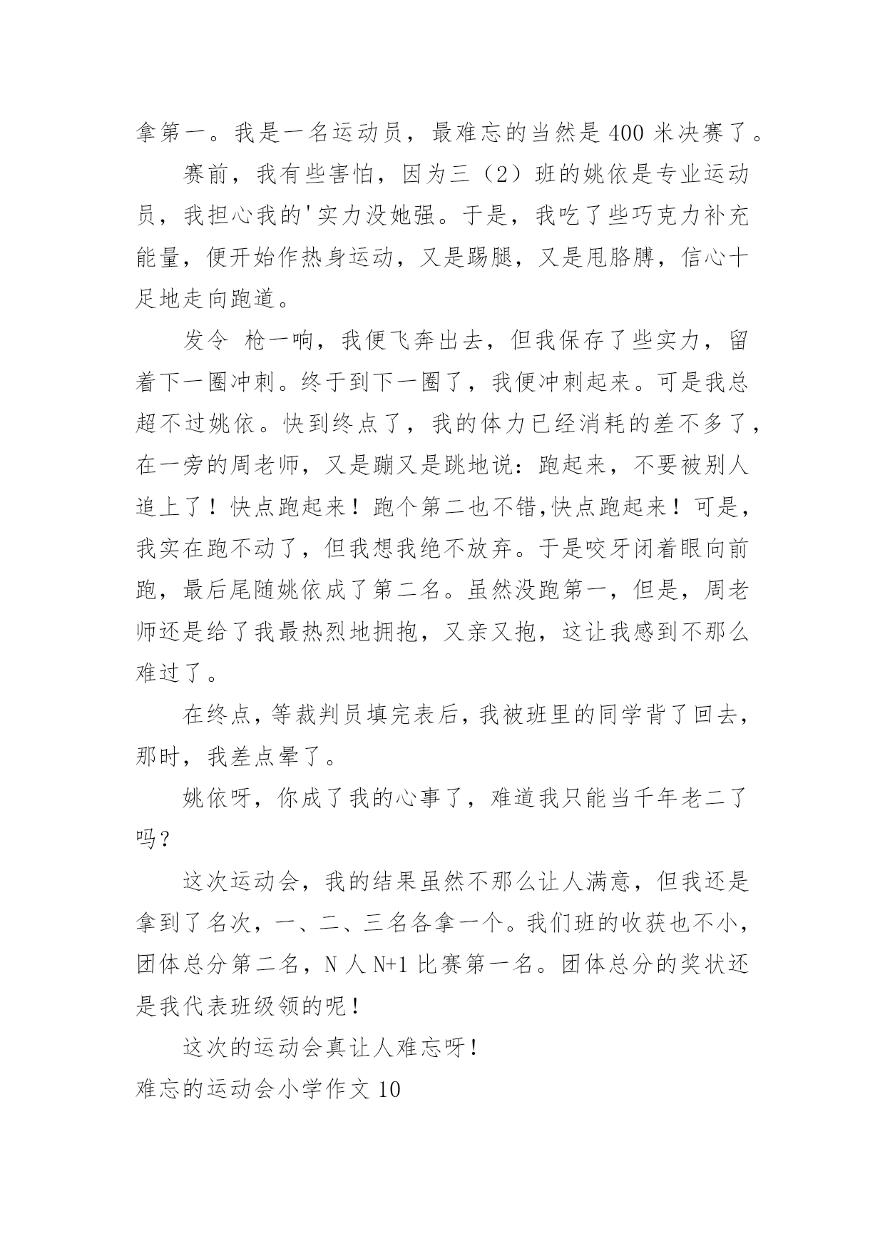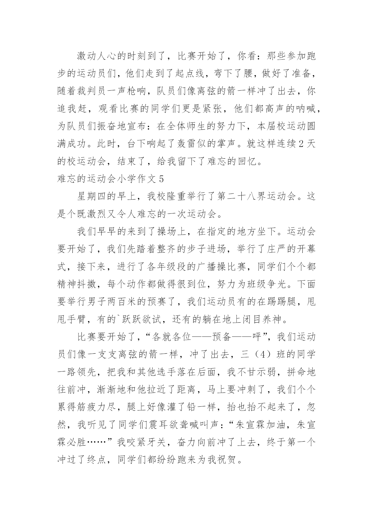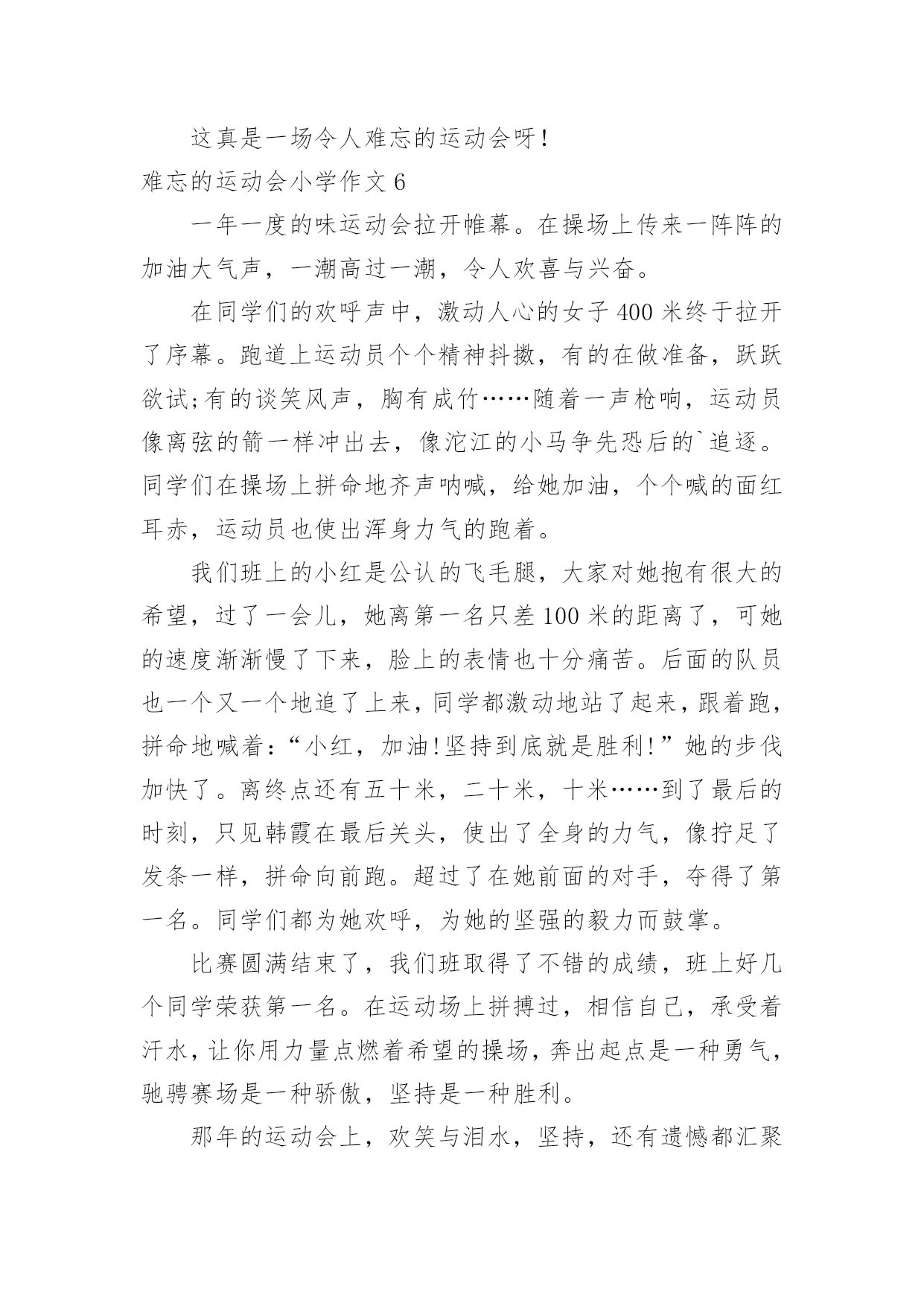 难忘的运动会小学作文难忘的运动会小学作文在日常的学习、工作、生活中,许多人都有过写作文的经历,对作文都不陌生吧,借助作文人们可以反映客观事物、表达思想感情、传递知识信息。那么,怎么去写作文呢?下面是小编为大家收集的难忘的运动会小学作文,欢迎大家借鉴与参考,希望对大家有所帮助。难忘的运动会小学作文1那是一个普通的星期四,天气晴朗,阳光明媚,学校里到处洋溢着欢声笑语。原来,我们学校正在开展别开生面的趣味运动会。既然是趣味运动会,那项目一定是非常有趣的。运动会上开展了四个集体项目:蜈蚣爬,脚脚相连,风火轮和神投手。我觉得最有趣的还是“惨叫声”不绝于耳的脚脚相连。全部的同学被分为男女两队,劈叉下去,把脚连在一起,测量队伍的长度,规则是最长的那个班获胜。有一些平时学跳舞的同学,轻轻松松的'就可以劈一字马,但有些不学跳舞的同学,就只能劈“八”字马。我的柔韧度也是极差的,在我艰难的劈下“八”字马后,我听见操场上“惨叫连连”,真让我觉得又难受又好笑啊。运动会上,让我印象最深的,最激动人心的,还要数男子400米跑了。只听见“??”的一声枪响,运动员们起跑了。整个观众席沸腾了起来,大家都在为运动员们加油,我也大声地为我们班的运动健儿陈明宇呐喊助威起来。别看陈明宇个子小,但他跑起来可快了!第一圈是,他像只轻快的燕子,轻轻松松地就把其他远动员甩在了身后,到第二圈是,明显的感到他的脚步有些沉重了,大滴的汗水从他的脸上滴落下来,他的脸也憋得通红,看起来很累,但他咬紧牙关,不言放弃,最终,他获得了第一名!我们都欢呼雀跃起来,为他高兴,为他感到自豪。运动会已经过去很久了,但每当我想起时,我总会感觉自己仿佛还置身于运动会的欢乐场景里。难忘的运动会小学作文2我们学校每年都要开运动会,两年前的那场运动会,至今让我难以忘怀。那天,操场上人山人海的,突然,操场上安静了下来,只听指挥员说:“跳绳比赛正式开始!”我的好朋友小芳拿起跳绳,手飞快地挥舞着,绳子像一条花蛇在空中翻飞,小芳脚下生风,两条腿上下交替,我都数不清跳的次数了。只听指挥员说:“停!统计成绩。小芳124下。”天啊!我惊呆了。回想一个月前,接到比赛通知时,她还不会跳绳,笨手笨脚的样子惹得同学哈哈大笑,她羞红了脸,丢下绳子跑到班里哭了。作为副班长的我,有责任去开导她,我紧跟着她回到班里,安慰她,替她想对策。我决定每天放学后教她学跳绳。她体质差,没跳几下就气喘吁吁的。我建议她每天喝杯牛奶,蒙牛奶价格便宜,质量好,经常喝可以补充能量。每天放学后,我们俩先练一会儿跳绳,再写作业。一个月过去了,她跳得非常快,腿上好像装了风火轮一样。这次比赛,小芳竟然比平时多跳了40多下,简直出乎了我的.预料。得了第一名的她开心极了,一下子抱住了我。我也很自豪,因为她为班级增添了荣誉。一个人的努力不但能为班集体争得荣誉,还可以增强一个班级的凝聚力。难忘的运动会小学作文3运动,在我眼里,它就是健康的代言词。在前几天,学校举办了运动会,来让运动员们大显身手。举办运动会的消息刚一传开,操场上训练的人就一下子增多了。有跳远的、跑步的,好多项目都有。运动员们都很紧张,有序的在操场上天天训练着。等啊等,终于等到运动会了。校长宣布完运动会开幕后,我们都回到教室,拿来凳子,准备好好看看这次运动会。最有看点的当然是跑步了!你在没到终点前,永远不知道谁是第一。伴着一声枪响,运动员们摆动着手臂,甩动着双腿,拼尽全身力气向终点飞奔而去。赛场上不断传来“加油!加油!”的喊叫声。运动员们听了,更加斗志激昂,跑得越来越快,决心要拿下第一。最干脆利落的就是投球比赛了!胜负只在转瞬之间。运动员们个个精神饱满,斗志昂扬。他们拿起球,奋力向前扔去,球快速向前冲去,过一会儿便落在了地上。团队比赛是很考验默契的.,特别是五年级的跳长绳。我们班的男生也许是配合不好,好几次都绊倒了,好在最后挽回了这个局面。而女生绊的少,成绩也比男生好一点。比赛如火如荼的进行着。中途不乏一些精彩的画面。比如,球被好几次扔出界了,让大家既佩服,又惊讶。运动会持续了两天半,有许多难忘的画面被保存在了相机里。当闭幕式时,学校宣布了许多许多奖项,我们班也有不少,每个人都开心极了。这次运动会真难忘,它让我知道:要不断超越自己。难忘的运动会小学作文4在一个阳光明媚、万里晴空的好日子里。我校举行了秋季趣味运动会,这次的项目有跑步,跳高,跳远等。这是一次团结的盛会,拼搏的盛会,展示了我校素质教育下的成果,展示青春风采,让同学们在享受拼搏,享受快乐的同时,学会竞争,学会合作,学会沟通。其实在运动会上,我们可以得到很多的东西,最主要的并非是名次和荣誉。有些可能要比这些更可贵,更值得珍惜,像是人与人之间的友谊,帮助和真诚。在一个阳光明媚、万里晴空的好日子里。我校举行了运动会,这次的项目有跑步,跳高,跳远等。首先队员们