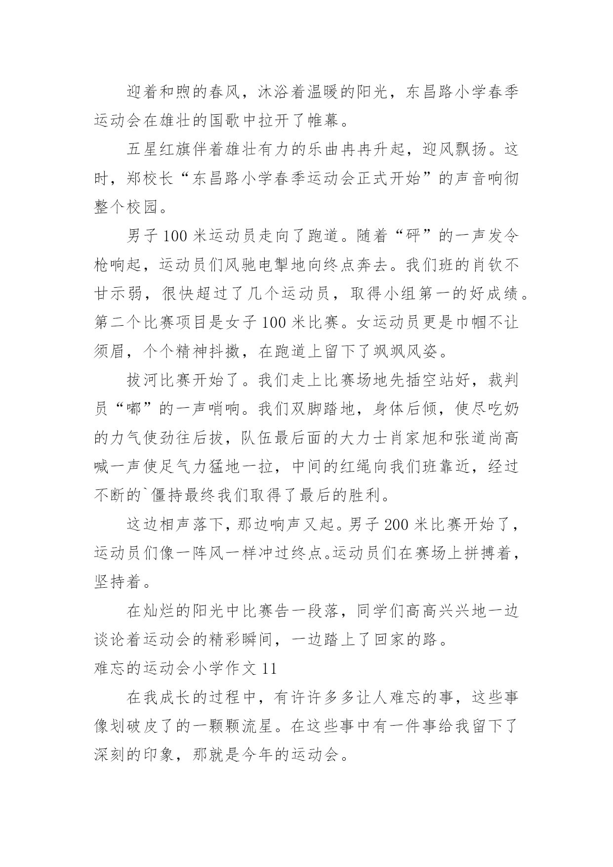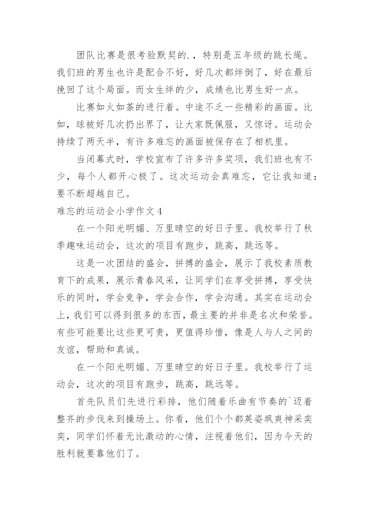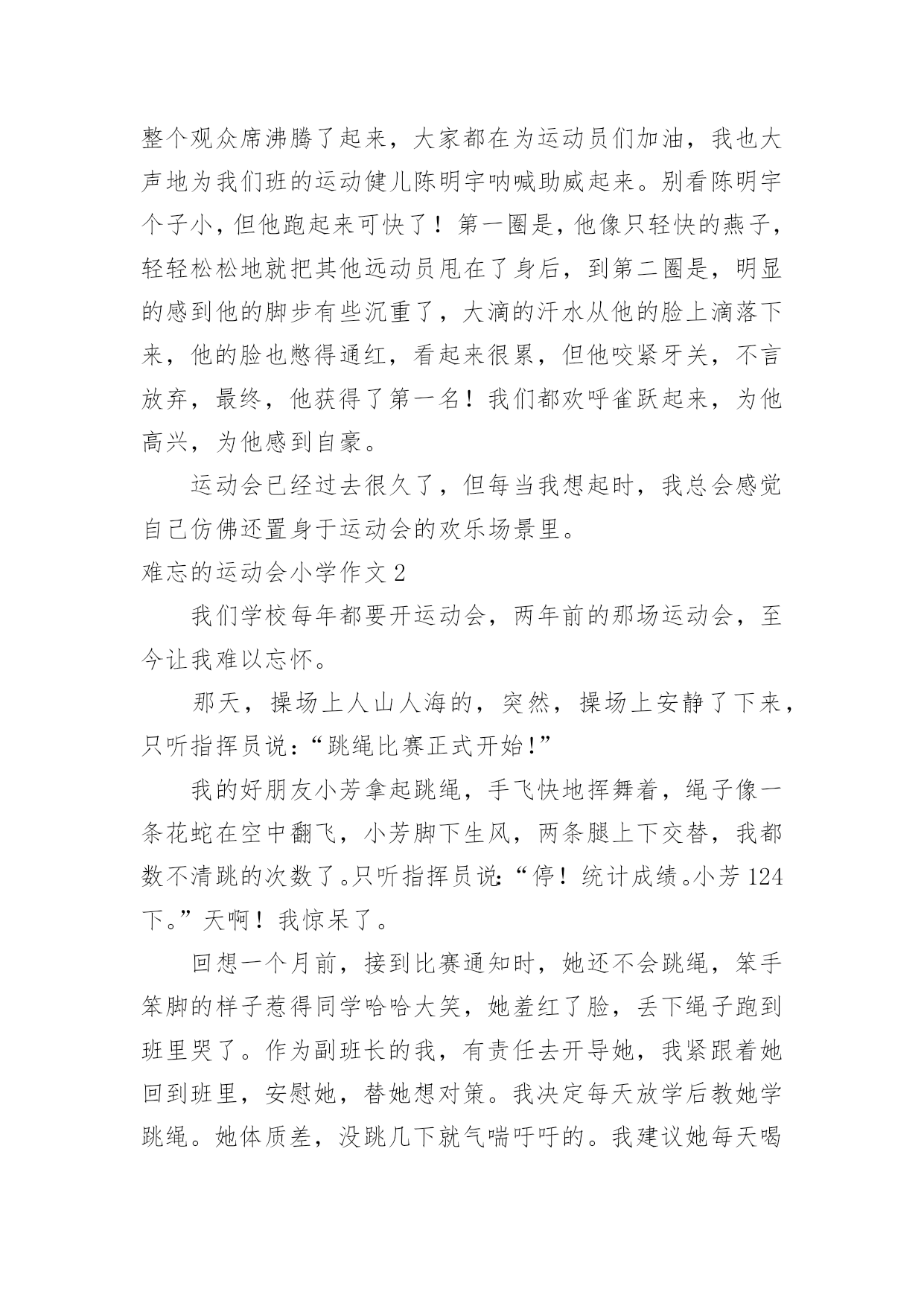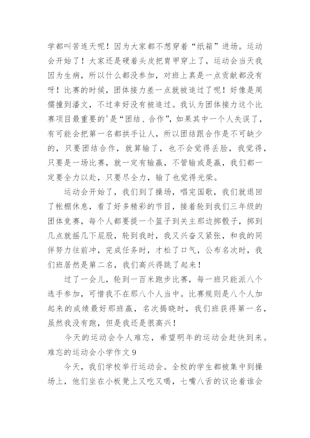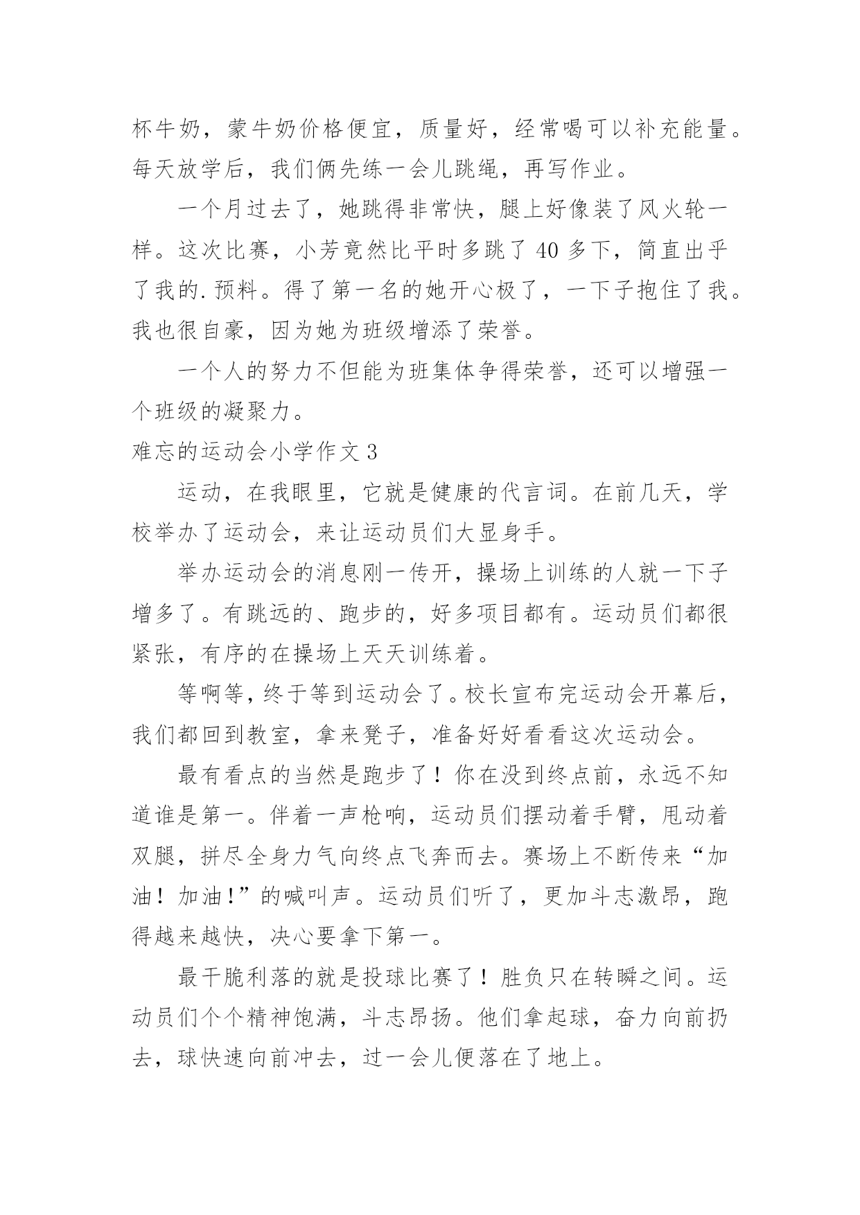 难忘的运动会小学作文难忘的运动会小学作文在日常的学习、工作、生活中,许多人都有过写作文的经历,对作文都不陌生吧,借助作文人们可以反映客观事物、表达思想感情、传递知识信息。那么,怎么去写作文呢?下面是小编为大家收集的难忘的运动会小学作文,欢迎大家借鉴与参考,希望对大家有所帮助。难忘的运动会小学作文1那是一个普通的星期四,天气晴朗,阳光明媚,学校里到处洋溢着欢声笑语。原来,我们学校正在开展别开生面的趣味运动会。既然是趣味运动会,那项目一定是非常有趣的。运动会上开展了四个集体项目:蜈蚣爬,脚脚相连,风火轮和神投手。我觉得最有趣的还是“惨叫声”不绝于耳的脚脚相连。全部的同学被分为男女两队,劈叉下去,把脚连在一起,测量队伍的长度,规则是最长的那个班获胜。有一些平时学跳舞的同学,轻轻松松的'就可以劈一字马,但有些不学跳舞的同学,就只能劈“八”字马。我的柔韧度也是极差的,在我艰难的劈下“八”字马后,我听见操场上“惨叫连连”,真让我觉得又难受又好笑啊。运动会上,让我印象最深的,最激动人心的,还要数男子400米跑了。只听见“??”的一声枪响,运动员们起跑了。整个观众席沸腾了起来,大家都在为运动员们加油,我也大声地为我们班的运动健儿陈明宇呐喊助威起来。别看陈明宇个子小,但他跑起来可快了!第一圈是,他像只轻快的燕子,轻轻松松地就把其他远动员甩在了身后,到第二圈是,明显的感到他的脚步有些沉重了,大滴的汗水从他的脸上滴落下来,他的脸也憋得通红,看起来很累,但他咬紧牙关,不言放弃,最终,他获得了第一名!我们都欢呼雀跃起来,为他高兴,为他感到自豪。运动会已经过去很久了,但每当我想起时,我总会感觉自己仿佛还置身于运动会的欢乐场景里。难忘的运动会小学作文2我们学校每年都要开运动会,两年前的那场运动会,至今让我难以忘怀。那天,操场上人山人海的,突然,操场上安静了下来,只听指挥员说:“跳绳比赛正式开始!”我的好朋友小芳拿起跳绳,手飞快地挥舞着,绳子像一条花蛇在空中翻飞,小芳脚下生风,两条腿上下交替,我都数不清跳的次数了。只听指挥员说:“停!统计成绩。小芳124下。”天啊!我惊呆了。回想一个月前,接到比赛通知时,她还不会跳绳,笨手笨脚的样子惹得同学哈哈大笑,她羞红了脸,丢下绳子跑到班里哭了。作为副班长的我,有责任去开导她,我紧跟着她回到班里,安慰她,替她想对策。我决定每天放学后教她学跳绳。她体质差,没跳几下就气喘吁吁的。我建议她每天喝杯牛奶,蒙牛奶价格便宜,质量好,经常喝可以补充能量。每天放学后,我们俩先练一会儿跳绳,再写作业。一个月过去了,她跳得非常快,腿上好像装了风火轮一样。这次比赛,小芳竟然比平时多跳了40多下,简直出乎了我的.预料。得了第一名的她开心极了,一下子抱住了我。我也很自豪,因为她为班级增添了荣誉。一个人的努力不但能为班集体争得荣誉,还可以增强一个班级的凝聚力。难忘的运动会小学作文3运动,在我眼里,它就是健康的代言词。在前几天,学校举办了运动会,来让运动员们大显身手。举办运动会的消息刚一传开,操场上训练的人就一下子增多了。有跳远的、跑步的,好多项目都有。运动员们都很紧张,有序的在操场上天天训练着。等啊等,终于等到运动会了。校长宣布完运动会开幕后,我们都回到教室,拿来凳子,准备好好看看这次运动会。最有看点的当然是跑步了!你在没到终点前,永远不知道谁是第一。伴着一声枪响,运动员们摆动着手臂,甩动着双腿,拼尽全身力气向终点飞奔而去。赛场上不断传来“加油!加油!”的喊叫声。运动员们听了,更加斗志激昂,跑得越来越快,决心要拿下第一。最干脆利落的就是投球比赛了!胜负只在转瞬之间。运动员们个个精神饱满,斗志昂扬。他们拿起球,奋力向前扔去,球快速向前冲去,过一会儿便落在了地上。团队比赛是很考验默契的.,特别是五年级的跳长绳。我们班的男生也许是配合不好,好几次都绊倒了,好在最后挽回了这个局面。而女生绊的少,成绩也比男生好一点。比赛如火如荼的进行着。中途不乏一些精彩的画面。比如,球被好几次扔出界了,让大家既佩服,又惊讶。运动会持续了两天半,有许多难忘的画面被保存在了相机里。当闭幕式时,学校宣布了许多许多奖项,我们班也有不少,每个人都开心极了。这次运动会真难忘,它让我知道:要不断超越自己。难忘的运动会小学作文4在一个阳光明媚、万里晴空的好日子里。我校举行了秋季趣味运动会,这次的项目有跑步,跳高,跳远等。这是一次团结的盛会,拼搏的盛会,展示了我校素质教育下的成果,展示青春风采,让同学们在享受拼搏,享受快乐的同时,学会竞争,学会合作,学会沟通。其实在运动会上,我们可以得到很多的东西,最主要的并非是名次和荣誉。有些可能要比这些更可贵,更值得珍惜,像是人与人之间的友谊,帮助和真诚。在一个阳光明媚、万里晴空的好日子里。我校举行了运动会,这次的项目有跑步,跳高,跳远等。首先队员们