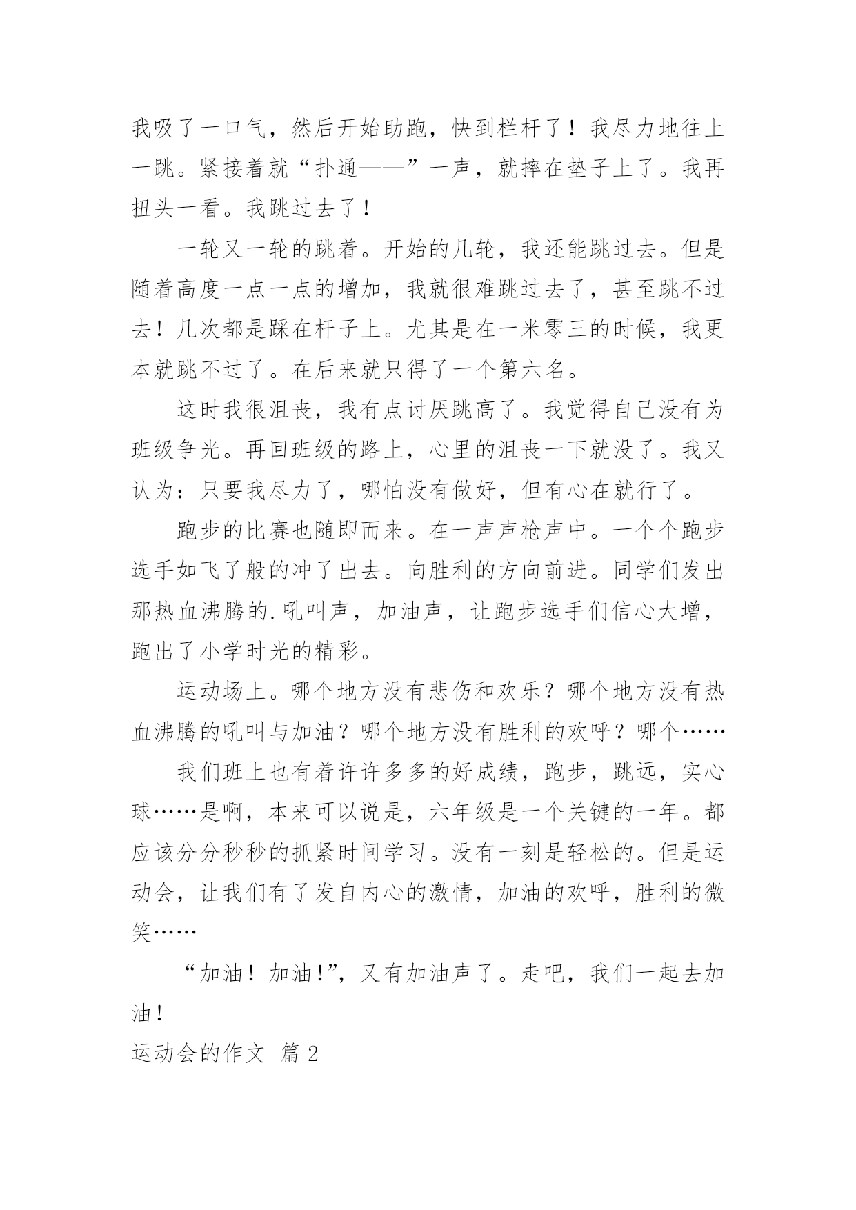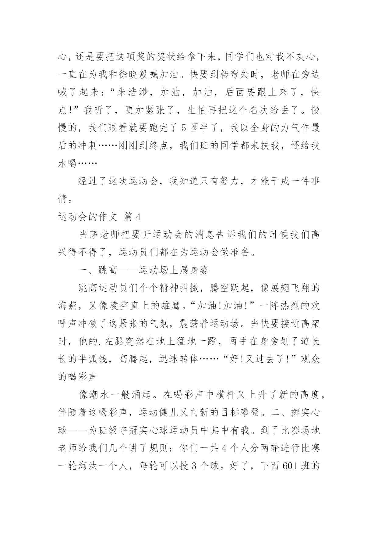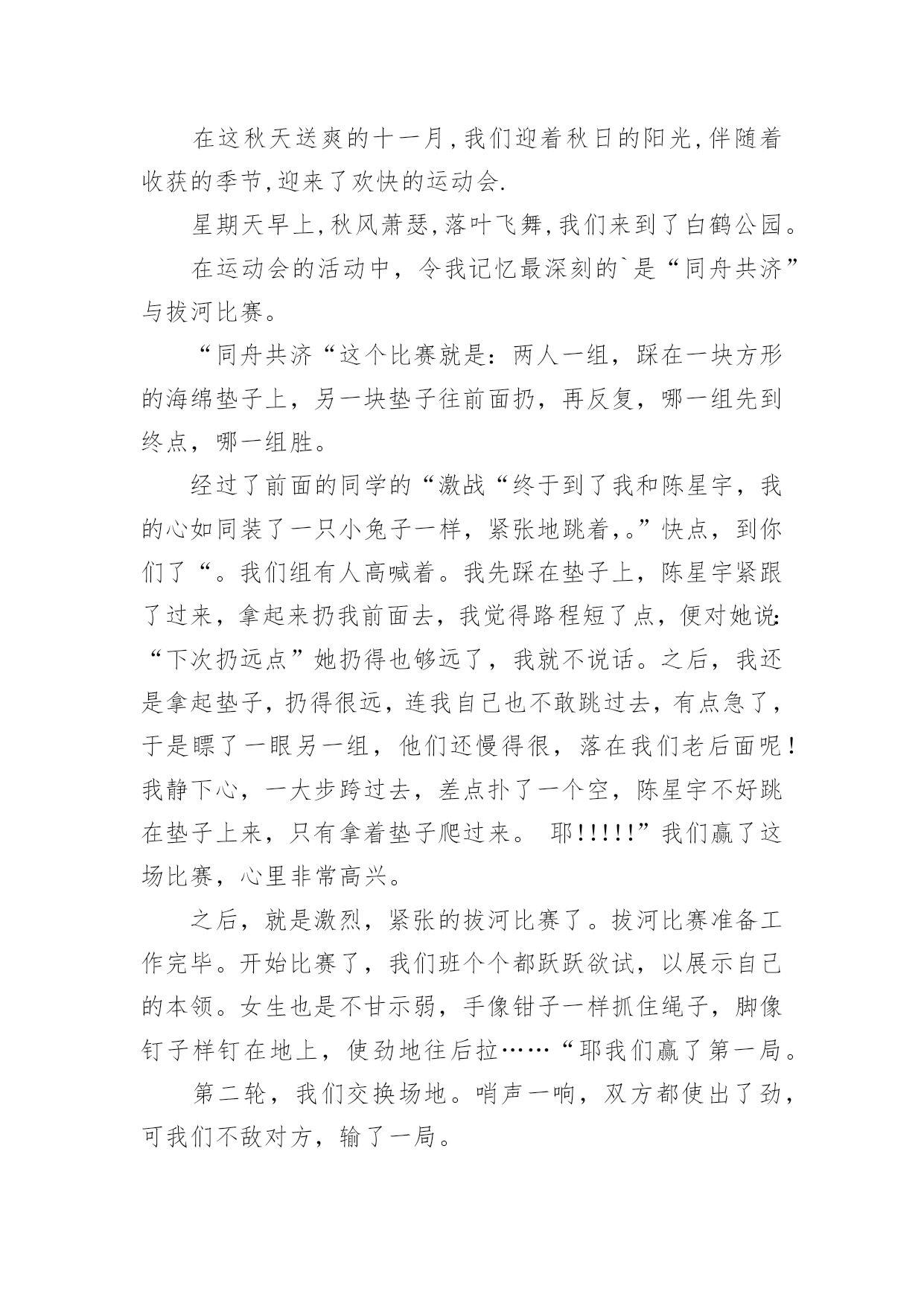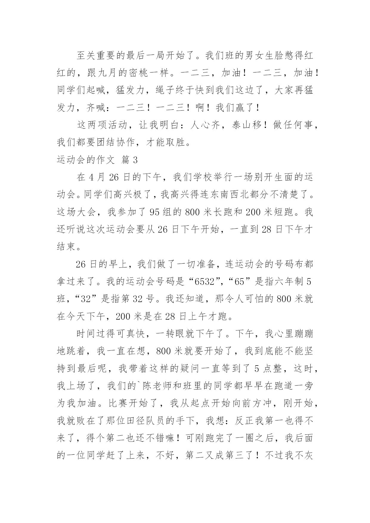 运动会的作文在现实生活或工作学习中,大家或多或少都会接触过作文吧,作文可分为小学作文、中学作文、大学作文(论文)。那么一般作文是怎么写的呢?下面是小编精心整理的运动会的作文4篇,供大家参考借鉴,希望可以帮助到有需要的朋友。运动会的作文篇1一年一度的校园运动会又来了。大家也怀着好心情来到了学校。每个人都带着五颜六色的小板凳,说说笑笑的来到了学校。很快的,开幕式开始了。每一个班级在响亮的音乐中迈着正步铿锵有力地走着。紧接着就是罗校长,于校长为运动会致辞。在于海燕校长宣誓:“我宣布……运动会正式开始!”的时候,全校学生同时欢呼着!那几乎能把教学楼都能整塌了!同学们立刻地回到了自己的位置上。就在这时,运动会开始了。大家忙得不可开交。去准备比赛的,说话的,还在练习的……我也不例外。今天上午就有一场我要参加的跳高比赛。我急忙忙的来到了比赛场地。后来,才发现大家都到了。我可以算是迟到了。一眨眼,比赛就开始了。跳高的选手,一个一个连接的跳去,但是没有几个能跳过去的。这让我本身就很紧张的心就更紧张了。“没事的,别紧张。去年你不是跳过了嘛!没关系的,要相信自己!”我不断地自我安慰着。轮到我了,我吸了一口气,然后开始助跑,快到栏杆了!我尽力地往上一跳。紧接着就“扑通——”一声,就摔在垫子上了。我再扭头一看。我跳过去了!一轮又一轮的跳着。开始的几轮,我还能跳过去。但是随着高度一点一点的增加,我就很难跳过去了,甚至跳不过去!几次都是踩在杆子上。尤其是在一米零三的时候,我更本就跳不过了。在后来就只得了一个第六名。这时我很沮丧,我有点讨厌跳高了。我觉得自己没有为班级争光。再回班级的路上,心里的沮丧一下就没了。我又认为:只要我尽力了,哪怕没有做好,但有心在就行了。跑步的比赛也随即而来。在一声声枪声中。一个个跑步选手如飞了般的冲了出去。向胜利的方向前进。同学们发出那热血沸腾的.吼叫声,加油声,让跑步选手们信心大增,跑出了小学时光的精彩。运动场上。哪个地方没有悲伤和欢乐?哪个地方没有热血沸腾的吼叫与加油?哪个地方没有胜利的欢呼?哪个……我们班上也有着许许多多的好成绩,跑步,跳远,实心球……是啊,本来可以说是,六年级是一个关键的一年。都应该分分秒秒的抓紧时间学习。没有一刻是轻松的。但是运动会,让我们有了发自内心的激情,加油的欢呼,胜利的微笑……“加油!加油!”,又有加油声了。走吧,我们一起去加油!运动会的作文篇2在这秋天送爽的十一月,我们迎着秋日的阳光,伴随着收获的季节,迎来了欢快的运动会.星期天早上,秋风萧瑟,落叶飞舞,我们来到了白鹤公园。在运动会的活动中,令我记忆最深刻的`是“同舟共济”与拔河比赛。“同舟共济“这个比赛就是:两人一组,踩在一块方形的海绵垫子上,另一块垫子往前面扔,再反复,哪一组先到终点,哪一组胜。经过了前面的同学的“激战“终于到了我和陈星宇,我的心如同装了一只小兔子一样,紧张地跳着,。”快点,到你们了“。我们组有人高喊着。我先踩在垫子上,陈星宇紧跟了过来,拿起来扔我前面去,我觉得路程短了点,便对她说:“下次扔远点”她扔得也够远了,我就不说话。之后,我还是拿起垫子,扔得很远,连我自己也不敢跳过去,有点急了,于是瞟了一眼另一组,他们还慢得很,落在我们老后面呢!我静下心,一大步跨过去,差点扑了一个空,陈星宇不好跳在垫子上来,只有拿着垫子爬过来。耶!!!!!”我们赢了这场比赛,心里非常高兴。之后,就是激烈,紧张的拔河比赛了。拔河比赛准备工作完毕。开始比赛了,我们班个个都跃跃欲试,以展示自己的本领。女生也是不甘示弱,手像钳子一样抓住绳子,脚像钉子样钉在地上,使劲地往后拉……“耶我们赢了第一局。第二轮,我们交换场地。哨声一响,双方都使出了劲,可我们不敌对方,输了一局。至关重要的最后一局开始了。我们班的男女生脸憋得红红的,跟九月的密桃一样。一二三,加油!一二三,加油!同学们起喊,猛发力,绳子终于快到我们这边了,大家再猛发力,齐喊:一二三!一二三!啊!我们赢了!这两项活动,让我明白:人心齐,泰山移!做任何事,我们都要团结协作,才能取胜。运动会的作文篇3在4月26日的下午,我们学校举行一场别开生面的运动会。同学们高兴极了,我高兴得连东南西北都分不清楚了。这场大会,我参加了95组的800米长跑和200米短跑。我还听说这次运动会要从26日下午开始,一直到28日下午才结束。26日的早上,我们做了一切准备,连运动会的号码布都拿过来了。我的运动会号码是“6532”,“65”是指六年制5班,“32”是指第32号。我还知道,那令人可怕的800米就在今天下午,200米是在28日上午才跑。时间过得可真快,一转眼就下午了。下午,我心里蹦蹦地跳着,我一直在想,800米就要开始了,我到底能不能坚持到最后呢,我带着这样的疑问一直等到了5点整,这时,我上场了,我们的`陈老师和班里的同学