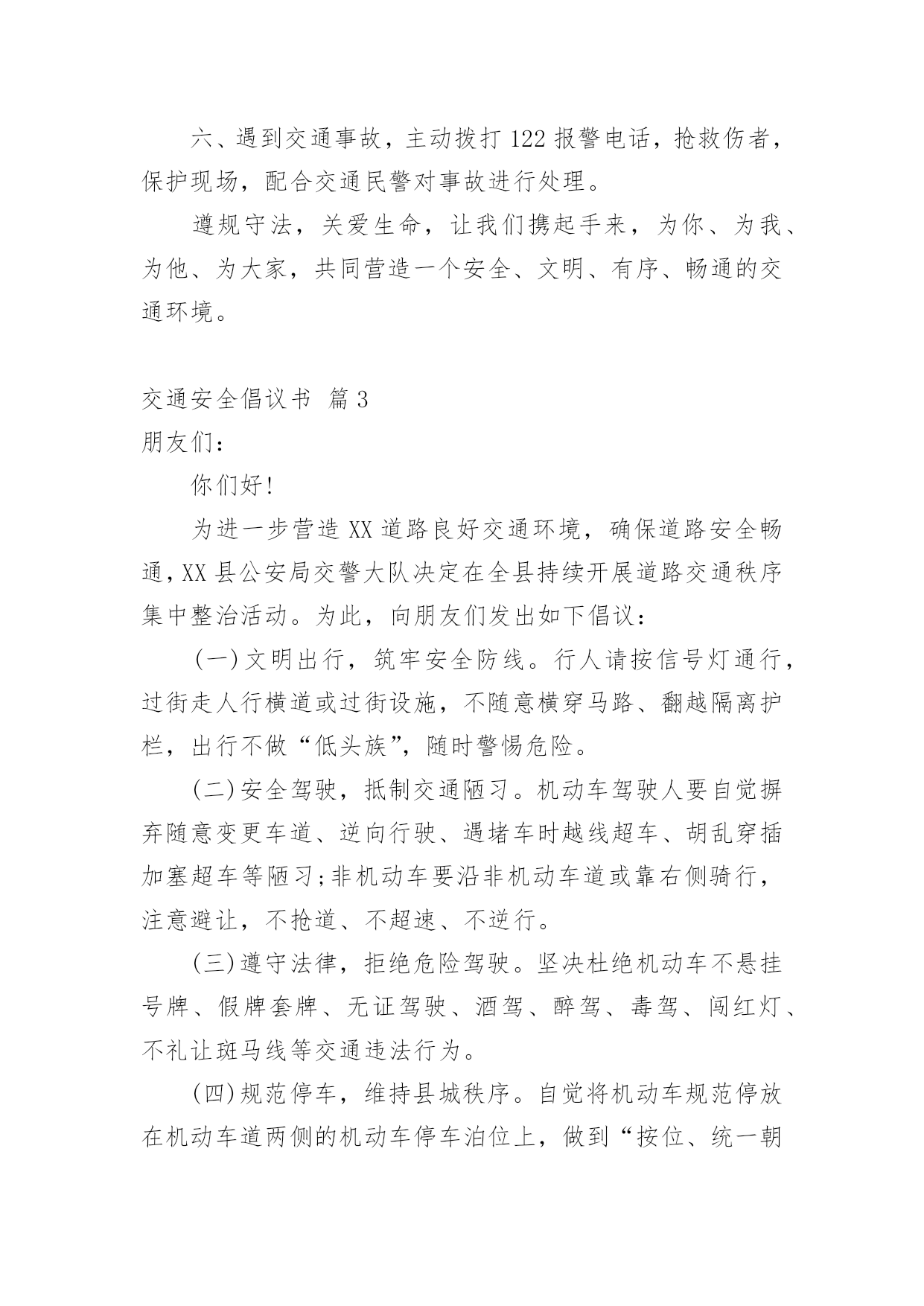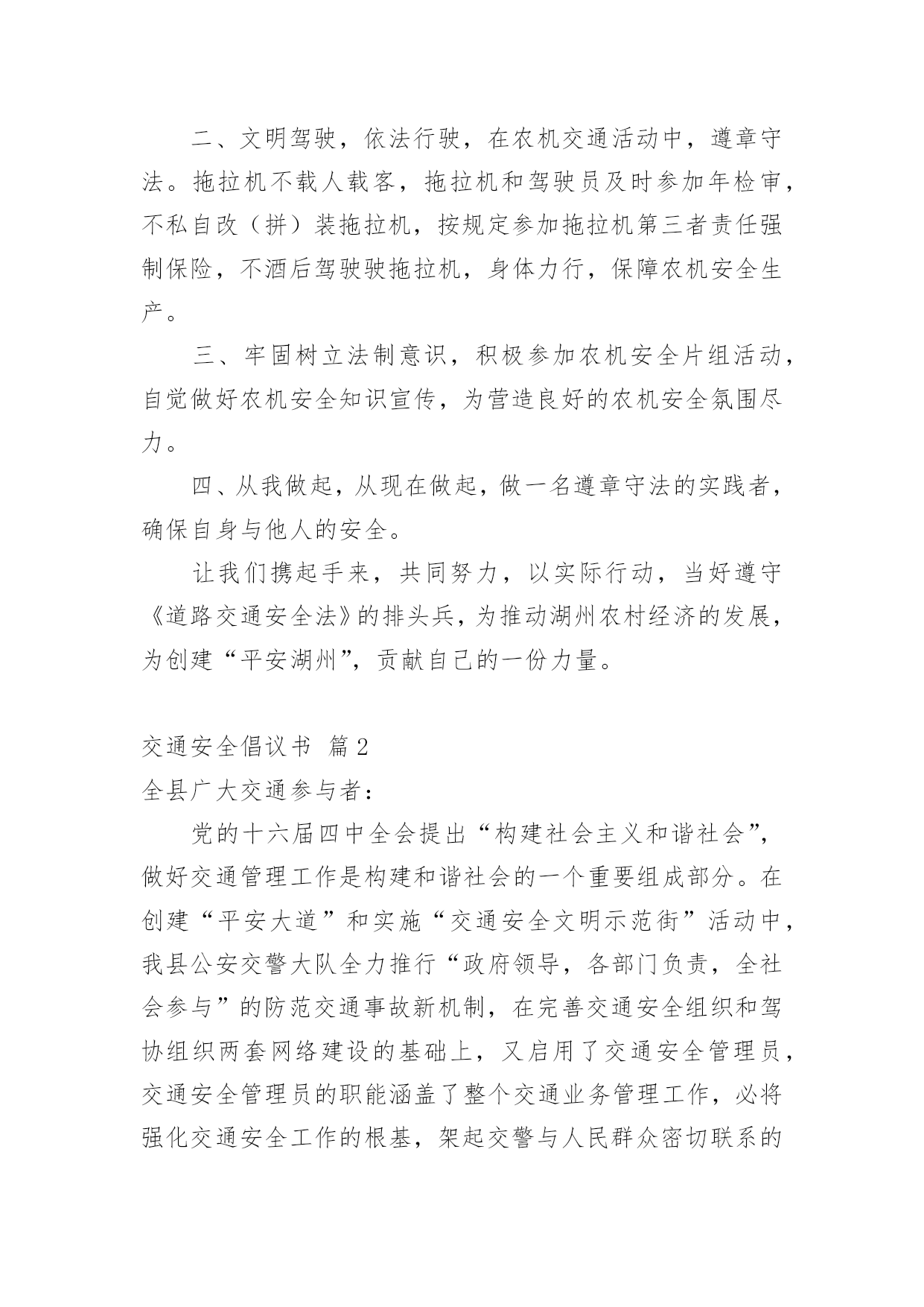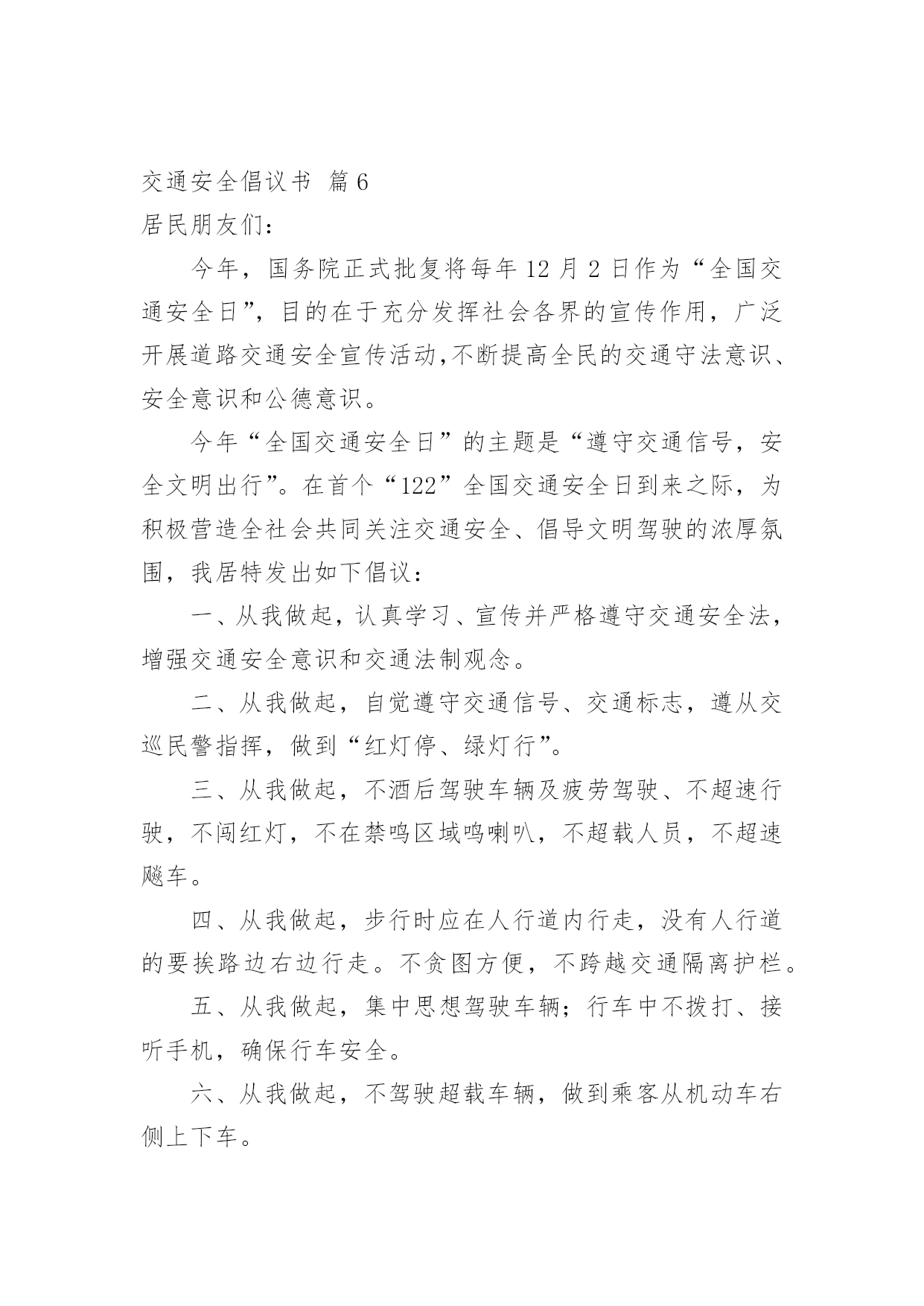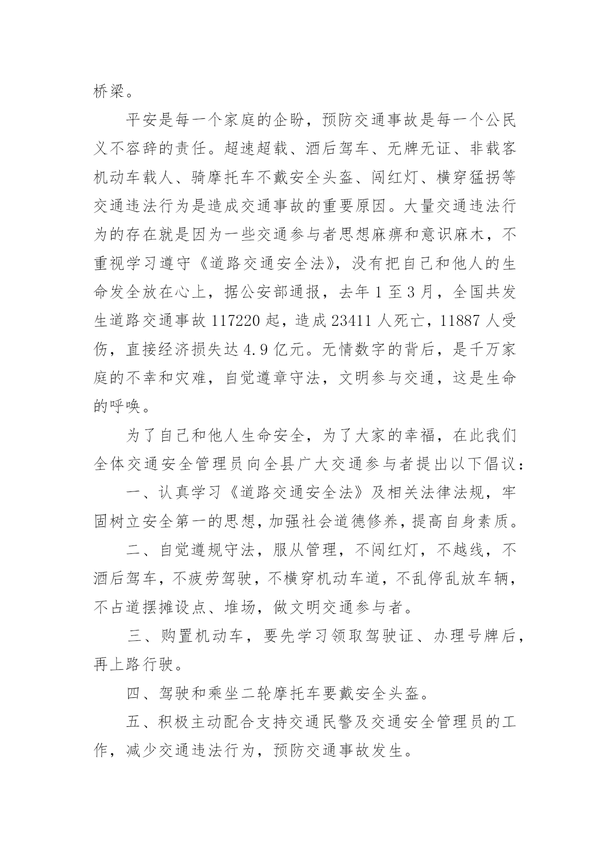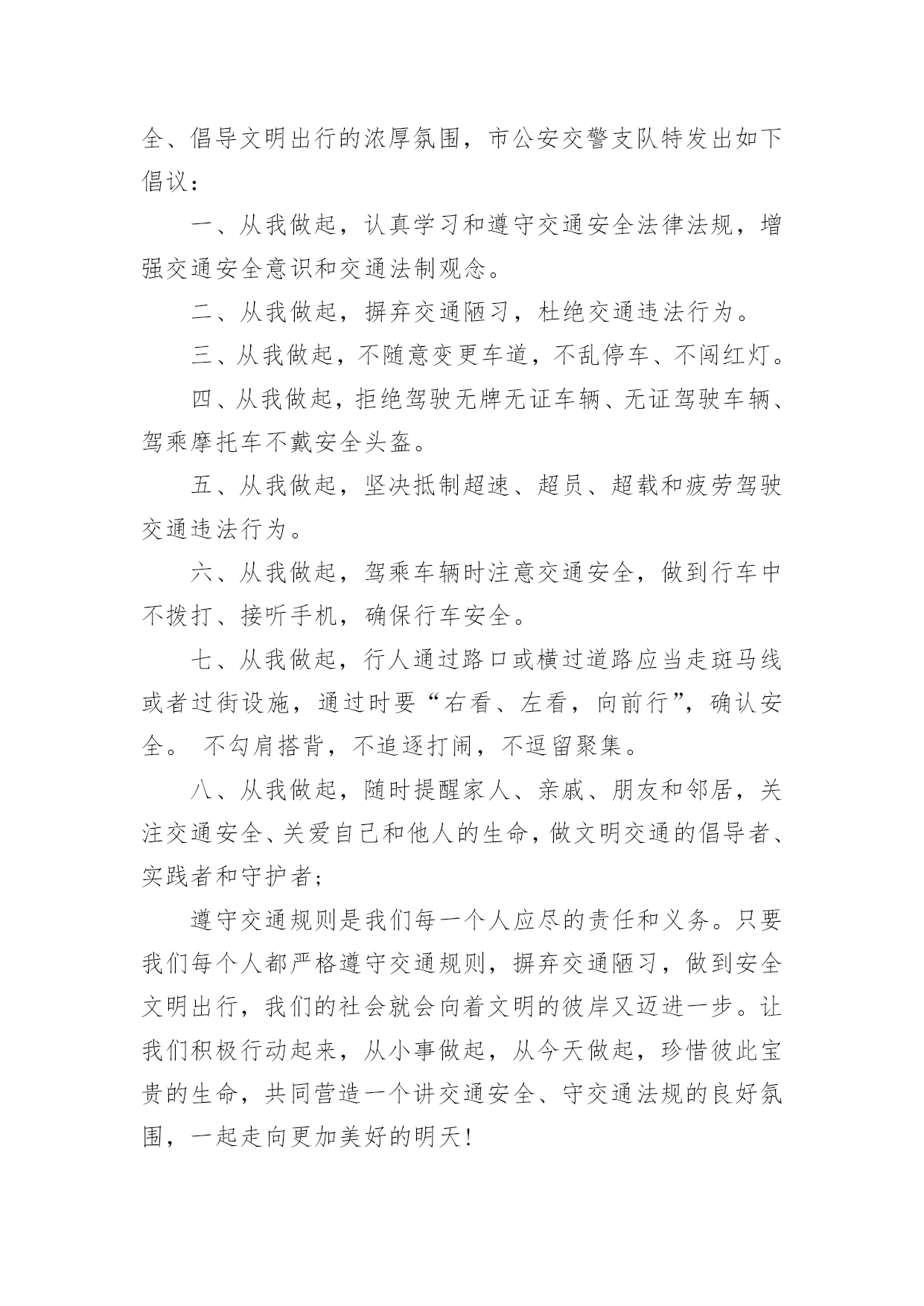 交通安全倡议书【精华】交通安全倡议书范文汇总10篇现如今,需要使用倡议书的场合越来越多,倡议书是一种号召性的专用书信,具有一定的格式要求。你所见过的倡议书是什么样的呢?以下是小编为大家收集的交通安全倡议书10篇,欢迎阅读与收藏。交通安全倡议书篇1尊敬的拖拉机驾驶员:随着社会的不断进步,我市拖拉机拥有量越来越多,在农村经济发展中起着重要的作用,同时给交通安全带来了不少隐患。我们可以看到,由于部分拖拉机驾驶员法律意识淡薄,安全意识差,拖拉机道路交通违章行为时有发生,使农机事故逐渐上升。据统计,XX年全市已发生拖拉机事故120起,死亡43人,严重影响了农机安全生产。为了确保人民群众生命财产安全,作为交通参与者,我们深深感到:湖州是我们的家乡,她的平安与我们紧密相连,为预防和减少拖拉机道路,为农业、农村经济发展创造良好的环境,为打造“平安湖州”尽力尽责,我们向全市拖拉机驾驶员发出如下倡议:一、自觉学习和遵守《中华人民共和国道路交通安全法》,成为学法、知法和守法的拖拉机驾驶员。二、文明驾驶,依法行驶,在农机交通活动中,遵章守法。拖拉机不载人载客,拖拉机和驾驶员及时参加年检审,不私自改(拼)装拖拉机,按规定参加拖拉机第三者责任强制保险,不酒后驾驶驶拖拉机,身体力行,保障农机安全生产。三、牢固树立法制意识,积极参加农机安全片组活动,自觉做好农机安全知识宣传,为营造良好的农机安全氛围尽力。四、从我做起,从现在做起,做一名遵章守法的实践者,确保自身与他人的安全。让我们携起手来,共同努力,以实际行动,当好遵守《道路交通安全法》的排头兵,为推动湖州农村经济的发展,为创建“平安湖州”,贡献自己的一份力量。交通安全倡议书篇2全县广大交通参与者:党的十六届四中全会提出“构建社会主义和谐社会”,做好交通管理工作是构建和谐社会的一个重要组成部分。在创建“平安大道”和实施“交通安全文明示范街”活动中,我县公安交警大队全力推行“政府领导,各部门负责,全社会参与”的防范交通事故新机制,在完善交通安全组织和驾协组织两套网络建设的基础上,又启用了交通安全管理员,交通安全管理员的职能涵盖了整个交通业务管理工作,必将强化交通安全工作的根基,架起交警与人民群众密切联系的桥梁。平安是每一个家庭的企盼,预防交通事故是每一个公民义不容辞的责任。超速超载、酒后驾车、无牌无证、非载客机动车载人、骑摩托车不戴安全头盔、闯红灯、横穿猛拐等交通违法行为是造成交通事故的重要原因。大量交通违法行为的存在就是因为一些交通参与者思想麻痹和意识麻木,不重视学习遵守《道路交通安全法》,没有把自己和他人的生命发全放在心上,据公安部通报,去年1至3月,全国共发生道路交通事故117220起,造成23411人死亡,11887人受伤,直接经济损失达4.9亿元。无情数字的背后,是千万家庭的不幸和灾难,自觉遵章守法,文明参与交通,这是生命的呼唤。为了自己和他人生命安全,为了大家的幸福,在此我们全体交通安全管理员向全县广大交通参与者提出以下倡议:一、认真学习《道路交通安全法》及相关法律法规,牢固树立安全第一的思想,加强社会道德修养,提高自身素质。二、自觉遵规守法,服从管理,不闯红灯,不越线,不酒后驾车,不疲劳驾驶,不横穿机动车道,不乱停乱放车辆,不占道摆摊设点、堆场,做文明交通参与者。三、购置机动车,要先学习领取驾驶证、办理号牌后,再上路行驶。四、驾驶和乘坐二轮摩托车要戴安全头盔。五、积极主动配合支持交通民警及交通安全管理员的工作,减少交通违法行为,预防交通事故发生。六、遇到交通事故,主动拨打122报警电话,抢救伤者,保护现场,配合交通民警对事故进行处理。遵规守法,关爱生命,让我们携起手来,为你、为我、为他、为大家,共同营造一个安全、文明、有序、畅通的交通环境。交通安全倡议书篇3朋友们:你们好!为进一步营造XX道路良好交通环境,确保道路安全畅通,XX县公安局交警大队决定在全县持续开展道路交通秩序集中整治活动。为此,向朋友们发出如下倡议:(一)文明出行,筑牢安全防线。行人请按信号灯通行,过街走人行横道或过街设施,不随意横穿马路、翻越隔离护栏,出行不做“低头族”,随时警惕危险。(二)安全驾驶,抵制交通陋习。机动车驾驶人要自觉摒弃随意变更车道、逆向行驶、遇堵车时越线超车、胡乱穿插加塞超车等陋习;非机动车要沿非机动车道或靠右侧骑行,注意避让,不抢道、不超速、不逆行。(三)遵守法律,拒绝危险驾驶。坚决杜绝机动车不悬挂号牌、假牌套牌、无证驾驶、酒驾、醉驾、毒驾、闯红灯、不礼让斑马线等交通违法行为。(四)规范停车,维持县城秩序。自觉将机动车规范停放在机动车道两侧的机动车停车泊位上,做到“按位、统一朝向”;临时停车要做到快上快下并注意他人的.安全。(五)关注细节,规避事故风险。快递、外卖行业电动车、三轮车等非机动车要杜绝逆行乱行