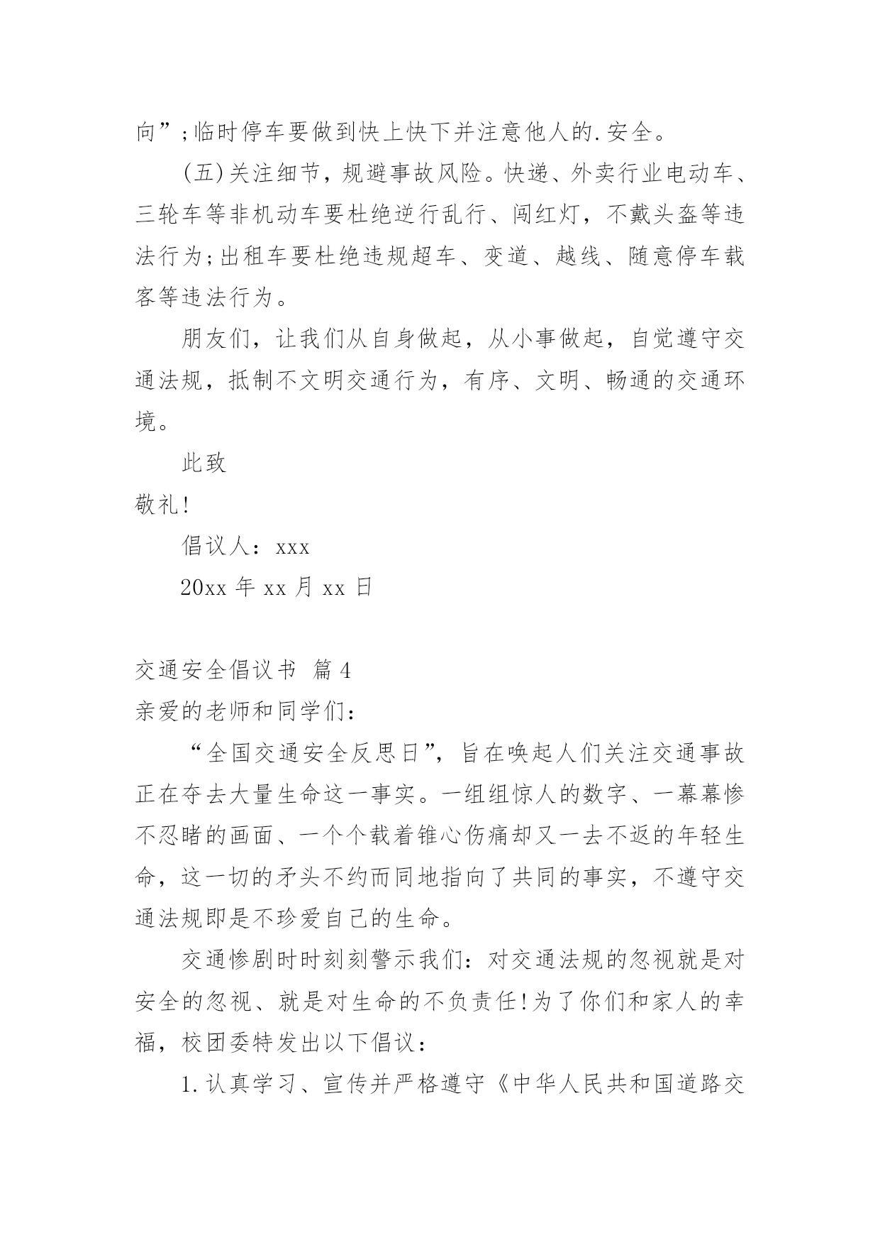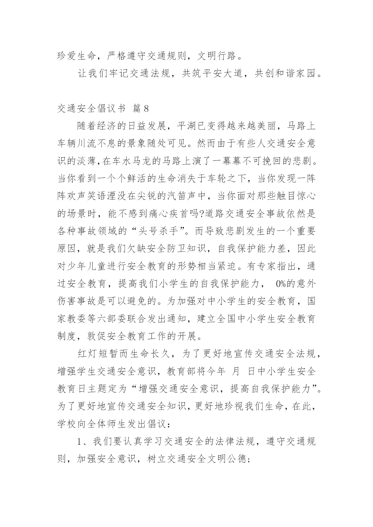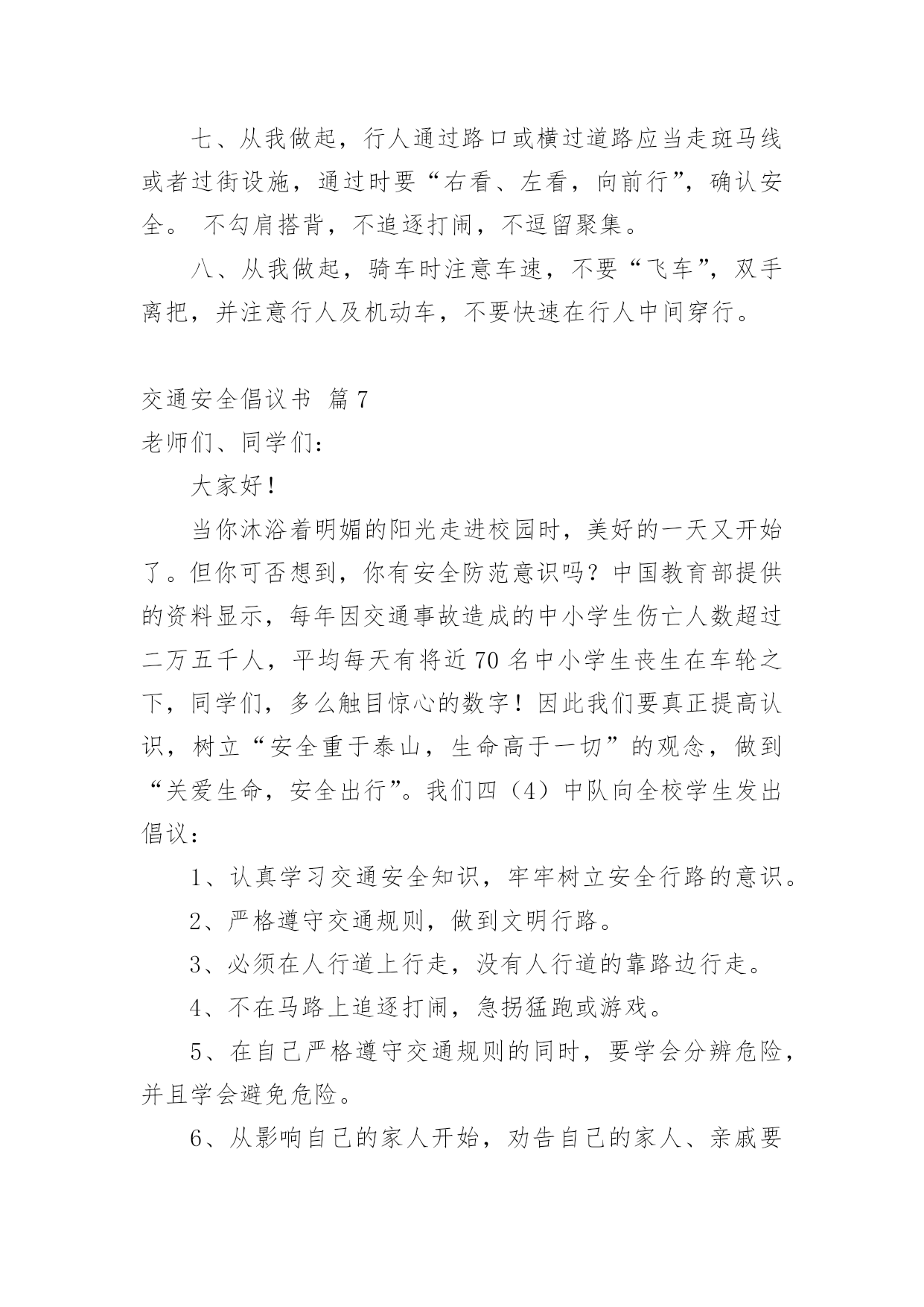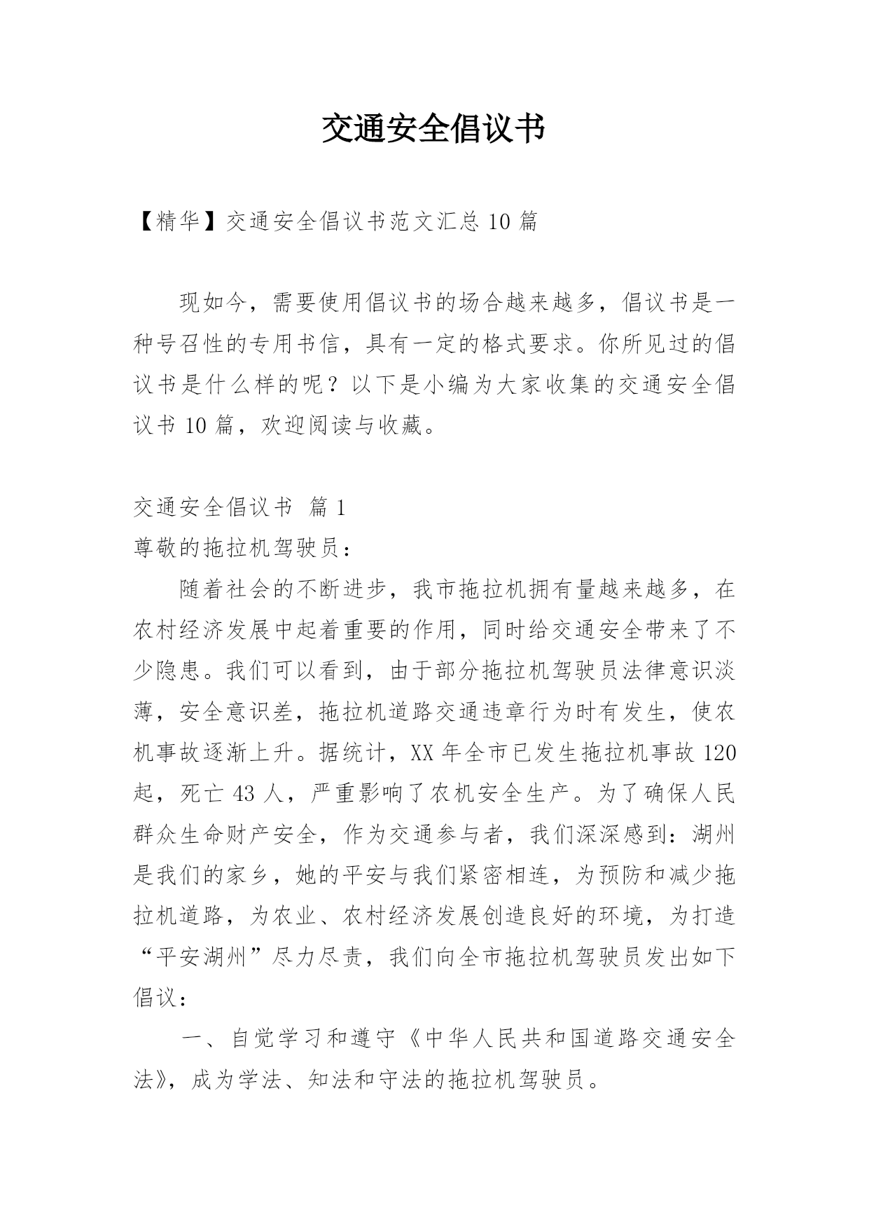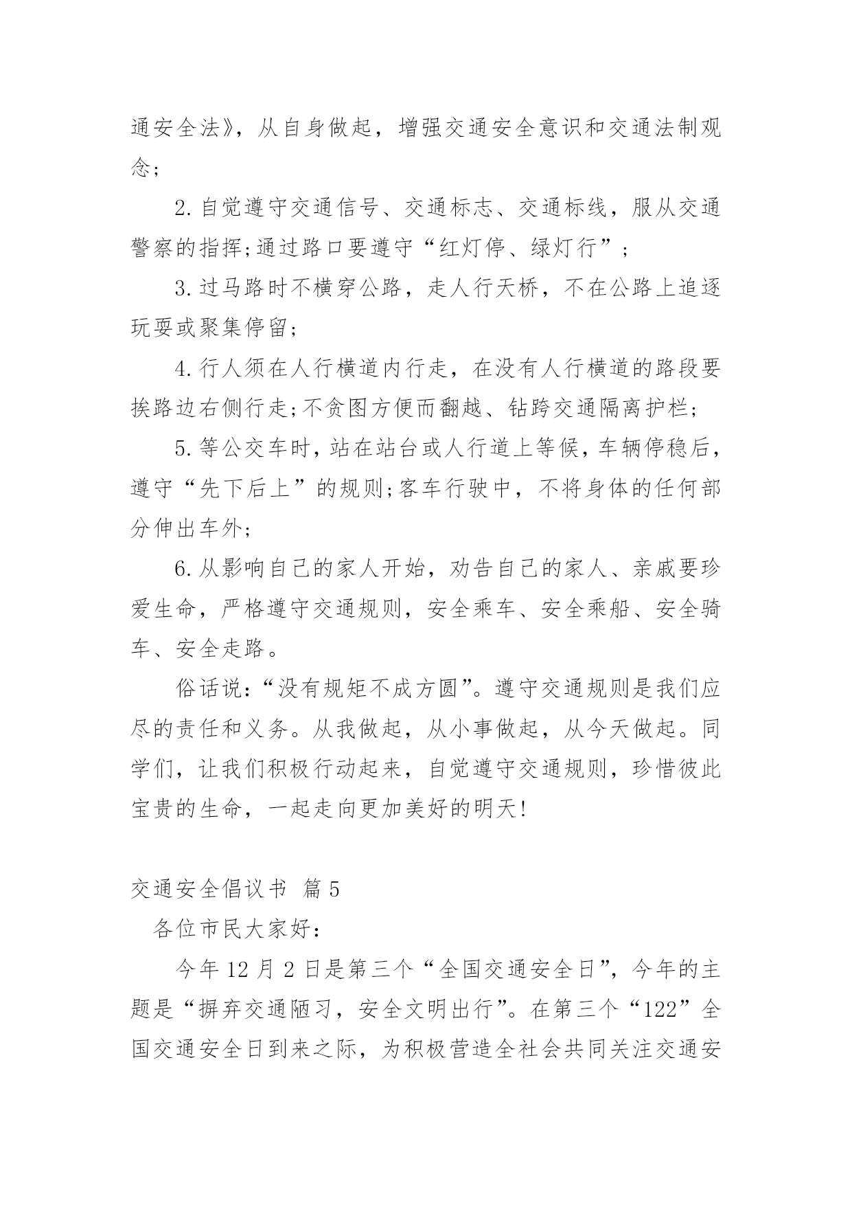 交通安全倡议书【精华】交通安全倡议书范文汇总10篇现如今,需要使用倡议书的场合越来越多,倡议书是一种号召性的专用书信,具有一定的格式要求。你所见过的倡议书是什么样的呢?以下是小编为大家收集的交通安全倡议书10篇,欢迎阅读与收藏。交通安全倡议书篇1尊敬的拖拉机驾驶员:随着社会的不断进步,我市拖拉机拥有量越来越多,在农村经济发展中起着重要的作用,同时给交通安全带来了不少隐患。我们可以看到,由于部分拖拉机驾驶员法律意识淡薄,安全意识差,拖拉机道路交通违章行为时有发生,使农机事故逐渐上升。据统计,XX年全市已发生拖拉机事故120起,死亡43人,严重影响了农机安全生产。为了确保人民群众生命财产安全,作为交通参与者,我们深深感到:湖州是我们的家乡,她的平安与我们紧密相连,为预防和减少拖拉机道路,为农业、农村经济发展创造良好的环境,为打造“平安湖州”尽力尽责,我们向全市拖拉机驾驶员发出如下倡议:一、自觉学习和遵守《中华人民共和国道路交通安全法》,成为学法、知法和守法的拖拉机驾驶员。二、文明驾驶,依法行驶,在农机交通活动中,遵章守法。拖拉机不载人载客,拖拉机和驾驶员及时参加年检审,不私自改(拼)装拖拉机,按规定参加拖拉机第三者责任强制保险,不酒后驾驶驶拖拉机,身体力行,保障农机安全生产。三、牢固树立法制意识,积极参加农机安全片组活动,自觉做好农机安全知识宣传,为营造良好的农机安全氛围尽力。四、从我做起,从现在做起,做一名遵章守法的实践者,确保自身与他人的安全。让我们携起手来,共同努力,以实际行动,当好遵守《道路交通安全法》的排头兵,为推动湖州农村经济的发展,为创建“平安湖州”,贡献自己的一份力量。交通安全倡议书篇2全县广大交通参与者:党的十六届四中全会提出“构建社会主义和谐社会”,做好交通管理工作是构建和谐社会的一个重要组成部分。在创建“平安大道”和实施“交通安全文明示范街”活动中,我县公安交警大队全力推行“政府领导,各部门负责,全社会参与”的防范交通事故新机制,在完善交通安全组织和驾协组织两套网络建设的基础上,又启用了交通安全管理员,交通安全管理员的职能涵盖了整个交通业务管理工作,必将强化交通安全工作的根基,架起交警与人民群众密切联系的桥梁。平安是每一个家庭的企盼,预防交通事故是每一个公民义不容辞的责任。超速超载、酒后驾车、无牌无证、非载客机动车载人、骑摩托车不戴安全头盔、闯红灯、横穿猛拐等交通违法行为是造成交通事故的重要原因。大量交通违法行为的存在就是因为一些交通参与者思想麻痹和意识麻木,不重视学习遵守《道路交通安全法》,没有把自己和他人的生命发全放在心上,据公安部通报,去年1至3月,全国共发生道路交通事故117220起,造成23411人死亡,11887人受伤,直接经济损失达4.9亿元。无情数字的背后,是千万家庭的不幸和灾难,自觉遵章守法,文明参与交通,这是生命的呼唤。为了自己和他人生命安全,为了大家的幸福,在此我们全体交通安全管理员向全县广大交通参与者提出以下倡议:一、认真学习《道路交通安全法》及相关法律法规,牢固树立安全第一的思想,加强社会道德修养,提高自身素质。二、自觉遵规守法,服从管理,不闯红灯,不越线,不酒后驾车,不疲劳驾驶,不横穿机动车道,不乱停乱放车辆,不占道摆摊设点、堆场,做文明交通参与者。三、购置机动车,要先学习领取驾驶证、办理号牌后,再上路行驶。四、驾驶和乘坐二轮摩托车要戴安全头盔。五、积极主动配合支持交通民警及交通安全管理员的工作,减少交通违法行为,预防交通事故发生。六、遇到交通事故,主动拨打122报警电话,抢救伤者,保护现场,配合交通民警对事故进行处理。遵规守法,关爱生命,让我们携起手来,为你、为我、为他、为大家,共同营造一个安全、文明、有序、畅通的交通环境。交通安全倡议书篇3朋友们:你们好!为进一步营造XX道路良好交通环境,确保道路安全畅通,XX县公安局交警大队决定在全县持续开展道路交通秩序集中整治活动。为此,向朋友们发出如下倡议:(一)文明出行,筑牢安全防线。行人请按信号灯通行,过街走人行横道或过街设施,不随意横穿马路、翻越隔离护栏,出行不做“低头族”,随时警惕危险。(二)安全驾驶,抵制交通陋习。机动车驾驶人要自觉摒弃随意变更车道、逆向行驶、遇堵车时越线超车、胡乱穿插加塞超车等陋习;非机动车要沿非机动车道或靠右侧骑行,注意避让,不抢道、不超速、不逆行。(三)遵守法律,拒绝危险驾驶。坚决杜绝机动车不悬挂号牌、假牌套牌、无证驾驶、酒驾、醉驾、毒驾、闯红灯、不礼让斑马线等交通违法行为。(四)规范停车,维持县城秩序。自觉将机动车规范停放在机动车道两侧的机动车停车泊位上,做到“按位、统一朝向”;临时停车要做到快上快下并注意他人的.安全。(五)关注细节,规避事故风险。快递、外卖行业电动车、三轮车等非机动车要杜绝逆行乱行