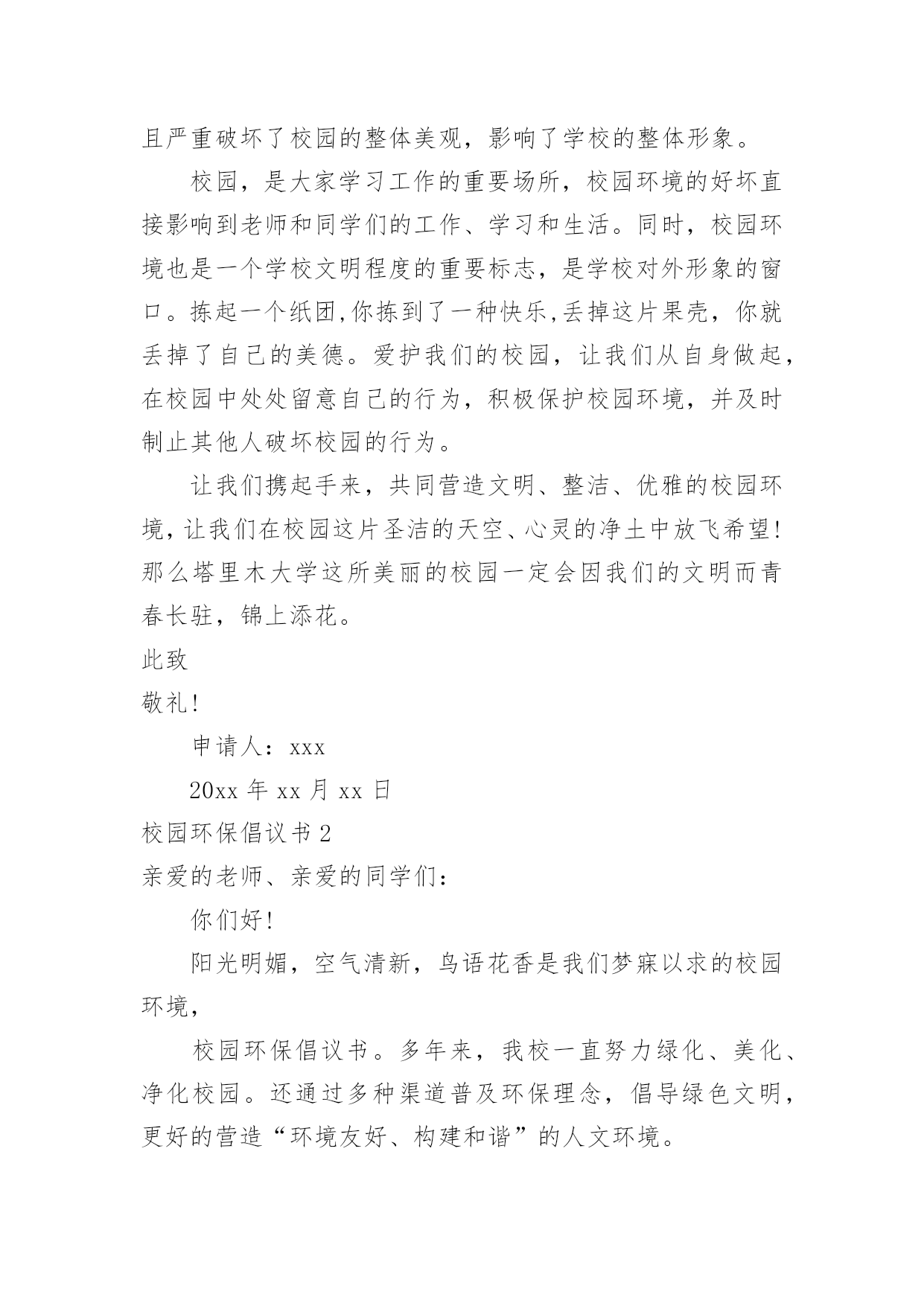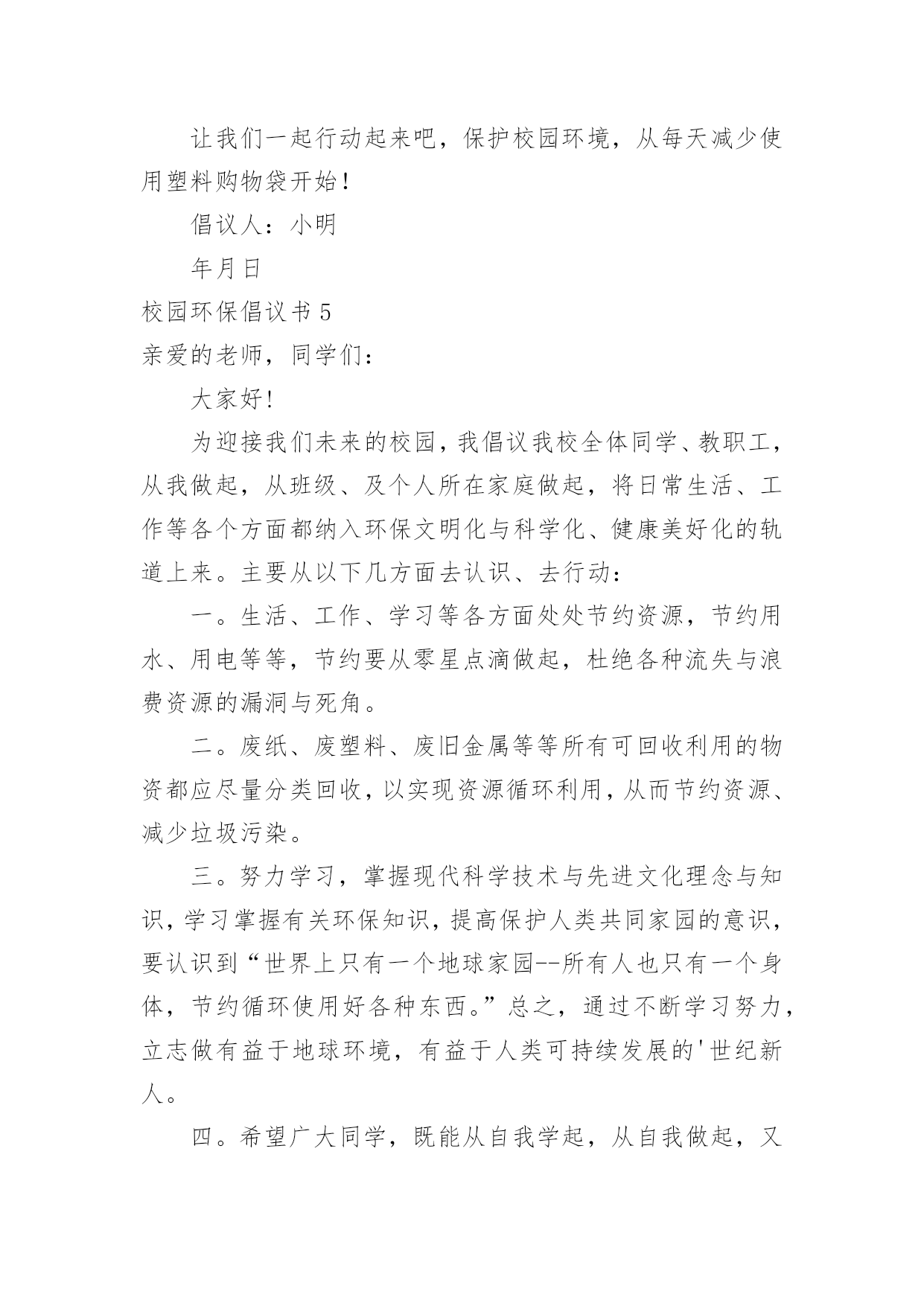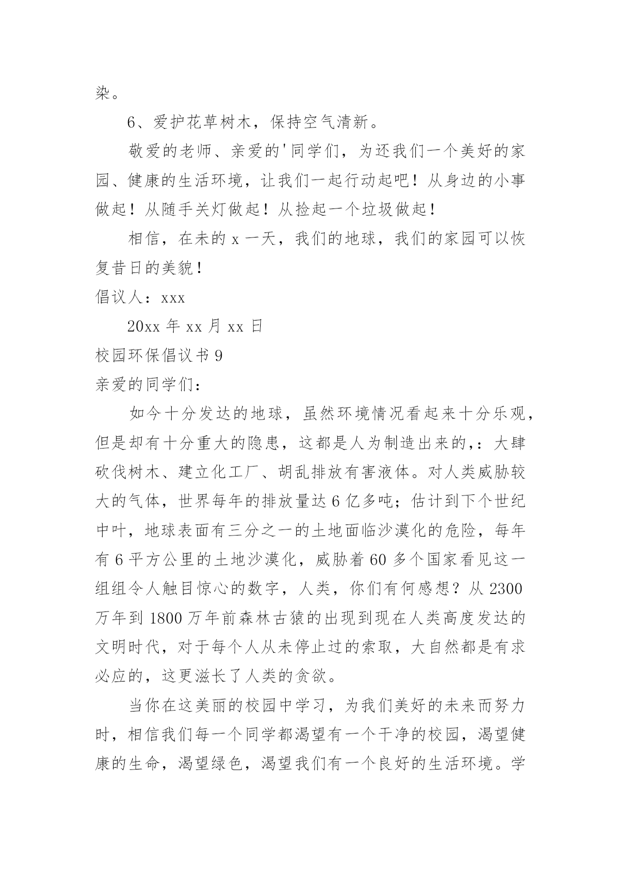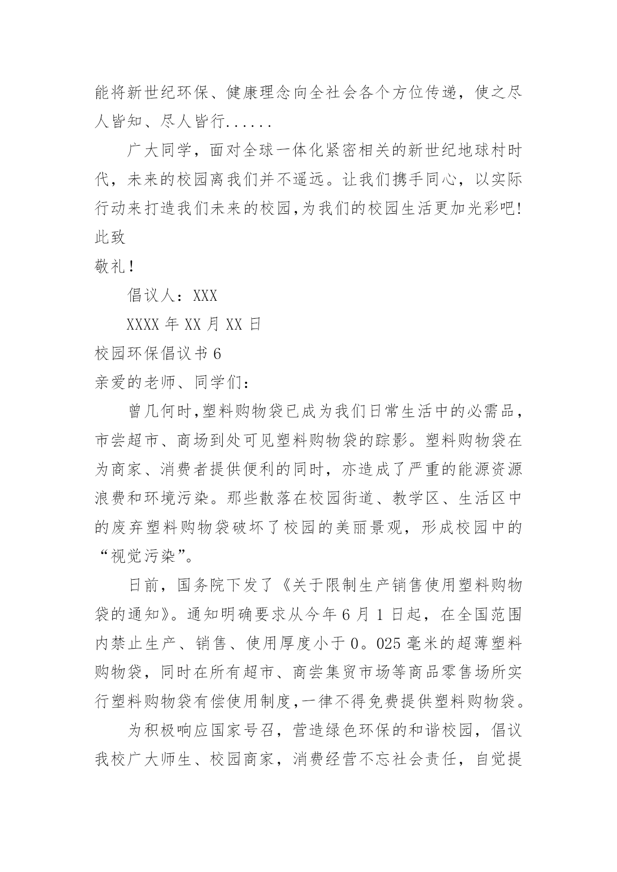 校园环保倡议书校园环保倡议书【热门】在我们平凡的日常里,我们使用上倡议书的情况与日俱增,倡议书作为一种公开提议性的专用书信,其在写作上有一定的规范。在写之前,可以先参考范文,以下是小编收集整理的校园环保倡议书,欢迎阅读,希望大家能够喜欢。校园环保倡议书1尊敬的教职工,亲爱的同学们:近年来,学校十分重视校园环境的育人功能,在学校环境建设中,坚持“高标准、高起点、高品位”的理念,投入大量的环境建设资金,融合丰富的人文内涵,打造了一个可持续发展的生态校园。当你步入校园时,就犹如走进了一片绿色的海洋,映入眼帘的是茵茵青翠的草坪,娇艳绽放的鲜花和错落有致的树木。在一群尽职尽责的环卫工人的维护下,道路宽敞、环境优美。但是,如果你仔细观察,会发现我们的.校园里仍然有一些不和谐的现象,如:学校食堂、商贸市场、住宅区、绿地等区域经常有被丢弃的果皮、纸屑、袋子、烟头等杂物;捡拾垃圾的老人经常将垃圾箱内垃圾翻到垃圾箱外,不将洒落在地的垃圾重新投入垃圾箱内的情况;个别住宅楼及教学楼周围堆放着捡拾的废品、收购的自行车、废弃的家具及不用的家电等现象,这些行为不仅妨碍了他人的正常生活,而且严重破坏了校园的整体美观,影响了学校的整体形象。校园,是大家学习工作的重要场所,校园环境的好坏直接影响到老师和同学们的工作、学习和生活。同时,校园环境也是一个学校文明程度的重要标志,是学校对外形象的窗口。拣起一个纸团,你拣到了一种快乐,丢掉这片果壳,你就丢掉了自己的美德。爱护我们的校园,让我们从自身做起,在校园中处处留意自己的行为,积极保护校园环境,并及时制止其他人破坏校园的行为。让我们携起手来,共同营造文明、整洁、优雅的校园环境,让我们在校园这片圣洁的天空、心灵的净土中放飞希望!那么塔里木大学这所美丽的校园一定会因我们的文明而青春长驻,锦上添花。此致敬礼!申请人:xxx20xx年xx月xx日校园环保倡议书2亲爱的老师、亲爱的同学们:你们好!阳光明媚,空气清新,鸟语花香是我们梦寐以求的校园环境,校园环保倡议书。多年来,我校一直努力绿化、美化、净化校园。还通过多种渠道普及环保理念,倡导绿色文明,更好的营造“环境友好、构建和谐”的人文环境。但是,随手乱扔垃圾、肆意浪费粮食、破坏花草树木、上下楼梯不讲秩序等不文明现象还时常出现在同学们的`身边。我们每个人都希望在一个清洁、舒适的环境中学习生活,健康地成长,而美丽的环境需要我们共同营造,文明的习惯靠我们平时一点一滴地养成,在此我们特向全校师生发出以下倡议:1、不乱丢果皮纸屑,不随地吐痰,主动清理地面和墙壁上的污垢;2、主动捡拾别人丢在地上的垃圾,养成“随手丢下垃圾可耻,弯腰拾起垃圾光荣”的良好习惯;争做“戴红领巾、讲普通话、做文明卫士”小标兵;3、上下楼梯讲秩序,真正做到“礼让右行”;4、爱护公物,不在桌椅、墙体上乱涂乱画,爱护校园内的一草一木;5、不带不吃零食。吃零食会给我们的健康带来不良影响,同时零食碎屑又会为我们校园的保洁带来诸多不便。6、以节水、节电、节粮为荣,随手关紧水龙头,节省每一度电,每一滴水,珍惜每一颗粮食。同学们,让我们为良好校园环境的建设尽一份义务吧!从身边小事做起,养成文明习惯,完善自身修养,营造健康舒适的学习环境,展现长江小学良好的精神风貌。“校园文明,我文明;校园美丽,我美丽”。让知识在纯净的环境中传播,让美好的心情在学习中延续!来吧!让我们为创造一个干净、明亮、温馨的家而努力吧!!!校园环保倡议书3环境,是人类赖以生存的必要条件,保护环境就是保护我们自己.我们就从身边的学校环境开始,同学们当你们背上书包踏进花园般美丽的学校时;当你们在操场上挥汗如雨的上完体育课坐在操场边的石凳上时;当你课后漫步在绿树成荫的校园时;你们可曾想到为了让同学们能有一个如此良好的学习环境,学校在这方面花了多少心思?付出了多少心血?你是否愿意看到你每天学习的校园里到处是垃圾飞扬,绿色植物被同学们随意践踏攀折,如果你的.回答是"不!"我们也相信你的回答一定是"不!"为了我们自己拥有美好的学校生活环境,建筑工程系学生会发出以下倡议:1、请不要随地乱扔果皮纸屑,如果可以的话,请随身带一个小小的垃圾袋;2、请在你将要打喷嚏是尽量用手遮住并及时去洗手,免得我们周围的空气里充满细菌;3、节约资源,废物利用.4、每个人不光从自己做起,而且及时督促身边的同学保护好校园环境.保护校园环境,人人有责.共同努力,呵护大自然,热爱家园,共建学校和谐.同学们,行动起来吧!倡议人:xxx20xx年xx月xx日校园环保倡议书4亲爱的老师、同学们:曾几何时,塑料购物袋已成为我们日常生活中的必需品,市尝超市、商场到处可见塑料购物袋的踪影。塑料购物袋在为商家、消费者提供便利的同时,亦造成了严重的.能源资源浪费和环境污染。那些散落在校园街道、教学区、生活区中的废弃