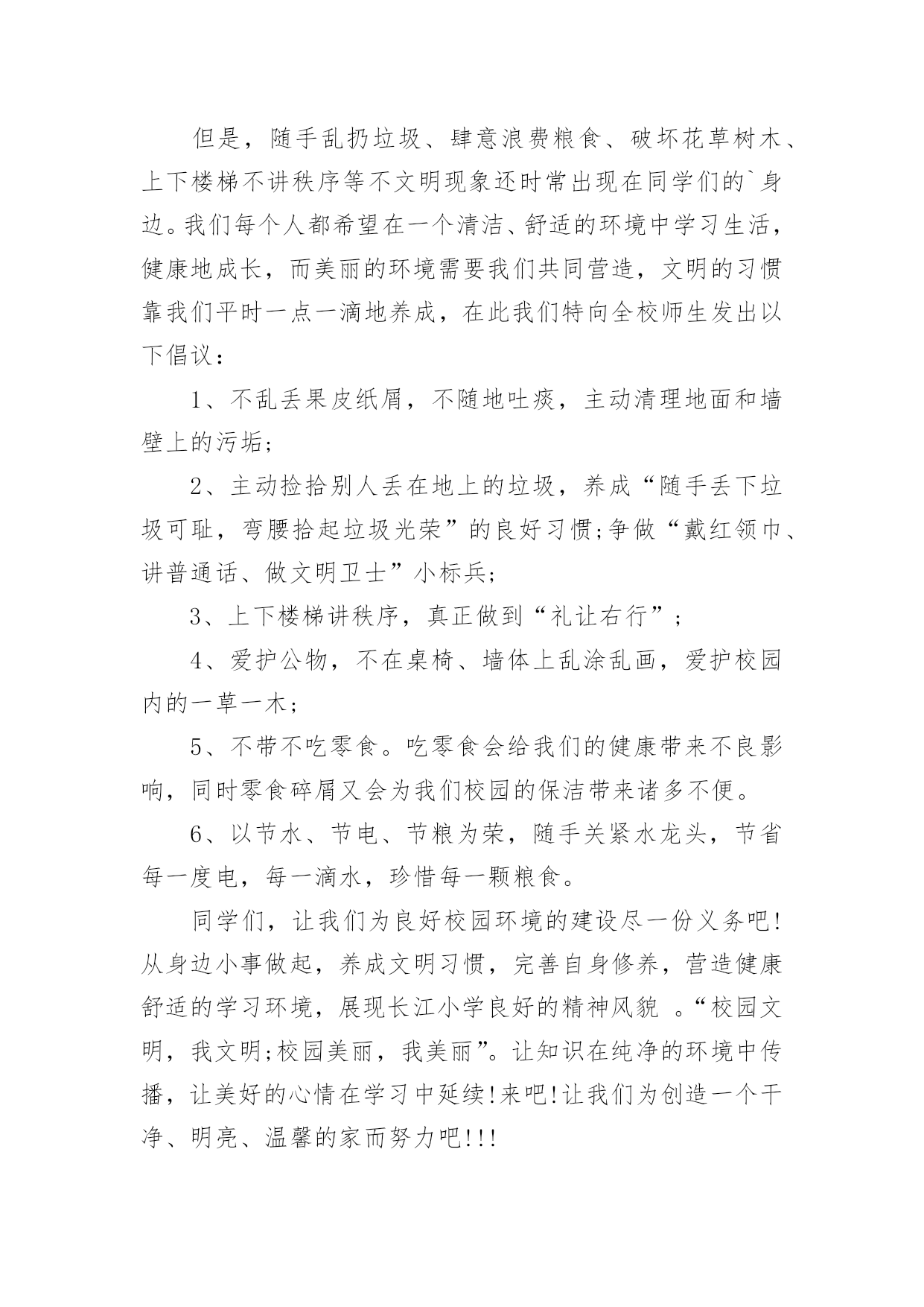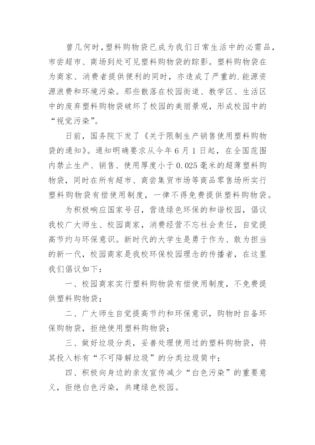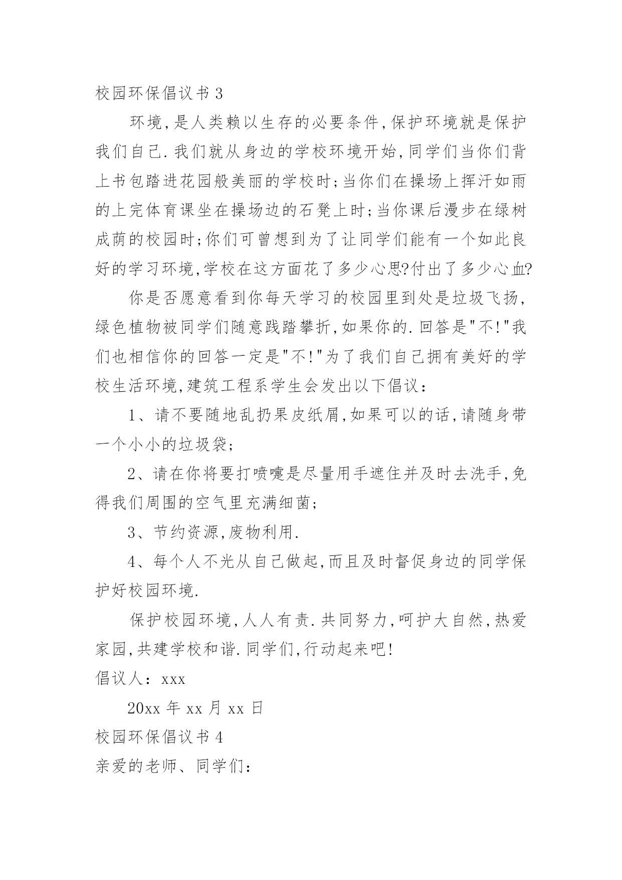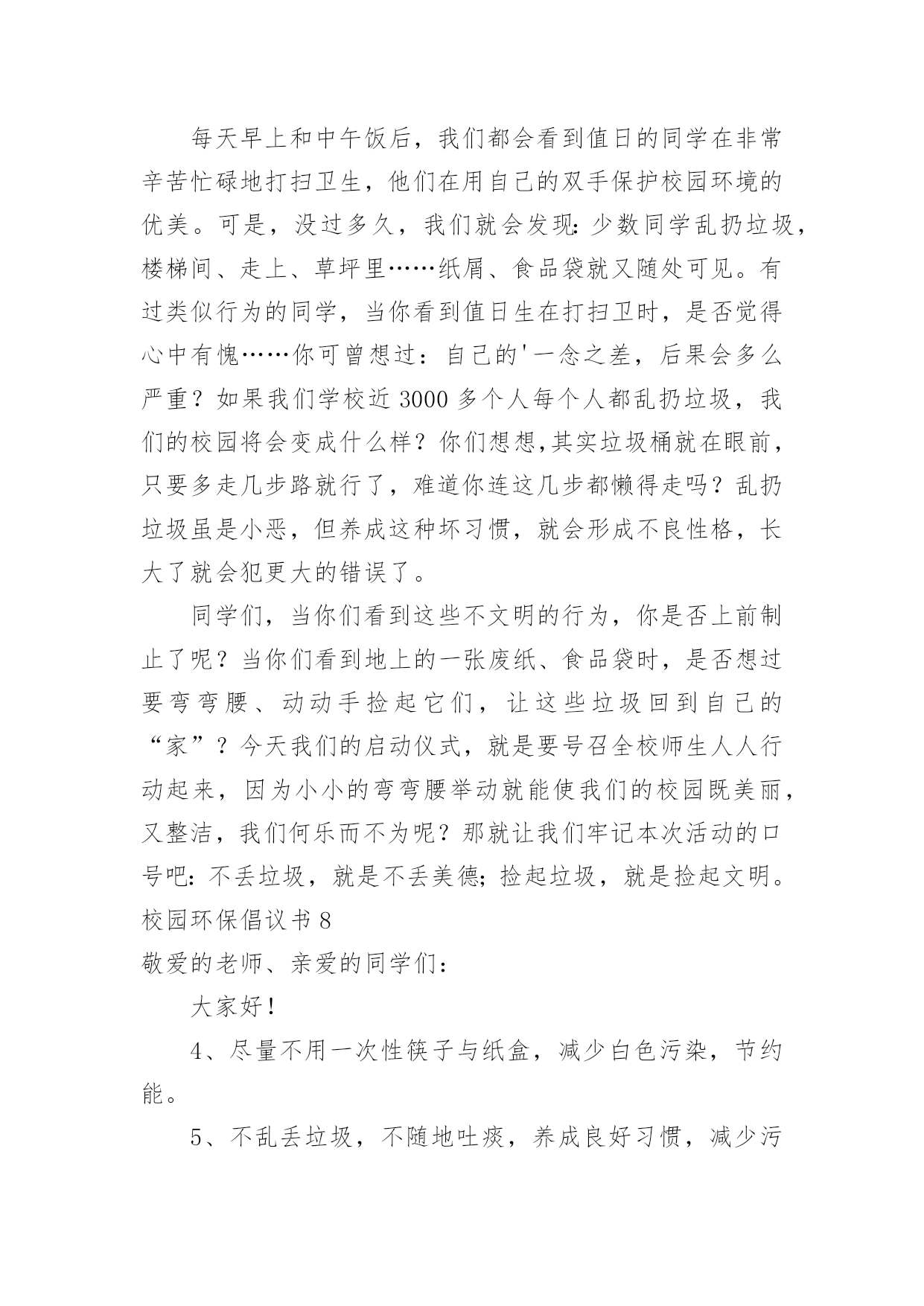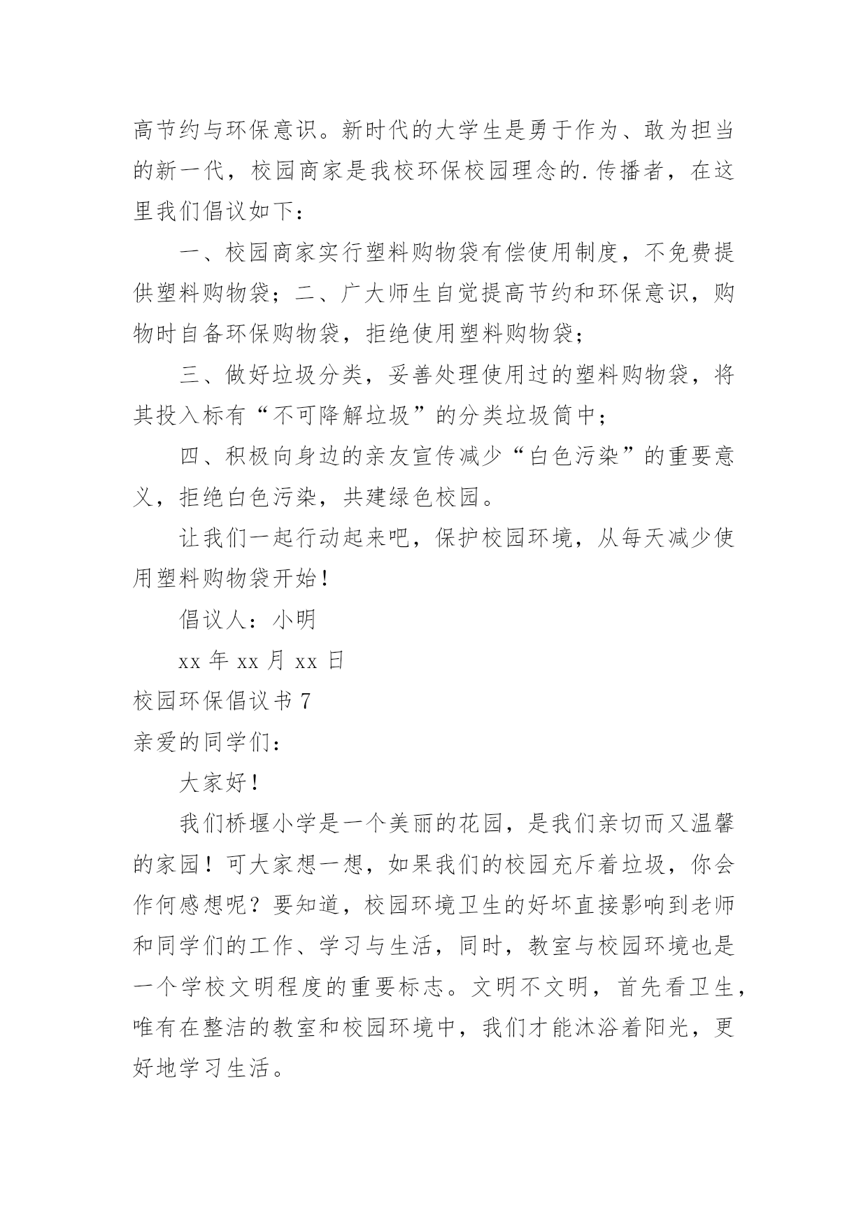 校园环保倡议书校园环保倡议书【热门】在我们平凡的日常里,我们使用上倡议书的情况与日俱增,倡议书作为一种公开提议性的专用书信,其在写作上有一定的规范。在写之前,可以先参考范文,以下是小编收集整理的校园环保倡议书,欢迎阅读,希望大家能够喜欢。校园环保倡议书1尊敬的教职工,亲爱的同学们:近年来,学校十分重视校园环境的育人功能,在学校环境建设中,坚持“高标准、高起点、高品位”的理念,投入大量的环境建设资金,融合丰富的人文内涵,打造了一个可持续发展的生态校园。当你步入校园时,就犹如走进了一片绿色的海洋,映入眼帘的是茵茵青翠的草坪,娇艳绽放的鲜花和错落有致的树木。在一群尽职尽责的环卫工人的维护下,道路宽敞、环境优美。但是,如果你仔细观察,会发现我们的.校园里仍然有一些不和谐的现象,如:学校食堂、商贸市场、住宅区、绿地等区域经常有被丢弃的果皮、纸屑、袋子、烟头等杂物;捡拾垃圾的老人经常将垃圾箱内垃圾翻到垃圾箱外,不将洒落在地的垃圾重新投入垃圾箱内的情况;个别住宅楼及教学楼周围堆放着捡拾的废品、收购的自行车、废弃的家具及不用的家电等现象,这些行为不仅妨碍了他人的正常生活,而且严重破坏了校园的整体美观,影响了学校的整体形象。校园,是大家学习工作的重要场所,校园环境的好坏直接影响到老师和同学们的工作、学习和生活。同时,校园环境也是一个学校文明程度的重要标志,是学校对外形象的窗口。拣起一个纸团,你拣到了一种快乐,丢掉这片果壳,你就丢掉了自己的美德。爱护我们的校园,让我们从自身做起,在校园中处处留意自己的行为,积极保护校园环境,并及时制止其他人破坏校园的行为。让我们携起手来,共同营造文明、整洁、优雅的校园环境,让我们在校园这片圣洁的天空、心灵的净土中放飞希望!那么塔里木大学这所美丽的校园一定会因我们的文明而青春长驻,锦上添花。此致敬礼!申请人:xxx20xx年xx月xx日校园环保倡议书2亲爱的老师、亲爱的同学们:你们好!阳光明媚,空气清新,鸟语花香是我们梦寐以求的校园环境,校园环保倡议书。多年来,我校一直努力绿化、美化、净化校园。还通过多种渠道普及环保理念,倡导绿色文明,更好的营造“环境友好、构建和谐”的人文环境。但是,随手乱扔垃圾、肆意浪费粮食、破坏花草树木、上下楼梯不讲秩序等不文明现象还时常出现在同学们的`身边。我们每个人都希望在一个清洁、舒适的环境中学习生活,健康地成长,而美丽的环境需要我们共同营造,文明的习惯靠我们平时一点一滴地养成,在此我们特向全校师生发出以下倡议:1、不乱丢果皮纸屑,不随地吐痰,主动清理地面和墙壁上的污垢;2、主动捡拾别人丢在地上的垃圾,养成“随手丢下垃圾可耻,弯腰拾起垃圾光荣”的良好习惯;争做“戴红领巾、讲普通话、做文明卫士”小标兵;3、上下楼梯讲秩序,真正做到“礼让右行”;4、爱护公物,不在桌椅、墙体上乱涂乱画,爱护校园内的一草一木;5、不带不吃零食。吃零食会给我们的健康带来不良影响,同时零食碎屑又会为我们校园的保洁带来诸多不便。6、以节水、节电、节粮为荣,随手关紧水龙头,节省每一度电,每一滴水,珍惜每一颗粮食。同学们,让我们为良好校园环境的建设尽一份义务吧!从身边小事做起,养成文明习惯,完善自身修养,营造健康舒适的学习环境,展现长江小学良好的精神风貌。“校园文明,我文明;校园美丽,我美丽”。让知识在纯净的环境中传播,让美好的心情在学习中延续!来吧!让我们为创造一个干净、明亮、温馨的家而努力吧!!!校园环保倡议书3环境,是人类赖以生存的必要条件,保护环境就是保护我们自己.我们就从身边的学校环境开始,同学们当你们背上书包踏进花园般美丽的学校时;当你们在操场上挥汗如雨的上完体育课坐在操场边的石凳上时;当你课后漫步在绿树成荫的校园时;你们可曾想到为了让同学们能有一个如此良好的学习环境,学校在这方面花了多少心思?付出了多少心血?你是否愿意看到你每天学习的校园里到处是垃圾飞扬,绿色植物被同学们随意践踏攀折,如果你的.回答是"不!"我们也相信你的回答一定是"不!"为了我们自己拥有美好的学校生活环境,建筑工程系学生会发出以下倡议:1、请不要随地乱扔果皮纸屑,如果可以的话,请随身带一个小小的垃圾袋;2、请在你将要打喷嚏是尽量用手遮住并及时去洗手,免得我们周围的空气里充满细菌;3、节约资源,废物利用.4、每个人不光从自己做起,而且及时督促身边的同学保护好校园环境.保护校园环境,人人有责.共同努力,呵护大自然,热爱家园,共建学校和谐.同学们,行动起来吧!倡议人:xxx20xx年xx月xx日校园环保倡议书4亲爱的老师、同学们:曾几何时,塑料购物袋已成为我们日常生活中的必需品,市尝超市、商场到处可见塑料购物袋的踪影。塑料购物袋在为商家、消费者提供便利的同时,亦造成了严重的.能源资源浪费和环境污染。那些散落在校园街道、教学区、生活区中的废弃