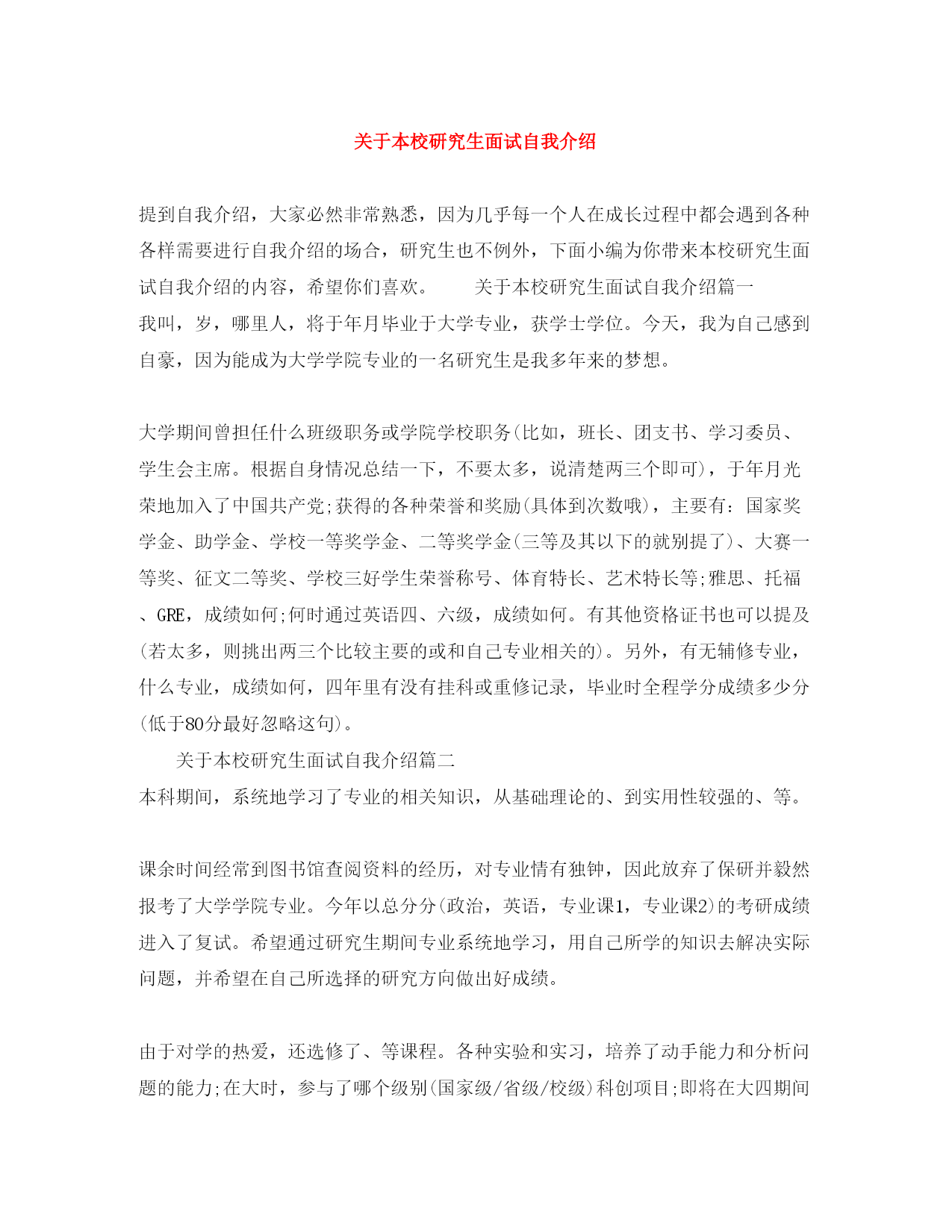此资料由网络收集而来,如有侵权请告知上传者立即删除。资料共分享,我们负责传递知识。关于本校研究生面试自我介绍提到自我介绍,大家必然非常熟悉,因为几乎每一个人在成长过程中都会遇到各种各样需要进行自我介绍的场合,研究生也不例外,下面小编为你带来本校研究生面试自我介绍的内容,希望你们喜欢。关于本校研究生面试自我介绍篇一我叫,岁,哪里人,将于年月毕业于大学专业,获学士学位。今天,我为自己感到自豪,因为能成为大学学院专业的一名研究生是我多年来的梦想。大学期间曾担任什么班级职务或学院学校职务(比如,班长、团支书、学习委员、学生会主席。根据自身情况总结一下,不要太多,说清楚两三个即可),于年月光荣地加入了中国共产党;获得的各种荣誉和奖励(具体到次数哦),主要有:国家奖学金、助学金、学校一等奖学金、二等奖学金(三等及其以下的就别提了)、大赛一等奖、征文二等奖、学校三好学生荣誉称号、体育特长、艺术特长等;雅思、托福、GRE,成绩如何;何时通过英语四、六级,成绩如何。有其他资格证书也可以提及(若太多,则挑出两三个比较主要的或和自己专业相关的)。另外,有无辅修专业,什么专业,成绩如何,四年里有没有挂科或重修记录,毕业时全程学分成绩多少分(低于80分最好忽略这句)。关于本校研究生面试自我介绍篇二本科期间,系统地学习了专业的相关知识,从基础理论的、到实用性较强的、等。课余时间经常到图书馆查阅资料的经历,对专业情有独钟,因此放弃了保研并毅然报考了大学学院专业。今年以总分分(政治,英语,专业课1,专业课2)的考研成绩进入了复试。希望通过研究生期间专业系统地学习,用自己所学的知识去解决实际问题,并希望在自己所选择的研究方向做出好成绩。由于对学的热爱,还选修了、等课程。各种实验和实习,培养了动手能力和分析问题的能力;在大时,参与了哪个级别(国家级/省级/校级)科创项目;即将在大四期间完成实验并撰写毕业论文《》。四年的本科学习不仅是知识的积累,也是一种学习方法的揣摩以及思路的探索。