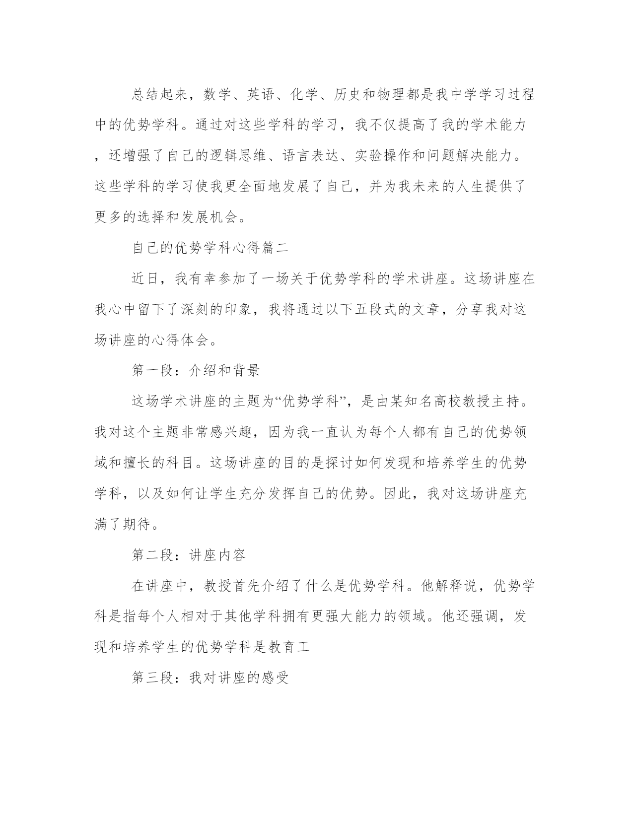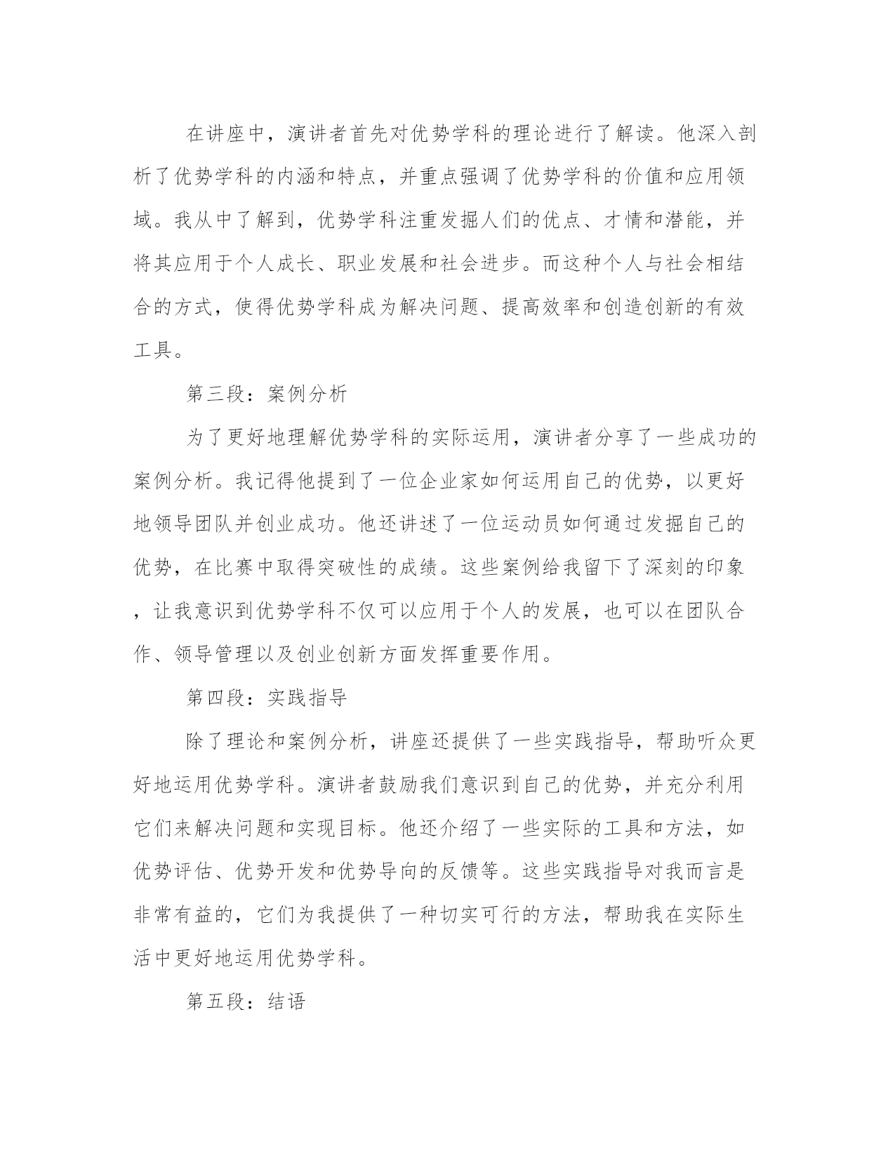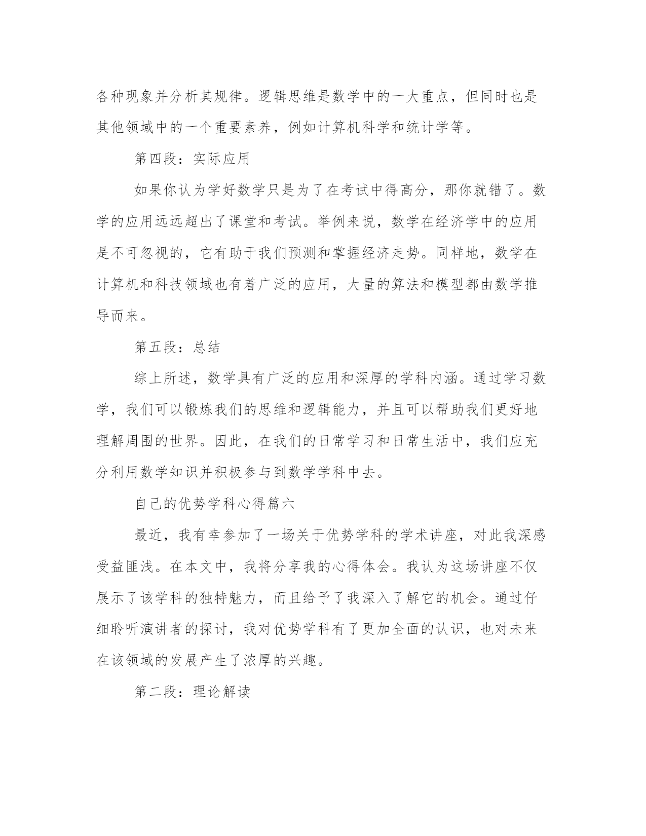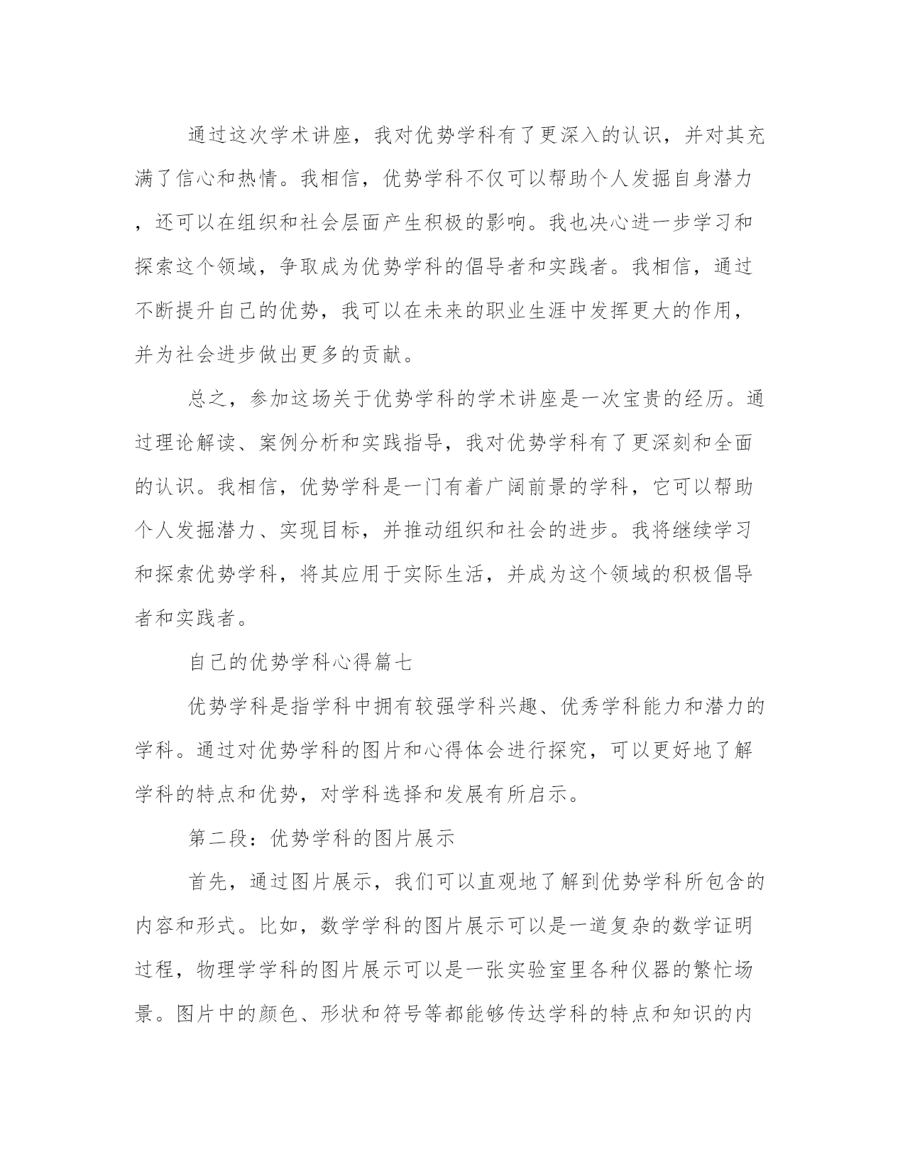 精选自己的优势学科心得大全(14篇)总结是人类思维能力的重要体现之一。如何培养自己的领导能力,发挥个人潜力是每个人都希望实现的目标。对于需要写总结的人来说,以下是一些范文供您参考,希望对您有所帮助。自己的优势学科心得篇一随着中学阶段的学习逐渐加深,每个人对不同学科可能有着不同的偏好和优势。而在我多年的学习经历中,我发现自己在某些学科上有着突出的优势。以下是我对中学生优势学科的心得体会。首先,数学是我最突出的学科之一。数学作为一门基础学科,不仅培养了我的逻辑思维能力,还提高了我解决问题的能力。在接触数学的过程中,我开始欣赏到数学的美妙之处。逐渐地,我能够通过观察、思考和推理来解决复杂的问题,并且能够运用数学知识解决实际生活中的难题。数学的逻辑性和严谨性让我在其他学科中受益匪浅,让我更加理智和冷静地分析问题。其次,英语也是我较为擅长的学科。通过学习英语,我不仅提高了我的语言表达能力,还开拓了我对外国文化的认识。记得在英语课上,老师经常给我们播放一些以英语为母语的国家的纪录片或者电影,通过这些素材,我不仅学到了原汁原味的外国文化,还在英语听力和阅读方面有了显著进步。此外,通过与外国友人交流,我了解到了一些不同于中式思维的观点,并从中受益匪浅。英语在全球范围内被广泛使用,熟练掌握英语不仅是一种实用技能,也是一种沟通桥梁,这将为我的未来发展提供更多的机会。另外,化学是我在中学学习过程中取得了较好成绩的科目之一。化学作为一门实用性较强的学科,既有一定的理论基础,又有很多实验操作。化学实验可以帮助我们更好地理解和巩固理论知识。通过自己亲手操作实验,观察和记录实验现象,我能更加深入地了解化学原理。通过学习化学,我逐渐培养了观察、实验和解决问题的能力。化学帮助我培养了对细节的敏感度,也培养了我对实验环境的谨慎和严谨。另外,历史是我在中学学习中比较喜欢的学科之一。通过学习历史,我能够更好地了解人类社会的发展和演变,了解历史事件对现代社会的影响。历史教给了我大胆思考的勇气,同时也教会了我如何客观分析和评价不同历史观点。通过历史的学习,我更好地了解了世界各地的文化差异和历史遗产。历史也帮助我磨砺了我的批判性思维能力,让我在面临复杂的问题时能够保持理性思考。最后,物理作为一门应用性学科,也是我较为擅长的学科之一。通过学习物理,我了解了自然界的各种现象和规律,这些现象和规律随处可见,在我现实生活中发挥着巨大的作用。物理学的学习带给了我关于力、能量、电磁等方面的知识,这些知识对我理解科学原理和解决实际问题都有很大帮助。此外,物理实验的操作也锻炼了我的动手能力和实验技巧。总结起来,数学、英语、化学、历史和物理都是我中学学习过程中的优势学科。通过对这些学科的学习,我不仅提高了我的学术能力,还增强了自己的逻辑思维、语言表达、实验操作和问题解决能力。这些学科的学习使我更全面地发展了自己,并为我未来的人生提供了更多的选择和发展机会。自己的优势学科心得篇二近日,我有幸参加了一场关于优势学科的学术讲座。这场讲座在我心中留下了深刻的印象,我将通过以下五段式的文章,分享我对这场讲座的心得体会。第一段:介绍和背景这场学术讲座的主题为“优势学科”,是由某知名高校教授主持。我对这个主题非常感兴趣,因为我一直认为每个人都有自己的优势领域和擅长的科目。这场讲座的目的是探讨如何发现和培养学生的优势学科,以及如何让学生充分发挥自己的优势。因此,我对这场讲座充满了期待。第二段:讲座内容在讲座中,教授首先介绍了什么是优势学科。他解释说,优势学科是指每个人相对于其他学科拥有更强大能力的领域。他还强调,发现和培养学生的优势学科是教育工第三段:我对讲座的感受这场讲座让我深受启发。我认识到每个人都有自己独特的优势,教育工第四段:与他人的交流和思考在讲座之后,我与身边的同学进行了交流,他们也对这场讲座表示了兴趣。我们讨论了如何应对自己的弱势学科以及如何发挥自己的优势。我们认识到每个人都有不同的强项和弱项,互相分享各自的经验和方法,可以帮助我们更好地发挥自己的优势并改进自己的弱点。通过这样的交流,我们从中获得了很多宝贵的启示,并且对自己的学习和未来的职业道路有了更清晰的规划。第五段:总结和展望这场关于优势学科的学术讲座让我受益匪浅。我意识到每个人都有自己的独特之处,并且要通过发现和培养学生的优势学科来促进个人发展和成长。同时,我也认识到了自己的优势学科,并且决定在未来的学习和职业规划中更多地关注这个领域。通过与他人的交流和分享,我相信我能更好地发挥自己的优势,并且与他人相互学习提高。这场讲座让我深刻认识到每个人都有自己的优势学科,并且教育工自己的优势学科心得篇三xx年7月5日,我参加了xx市小学语文骨干教师培训学习。听了两节作文课以及听了张xx校长关于“