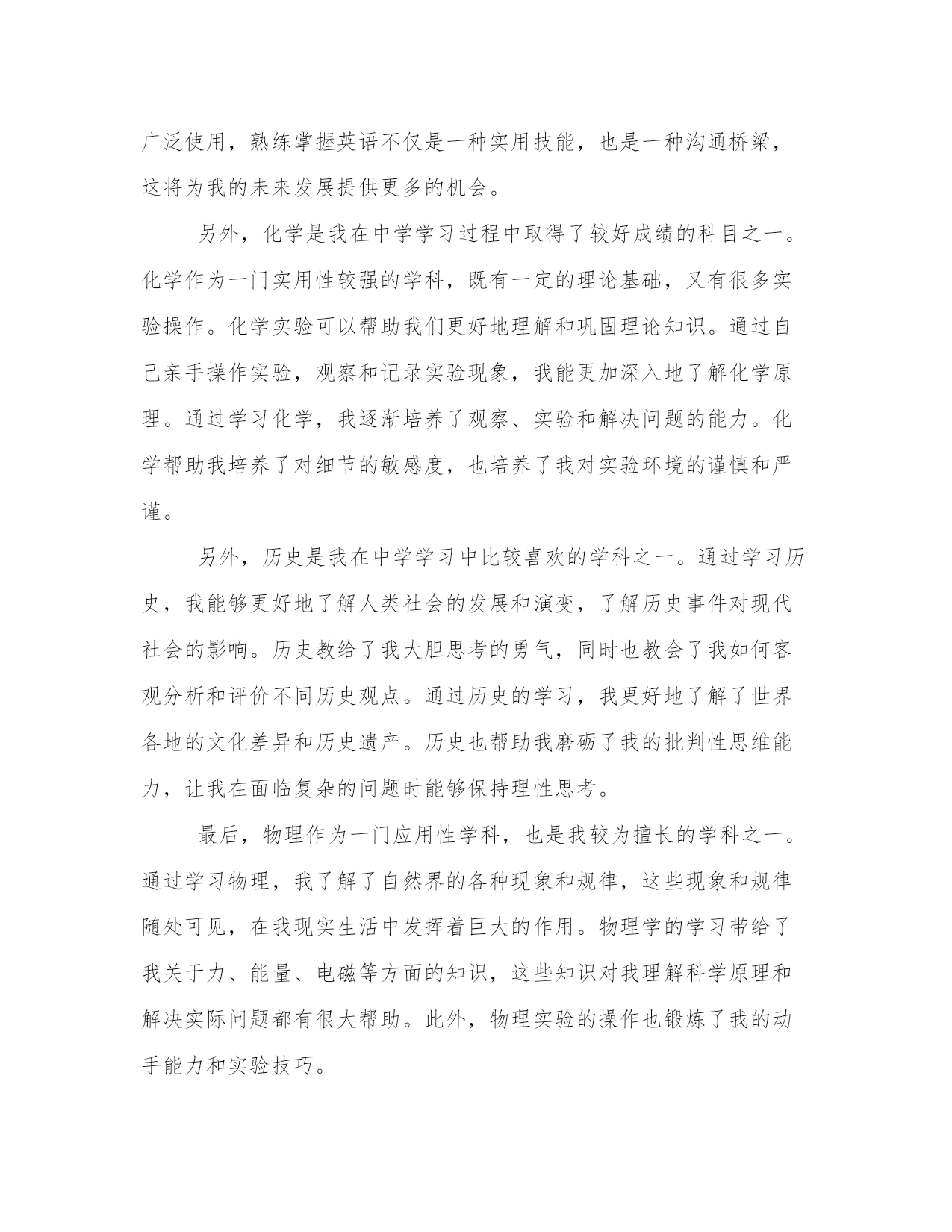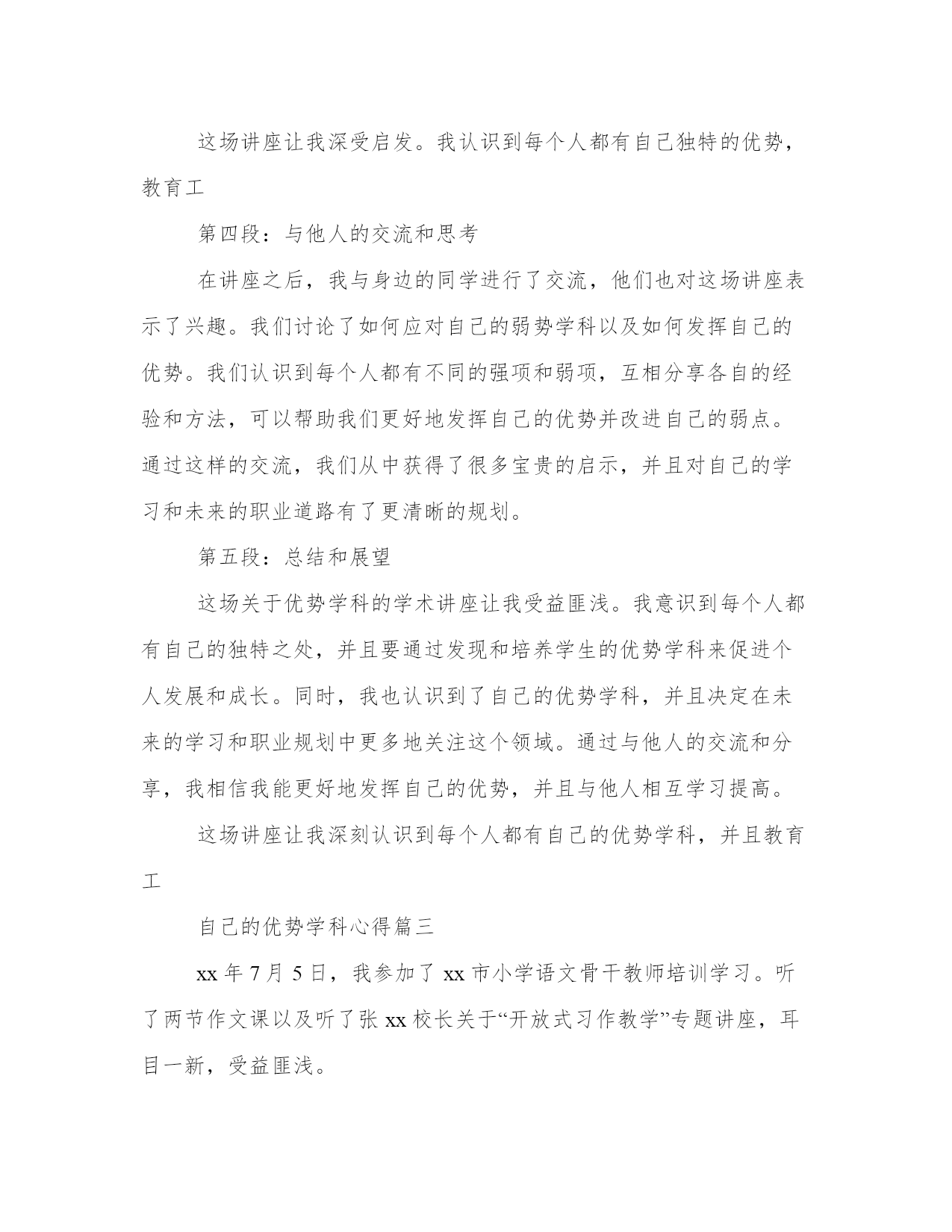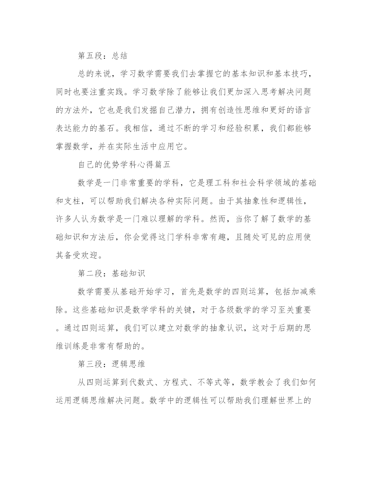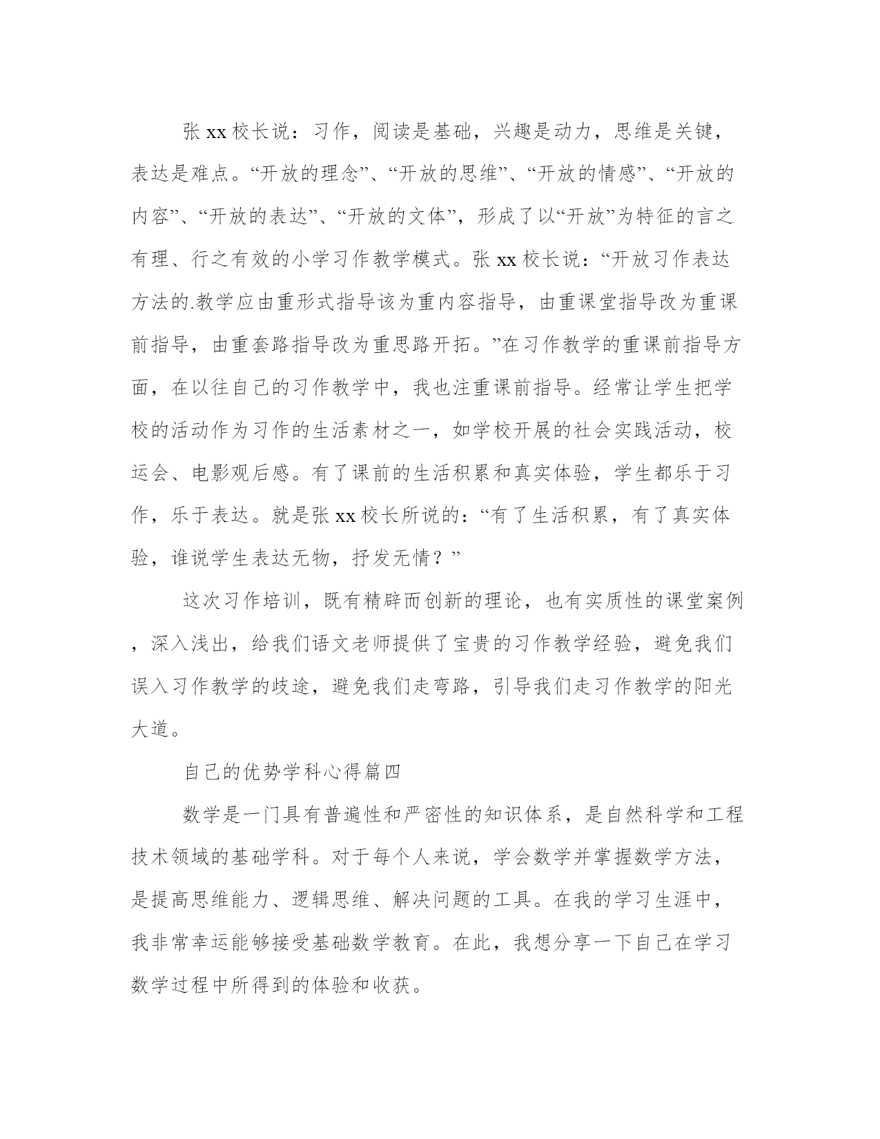 精选自己的优势学科心得大全(14篇)总结是人类思维能力的重要体现之一。如何培养自己的领导能力,发挥个人潜力是每个人都希望实现的目标。对于需要写总结的人来说,以下是一些范文供您参考,希望对您有所帮助。自己的优势学科心得篇一随着中学阶段的学习逐渐加深,每个人对不同学科可能有着不同的偏好和优势。而在我多年的学习经历中,我发现自己在某些学科上有着突出的优势。以下是我对中学生优势学科的心得体会。首先,数学是我最突出的学科之一。数学作为一门基础学科,不仅培养了我的逻辑思维能力,还提高了我解决问题的能力。在接触数学的过程中,我开始欣赏到数学的美妙之处。逐渐地,我能够通过观察、思考和推理来解决复杂的问题,并且能够运用数学知识解决实际生活中的难题。数学的逻辑性和严谨性让我在其他学科中受益匪浅,让我更加理智和冷静地分析问题。其次,英语也是我较为擅长的学科。通过学习英语,我不仅提高了我的语言表达能力,还开拓了我对外国文化的认识。记得在英语课上,老师经常给我们播放一些以英语为母语的国家的纪录片或者电影,通过这些素材,我不仅学到了原汁原味的外国文化,还在英语听力和阅读方面有了显著进步。此外,通过与外国友人交流,我了解到了一些不同于中式思维的观点,并从中受益匪浅。英语在全球范围内被广泛使用,熟练掌握英语不仅是一种实用技能,也是一种沟通桥梁,这将为我的未来发展提供更多的机会。另外,化学是我在中学学习过程中取得了较好成绩的科目之一。化学作为一门实用性较强的学科,既有一定的理论基础,又有很多实验操作。化学实验可以帮助我们更好地理解和巩固理论知识。通过自己亲手操作实验,观察和记录实验现象,我能更加深入地了解化学原理。通过学习化学,我逐渐培养了观察、实验和解决问题的能力。化学帮助我培养了对细节的敏感度,也培养了我对实验环境的谨慎和严谨。另外,历史是我在中学学习中比较喜欢的学科之一。通过学习历史,我能够更好地了解人类社会的发展和演变,了解历史事件对现代社会的影响。历史教给了我大胆思考的勇气,同时也教会了我如何客观分析和评价不同历史观点。通过历史的学习,我更好地了解了世界各地的文化差异和历史遗产。历史也帮助我磨砺了我的批判性思维能力,让我在面临复杂的问题时能够保持理性思考。最后,物理作为一门应用性学科,也是我较为擅长的学科之一。通过学习物理,我了解了自然界的各种现象和规律,这些现象和规律随处可见,在我现实生活中发挥着巨大的作用。物理学的学习带给了我关于力、能量、电磁等方面的知识,这些知识对我理解科学原理和解决实际问题都有很大帮助。此外,物理实验的操作也锻炼了我的动手能力和实验技巧。总结起来,数学、英语、化学、历史和物理都是我中学学习过程中的优势学科。通过对这些学科的学习,我不仅提高了我的学术能力,还增强了自己的逻辑思维、语言表达、实验操作和问题解决能力。这些学科的学习使我更全面地发展了自己,并为我未来的人生提供了更多的选择和发展机会。自己的优势学科心得篇二近日,我有幸参加了一场关于优势学科的学术讲座。这场讲座在我心中留下了深刻的印象,我将通过以下五段式的文章,分享我对这场讲座的心得体会。第一段:介绍和背景这场学术讲座的主题为“优势学科”,是由某知名高校教授主持。我对这个主题非常感兴趣,因为我一直认为每个人都有自己的优势领域和擅长的科目。这场讲座的目的是探讨如何发现和培养学生的优势学科,以及如何让学生充分发挥自己的优势。因此,我对这场讲座充满了期待。第二段:讲座内容在讲座中,教授首先介绍了什么是优势学科。他解释说,优势学科是指每个人相对于其他学科拥有更强大能力的领域。他还强调,发现和培养学生的优势学科是教育工第三段:我对讲座的感受这场讲座让我深受启发。我认识到每个人都有自己独特的优势,教育工第四段:与他人的交流和思考在讲座之后,我与身边的同学进行了交流,他们也对这场讲座表示了兴趣。我们讨论了如何应对自己的弱势学科以及如何发挥自己的优势。我们认识到每个人都有不同的强项和弱项,互相分享各自的经验和方法,可以帮助我们更好地发挥自己的优势并改进自己的弱点。通过这样的交流,我们从中获得了很多宝贵的启示,并且对自己的学习和未来的职业道路有了更清晰的规划。第五段:总结和展望这场关于优势学科的学术讲座让我受益匪浅。我意识到每个人都有自己的独特之处,并且要通过发现和培养学生的优势学科来促进个人发展和成长。同时,我也认识到了自己的优势学科,并且决定在未来的学习和职业规划中更多地关注这个领域。通过与他人的交流和分享,我相信我能更好地发挥自己的优势,并且与他人相互学习提高。这场讲座让我深刻认识到每个人都有自己的优势学科,并且教育工自己的优势学科心得篇三xx年7月5日,我参加了xx市小学语文骨干教师培训学习。听了两节作文课以及听了张xx校长关于“