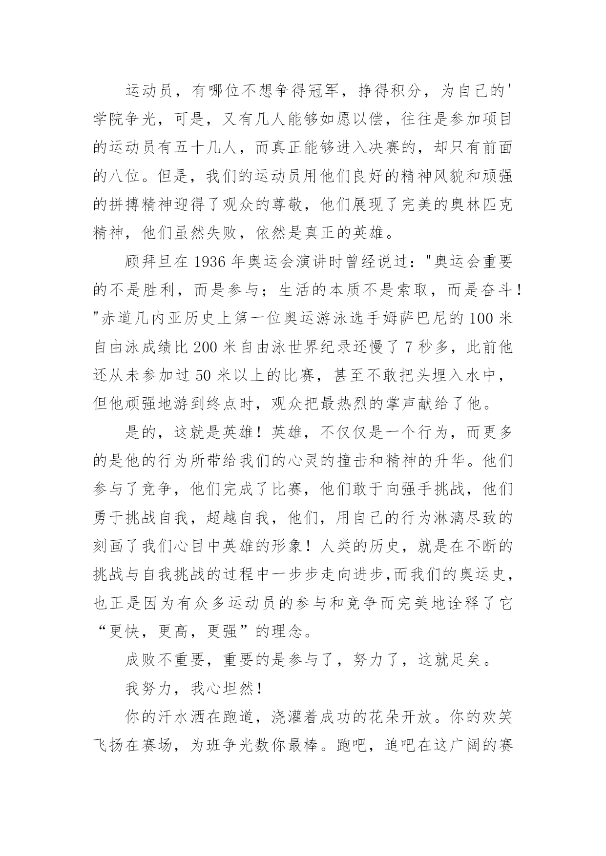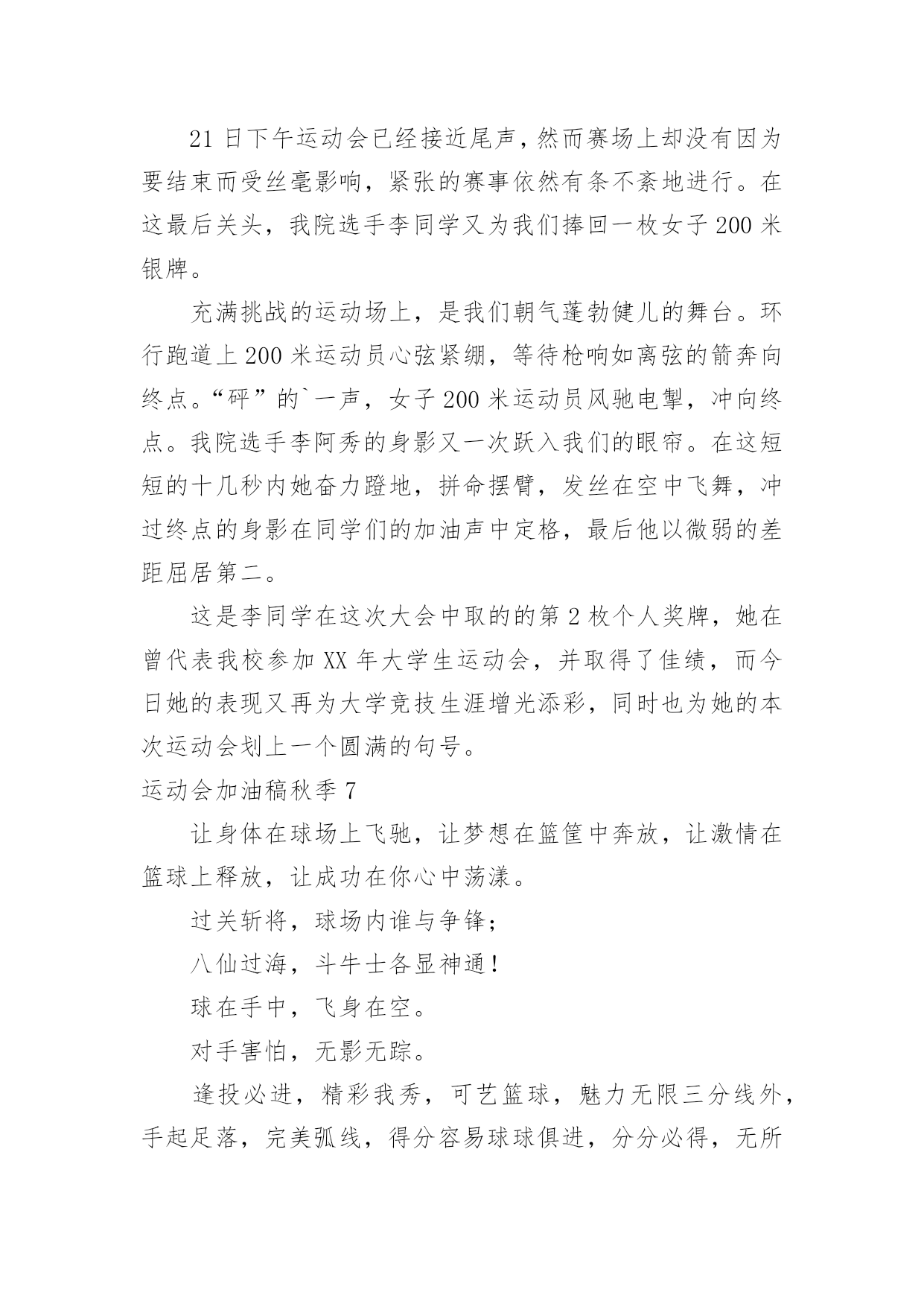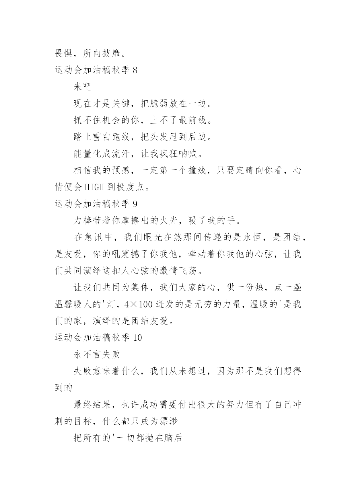 运动会加油稿秋季运动会加油稿秋季现如今,越来越多地方需要用到加油稿,借助加油稿可以表达对对方的鼓励和支持。怎样写加油稿才能更好地发挥其做用呢?以下是小编帮大家整理的运动会加油稿秋季,欢迎阅读,希望大家能够喜欢。运动会加油稿秋季1运动场上有你们的步伐,那是辛苦汗水的抒发,你就像天边的云端,有彩霞的绚丽色彩.奔驰的骏马,飞奔的步伐让你的胜利在前方等待.为你们祝福,为你们喝彩!致百米运动员快如离弦之箭;疾似撒疆野马;你们的速度让我们惊叹;你们的精神让我们钦佩;流汗千日,只为今日一搏;疾踏百步,只为终点一触;胜利再向你微笑;成功在向你招手;加油啊!健儿们!致百米运动员你是飞翔的鹰,你是射出的.箭,你是飞扬的火焰呀,你是刹那的闪电!迎着飒爽的秋风你在与时间纷争就在这短短的几秒你留下了矫健的永恒运动会加油稿秋季2不为掌声的诠释、不为刻意的征服、只有辛勤的汗水化作追求的脚步。心中坚定的信念脚下沉稳的步伐,你用行动诉说着一个不变的真理:没有比脚更长的路,没有比人更高的山,希望在终点向你招手,努力吧用你坚韧不拔的毅志,去迎接终点的鲜花与掌声。跑道已洒满阳光,不要羞涩、不要紧张,听秋雁在空中为你歌唱,快去拾取片片金黄,充满信心,就有希望风为你加油,云为你助兴,坚定,执着,耐力与希望,在延伸的白色跑道中点点凝聚!力量,信念,拼搏与奋斗,在遥远的终点线上渐渐明亮!时代的强音正在你的脚下踏响我努力,我坦然!……总喜欢将鲜花献给冠军,总习惯将掌声留给胜者,总是不经意地将羡慕而关切的目光投向成功的人。可是,感受了校运动会赛场上的一幕幕,我却要将掌声毫不吝啬的献给他们,他们同样选择了拼搏,虽然没有获胜,没有拿到积分,甚至,是倒数第一,但是,他们用坚韧不拔的意志和过人的勇气诠释了奥林匹克“重在参与”的精神,他们同样为我们谱写了一曲青春的凯歌!运动员,有哪位不想争得冠军,挣得积分,为自己的'学院争光,可是,又有几人能够如愿以偿,往往是参加项目的运动员有五十几人,而真正能够进入决赛的,却只有前面的八位。但是,我们的运动员用他们良好的精神风貌和顽强的拼搏精神迎得了观众的尊敬,他们展现了完美的奥林匹克精神,他们虽然失败,依然是真正的英雄。顾拜旦在1936年奥运会演讲时曾经说过:"奥运会重要的不是胜利,而是参与;生活的本质不是索取,而是奋斗!"赤道几内亚历史上第一位奥运游泳选手姆萨巴尼的100米自由泳成绩比200米自由泳世界纪录还慢了7秒多,此前他还从未参加过50米以上的比赛,甚至不敢把头埋入水中,但他顽强地游到终点时,观众把最热烈的掌声献给了他。是的,这就是英雄!英雄,不仅仅是一个行为,而更多的是他的行为所带给我们的心灵的撞击和精神的升华。他们参与了竞争,他们完成了比赛,他们敢于向强手挑战,他们勇于挑战自我,超越自我,他们,用自己的行为淋漓尽致的刻画了我们心目中英雄的形象!人类的历史,就是在不断的挑战与自我挑战的过程中一步步走向进步,而我们的奥运史,也正是因为有众多运动员的参与和竞争而完美地诠释了它“更快,更高,更强”的理念。成败不重要,重要的是参与了,努力了,这就足矣。我努力,我心坦然!你的汗水洒在跑道,浇灌着成功的花朵开放。你的欢笑飞扬在赛场,为班争光数你最棒。跑吧,追吧在这广阔的赛场上,你似骏马似离铉的箭。跑吧,追吧你比虎猛比豹强,你们挥舞着充满力量的双臂看着实心球化成美丽的弧线我着实在心里佩服你们你们抛出了自己的最佳水平3一根小小的木棒,连接的是团结和友爱是一根小小的木棒,传递的是勇气和力量一根小小的木棒,演绎的是奋斗和拼搏加油吧!让这激动人心的时刻,一直回荡在我们心中!踏上跑道,是一种选择。离开起点,是一种勇气。驰骋赛场,是一种胜利。运动健将们,用你的实力,用你的精神,去开拓出,一片属于你的长跑天地!运动会加油稿秋季3年轻的你们自信飞扬!你们踏着坚定的步伐走向起跑点。枪声响起,你们爆出全身力量直奔终点。在观众热烈的叫喊声中,我们看到你们脸上洋溢着的`自豪和勇敢。你们激情澎湃,你们斗志昂扬!豪气冲天的你们将汗水洒下,让热血在赛场沸腾。广阔的绿茵场,是你们展示自我的舞台。你们将在这舞台上舞出青春的脉动!起跑、加速、超越、冲刺,一步一步延向胜利的曙光!加油吧!健儿们!奇迹正在等着你们,让你们必将创造奇迹!运动会加油稿秋季4我们拥有同一个梦想,我们怀着同样炽热的心,我们争取“更快、更高、更强”,我们同喊“友谊第一,比赛第二。”我们是一个平凡而又独特的群众,我们相信,有梦就有远方,有付出就有期望——这就是勇往直前的'八年(7)班,一个美丽温暖的班级,每一个成员都为此而自豪,加油吧!八年(7)班。加油吧!运动员们。赛出水平,赛出风格,让我们一齐努力吧!运动会加油稿秋季5有多少次挥汗如雨,伤痛曾添满记忆,只因为始终相信,去拼搏才能胜利。总在鼓舞自己,要成功就得努力。热