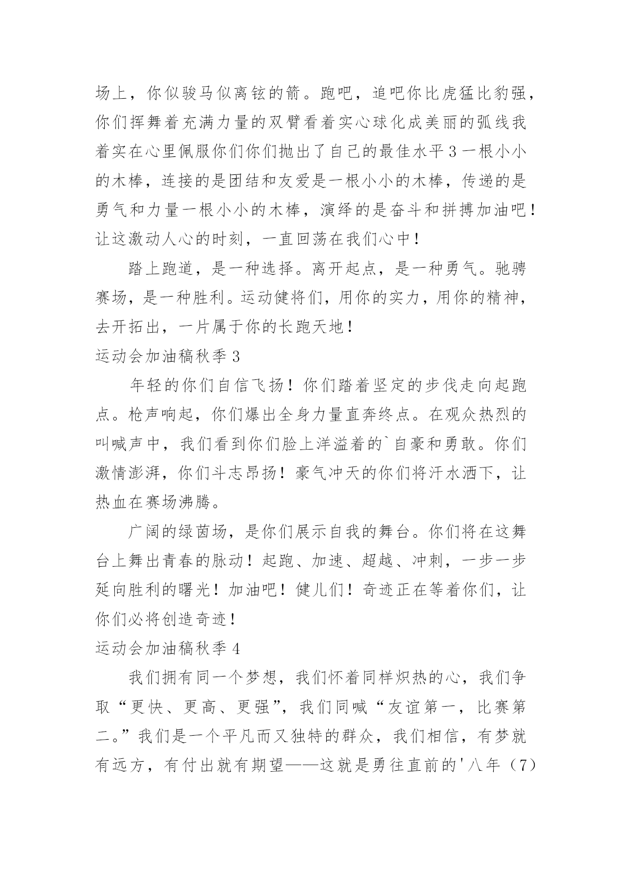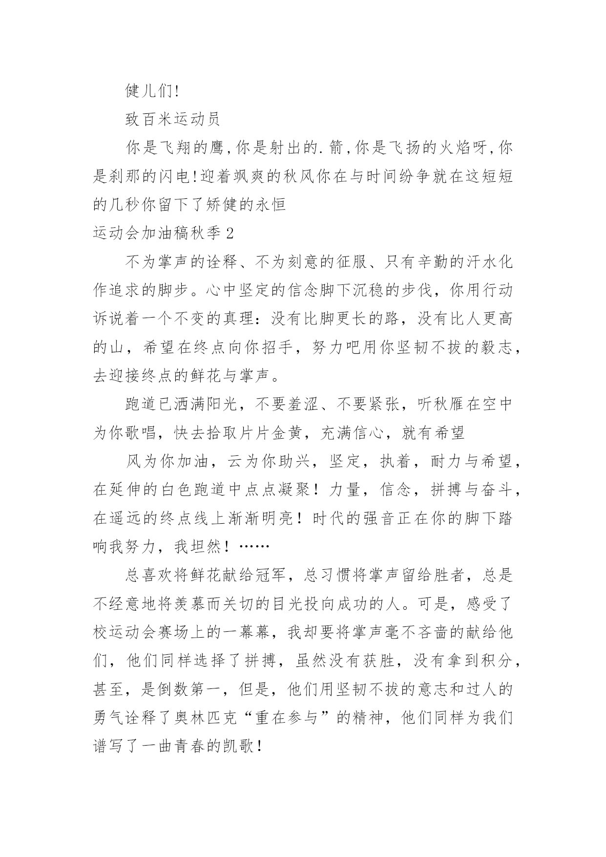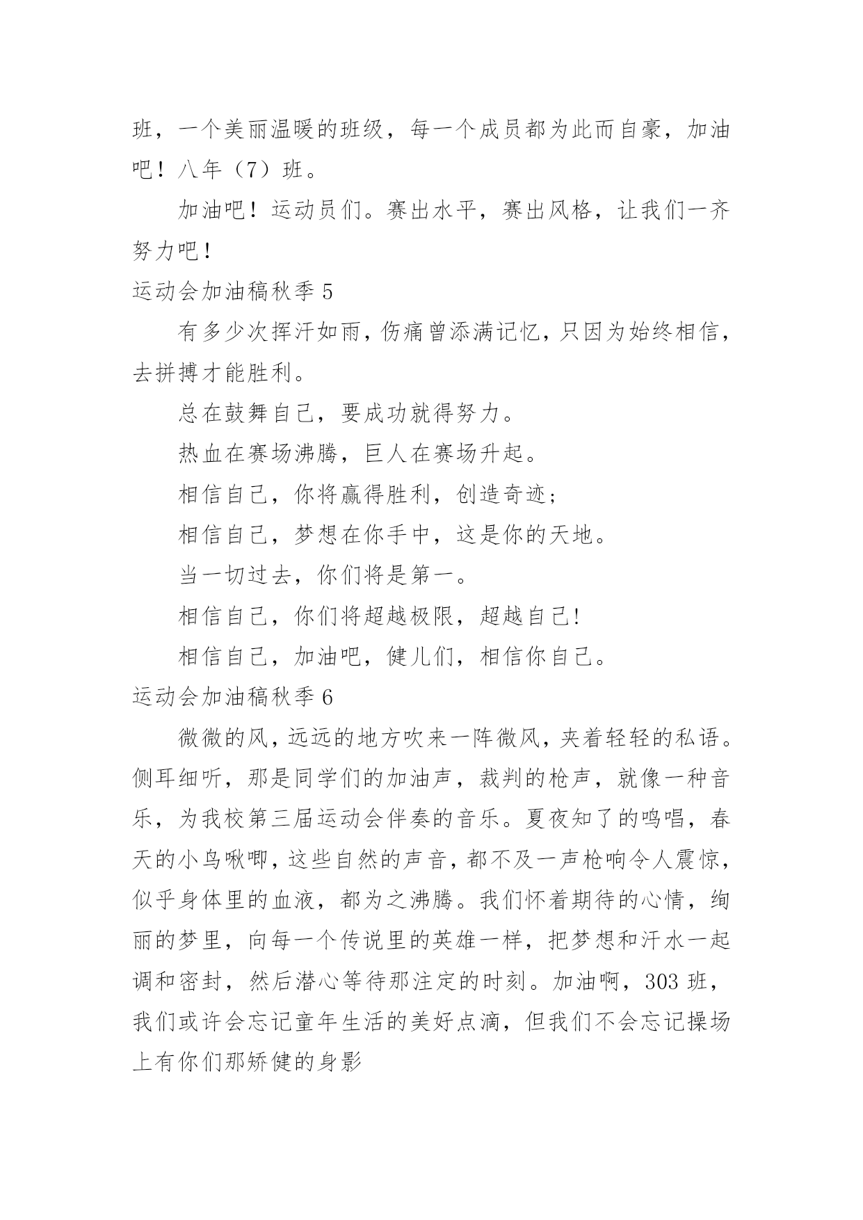 运动会加油稿秋季运动会加油稿秋季现如今,越来越多地方需要用到加油稿,借助加油稿可以表达对对方的鼓励和支持。怎样写加油稿才能更好地发挥其做用呢?以下是小编帮大家整理的运动会加油稿秋季,欢迎阅读,希望大家能够喜欢。运动会加油稿秋季1运动场上有你们的步伐,那是辛苦汗水的抒发,你就像天边的云端,有彩霞的绚丽色彩.奔驰的骏马,飞奔的步伐让你的胜利在前方等待.为你们祝福,为你们喝彩!致百米运动员快如离弦之箭;疾似撒疆野马;你们的速度让我们惊叹;你们的精神让我们钦佩;流汗千日,只为今日一搏;疾踏百步,只为终点一触;胜利再向你微笑;成功在向你招手;加油啊!健儿们!致百米运动员你是飞翔的鹰,你是射出的.箭,你是飞扬的火焰呀,你是刹那的闪电!迎着飒爽的秋风你在与时间纷争就在这短短的几秒你留下了矫健的永恒运动会加油稿秋季2不为掌声的诠释、不为刻意的征服、只有辛勤的汗水化作追求的脚步。心中坚定的信念脚下沉稳的步伐,你用行动诉说着一个不变的真理:没有比脚更长的路,没有比人更高的山,希望在终点向你招手,努力吧用你坚韧不拔的毅志,去迎接终点的鲜花与掌声。跑道已洒满阳光,不要羞涩、不要紧张,听秋雁在空中为你歌唱,快去拾取片片金黄,充满信心,就有希望风为你加油,云为你助兴,坚定,执着,耐力与希望,在延伸的白色跑道中点点凝聚!力量,信念,拼搏与奋斗,在遥远的终点线上渐渐明亮!时代的强音正在你的脚下踏响我努力,我坦然!……总喜欢将鲜花献给冠军,总习惯将掌声留给胜者,总是不经意地将羡慕而关切的目光投向成功的人。可是,感受了校运动会赛场上的一幕幕,我却要将掌声毫不吝啬的献给他们,他们同样选择了拼搏,虽然没有获胜,没有拿到积分,甚至,是倒数第一,但是,他们用坚韧不拔的意志和过人的勇气诠释了奥林匹克“重在参与”的精神,他们同样为我们谱写了一曲青春的凯歌!运动员,有哪位不想争得冠军,挣得积分,为自己的'学院争光,可是,又有几人能够如愿以偿,往往是参加项目的运动员有五十几人,而真正能够进入决赛的,却只有前面的八位。但是,我们的运动员用他们良好的精神风貌和顽强的拼搏精神迎得了观众的尊敬,他们展现了完美的奥林匹克精神,他们虽然失败,依然是真正的英雄。顾拜旦在1936年奥运会演讲时曾经说过:"奥运会重要的不是胜利,而是参与;生活的本质不是索取,而是奋斗!"赤道几内亚历史上第一位奥运游泳选手姆萨巴尼的100米自由泳成绩比200米自由泳世界纪录还慢了7秒多,此前他还从未参加过50米以上的比赛,甚至不敢把头埋入水中,但他顽强地游到终点时,观众把最热烈的掌声献给了他。是的,这就是英雄!英雄,不仅仅是一个行为,而更多的是他的行为所带给我们的心灵的撞击和精神的升华。他们参与了竞争,他们完成了比赛,他们敢于向强手挑战,他们勇于挑战自我,超越自我,他们,用自己的行为淋漓尽致的刻画了我们心目中英雄的形象!人类的历史,就是在不断的挑战与自我挑战的过程中一步步走向进步,而我们的奥运史,也正是因为有众多运动员的参与和竞争而完美地诠释了它“更快,更高,更强”的理念。成败不重要,重要的是参与了,努力了,这就足矣。我努力,我心坦然!你的汗水洒在跑道,浇灌着成功的花朵开放。你的欢笑飞扬在赛场,为班争光数你最棒。跑吧,追吧在这广阔的赛场上,你似骏马似离铉的箭。跑吧,追吧你比虎猛比豹强,你们挥舞着充满力量的双臂看着实心球化成美丽的弧线我着实在心里佩服你们你们抛出了自己的最佳水平3一根小小的木棒,连接的是团结和友爱是一根小小的木棒,传递的是勇气和力量一根小小的木棒,演绎的是奋斗和拼搏加油吧!让这激动人心的时刻,一直回荡在我们心中!踏上跑道,是一种选择。离开起点,是一种勇气。驰骋赛场,是一种胜利。运动健将们,用你的实力,用你的精神,去开拓出,一片属于你的长跑天地!运动会加油稿秋季3年轻的你们自信飞扬!你们踏着坚定的步伐走向起跑点。枪声响起,你们爆出全身力量直奔终点。在观众热烈的叫喊声中,我们看到你们脸上洋溢着的`自豪和勇敢。你们激情澎湃,你们斗志昂扬!豪气冲天的你们将汗水洒下,让热血在赛场沸腾。广阔的绿茵场,是你们展示自我的舞台。你们将在这舞台上舞出青春的脉动!起跑、加速、超越、冲刺,一步一步延向胜利的曙光!加油吧!健儿们!奇迹正在等着你们,让你们必将创造奇迹!运动会加油稿秋季4我们拥有同一个梦想,我们怀着同样炽热的心,我们争取“更快、更高、更强”,我们同喊“友谊第一,比赛第二。”我们是一个平凡而又独特的群众,我们相信,有梦就有远方,有付出就有期望——这就是勇往直前的'八年(7)班,一个美丽温暖的班级,每一个成员都为此而自豪,加油吧!八年(7)班。加油吧!运动员们。赛出水平,赛出风格,让我们一齐努力吧!运动会加油稿秋季5有多少次挥汗如雨,伤痛曾添满记忆,只因为始终相信,去拼搏才能胜利。总在鼓舞自己,要成功就得努力。热