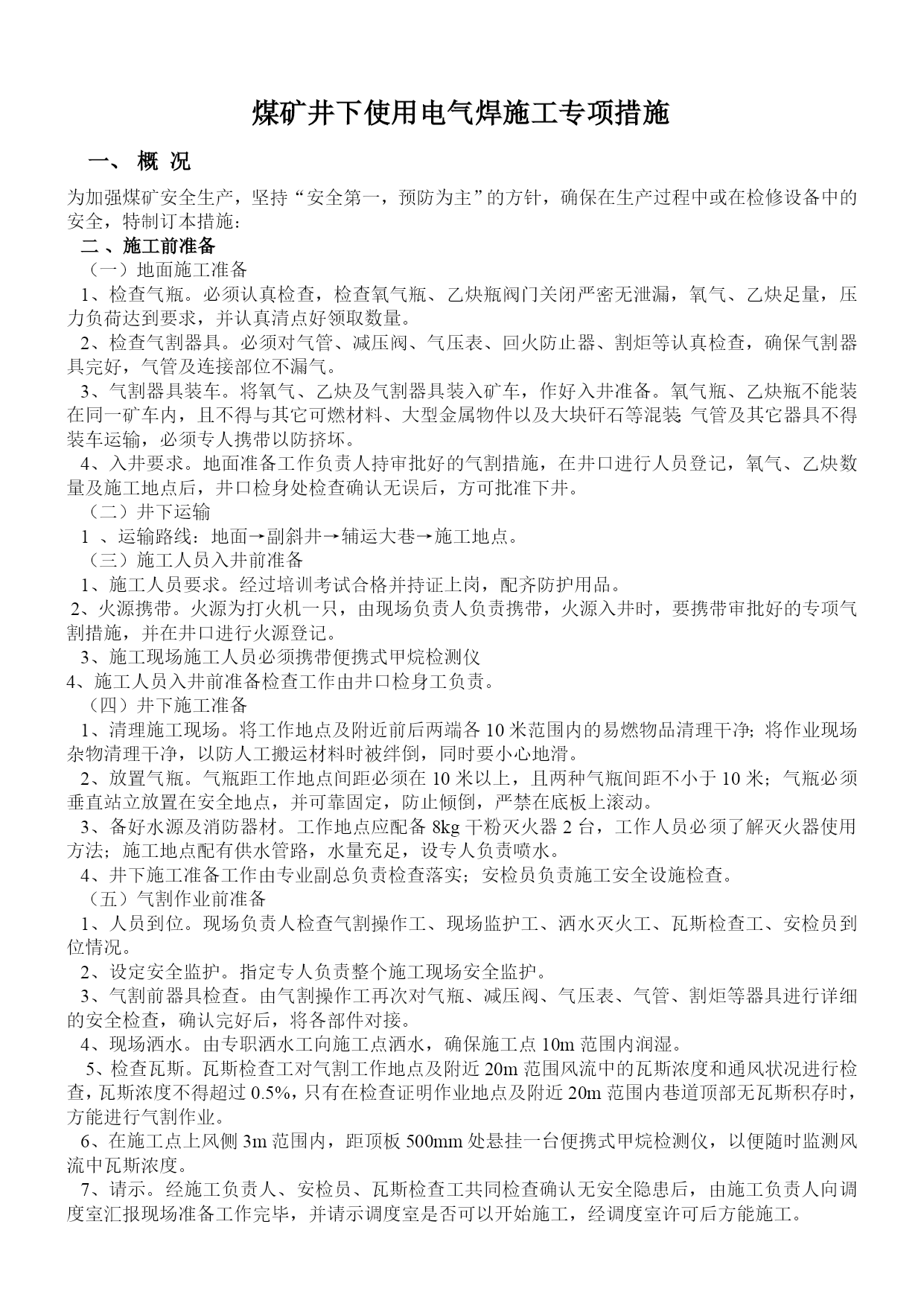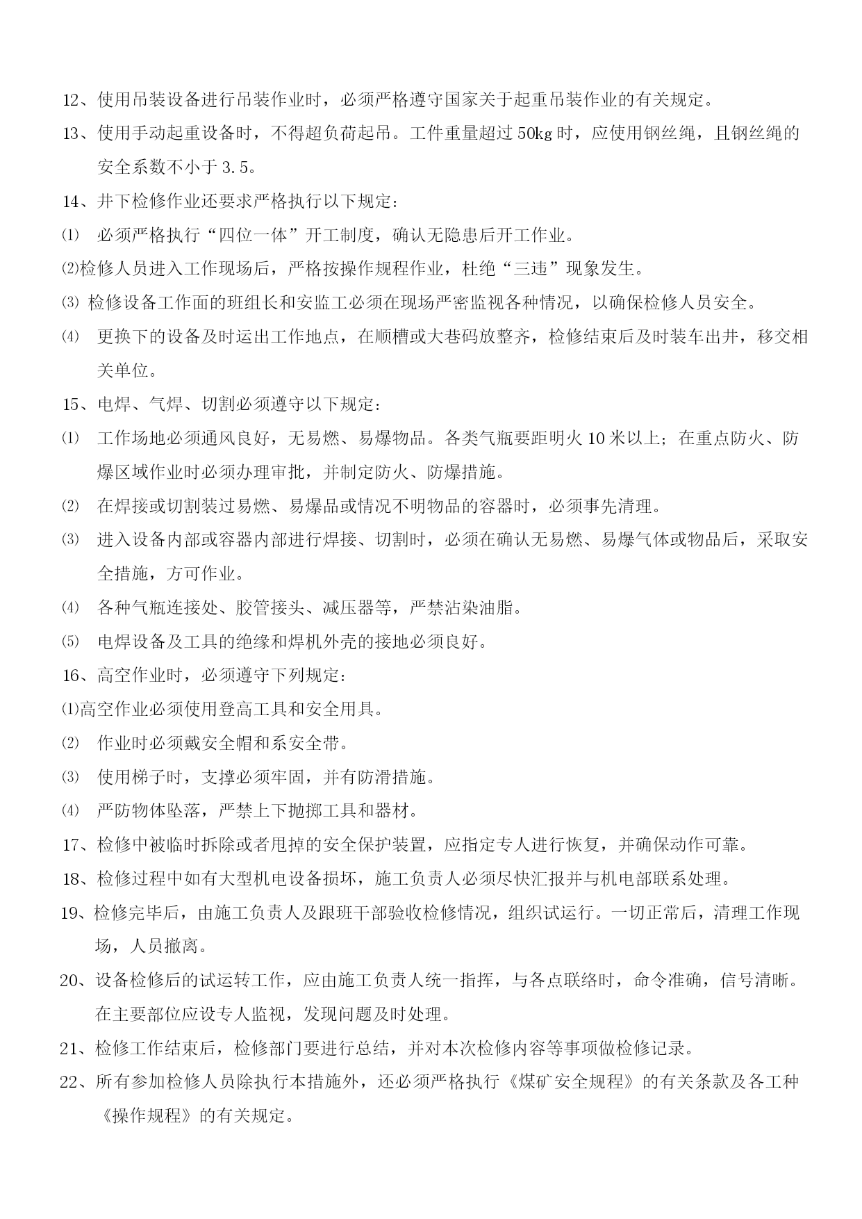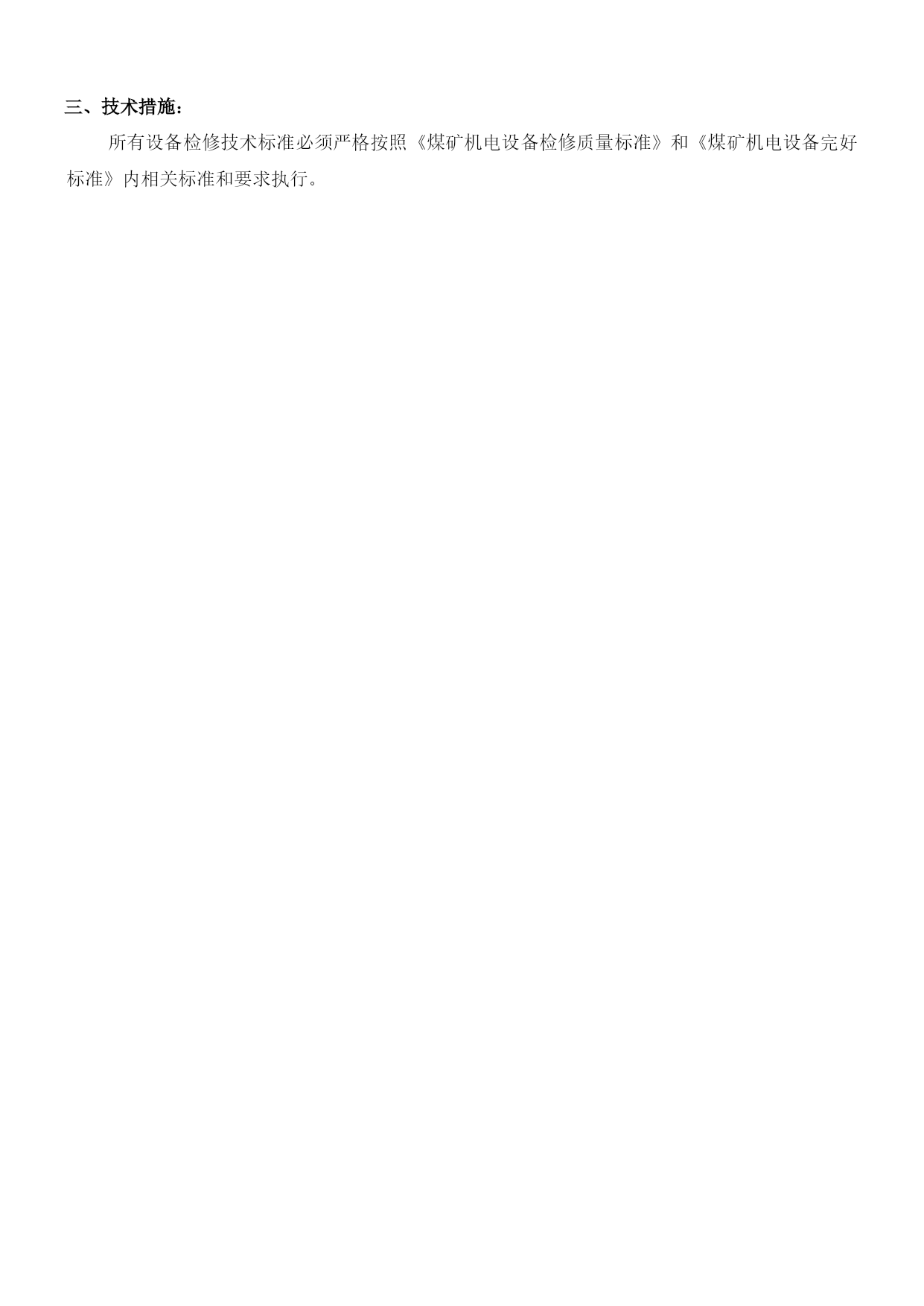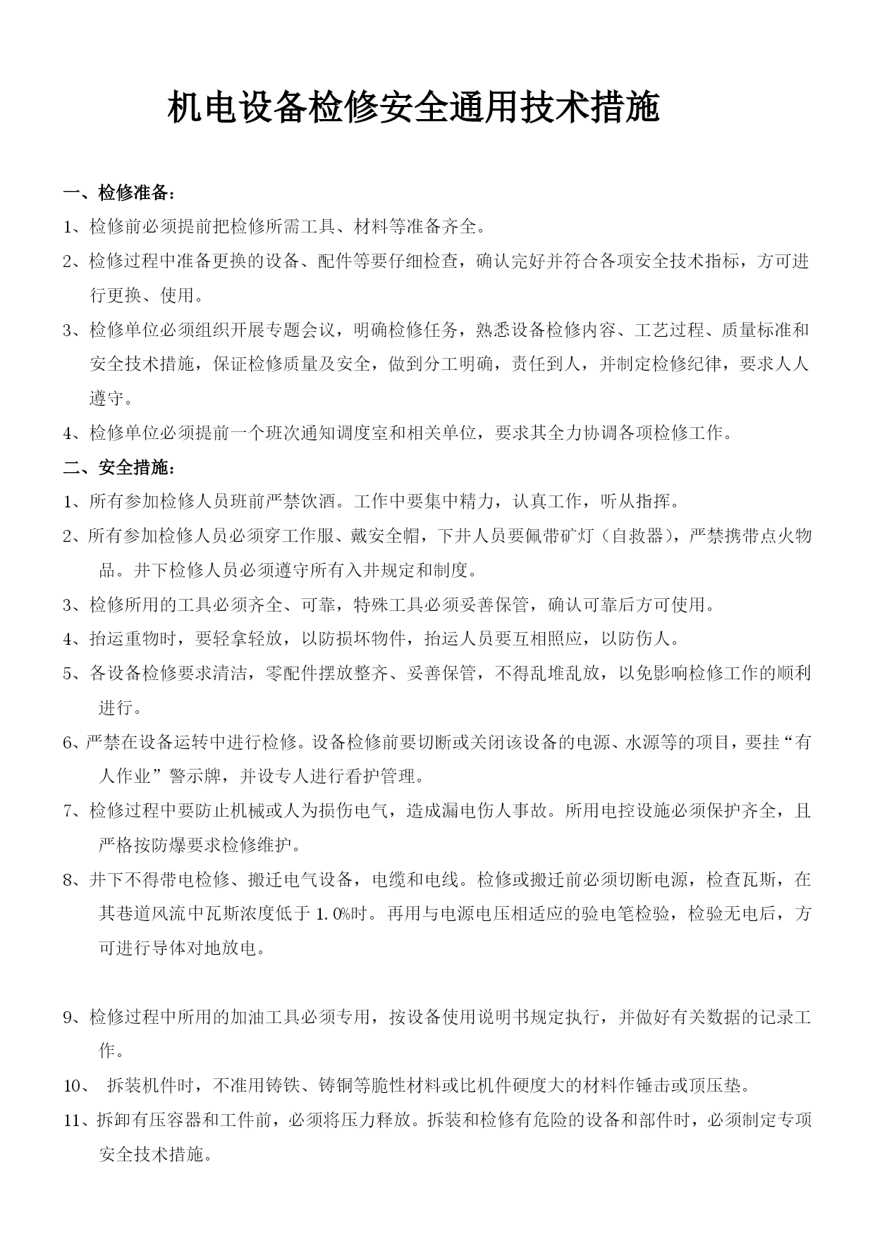 煤矿机电设备检修安全通用技术措施优质资料(可以直接使用,可编辑优质资料,欢迎下载)煤矿机电设备检修安全施工通用技术措施机电设备检修安全通用技术措施一、检修准备:1、检修前必须提前把检修所需工具、材料等准备齐全。2、检修过程中准备更换的设备、配件等要仔细检查,确认完好并符合各项安全技术指标,方可进行更换、使用。3、检修单位必须组织开展专题会议,明确检修任务,熟悉设备检修内容、工艺过程、质量标准和安全技术措施,保证检修质量及安全,做到分工明确,责任到人,并制定检修纪律,要求人人遵守。4、检修单位必须提前一个班次通知调度室和相关单位,要求其全力协调各项检修工作。二、安全措施:1、所有参加检修人员班前严禁饮酒。工作中要集中精力,认真工作,听从指挥。2、所有参加检修人员必须穿工作服、戴安全帽,下井人员要佩带矿灯(自救器),严禁携带点火物品。井下检修人员必须遵守所有入井规定和制度。3、检修所用的工具必须齐全、可靠,特殊工具必须妥善保管,确认可靠后方可使用。4、抬运重物时,要轻拿轻放,以防损坏物件,抬运人员要互相照应,以防伤人。5、各设备检修要求清洁,零配件摆放整齐、妥善保管,不得乱堆乱放,以免影响检修工作的顺利进行。6、严禁在设备运转中进行检修。设备检修前要切断或关闭该设备的电源、水源等的项目,要挂“有人作业”警示牌,并设专人进行看护管理。7、检修过程中要防止机械或人为损伤电气,造成漏电伤人事故。所用电控设施必须保护齐全,且严格按防爆要求检修维护。8、井下不得带电检修、搬迁电气设备,电缆和电线。检修或搬迁前必须切断电源,检查瓦斯,在其巷道风流中瓦斯浓度低于1.0%时。再用与电源电压相适应的验电笔检验,检验无电后,方可进行导体对地放电。9、检修过程中所用的加油工具必须专用,按设备使用说明书规定执行,并做好有关数据的记录工作。10、拆装机件时,不准用铸铁、铸铜等脆性材料或比机件硬度大的材料作锤击或顶压垫。11、拆卸有压容器和工件前,必须将压力释放。拆装和检修有危险的设备和部件时,必须制定专项安全技术措施。12、使用吊装设备进行吊装作业时,必须严格遵守国家关于起重吊装作业的有关规定。13、使用手动起重设备时,不得超负荷起吊。工件重量超过50kg时,应使用钢丝绳,且钢丝绳的安全系数不小于3.5。14、井下检修作业还要求严格执行以下规定:=1\*GB2⑴必须严格执行“四位一体”开工制度,确认无隐患后开工作业。=2\*GB2⑵检修人员进入工作现场后,严格按操作规程作业,杜绝“三违”现象发生。=3\*GB2⑶检修设备工作面的班组长和安监工必须在现场严密监视各种情况,以确保检修人员安全。=4\*GB2⑷更换下的设备及时运出工作地点,在顺槽或大巷码放整齐,检修结束后及时装车出井,移交相关单位。15、电焊、气焊、切割必须遵守以下规定:=1\*GB2⑴工作场地必须通风良好,无易燃、易爆物品。各类气瓶要距明火10米以上;在重点防火、防爆区域作业时必须办理审批,并制定防火、防爆措施。=2\*GB2⑵在焊接或切割装过易燃、易爆品或情况不明物品的容器时,必须事先清理。=3\*GB2⑶进入设备内部或容器内部进行焊接、切割时,必须在确认无易燃、易爆气体或物品后,采取安全措施,方可作业。=4\*GB2⑷各种气瓶连接处、胶管接头、减压器等,严禁沾染油脂。=5\*GB2⑸电焊设备及工具的绝缘和焊机外壳的接地必须良好。16、高空作业时,必须遵守下列规定:=1\*GB2⑴高空作业必须使用登高工具和安全用具。=2\*GB2⑵作业时必须戴安全帽和系安全带。=3\*GB2⑶使用梯子时,支撑必须牢固,并有防滑措施。=4\*GB2⑷严防物体坠落,严禁上下抛掷工具和器材。17、检修中被临时拆除或者甩掉的安全保护装置,应指定专人进行恢复,并确保动作可靠。18、检修过程中如有大型机电设备损坏,施工负责人必须尽快汇报并与机电部联系处理。19、检修完毕后,由施工负责人及跟班干部验收检修情况,组织试运行。一切正常后,清理工作现场,人员撤离。20、设备检修后的试运转工作,应由施工负责人统一指挥,与各点联络时,命令准确,信号清晰。在主要部位应设专人监视,发现问题及时处理。21、检修工作结束后,检修部门要进行总结,并对本次检修内容等事项做检修记录。22、所有参加检修人员除执行本措施外,还必须严格执行《煤矿安全规程》的有关条款及各工种《操作规程》的有关规定。三、技术措施:所有设备检修技术标准必须严格按照《煤矿机电设备检修质量标准》和《煤矿机电设备完好标准》内相关标准和要求执行。