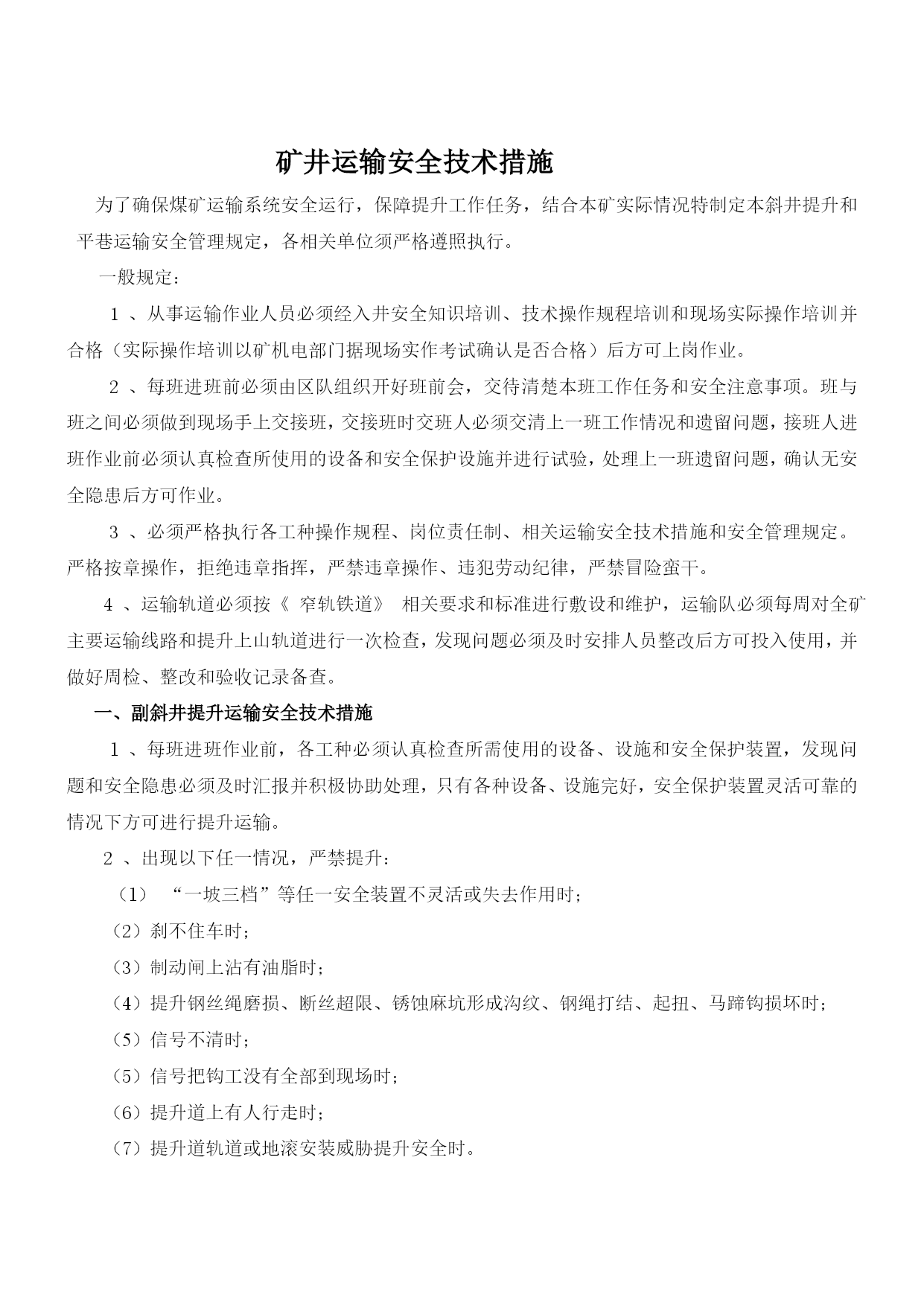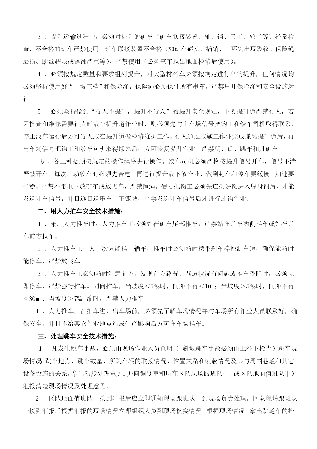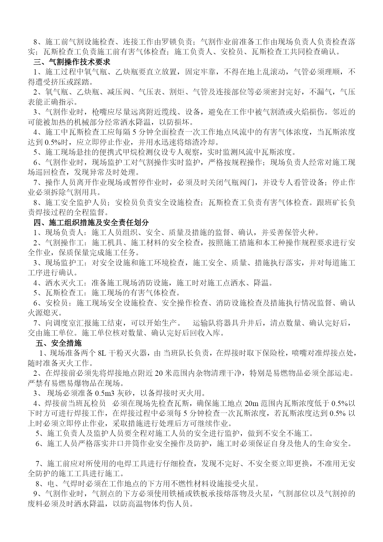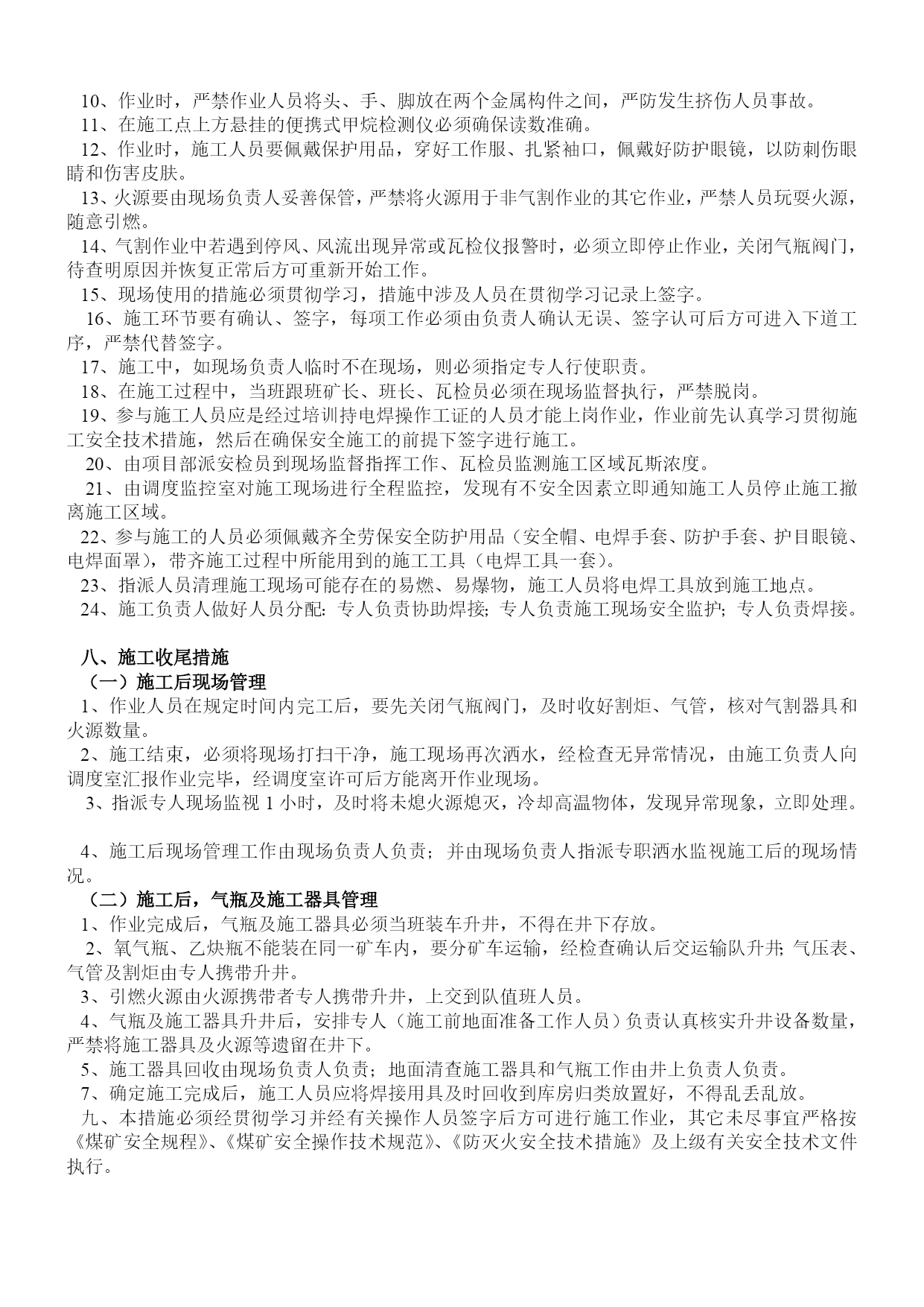煤矿机电设备检修安全通用技术措施优质资料(可以直接使用,可编辑优质资料,欢迎下载)煤矿机电设备检修安全施工通用技术措施机电设备检修安全通用技术措施一、检修准备:1、检修前必须提前把检修所需工具、材料等准备齐全。2、检修过程中准备更换的设备、配件等要仔细检查,确认完好并符合各项安全技术指标,方可进行更换、使用。3、检修单位必须组织开展专题会议,明确检修任务,熟悉设备检修内容、工艺过程、质量标准和安全技术措施,保证检修质量及安全,做到分工明确,责任到人,并制定检修纪律,要求人人遵守。4、检修单位必须提前一个班次通知调度室和相关单位,要求其全力协调各项检修工作。二、安全措施:1、所有参加检修人员班前严禁饮酒。工作中要集中精力,认真工作,听从指挥。2、所有参加检修人员必须穿工作服、戴安全帽,下井人员要佩带矿灯(自救器),严禁携带点火物品。井下检修人员必须遵守所有入井规定和制度。3、检修所用的工具必须齐全、可靠,特殊工具必须妥善保管,确认可靠后方可使用。4、抬运重物时,要轻拿轻放,以防损坏物件,抬运人员要互相照应,以防伤人。5、各设备检修要求清洁,零配件摆放整齐、妥善保管,不得乱堆乱放,以免影响检修工作的顺利进行。6、严禁在设备运转中进行检修。设备检修前要切断或关闭该设备的电源、水源等的项目,要挂“有人作业”警示牌,并设专人进行看护管理。7、检修过程中要防止机械或人为损伤电气,造成漏电伤人事故。所用电控设施必须保护齐全,且严格按防爆要求检修维护。8、井下不得带电检修、搬迁电气设备,电缆和电线。检修或搬迁前必须切断电源,检查瓦斯,在其巷道风流中瓦斯浓度低于1.0%时。再用与电源电压相适应的验电笔检验,检验无电后,方可进行导体对地放电。9、检修过程中所用的加油工具必须专用,按设备使用说明书规定执行,并做好有关数据的记录工作。10、拆装机件时,不准用铸铁、铸铜等脆性材料或比机件硬度大的材料作锤击或顶压垫。11、拆卸有压容器和工件前,必须将压力释放。拆装和检修有危险的设备和部件时,必须制定专项安全技术措施。12、使用吊装设备进行吊装作业时,必须严格遵守国家关于起重吊装作业的有关规定。13、使用手动起重设备时,不得超负荷起吊。工件重量超过50kg时,应使用钢丝绳,且钢丝绳的安全系数不小于3.5。14、井下检修作业还要求严格执行以下规定:=1\*GB2⑴必须严格执行“四位一体”开工制度,确认无隐患后开工作业。=2\*GB2⑵检修人员进入工作现场后,严格按操作规程作业,杜绝“三违”现象发生。=3\*GB2⑶检修设备工作面的班组长和安监工必须在现场严密监视各种情况,以确保检修人员安全。=4\*GB2⑷更换下的设备及时运出工作地点,在顺槽或大巷码放整齐,检修结束后及时装车出井,移交相关单位。15、电焊、气焊、切割必须遵守以下规定:=1\*GB2⑴工作场地必须通风良好,无易燃、易爆物品。各类气瓶要距明火10米以上;在重点防火、防爆区域作业时必须办理审批,并制定防火、防爆措施。=2\*GB2⑵在焊接或切割装过易燃、易爆品或情况不明物品的容器时,必须事先清理。=3\*GB2⑶进入设备内部或容器内部进行焊接、切割时,必须在确认无易燃、易爆气体或物品后,采取安全措施,方可作业。=4\*GB2⑷各种气瓶连接处、胶管接头、减压器等,严禁沾染油脂。=5\*GB2⑸电焊设备及工具的绝缘和焊机外壳的接地必须良好。16、高空作业时,必须遵守下列规定:=1\*GB2⑴高空作业必须使用登高工具和安全用具。=2\*GB2⑵作业时必须戴安全帽和系安全带。=3\*GB2⑶使用梯子时,支撑必须牢固,并有防滑措施。=4\*GB2⑷严防物体坠落,严禁上下抛掷工具和器材。17、检修中被临时拆除或者甩掉的安全保护装置,应指定专人进行恢复,并确保动作可靠。18、检修过程中如有大型机电设备损坏,施工负责人必须尽快汇报并与机电部联系处理。19、检修完毕后,由施工负责人及跟班干部验收检修情况,组织试运行。一切正常后,清理工作现场,人员撤离。20、设备检修后的试运转工作,应由施工负责人统一指挥,与各点联络时,命令准确,信号清晰。在主要部位应设专人监视,发现问题及时处理。21、检修工作结束后,检修部门要进行总结,并对本次检修内容等事项做检修记录。22、所有参加检修人员除执行本措施外,还必须严格执行《煤矿安全规程》的有关条款及各工种《操作规程》的有关规定。三、技术措施:所有设备检修技术标准必须严格按照《煤矿机电设备检修质量标准》和《煤矿机电设备完好标准》内相关标准和要求执行。