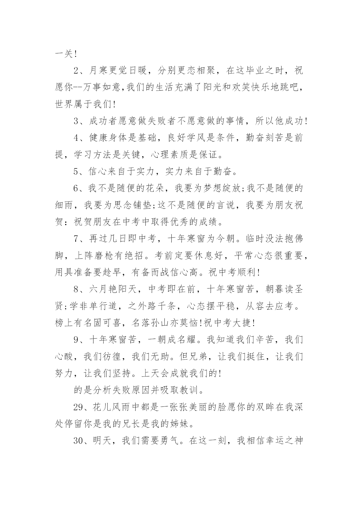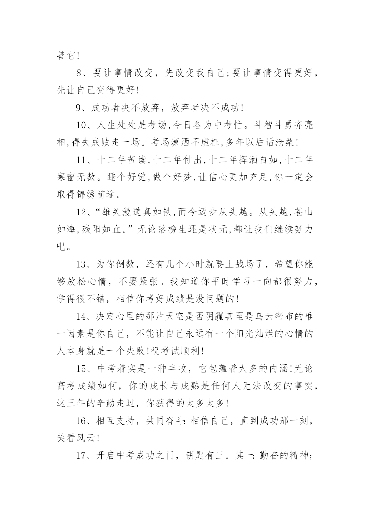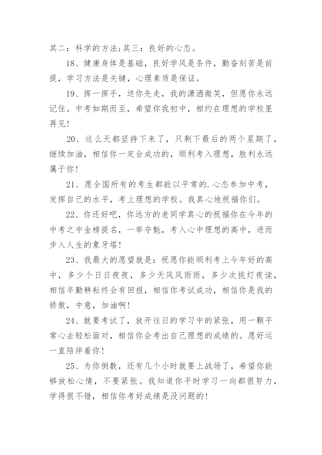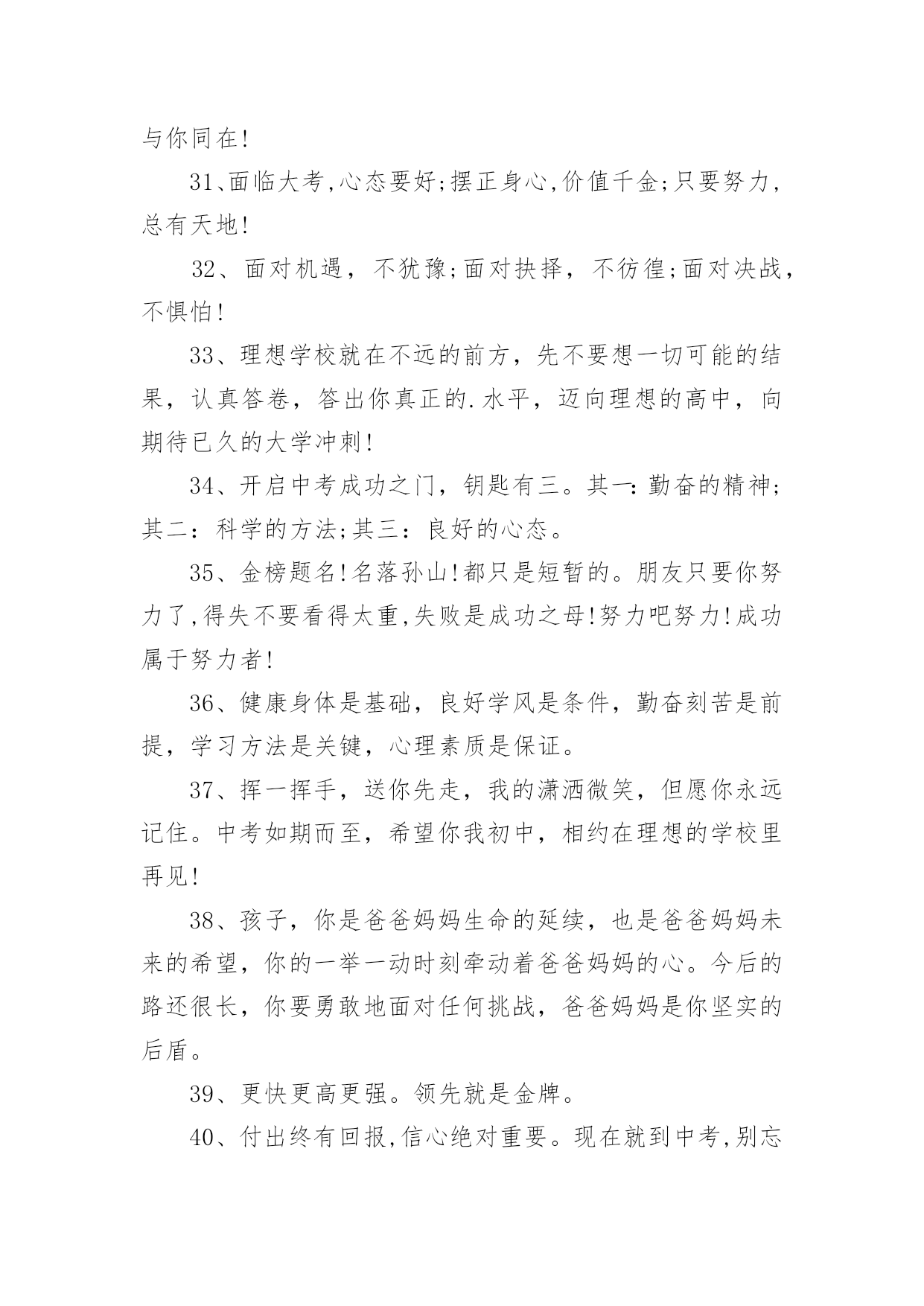 中考鼓励考生的祝福语中考鼓励考生的祝福语在平时的学习、工作或生活中,大家都经常接触到祝福语吧,祝福语可以传达对他人的关切和问候。什么样的祝福语才是走心的呢?下面是小编为大家收集的中考鼓励考生的祝福语,欢迎大家分享。中考鼓励考生的祝福语11、拼搏中考,今生无悔;爬过初三,追求卓越!2、乐学实学,挑战中考;勤勉向上,成就自我。3、不经一番寒傲骨,那得梅花扑鼻香。4、三分天注定,七分靠拼搏,会拼才会赢。5、时不我待,分秒必争备战中考。6、山高不厌攀,水深不厌潜,学精不厌苦:追求!7、挑战人生是我无悔的选择,决胜中考是我不懈的追求。8、争取时间就是争取成功,提高效率就是提高分数。9、学习与坐禅相似,须有一颗恒心。10、对待试题:冷静、乐观,对待考试:认真、自信。11、贵在坚持、难在坚持、成在坚持。12、将要分别的我们,中考加油一路顺风!13、要成功,先发狂,下定决心往前冲!14、十年寒窗磨一剑,是非成败在今朝。15、风萧萧兮易水寒,壮士一去兮不复返。16、锣鼓共鸣,百花齐放养兵千日,用在一时17、有志者自有千计万计,无志者只感千难万难。18、让刻苦成为习惯,用汗水浇灌未来。19、眉毛上的汗水和眉毛下的泪水,你必须选择一样!20、昆仑纵有千丈雪,我亦誓把昆仑截。21、人生重要的.不是所站的位置,而是所朝的方向。22、你一定会成功的,好好考吧!祝你成功!23、靠山山会倒,靠水水会流,靠自己永远不倒。24、人生难得几回搏?此时不搏何时搏?25、有志者自有千方百计,无志者只感千难万难。26、不必每分钟都学习,但求学习中每分钟都有收获。中考鼓励考生的祝福语21、这两天的考试过程中,要调整好自己的情绪,考过一门,就不要再想了,重要的是吃好,喝好,休息好,营造一种良好的应考氛围,祝愿你考试顺利!2、到了,到了,中考就在眼前了;快了,快了,梦想就快实现了;微笑,微笑,把美好明天拥抱。3、王侯将相,宁有种乎?4、我拼命,我可以!只有奋斗的人生才是真正的人生!5、黑发不改勤学早,白发方悔读书迟6、没有失败,只有暂时停止成功!7、重要的不是发生了什么事,而是要做哪些事情来改善它!8、要让事情改变,先改变我自己;要让事情变得更好,先让自己变得更好!9、成功者决不放弃,放弃者决不成功!10、人生处处是考场,今日各为中考忙。斗智斗勇齐亮相,得失成败走一场。考场潇洒不虚枉,多年以后话沧桑!11、十二年苦读,十二年付出,十二年挥洒自如,十二年寒窗无数。睡个好觉,做个好梦,让信心更加充足,你一定会取得锦绣前途。12、“雄关漫道真如铁,而今迈步从头越。从头越,苍山如海,残阳如血。”无论落榜生还是状元,都让我们继续努力吧。13、为你倒数,还有几个小时就要上战场了,希望你能够放松心情,不要紧张。我知道你平时学习一向都很努力,学得很不错,相信你考好成绩是没问题的!14、决定心里的那片天空是否阴霾甚至是乌云密布的唯一因素是你自己,不能让自己永远有一个阳光灿烂的心情的人本身就是一个失败!祝考试顺利!15、中考着实是一种丰收,它包蕴着太多的内涵!无论高考成绩如何,你的成长与成熟是任何人无法改变的事实,这三年的辛勤走过,你获得的太多太多!16、相互支持,共同奋斗:相信自己,直到成功那一刻,笑看风云!17、开启中考成功之门,钥匙有三。其一:勤奋的精神;其二:科学的方法;其三:良好的心态。18、健康身体是基础,良好学风是条件,勤奋刻苦是前提,学习方法是关键,心理素质是保证。19、挥一挥手,送你先走,我的潇洒微笑,但愿你永远记住。中考如期而至,希望你我初中,相约在理想的学校里再见!20、这么天都坚持下来了,只剩下最后的两个星期了,继续加油,相信你一定会成功的,顺利考入理想,胜利永远属于你!21、愿全国所有的考生都能以平常的.心态参加中考,发挥自己的水平,考上理想的学校。我真心地祝福你们。22、你还好吧,你远方的老同学真心的祝福你在今年的中考之中金榜提名,一举夺魁,考入心中理想的高中,进而步入人生的象牙塔!23、我最大的愿望就是:祝愿你能顺利考上今年好的高中,多少个日日夜夜,多少天风风雨雨,多少次挑灯夜读,相信辛勤耕耘终会有回报,相信你考试成功,相信你是我的骄傲,中意,加油啊!24、就要考试了,放开往日的学习中的紧张,用一颗平常心去轻松面对,相信你会考出自己理想的成绩的。愿好运一直陪伴着你!25、为你倒数,还有几个小时就要上战场了,希望你能够放松心情,不要紧张。我知道你平时学习一向都很努力,学得很不错,相信你考好成绩是没问题的!26、孩子,你是爸爸妈妈生命的延续,也是爸爸妈妈未来的希望,你的一举一动时刻牵动着爸爸妈妈的心。今后的路还很长,你要勇敢地面对任何挑战,爸爸妈妈是你坚实的后盾。27、祝愿天下所有考生开心度过中考。祝福你们旗开得胜,取得美好佳绩。平心对待高考,你们是最棒的!仁慈的上
