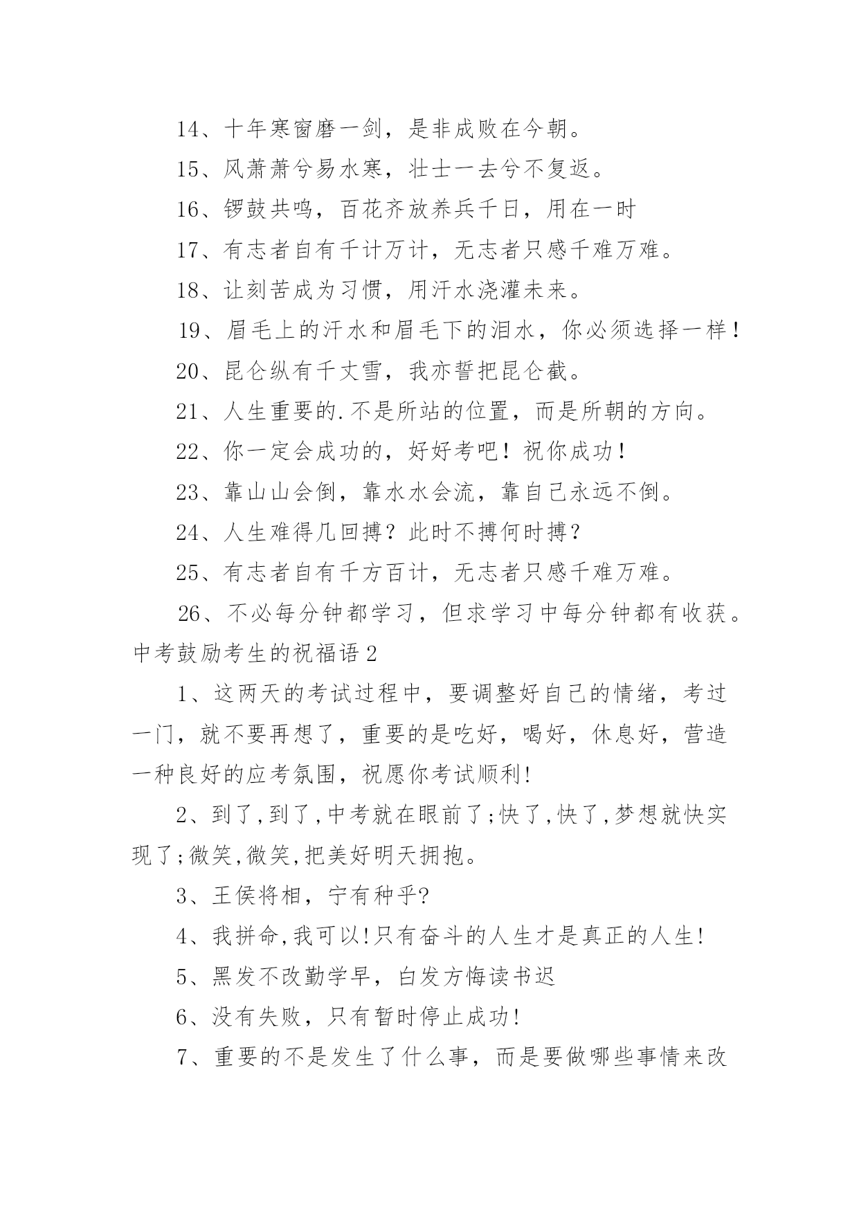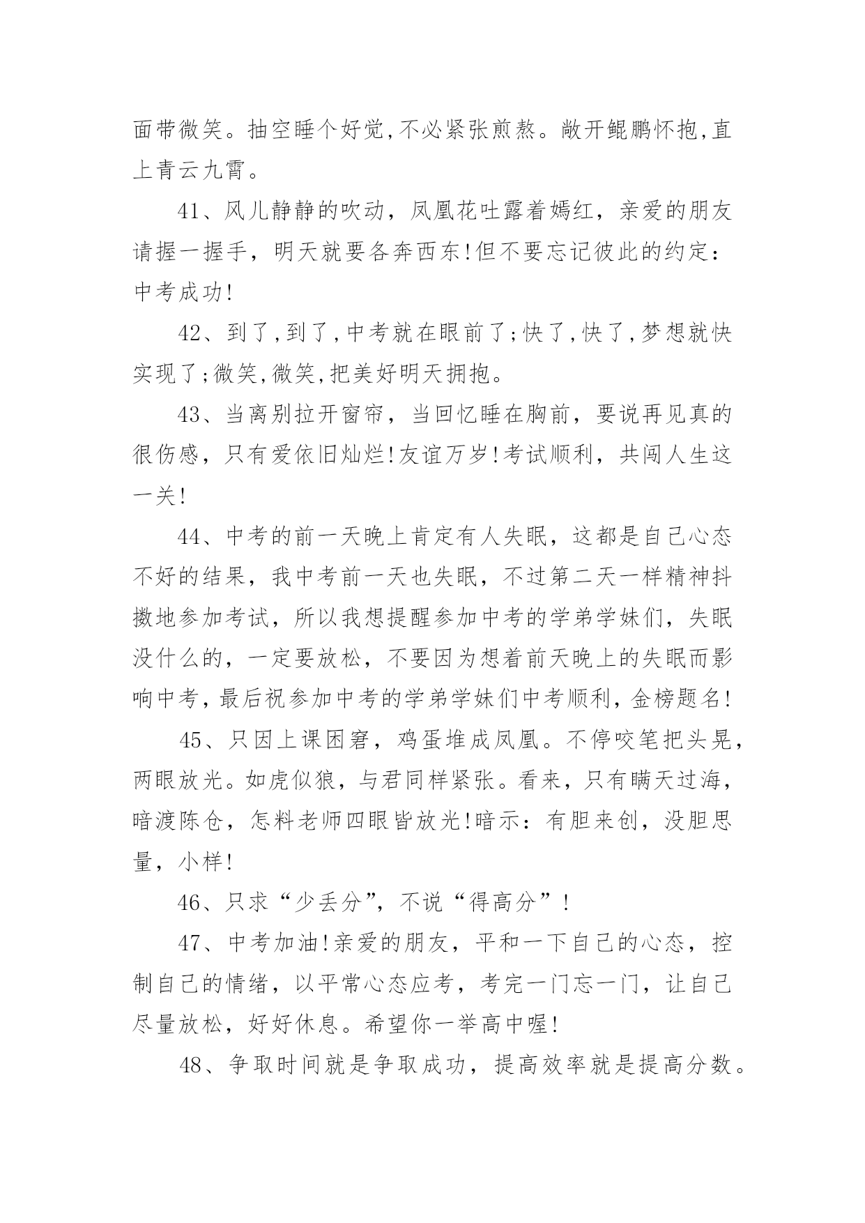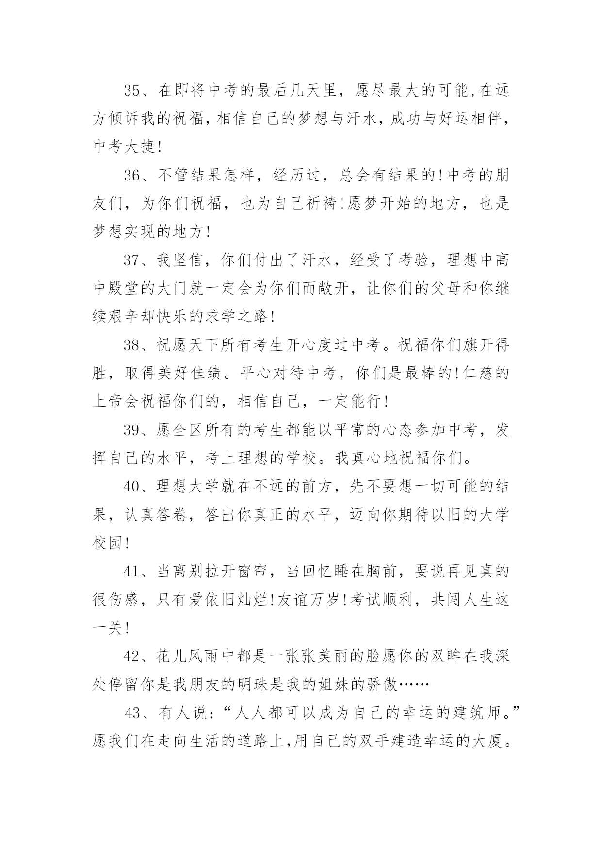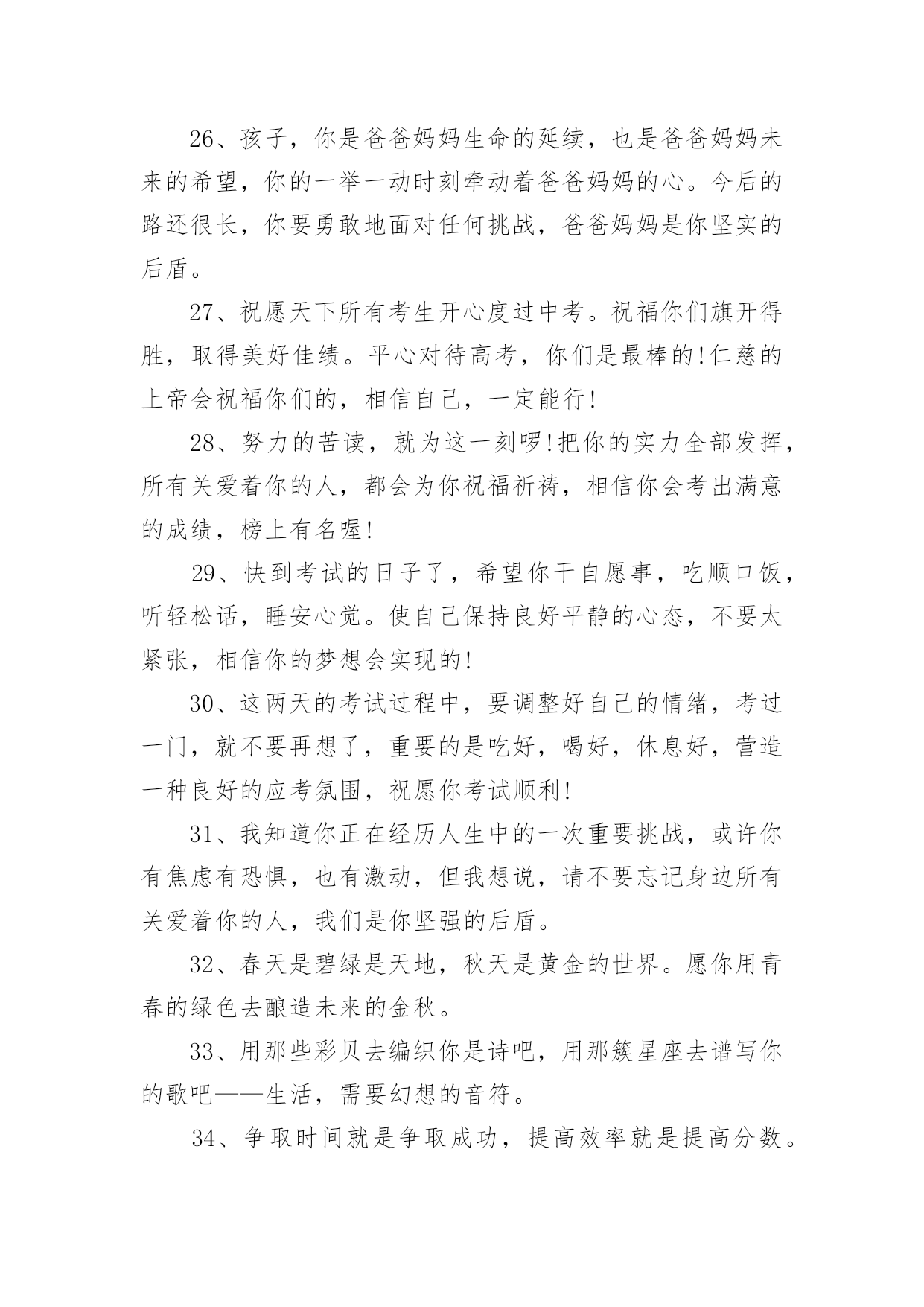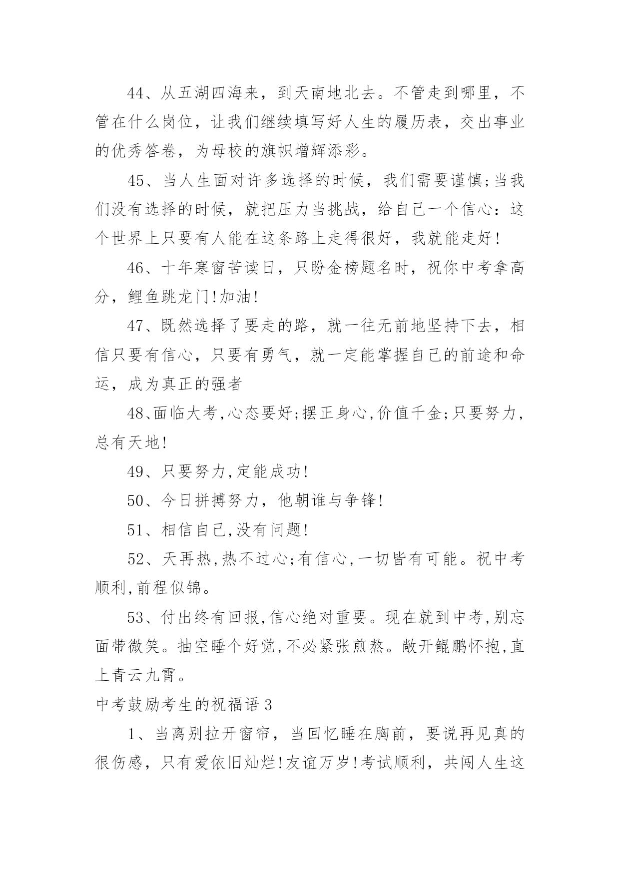 中考鼓励考生的祝福语中考鼓励考生的祝福语在平时的学习、工作或生活中,大家都经常接触到祝福语吧,祝福语可以传达对他人的关切和问候。什么样的祝福语才是走心的呢?下面是小编为大家收集的中考鼓励考生的祝福语,欢迎大家分享。中考鼓励考生的祝福语11、拼搏中考,今生无悔;爬过初三,追求卓越!2、乐学实学,挑战中考;勤勉向上,成就自我。3、不经一番寒傲骨,那得梅花扑鼻香。4、三分天注定,七分靠拼搏,会拼才会赢。5、时不我待,分秒必争备战中考。6、山高不厌攀,水深不厌潜,学精不厌苦:追求!7、挑战人生是我无悔的选择,决胜中考是我不懈的追求。8、争取时间就是争取成功,提高效率就是提高分数。9、学习与坐禅相似,须有一颗恒心。10、对待试题:冷静、乐观,对待考试:认真、自信。11、贵在坚持、难在坚持、成在坚持。12、将要分别的我们,中考加油一路顺风!13、要成功,先发狂,下定决心往前冲!14、十年寒窗磨一剑,是非成败在今朝。15、风萧萧兮易水寒,壮士一去兮不复返。16、锣鼓共鸣,百花齐放养兵千日,用在一时17、有志者自有千计万计,无志者只感千难万难。18、让刻苦成为习惯,用汗水浇灌未来。19、眉毛上的汗水和眉毛下的泪水,你必须选择一样!20、昆仑纵有千丈雪,我亦誓把昆仑截。21、人生重要的.不是所站的位置,而是所朝的方向。22、你一定会成功的,好好考吧!祝你成功!23、靠山山会倒,靠水水会流,靠自己永远不倒。24、人生难得几回搏?此时不搏何时搏?25、有志者自有千方百计,无志者只感千难万难。26、不必每分钟都学习,但求学习中每分钟都有收获。中考鼓励考生的祝福语21、这两天的考试过程中,要调整好自己的情绪,考过一门,就不要再想了,重要的是吃好,喝好,休息好,营造一种良好的应考氛围,祝愿你考试顺利!2、到了,到了,中考就在眼前了;快了,快了,梦想就快实现了;微笑,微笑,把美好明天拥抱。3、王侯将相,宁有种乎?4、我拼命,我可以!只有奋斗的人生才是真正的人生!5、黑发不改勤学早,白发方悔读书迟6、没有失败,只有暂时停止成功!7、重要的不是发生了什么事,而是要做哪些事情来改善它!8、要让事情改变,先改变我自己;要让事情变得更好,先让自己变得更好!9、成功者决不放弃,放弃者决不成功!10、人生处处是考场,今日各为中考忙。斗智斗勇齐亮相,得失成败走一场。考场潇洒不虚枉,多年以后话沧桑!11、十二年苦读,十二年付出,十二年挥洒自如,十二年寒窗无数。睡个好觉,做个好梦,让信心更加充足,你一定会取得锦绣前途。12、“雄关漫道真如铁,而今迈步从头越。从头越,苍山如海,残阳如血。”无论落榜生还是状元,都让我们继续努力吧。13、为你倒数,还有几个小时就要上战场了,希望你能够放松心情,不要紧张。我知道你平时学习一向都很努力,学得很不错,相信你考好成绩是没问题的!14、决定心里的那片天空是否阴霾甚至是乌云密布的唯一因素是你自己,不能让自己永远有一个阳光灿烂的心情的人本身就是一个失败!祝考试顺利!15、中考着实是一种丰收,它包蕴着太多的内涵!无论高考成绩如何,你的成长与成熟是任何人无法改变的事实,这三年的辛勤走过,你获得的太多太多!16、相互支持,共同奋斗:相信自己,直到成功那一刻,笑看风云!17、开启中考成功之门,钥匙有三。其一:勤奋的精神;其二:科学的方法;其三:良好的心态。18、健康身体是基础,良好学风是条件,勤奋刻苦是前提,学习方法是关键,心理素质是保证。19、挥一挥手,送你先走,我的潇洒微笑,但愿你永远记住。中考如期而至,希望你我初中,相约在理想的学校里再见!20、这么天都坚持下来了,只剩下最后的两个星期了,继续加油,相信你一定会成功的,顺利考入理想,胜利永远属于你!21、愿全国所有的考生都能以平常的.心态参加中考,发挥自己的水平,考上理想的学校。我真心地祝福你们。22、你还好吧,你远方的老同学真心的祝福你在今年的中考之中金榜提名,一举夺魁,考入心中理想的高中,进而步入人生的象牙塔!23、我最大的愿望就是:祝愿你能顺利考上今年好的高中,多少个日日夜夜,多少天风风雨雨,多少次挑灯夜读,相信辛勤耕耘终会有回报,相信你考试成功,相信你是我的骄傲,中意,加油啊!24、就要考试了,放开往日的学习中的紧张,用一颗平常心去轻松面对,相信你会考出自己理想的成绩的。愿好运一直陪伴着你!25、为你倒数,还有几个小时就要上战场了,希望你能够放松心情,不要紧张。我知道你平时学习一向都很努力,学得很不错,相信你考好成绩是没问题的!26、孩子,你是爸爸妈妈生命的延续,也是爸爸妈妈未来的希望,你的一举一动时刻牵动着爸爸妈妈的心。今后的路还很长,你要勇敢地面对任何挑战,爸爸妈妈是你坚实的后盾。27、祝愿天下所有考生开心度过中考。祝福你们旗开得胜,取得美好佳绩。平心对待高考,你们是最棒的!仁慈的上