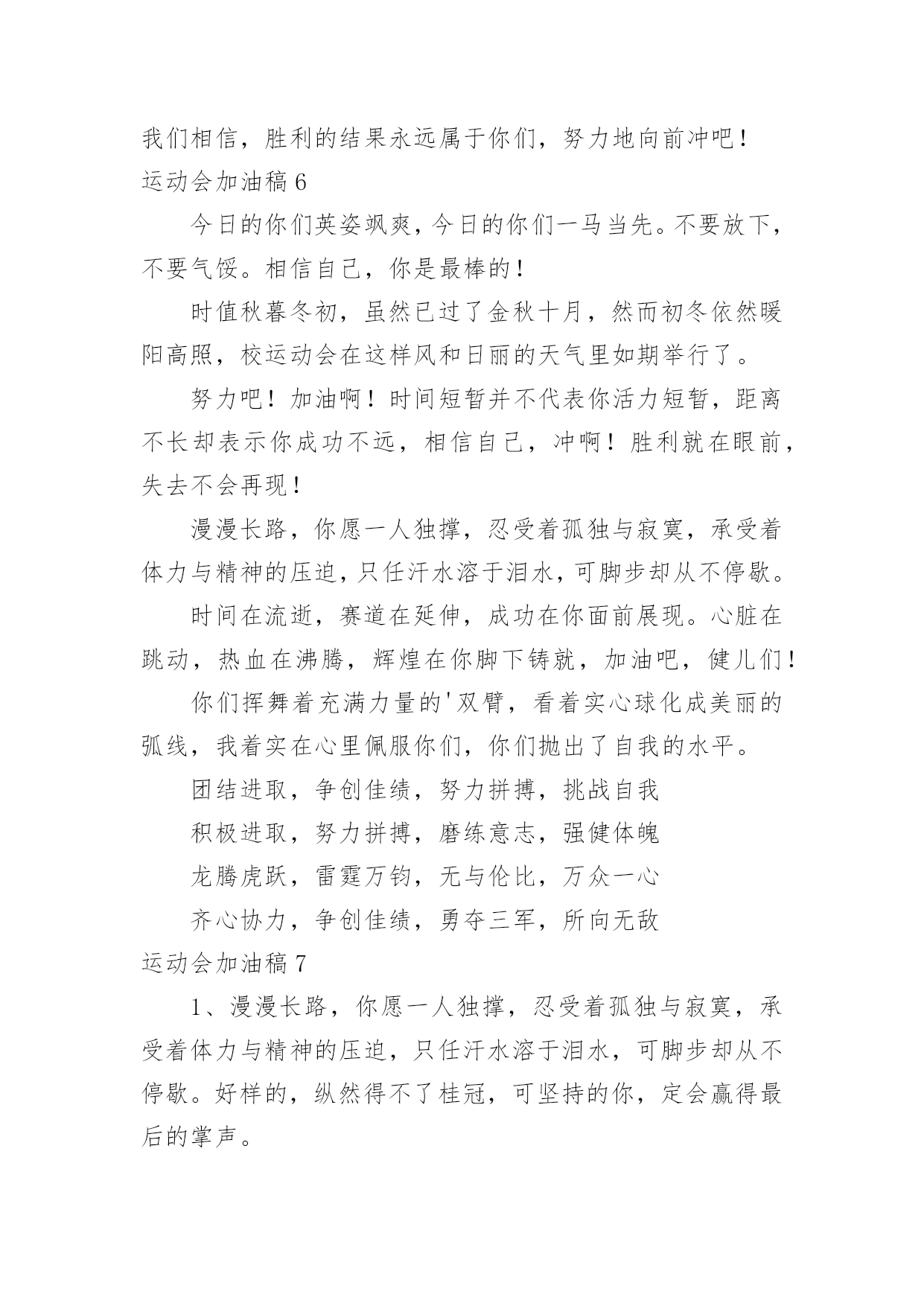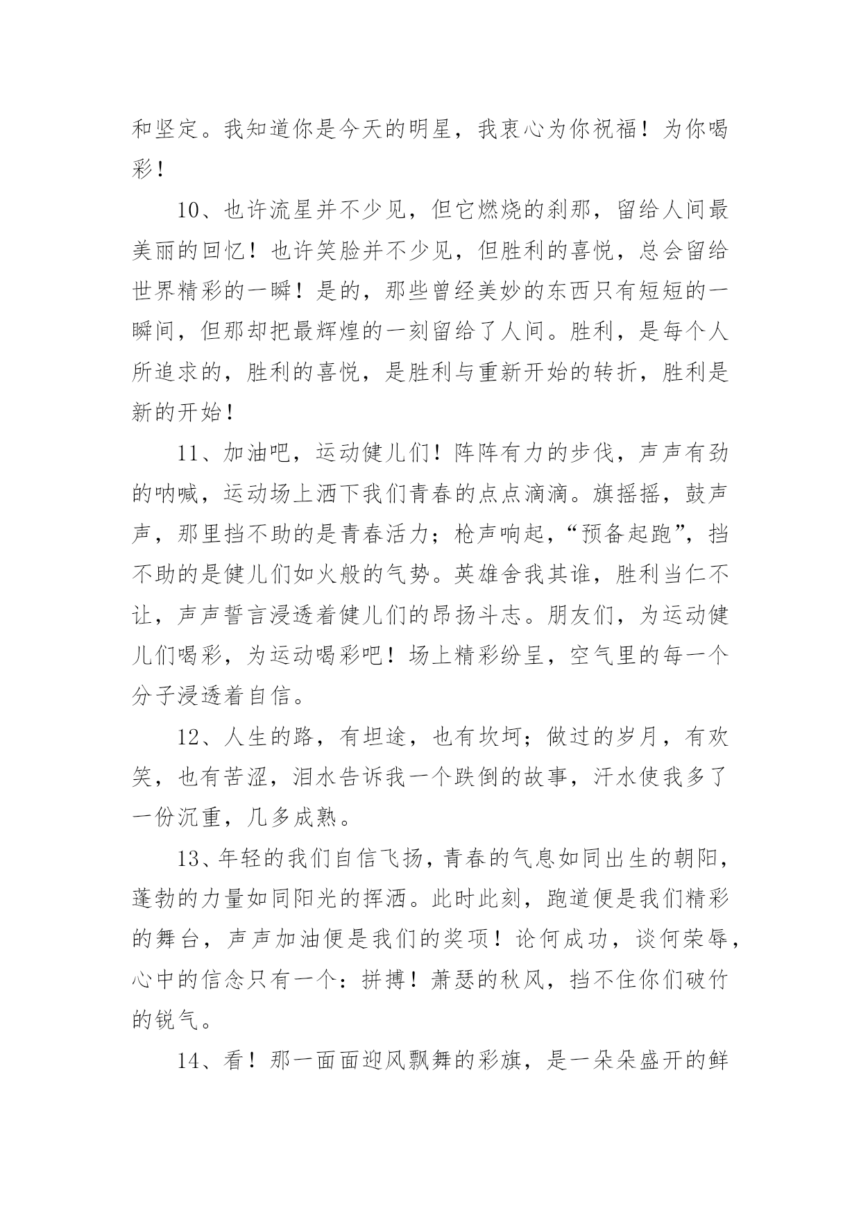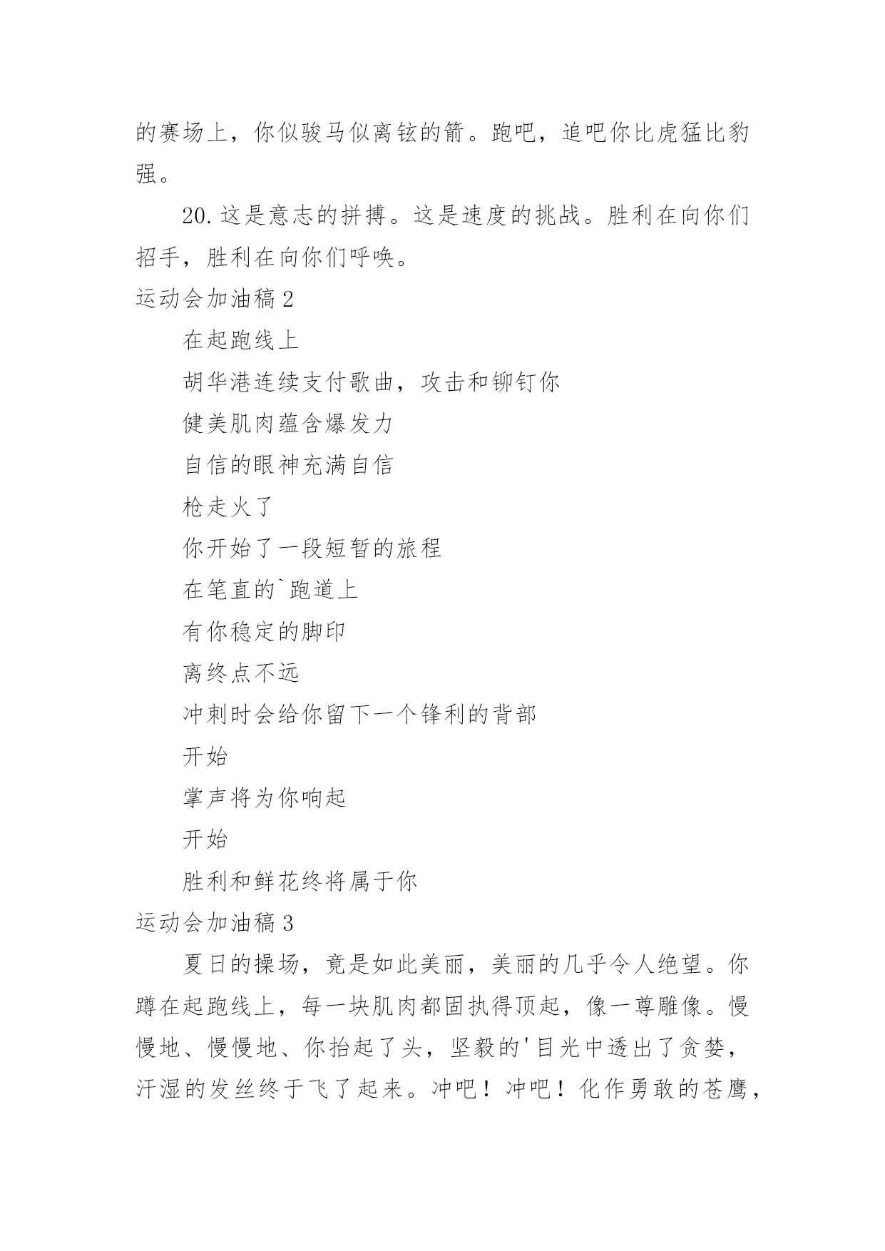 运动会加油稿运动会加油稿在学习、工作生活中,我们使用上加油稿的情况与日俱增,借助加油稿可以表达对对方的鼓励和支持。你知道加油稿怎样才能写的好吗?下面是小编收集整理的运动会加油稿,仅供参考,希望能够帮助到大家。运动会加油稿11.心中坚定的信念,脚下沉稳的步伐,你用行动告诉我们一个不变之理,没有走不完的路,没有过不了的山,成功正在终点冲着你高高的招手,用你那顽强的意志去努力,去迎接终点的鲜花与掌声,相信成功必须是属于你。2.你用行动述说着过城的重要,没有无尽的终点,没有无法攀登的险峰,希望载着终点在向你微笑,拼搏吧!经历是一种精彩,迸发你全部的能量,成功是你汗水的写照。3.虽然你们在场上的时间很短暂,但你们的身影依然停留在人们的脑海里,因为你们是赛场上最可爱的人。4.萧瑟的秋风,挡不住你们破竹的锐气。5.年轻的我们自信飞扬,青春的气息如同出生的朝阳,蓬勃的力量如同阳光的挥洒。此时此刻,跑道便是我们精彩的舞台,声声加油便是我们的奖项!论何成功,谈何荣辱,心中的信念只有一个:拼搏!6.坚定,执着,耐力与希望,在延伸的白色跑道中点点凝聚!力量,信念,拼搏与奋斗,在遥远的`终点线上渐渐明亮!时代的强音正在你的脚下踏响。7.温暖的阳光洒在赛场上,男子乙组标枪的比赛即将开始。赛场上,一道道优美的弧线将轻盈地划过天空。健儿们用手中的标枪向距离的权限发起一轮又一轮的挑战。标枪在空中轻盈的姿态,是健儿们强健的力量和熟练的技巧的结合。谁能在这场激烈的竞争中获胜?让我们拭目以待,让我们为他们呐喊助威吧!只有将力量与技巧合二为一的人,才能获得胜利的桂冠!8.人生的路,有坦途,也有坎坷,做过的岁月,有欢笑,也有苦涩,泪水告诉我一个跌倒的故事,汗水使我多了一份沉重,几多成熟。理想毕竟不一样于现实,失败是生活的一部分,谁也无法选择,无法抗拒,人生要自己去拼搏,去奋斗,在风雨中百折不饶勇往直前。流泪不是失落,徘徊不是迷惑,成功属于那些战胜失败,坚持不懈,勇于追求梦想的人。9.你是运动场的心脏,跳动梦想;你是漫长路的精神,激励辉煌;你们是将上下求索的人!风为你加油,云为你助兴,坚定,执着,耐力与希望,在延伸的白色跑道中点点凝聚!力量,信念,拼搏与奋斗,在遥远的终点线上渐渐明亮!时代的强音正在你的脚下踏响。10.看,终点就在眼前,听,同学为你呼喊。鼓起勇气奋力向前,用你的荣誉带给我们希望。11.你们挥舞着充满力量的双臂看着实心球化成美丽的弧线我着实在心里佩服你们你们抛出了自己的水平。12.虽然你们在场上的时间很短暂,但你们的身影依然停留在人们的脑海里,因为你们是赛场上最可爱的人。13.踏上跑道,是一种选择。离开起点,是一种勇气。驰骋赛场,是一种胜利。14.也许流星并不少见,但它燃烧的刹那,留给人间最美丽的回忆!也许笑脸并不少见,但胜利的喜悦,总会留给世界精彩的一瞬!是的,那些以前美妙的东西只有短短的一瞬间,但那却把最辉煌的一刻留给了人间。胜利,是每个人所追求的,胜利的喜悦,是胜利与重新开始的转折,胜利是新的开始!15.不长不短的距离,需要的是全身心全程投入,自始至终你们都在拼全力此时此刻,你们处在最风光的一刻,无论第几坚持胜利的信心,只要跑下来,你们就是英雄。16.时间在流逝,赛道在延伸,成功在你面前展现心脏的跳动,热血在沸腾,辉煌在你脚下铸就加油吧,健儿们。17.坚定,执着,耐力与希望,在延伸的白色跑道中点点凝聚!力量,信念,拼搏与奋斗,在遥远的终点线上渐渐明亮!时代的强音正在你的脚下踏响。18.运动健将们,用你的实力,用你的精神,去开拓出,一片属于你的长跑天地!19.你的汗水洒在跑道,浇灌着成功的花朵开放。你的欢笑飞扬在赛场,为班争光数你最棒。跑吧,追吧在这广阔的赛场上,你似骏马似离铉的箭。跑吧,追吧你比虎猛比豹强。20.这是意志的拼搏。这是速度的挑战。胜利在向你们招手,胜利在向你们呼唤。运动会加油稿2在起跑线上胡华港连续支付歌曲,攻击和铆钉你健美肌肉蕴含爆发力自信的眼神充满自信枪走火了你开始了一段短暂的旅程在笔直的`跑道上有你稳定的脚印离终点不远冲刺时会给你留下一个锋利的背部开始掌声将为你响起开始胜利和鲜花终将属于你运动会加油稿3夏日的操场,竟是如此美丽,美丽的几乎令人绝望。你蹲在起跑线上,每一块肌肉都固执得顶起,像一尊雕像。慢慢地、慢慢地、你抬起了头,坚毅的'目光中透出了贪婪,汗湿的发丝终于飞了起来。冲吧!冲吧!化作勇敢的苍鹰,去寻找心中的太阳。运动会加油稿4那雪白的起跑线,凝聚了你数的辛酸与汗水。那800米的跑道对你来说是那么漫长,但你知道:你只有努力去拼搏,去战胜自己!奔跑在赛道的你,这几天我们学校举办了一场运动会。今天下午马上就开始接力赛了,接力赛是考验集体团结的,我相信我们班的同学,一定能取得很好的成绩!请放飞你的心,释放你的自信。你的眼睛会展现