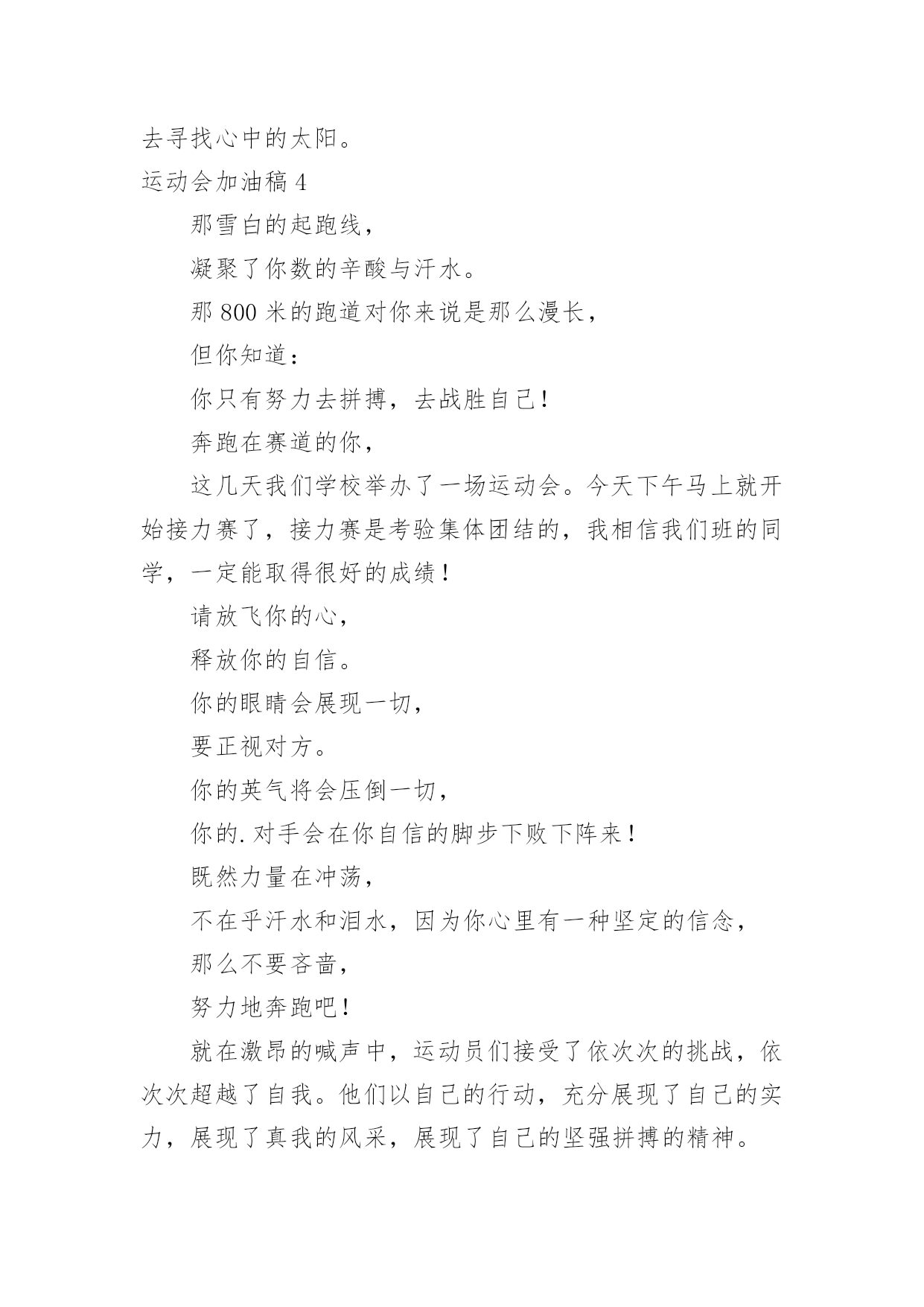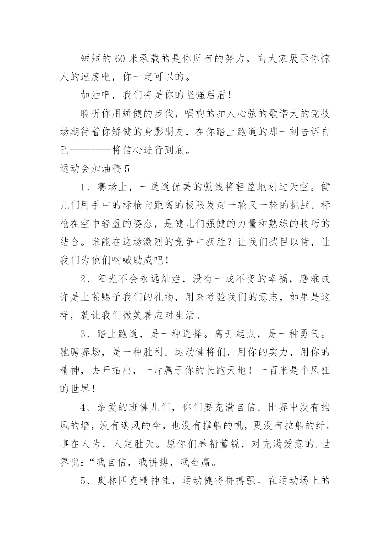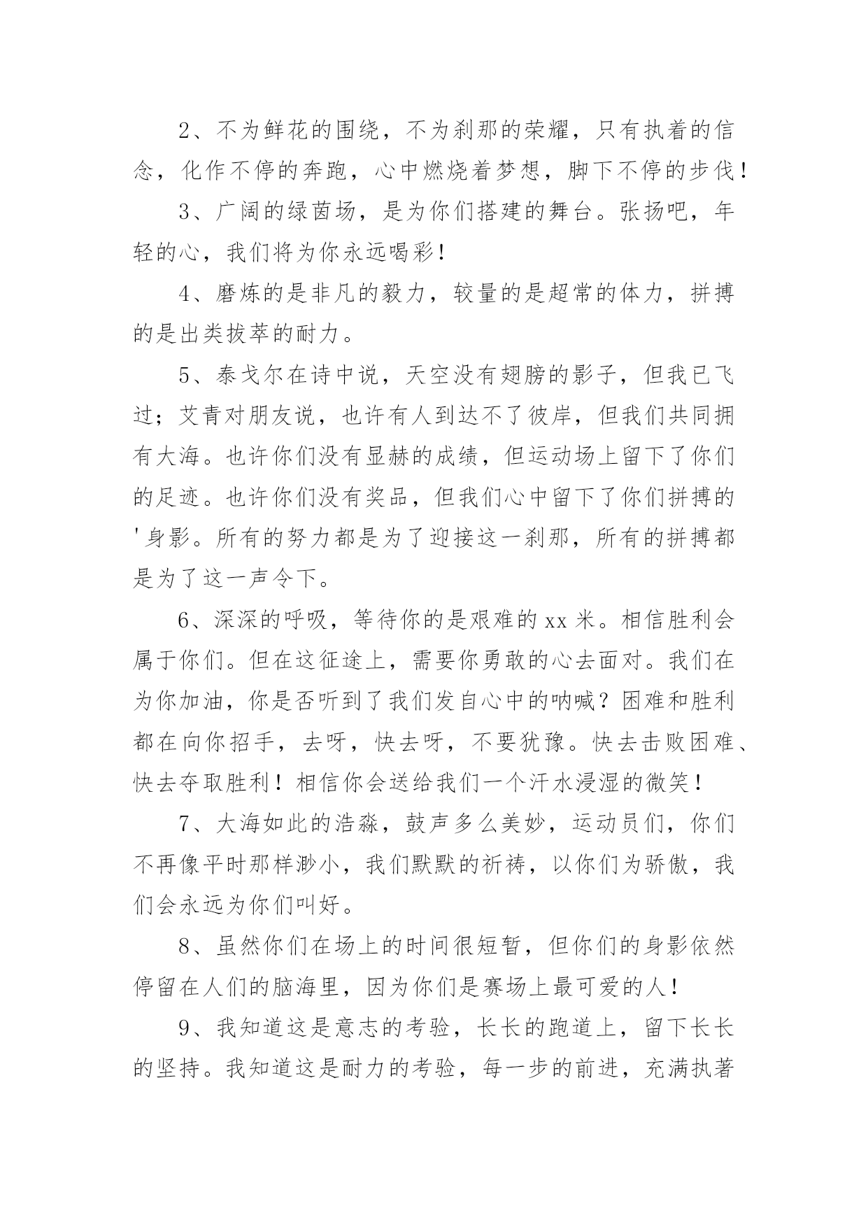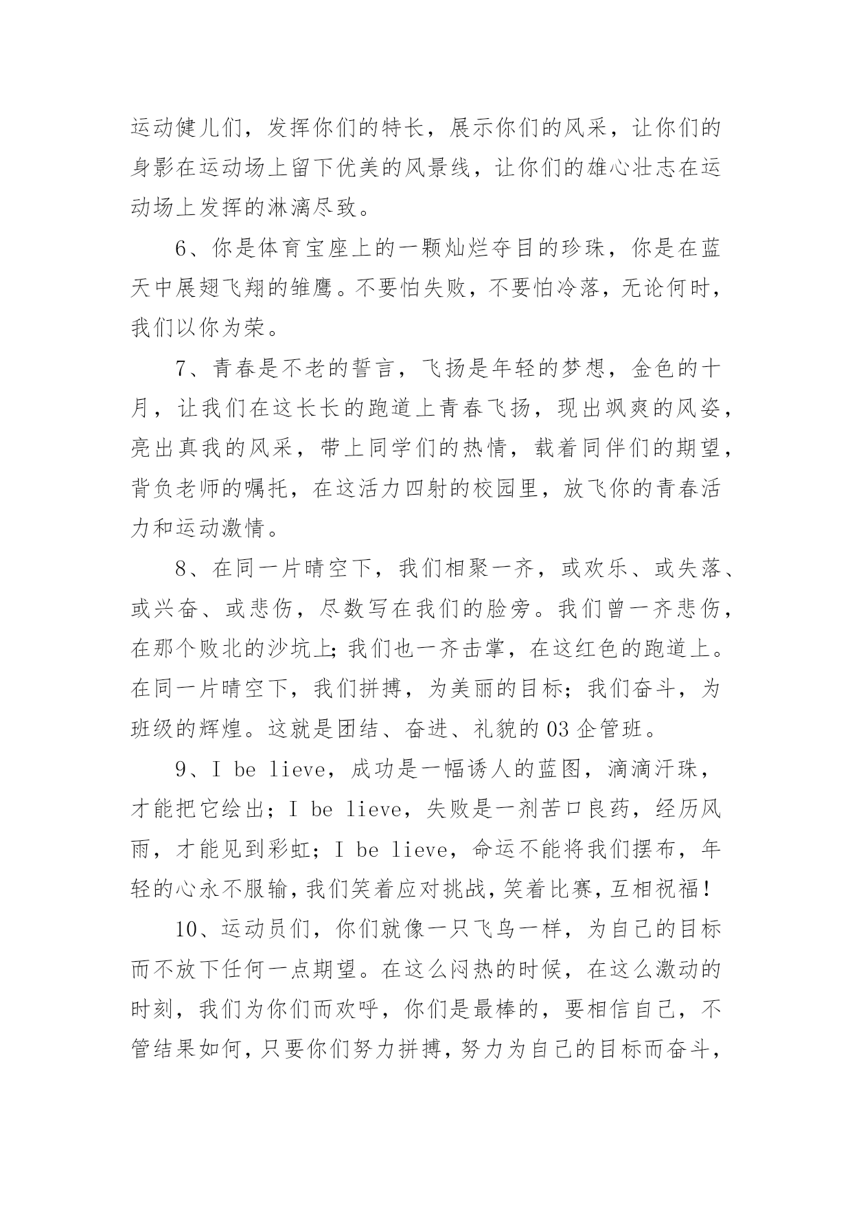 运动会加油稿运动会加油稿在学习、工作生活中,我们使用上加油稿的情况与日俱增,借助加油稿可以表达对对方的鼓励和支持。你知道加油稿怎样才能写的好吗?下面是小编收集整理的运动会加油稿,仅供参考,希望能够帮助到大家。运动会加油稿11.心中坚定的信念,脚下沉稳的步伐,你用行动告诉我们一个不变之理,没有走不完的路,没有过不了的山,成功正在终点冲着你高高的招手,用你那顽强的意志去努力,去迎接终点的鲜花与掌声,相信成功必须是属于你。2.你用行动述说着过城的重要,没有无尽的终点,没有无法攀登的险峰,希望载着终点在向你微笑,拼搏吧!经历是一种精彩,迸发你全部的能量,成功是你汗水的写照。3.虽然你们在场上的时间很短暂,但你们的身影依然停留在人们的脑海里,因为你们是赛场上最可爱的人。4.萧瑟的秋风,挡不住你们破竹的锐气。5.年轻的我们自信飞扬,青春的气息如同出生的朝阳,蓬勃的力量如同阳光的挥洒。此时此刻,跑道便是我们精彩的舞台,声声加油便是我们的奖项!论何成功,谈何荣辱,心中的信念只有一个:拼搏!6.坚定,执着,耐力与希望,在延伸的白色跑道中点点凝聚!力量,信念,拼搏与奋斗,在遥远的`终点线上渐渐明亮!时代的强音正在你的脚下踏响。7.温暖的阳光洒在赛场上,男子乙组标枪的比赛即将开始。赛场上,一道道优美的弧线将轻盈地划过天空。健儿们用手中的标枪向距离的权限发起一轮又一轮的挑战。标枪在空中轻盈的姿态,是健儿们强健的力量和熟练的技巧的结合。谁能在这场激烈的竞争中获胜?让我们拭目以待,让我们为他们呐喊助威吧!只有将力量与技巧合二为一的人,才能获得胜利的桂冠!8.人生的路,有坦途,也有坎坷,做过的岁月,有欢笑,也有苦涩,泪水告诉我一个跌倒的故事,汗水使我多了一份沉重,几多成熟。理想毕竟不一样于现实,失败是生活的一部分,谁也无法选择,无法抗拒,人生要自己去拼搏,去奋斗,在风雨中百折不饶勇往直前。流泪不是失落,徘徊不是迷惑,成功属于那些战胜失败,坚持不懈,勇于追求梦想的人。9.你是运动场的心脏,跳动梦想;你是漫长路的精神,激励辉煌;你们是将上下求索的人!风为你加油,云为你助兴,坚定,执着,耐力与希望,在延伸的白色跑道中点点凝聚!力量,信念,拼搏与奋斗,在遥远的终点线上渐渐明亮!时代的强音正在你的脚下踏响。10.看,终点就在眼前,听,同学为你呼喊。鼓起勇气奋力向前,用你的荣誉带给我们希望。11.你们挥舞着充满力量的双臂看着实心球化成美丽的弧线我着实在心里佩服你们你们抛出了自己的水平。12.虽然你们在场上的时间很短暂,但你们的身影依然停留在人们的脑海里,因为你们是赛场上最可爱的人。13.踏上跑道,是一种选择。离开起点,是一种勇气。驰骋赛场,是一种胜利。14.也许流星并不少见,但它燃烧的刹那,留给人间最美丽的回忆!也许笑脸并不少见,但胜利的喜悦,总会留给世界精彩的一瞬!是的,那些以前美妙的东西只有短短的一瞬间,但那却把最辉煌的一刻留给了人间。胜利,是每个人所追求的,胜利的喜悦,是胜利与重新开始的转折,胜利是新的开始!15.不长不短的距离,需要的是全身心全程投入,自始至终你们都在拼全力此时此刻,你们处在最风光的一刻,无论第几坚持胜利的信心,只要跑下来,你们就是英雄。16.时间在流逝,赛道在延伸,成功在你面前展现心脏的跳动,热血在沸腾,辉煌在你脚下铸就加油吧,健儿们。17.坚定,执着,耐力与希望,在延伸的白色跑道中点点凝聚!力量,信念,拼搏与奋斗,在遥远的终点线上渐渐明亮!时代的强音正在你的脚下踏响。18.运动健将们,用你的实力,用你的精神,去开拓出,一片属于你的长跑天地!19.你的汗水洒在跑道,浇灌着成功的花朵开放。你的欢笑飞扬在赛场,为班争光数你最棒。跑吧,追吧在这广阔的赛场上,你似骏马似离铉的箭。跑吧,追吧你比虎猛比豹强。20.这是意志的拼搏。这是速度的挑战。胜利在向你们招手,胜利在向你们呼唤。运动会加油稿2在起跑线上胡华港连续支付歌曲,攻击和铆钉你健美肌肉蕴含爆发力自信的眼神充满自信枪走火了你开始了一段短暂的旅程在笔直的`跑道上有你稳定的脚印离终点不远冲刺时会给你留下一个锋利的背部开始掌声将为你响起开始胜利和鲜花终将属于你运动会加油稿3夏日的操场,竟是如此美丽,美丽的几乎令人绝望。你蹲在起跑线上,每一块肌肉都固执得顶起,像一尊雕像。慢慢地、慢慢地、你抬起了头,坚毅的'目光中透出了贪婪,汗湿的发丝终于飞了起来。冲吧!冲吧!化作勇敢的苍鹰,去寻找心中的太阳。运动会加油稿4那雪白的起跑线,凝聚了你数的辛酸与汗水。那800米的跑道对你来说是那么漫长,但你知道:你只有努力去拼搏,去战胜自己!奔跑在赛道的你,这几天我们学校举办了一场运动会。今天下午马上就开始接力赛了,接力赛是考验集体团结的,我相信我们班的同学,一定能取得很好的成绩!请放飞你的心,释放你的自信。你的眼睛会展现