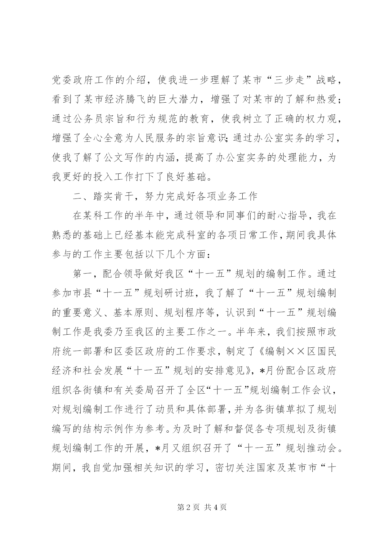 第PAGE\*Arabic\*MERGEFORMAT4页共NUMPAGES\*MERGEFORMAT4页公务员上半年个人总结转眼我到单位工作已经半年了。这半年是我人生旅途中的重要一程,期间在领导的培养帮助、同志们的关心支持下我逐步完成着从象牙塔到政府机关、从大学生到国家公务员这种环境和角色的双重转变和适应。岁首年终,我静心回顾这半年的工作生活,收获颇丰。现将我这半年来的学习工作情况总结如下:一、自觉加强理论学习,提高个人素质首先,自觉加强政治理论学习,提高党性修养。两委浓厚的政治学习氛围深深的感染着我,我积极参加委内组织的各项学习活动,并注重自学,认真学习了胡锦涛在邓小平诞辰百年纪念大会上的讲话、胡锦涛七一重要讲话、十六届四中全会关于加强党的执政能力的决定等,进一步提高了自己的理论水平与政治素质,保证了自己在思想上和党保持一致性,强化了廉洁自律的自觉性。其次,在业务学习方面,我虚心向身边的同事请教,通过多看多听多想多问多做,努力使自己在尽短的时间内熟悉工作环境和内容。同时,我还自觉学习某市企业投资项目备案、核准暂行管理办法、行政许可法等与工作相关的政策、法律常识,积累自己的业务知识。此外,根据组织安排我参加了某市公务员初任培训。在为期三周的培训生活中,严格的军训磨练了我的意志,丰富的课程学习使我的知识储备和层次得到了提高。通过某市经济发展状况及党委政府工作的介绍,使我进一步理解了某市“三步走”战略,看到了某市经济腾飞的巨大潜力,增强了对某市的了解和热爱;通过公务员宗旨和行为规范的教育,使我树立了正确的权力观,增强了全心全意为人民服务的宗旨意识;通过办公室实务的学习,使我了解了公文写作的内涵,提高了办公室实务的处理能力,为我更好的投入工作打下了良好基础。二、踏实肯干,努力完成好各项业务工作在某科工作的半年中,通过领导和同事们的耐心指导,我在熟悉的基础上已经基本能完成科室的各项日常工作,期间我具体参与的工作主要包括以下几个方面:第一,配合领导做好我区“十一五”规划的编制工作。通过参加市县“十一五”规划研讨班,我了解了“十一五”规划编制的重要意义、基本原则、规划程序等,认识到“十一五”规划编制工作是我委乃至我区的主要工作之一。半年来,我们按照市政府统一部署和区委区政府的工作要求,制定了《编制××区国民经济和社会发展“十一五”规划的安排意见》,*月份配合区政府组织各街镇和有关委局召开了全区“十一五”规划编制工作会议,对规划编制工作进行了动员和具体部署,并为各街镇草拟了规划编写的结构示例作为参考。为及时了解和督促各专项规划及街镇规划编制工作的开展,*月又组织召开了“十一五”规划推动会。期间,我自觉加强相关知识的学习,密切关注国家及某市市“十一五”规划的政策理论和进展动态,收集学习我区及兄弟县市“十五”计划的成功经验,为专向规划的编制单位提供依据和素材,同时通过学习调研、听取和参与领导们关于规划的讨论,使我逐渐加深了对我区整体状况的了解,为我处理其他工作奠定了基础。第二,做好全区各类固定资产投资项目的汇总上报工作。今年8月份以来,根据市发改委下发的通知要求,我科积极开展工作,布置并督促各街镇及相关委局进行调查汇报,根据各单位的汇报情况,我们先后对我区汽车零部件企业基本情况和项目情况、工业投资1000万以上的项目等进行了核实、汇总、筛选、上报。这些工作加深了我对我区固定资产投资状况的了解,同时加强了我区固定资产投资项目的储备,也为我区“十一五”规划提供了强大的项目支撑。第三,发挥科室职能,做好项目审批和管理工作。通过科长的指导,我逐步掌握了固定资产投资项目的审批程序和处理方法,了解了经济服务中心计委窗口的工作职能。今年以来,我们共审批各类建设项目××*个,总投资××*亿元,建筑面积××*万平方米。第四,配合科室做好各项文字写作和信息报送工作。半年来,我先后参与起草了《××区农村经济工作座谈会议材料》、《××区服务业发展情况汇报材料》、《某科2005年工作要点》等多篇文章。我从8月份开始担任科室信息员,负责根据科室的重点工作和突出事件撰写信息。在科长的指导下,我先后完成了我区召开“十一五”规划编制工作会议、××项目获得国债资金支持、××项目获得市服务业引导资金支持等多篇信息,在此过程中逐渐提高了自己的事件敏感度和文字写作能力。第五,协助科室同事完成2003年计划科和投资科的固定资产投资项目审批资料的整理、归档、定卷工作。第六,完成好领导交办其他各项基础性和临时性工作。半年来,我在学习和工作中逐步成长、成熟,但我清楚自身还有很多不足,比如工作能力和创新意识不足、政治理论水平有待提高等。今后我将努力做到以下几点,希望领导和同志们对我进行监督指导:1、自觉加强学习,向理公务员上半年个人总结公务员上半年个人总结论学习,向专业