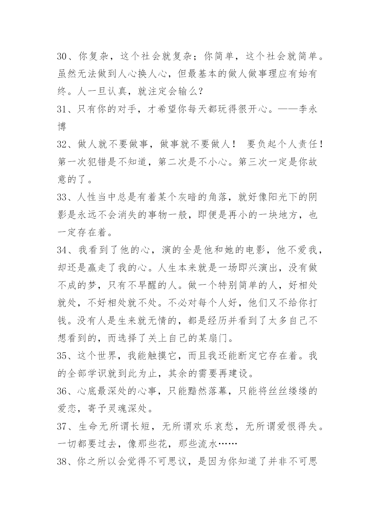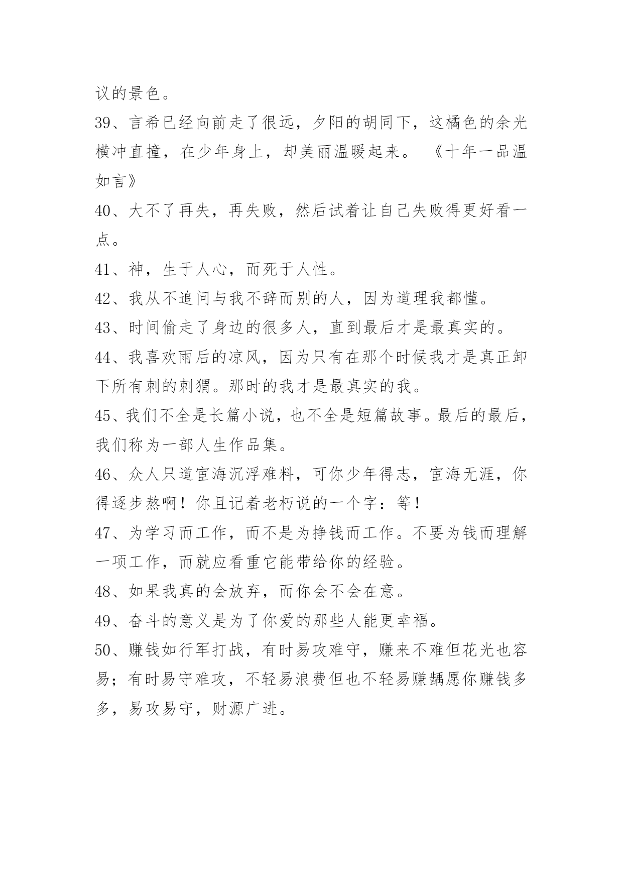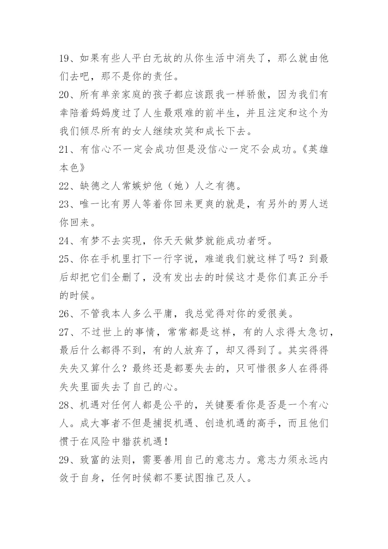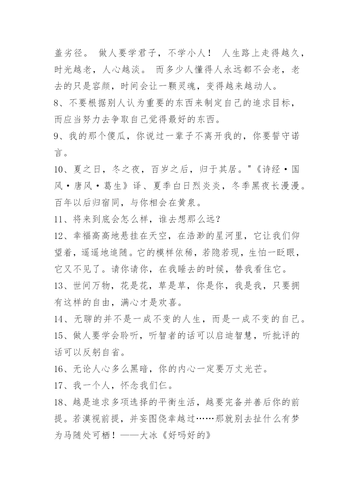 经典的励志语录50条【热门】2023年经典的励志语录汇编50条对于生活理想,应该象宗教徒对待宗教一样充满虔诚与热情!下面是小编精心准备的经典的励志语录50条,仅供参考,希望能够帮助到大家。1、一个人漫步在街道,默默的,静静的,一个人久了,一切习惯都会是新的。我,一个人。2、最理想的生活状态:有三五个志同道合的朋友,有爱的人,生活在一个自己喜欢的城市,有可以为之拼搏努力的事业,并且自由自在,靠自己,简单且纯粹。3、我不是随便的花朵,我要为梦想而绽放。4、我知道我只是你生命中的过客,我却还在奢望你的温柔。5、秋天的夜,有一点微凉,却丝毫没有睡意,我习惯在睡觉前泡一杯绿茶,看着茶叶在杯中翻腾,飘出淡淡的茶香沁人心肺,看着茶叶在杯中浮沉,茶色的变化,喝一口,细细的品味着茶味的苦涩甘甜,体悟着人生的浮生得失、起伏,荣辱,品淡人世的苦乐、炎凉。6、风经过耳边有些疼那种感觉我还记得。7、一个人可以不用长得太好看,懂太多事,明白哪只手夹雪茄更迷人,对所有红酒的年份倒背如流,但你得有自己的气场,这很重要。君子泰然自若,不会骄傲;小人骄傲自满,不能泰然。良好素质使人宠辱不惊;不良习性使人难盖劣径。做人要学君子,不学小人!人生路上走得越久,时光越老,人心越淡。而多少人懂得人永远都不会老,老去的只是容颜,时间会让一颗灵魂,变得越来越动人。8、不要根据别人认为重要的东西来制定自己的追求目标,而应当努力去争取自己觉得最好的东西。9、我的那个傻瓜,你说过一辈子不离开我的,你要誓守诺言。10、夏之日,冬之夜,百岁之后,归于其居。"《诗经·国风·唐风·葛生》译、夏季白日烈炎炎,冬季黑夜长漫漫。百年以后归宿同,与你相会在黄泉。11、将来到底会怎么样,谁去想那么远?12、幸福高高地悬挂在天空,在浩渺的星河里,它让我们仰望着,遥遥地追随。它的模样依稀,若隐若现,生怕一眨眼,它又不见了。请你请你,在我睡去的时候,替我看住它。13、世间万物,花是花,草是草,你是你,我是我,只要拥有这样的自由,满心才是欢喜。14、无聊的并不是一成不变的人生,而是一成不变的自己。15、做人要学会聆听,听智者的话可以启迪智慧,听批评的话可以反躬自省。16、无论人心多么黑暗,你的内心一定要万丈光芒。17、我一个人,怀念我们仨。18、越是追求多项选择的平衡生活,越要完备并善后你的前提。若漠视前提,并妄图侥幸越过……那就别去扯什么有梦为马随处可栖!——大冰《好吗好的》19、如果有些人平白无故的从你生活中消失了,那么就由他们去吧,那不是你的责任。20、所有单亲家庭的孩子都应该跟我一样骄傲,因为我们有幸陪着妈妈度过了人生最艰难的前半生,并且注定和这个为我们倾尽所有的女人继续欢笑和成长下去。21、有信心不一定会成功但是没信心一定不会成功。《英雄本色》22、缺德之人常嫉妒他(她)人之有德。23、唯一比有男人等着你回来更爽的就是,有另外的男人送你回来。24、有梦不去实现,你天天做梦就能成功者呀。25、你在手机里打下一行字说,难道我们就这样了吗?到最后却把它们全删了,没有发出去的时候这才是你们真正分手的时候。26、不管我本人多么平庸,我总觉得对你的爱很美。27、不过世上的事情,常常都是这样,有的人求得太急切,最后什么都得不到,有的人放弃了,却又得到了。其实得得失失又算什么?最终还是都要失去的,只可惜很多人在得得失失里面失去了自己的心。28、机遇对任何人都是公平的,关键要看你是否是一个有心人。成大事者不但是捕捉机遇、创造机遇的高手,而且他们惯于在风险中猎获机遇!29、致富的法则,需要善用自己的意志力。意志力须永远内敛于自身,任何时候都不要试图推己及人。30、你复杂,这个社会就复杂;你简单,这个社会就简单。虽然无法做到人心换人心,但最基本的做人做事理应有始有终。人一旦认真,就注定会输么?31、只有你的对手,才希望你每天都玩得很开心。——李永博32、做人就不要做事,做事就不要做人!要负起个人责任!第一次犯错是不知道,第二次是不小心。第三次一定是你故意的了。33、人性当中总是有着某个灰暗的角落,就好像阳光下的阴影是永远不会消失的事物一般,即便是再小的一块地方,也一定存在着。34、我看到了他的心,演的全是他和她的电影,他不爱我,却还是赢走了我的心。人生本来就是一场即兴演出,没有做不成的梦,只有不早醒的人。做一个特别简单的人,好相处就处,不好相处就不处。不必对每个人好,他们又不给你打钱。没有人是生来就无情的,都是经历并看到了太多自己不想看到的,而选择了关上自己的某扇门。35、这个世界,我能触摸它,而且我还能断定它存在着。我的全部学识就到此为止,其余的需要再建设。36、心底最深处的心事,只能黯然落幕,只能将丝丝缕缕的爱恋,寄予灵魂深处。37、生命无所谓长短,无所谓欢乐哀愁,无所谓爱恨得失。一切都要过去,像那些花,那些流