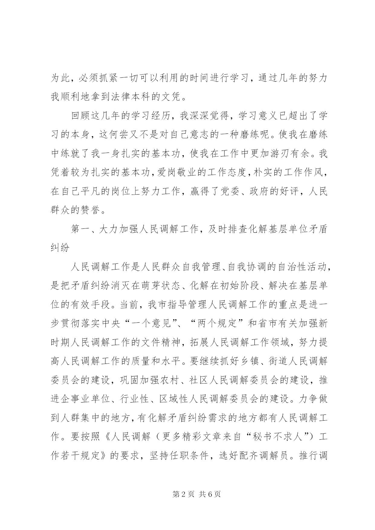 第PAGE\*Arabic\*MERGEFORMAT6页共NUMPAGES\*MERGEFORMAT6页司法行政干部培训汇报体会材料运用行政多种职能手段构建和谐社会党的十六届四中全会《决定》着眼于实现我国经济社会协调发展、着眼于党和国家长治久安,提出了构建社会主义和谐社会这一新概念。司法行政机关担负的法律宣传教育、法律服务、法律保障三大职能是社会治安综合治理的重要组成部分,特别是指导管理人民调解工作、普法依法治理工作、法律援助工作、法律服务工作、对违法犯罪人员的教育改造工作和刑释解教人员安置帮教工作以及社区矫正工作等是保障基层社会稳定的重要工作。司法行政机关在构建社会主义和谐社会工作中责任重大,义不容辞。作为一名科长,我认为做好基层行政工作必须具备两个条件:一是爱岗敬业的工作态度司法所面向群众,贴近基层,工作琐碎繁杂,必须具备爱岗敬业的工作态度,才能做好基层司法行政工作。近年来,周口店镇改革发展不断加快,随之引发的矛盾日益复杂、频繁。为妥善解决好各类矛盾纠纷,必须本着维护团结稳定的大局,对党和人民负责、对事业负责、对本地区经济社会发展负责的态度和精神,才能真正把工作做好,为党委、政府分忧,为群众解决问题。二是扎实过硬的基本功作为一名司法所长,没有一身扎实的基本功是很难胜任的。为此,必须抓紧一切可以利用的时间进行学习,通过几年的努力我顺利地拿到法律本科的文凭。回顾这几年的学习经历,我深深觉得,学习意义已超出了学习的本身,这何尝又不是对自己意志的一种磨练呢。使我在磨练中练就了我一身扎实的基本功,使我在工作中更加游刃有余。我凭着较为扎实的基本功,爱岗敬业的工作态度,朴实的工作作风,在自己平凡的岗位上努力工作,赢得了党委、政府的好评,人民群众的赞誉。第一、大力加强人民调解工作,及时排查化解基层单位矛盾纠纷人民调解工作是人民群众自我管理、自我协调的自治性活动,是把矛盾纠纷消灭在萌芽状态、化解在初始阶段、解决在基层单位的有效手段。当前,我市指导管理人民调解工作的重点是进一步贯彻落实中央“一个意见”、“两个规定”和省市有关加强新时期人民调解工作的文件精神,拓展人民调解工作领域,努力提高人民调解工作的质量和水平。要继续抓好乡镇、街道人民调解委员会的建设,巩固加强农村、社区人民调解委员会的建设,推进企事业单位、行业性、区域性人民调解委员会的建设。力争做到人群集中的地方,有化解矛盾纠纷需求的地方都有人民调解工作。要按照《人民调解(更多精彩文章来自“秘书不求人”)工作若干规定》的要求,坚持任职条件,选好配齐调解员。推行调解员持证上岗、首席调解员制度。要总结人民调解庭和调解小分队建设及开展工作的经验,适应人民调解与诉讼制度相衔接的要求,提高人民调解协议的规范化水平。要加强矛盾纠纷的排查调处,在积极调解传统的常见性、多发性纠纷的基础上,对公民与法人、公民与其他社会组织的矛盾纠纷,特别是对社会热点难点纠纷和群体性矛盾纠纷,人民调解组织要充分发挥调处功能、法制宣传教育功能、矛盾纠纷预防功能和信息报告功能。要积极介入诸如因城市拆迁、农村征地、企业改制、民工工资等引发的群体性事件、重大事件的调处,全力把矛盾纠纷消除在萌芽状态,解决在基层单位。要通过提高调解率、调解成功率和协议履行率,提高人民调解的社会公信力。第二、加大基层普法依法治理工作力度,从源头上预防和减少矛盾纠纷基层普法依法治理工作是社会治安综合治理的基础工作。要进一步加强农村基层民主法治建设,抓好“民主法治示范村”创建活动。要抓好社区民主法治建设,继续推进“法律进社区”工作,落实“五个一”要求。要大力开展宪法以及对人民群众生产、生活有直接指导意义和密切关系的法律法规的宣传,教育公民遵纪守法,尊重社会公德。要加强完善社会主义市场经济体制的法律法规宣传力度,提高企业经营管理者依法管理、依法经营、依法维权的能力和水平。要抓好青少年法制宣传教育基地建设,进一步加强未成年人的法制宣传教育,提高青少年分辨是非善恶的能力。要做好行政复议、申诉等合法解决纠纷方法的宣传工作,使群众了解、掌握和选择正确的诉求表达方式,预防和减少群体上访、进京上访、越级上访事件发生。第三、进一步加强法律服务和法律援助工作,引导公民和法人通过合法途径解决矛盾纠纷法律服务和法律援助工作能够有力促进矛盾纠纷的正确及时解决。要进一步规范和拓展法律服务,不断提高服务质量,为公民和法人处理各类纠纷提供优质高效的法律服务,实现法律服务的政治效果、社会效果和法律效果的有机统一。要努力解决“群众打官司难”的问题,促进各类矛盾纠纷通过合法途径解决。积极开展法律服务进社区,方便居民的法律服务需求;引导基层法律工作者为农民群众提供方便、快捷的法律服务。法律援助要继续做好“建网、扩面、提质、解热”的工作。“建网”就是要按照“三有”标准抓好