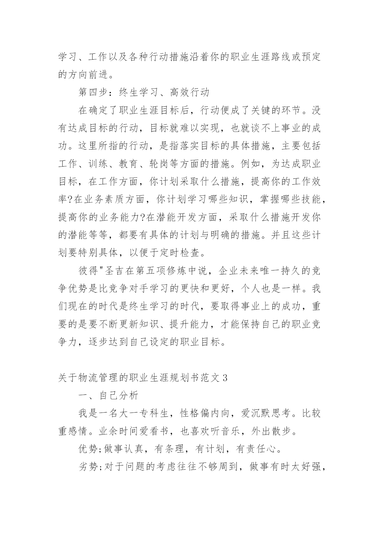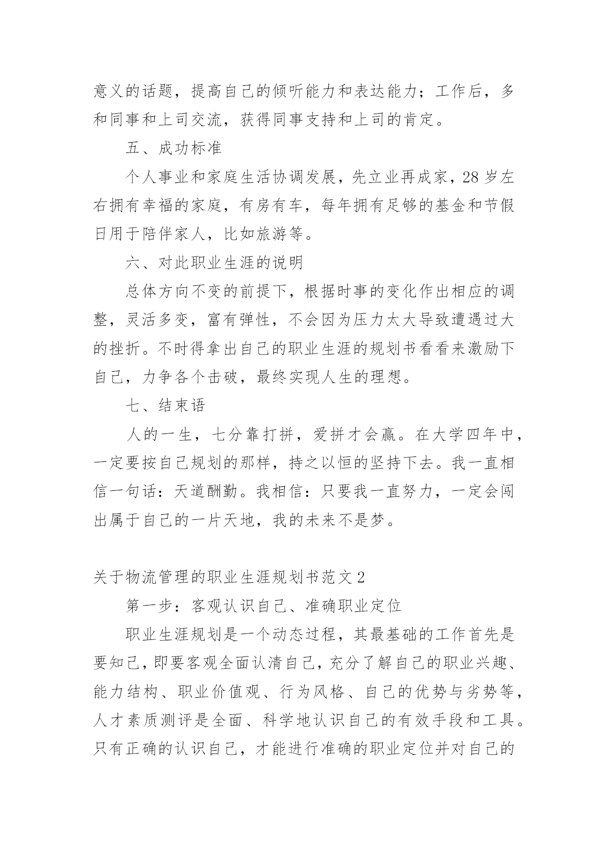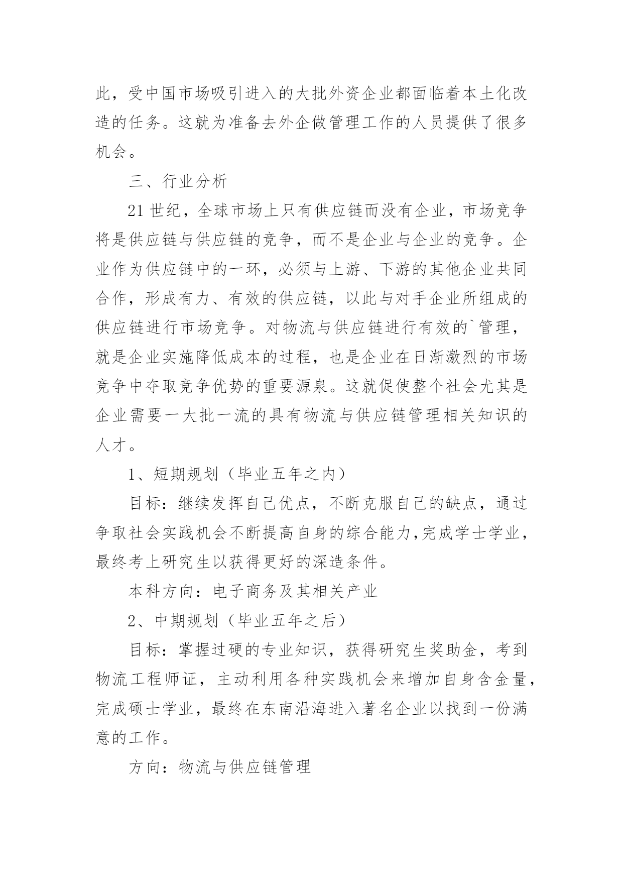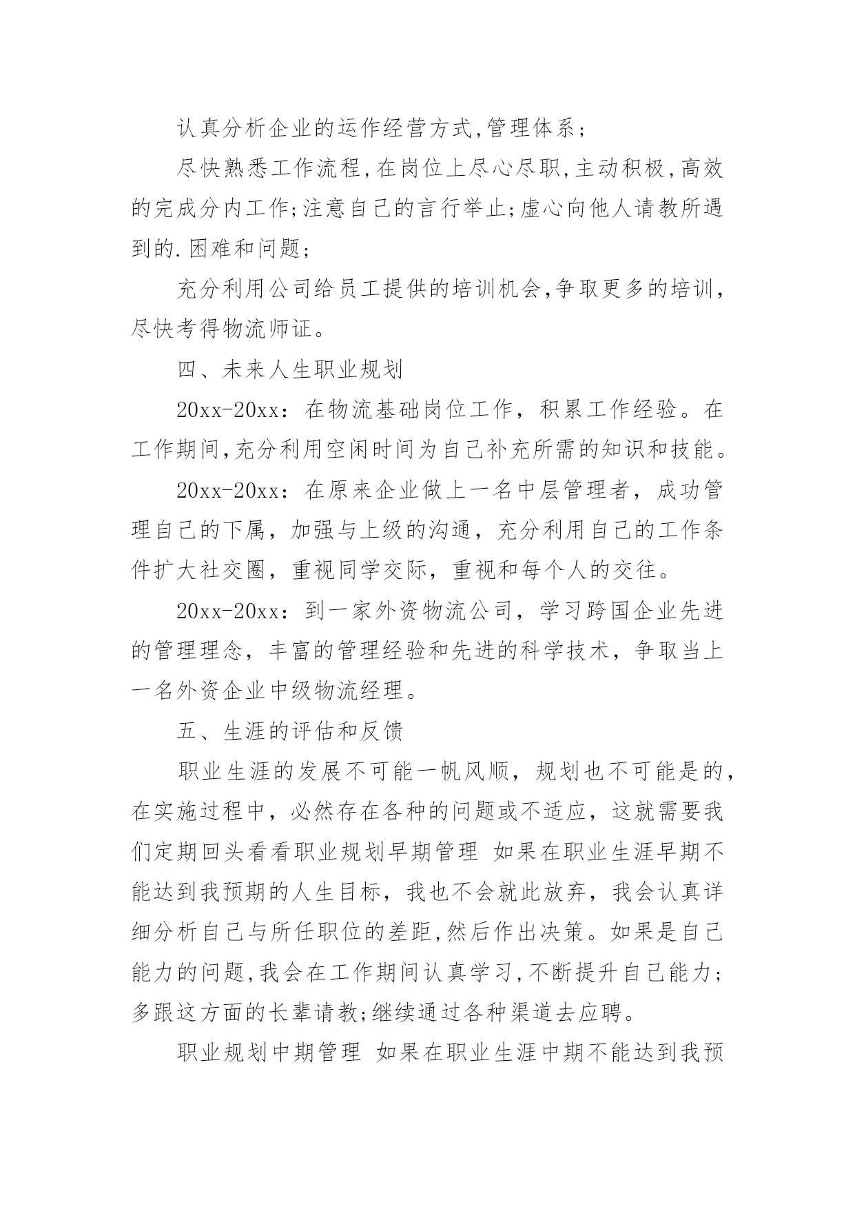 物流管理的职业生涯规划书关于物流管理的职业生涯规划书范文9篇时间就如同白驹过隙般的流逝,我们又有了新的工作,请好好规划今后的职业发展道路。那么你真正懂得怎么写好职业规划吗?下面是小编精心整理的关于物流管理的职业生涯规划书范文,仅供参考,大家一起来看看吧。关于物流管理的职业生涯规划书范文1有人说,21世纪是属于中国的世纪。而在21世纪上半叶,将是我们当代大学生一展身手的黄金时期。但是,如果我们缺乏必要的就业前的职业生涯规划,缺少就业的前瞻,将有可能使我们在以后的就业中产生失落感。因此,我们在学习过程中就应该做好职业规划,为将来的求职做好准备。一个人的大学时光一生中只有一次。少壮不努力,老大徒伤悲。与其浑浑噩噩地消磨掉四年的光阴,不如抓紧时间为自己充电,然而光有决心是远远不够的,只有有了具体的规划,才能把握好目标与方向,才能时时鞭策自己。为了更有效的完成走向社会前的学习,把握好自己的未来,我也拟订了一份自己的大学生涯规划,以时时激励自己奋发前行:一、自己盘点1、基本情况1、兴趣爱好:喜欢运动、音乐、看一些励志书籍、交友、逛街等。2、优点:学习和适应能力强,勤于思考,做事仔细、认真、塌实和负责,积极主动性强,时间观念强,自信心强,考虑问题深入而全面,待人友善。3、缺点:性格偏内向,交际能力一般,做事过于执着顽固,有点保守缺乏足够的冒险精神,办事略显急噪,有点惰性。4、生活教训:少一点抱怨,多做点实事。二、社会环境和职业分析1、社会总体环境在科技发展迅速、全球经济一体化的环境中,我国政治稳定,经济持续稳定发展,对全球经济发展扮演着越来越重要的角色,特别是在加入WTO之后,跨国企业不断涌入中国市场,促使我国企业不段提高自身竞争力,力争走出国门“国内市场国际化、国际竞争国内化”的新竞争格局已经形成。然而企业之间的竞争归根到底是人才的竞争,这就促使了人才竞争日趋激烈化,于是怎样在社会竞争中处与不败之地,成了当今求职者必须面对和解决的问题。2、管理职业分析中国的管理科学发展较晚,且管理知识大部分源于国外,中国的企业管理还有许多不完善的地方。中国急需管理人才,尤其是经过系统培训的高级管理人才。因此企业管理职业市场广阔。同时要在中国发展企业,必须要适合中国的国情,这就要求管理的科学性与艺术性和环境动态适应相结合。因此,受中国市场吸引进入的大批外资企业都面临着本土化改造的任务。这就为准备去外企做管理工作的人员提供了很多机会。三、行业分析21世纪,全球市场上只有供应链而没有企业,市场竞争将是供应链与供应链的竞争,而不是企业与企业的竞争。企业作为供应链中的一环,必须与上游、下游的其他企业共同合作,形成有力、有效的供应链,以此与对手企业所组成的供应链进行市场竞争。对物流与供应链进行有效的`管理,就是企业实施降低成本的过程,也是企业在日渐激烈的市场竞争中夺取竞争优势的重要源泉。这就促使整个社会尤其是企业需要一大批一流的具有物流与供应链管理相关知识的人才。1、短期规划(毕业五年之内)目标:继续发挥自己优点,不断克服自己的缺点,通过争取社会实践机会不断提高自身的综合能力,完成学士学业,最终考上研究生以获得更好的深造条件。本科方向:电子商务及其相关产业2、中期规划(毕业五年之后)目标:掌握过硬的专业知识,获得研究生奖助金,考到物流工程师证,主动利用各种实践机会来增加自身含金量,完成硕士学业,最终在东南沿海进入著名企业以找到一份满意的工作。方向:物流与供应链管理3、长期规划(工作10年以后)开设自己的公司企业,利用边境贸易的优势条件尽可能迅速的溶入并占领一定份额市场,并通过各种关系尽量快而全面的理通各直属上头部门,不能让自己的事业死在一些没有防备的意外上面,使得公司步入正轨,开始大面积赢利,同时考察国外市场,使自己的公司尽量打入东南亚市场,并开始着手对跨国工厂或公司的打造。4、晚期规划通过不断加强自身修养和持之以恒地学习,且学习的内容必须聚焦,力争在管理的某个方面成为专家,塑造个人竞争力最终形成知识创新。使自己的职业转型,如担任培训师、管理咨询师、学术专家等职业。四、改进自身的举措1、教育培训在校学习期间,不断补充自己所需要的知识和技能,获取相关职业资格证书;工作期间充分利用学习培训机会并争取更多,不断给自己充电去适应新事物。2、实践锻炼养成良好的生活、学习、饮食习惯;锻炼自身的注意力以及做事情时的关注度;加强自身修养,提高自己的交际能力,扩大交际圈,重视同学交际圈、重视和每个人的交往,不论身份贵贱和亲疏程度。3、讨论交流在校期间,多和老师、同学、朋友交流讨论一些有实际意义的话题,提高自己的倾听能力和表达能力;工作后,多和同事和上司交流,获得同事支持和上司的肯定。五、成功标准个人事业和家庭生活协调发展,先立业再成家,28岁左右拥有幸福的家庭,有房有车,每年拥有