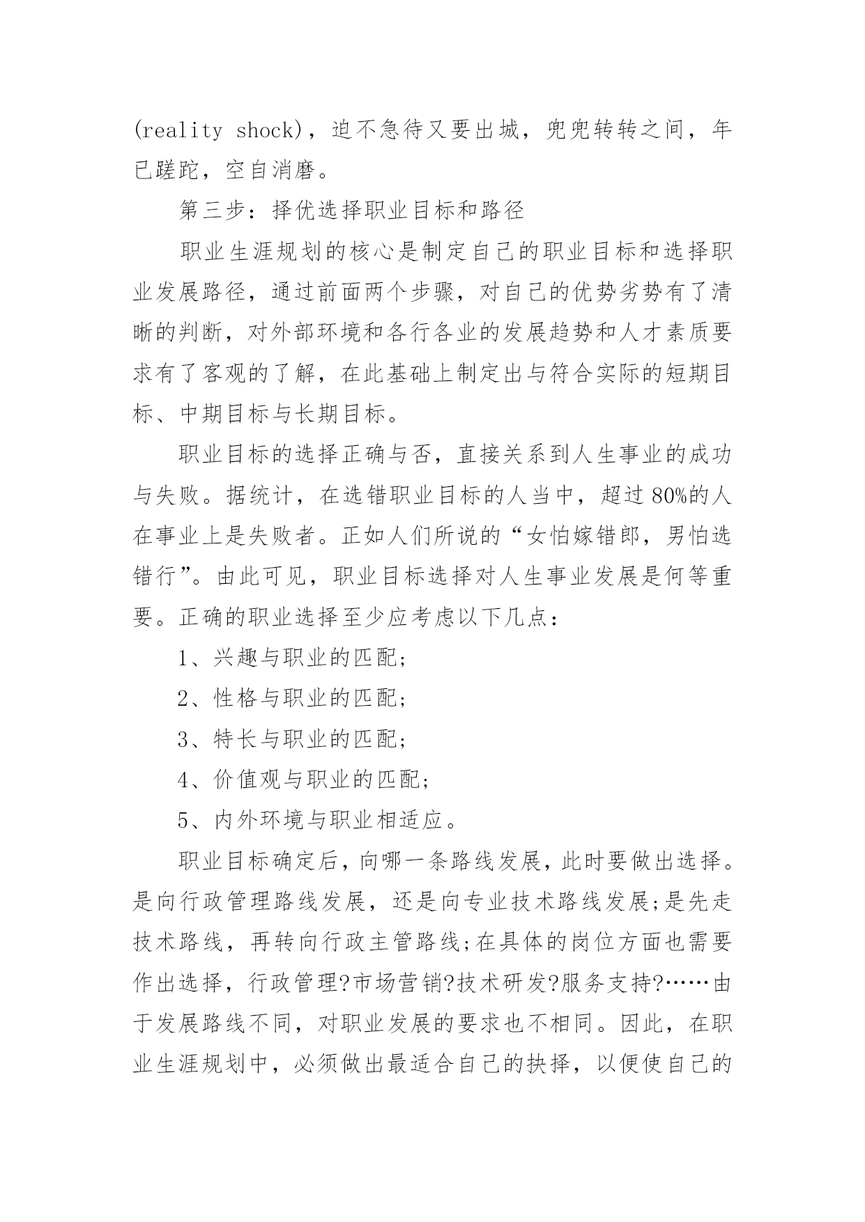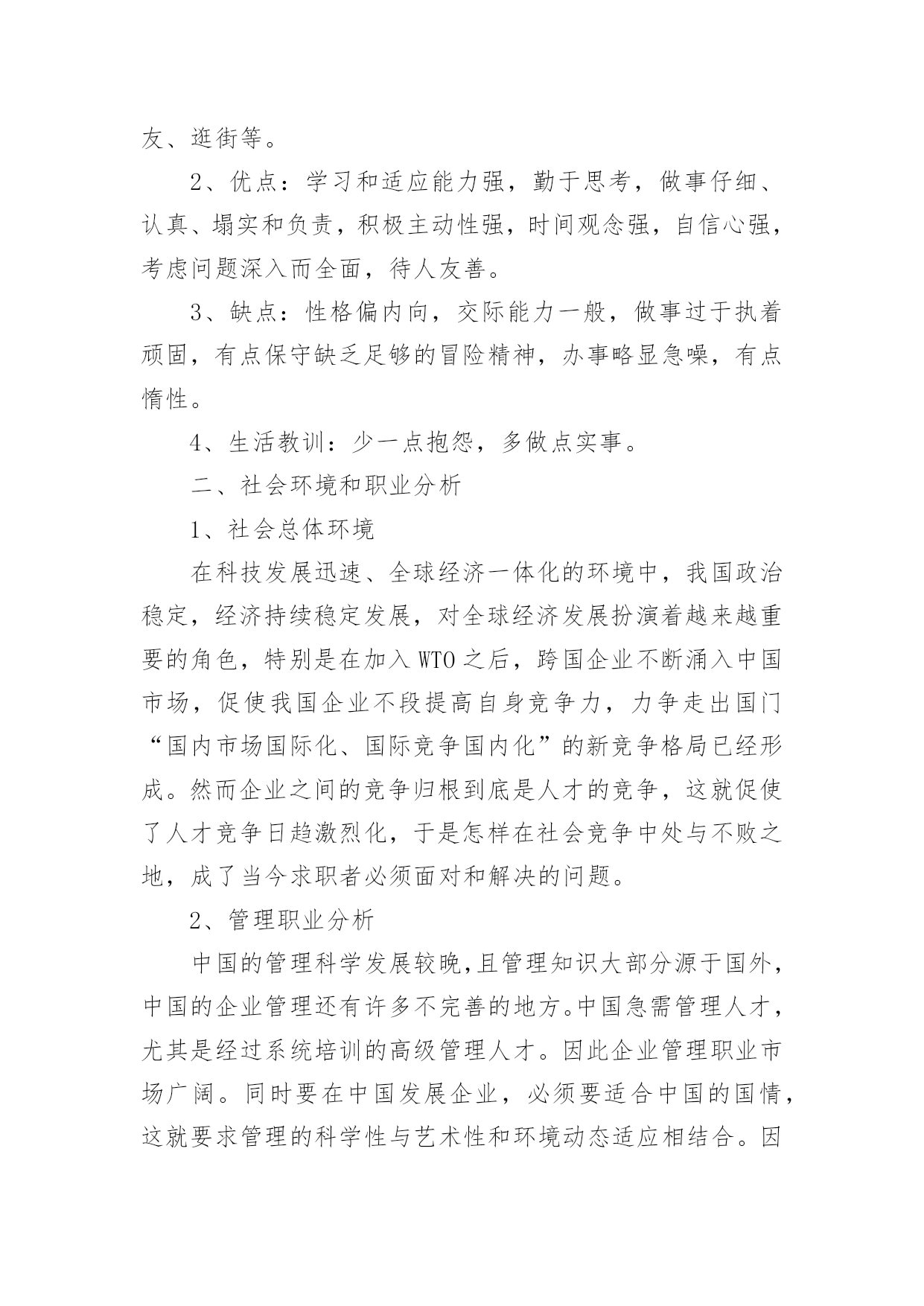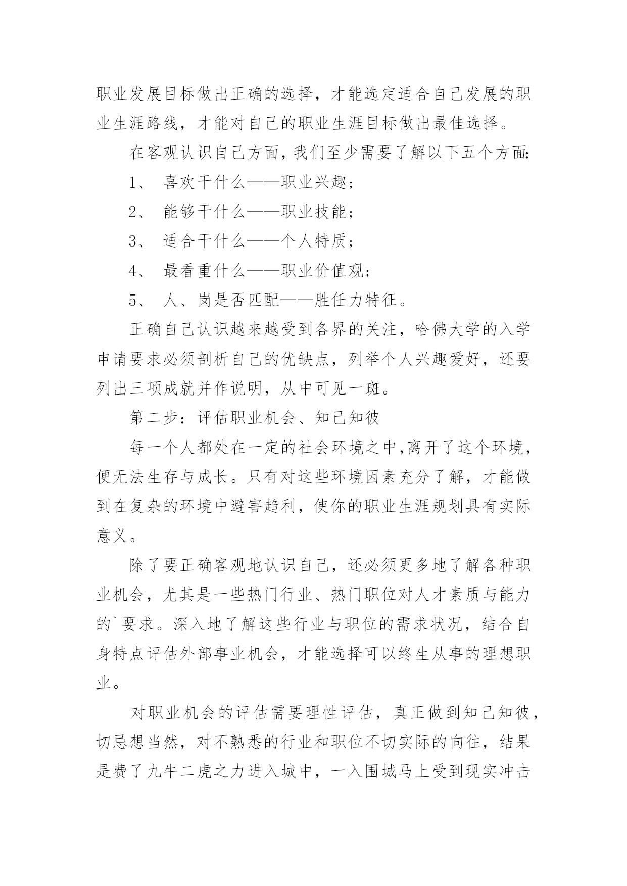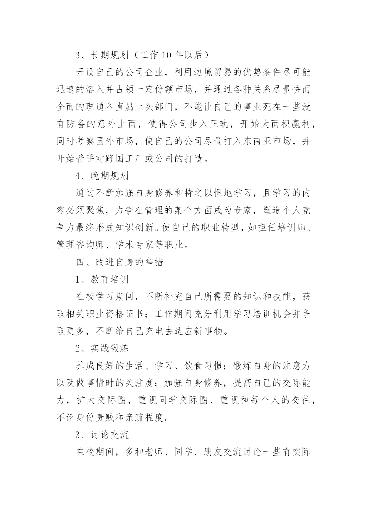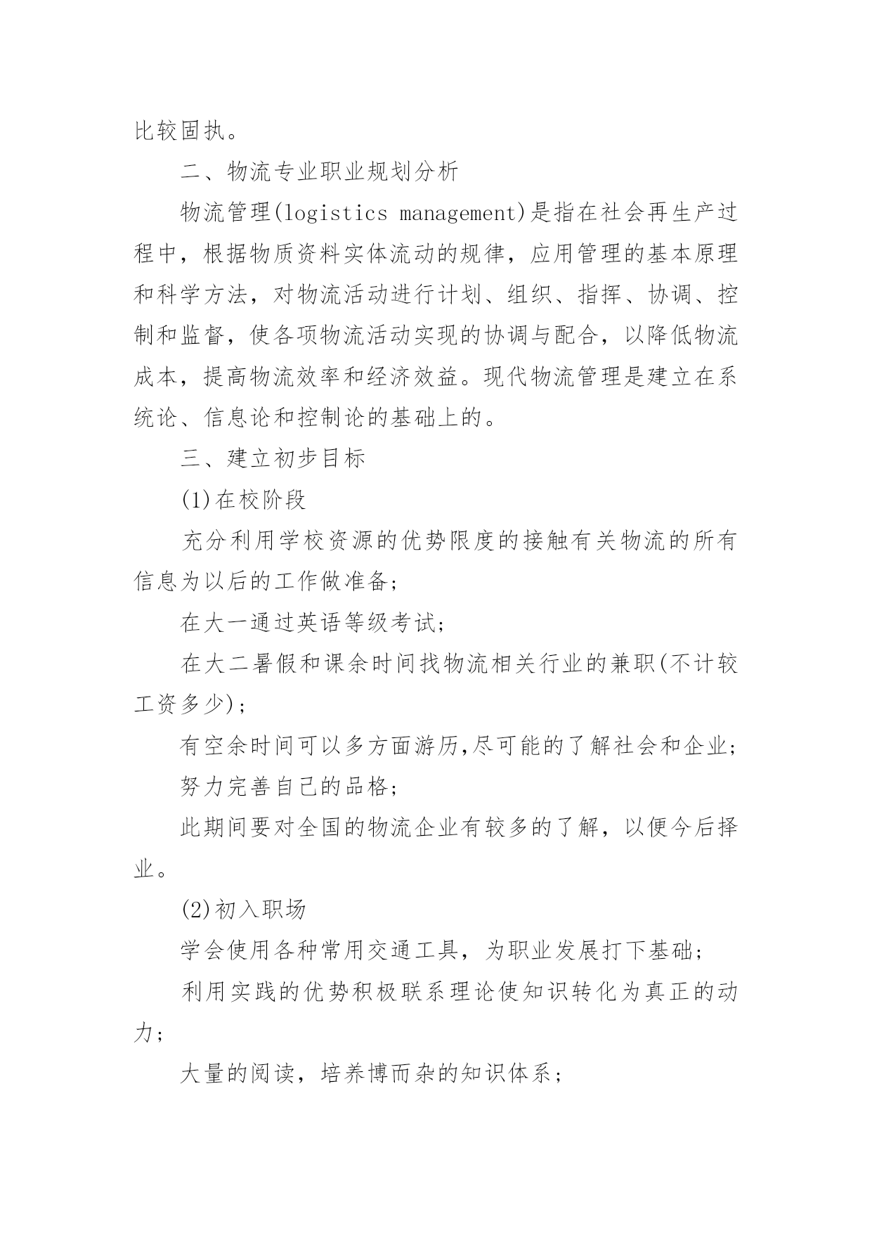 物流管理的职业生涯规划书关于物流管理的职业生涯规划书范文9篇时间就如同白驹过隙般的流逝,我们又有了新的工作,请好好规划今后的职业发展道路。那么你真正懂得怎么写好职业规划吗?下面是小编精心整理的关于物流管理的职业生涯规划书范文,仅供参考,大家一起来看看吧。关于物流管理的职业生涯规划书范文1有人说,21世纪是属于中国的世纪。而在21世纪上半叶,将是我们当代大学生一展身手的黄金时期。但是,如果我们缺乏必要的就业前的职业生涯规划,缺少就业的前瞻,将有可能使我们在以后的就业中产生失落感。因此,我们在学习过程中就应该做好职业规划,为将来的求职做好准备。一个人的大学时光一生中只有一次。少壮不努力,老大徒伤悲。与其浑浑噩噩地消磨掉四年的光阴,不如抓紧时间为自己充电,然而光有决心是远远不够的,只有有了具体的规划,才能把握好目标与方向,才能时时鞭策自己。为了更有效的完成走向社会前的学习,把握好自己的未来,我也拟订了一份自己的大学生涯规划,以时时激励自己奋发前行:一、自己盘点1、基本情况1、兴趣爱好:喜欢运动、音乐、看一些励志书籍、交友、逛街等。2、优点:学习和适应能力强,勤于思考,做事仔细、认真、塌实和负责,积极主动性强,时间观念强,自信心强,考虑问题深入而全面,待人友善。3、缺点:性格偏内向,交际能力一般,做事过于执着顽固,有点保守缺乏足够的冒险精神,办事略显急噪,有点惰性。4、生活教训:少一点抱怨,多做点实事。二、社会环境和职业分析1、社会总体环境在科技发展迅速、全球经济一体化的环境中,我国政治稳定,经济持续稳定发展,对全球经济发展扮演着越来越重要的角色,特别是在加入WTO之后,跨国企业不断涌入中国市场,促使我国企业不段提高自身竞争力,力争走出国门“国内市场国际化、国际竞争国内化”的新竞争格局已经形成。然而企业之间的竞争归根到底是人才的竞争,这就促使了人才竞争日趋激烈化,于是怎样在社会竞争中处与不败之地,成了当今求职者必须面对和解决的问题。2、管理职业分析中国的管理科学发展较晚,且管理知识大部分源于国外,中国的企业管理还有许多不完善的地方。中国急需管理人才,尤其是经过系统培训的高级管理人才。因此企业管理职业市场广阔。同时要在中国发展企业,必须要适合中国的国情,这就要求管理的科学性与艺术性和环境动态适应相结合。因此,受中国市场吸引进入的大批外资企业都面临着本土化改造的任务。这就为准备去外企做管理工作的人员提供了很多机会。三、行业分析21世纪,全球市场上只有供应链而没有企业,市场竞争将是供应链与供应链的竞争,而不是企业与企业的竞争。企业作为供应链中的一环,必须与上游、下游的其他企业共同合作,形成有力、有效的供应链,以此与对手企业所组成的供应链进行市场竞争。对物流与供应链进行有效的`管理,就是企业实施降低成本的过程,也是企业在日渐激烈的市场竞争中夺取竞争优势的重要源泉。这就促使整个社会尤其是企业需要一大批一流的具有物流与供应链管理相关知识的人才。1、短期规划(毕业五年之内)目标:继续发挥自己优点,不断克服自己的缺点,通过争取社会实践机会不断提高自身的综合能力,完成学士学业,最终考上研究生以获得更好的深造条件。本科方向:电子商务及其相关产业2、中期规划(毕业五年之后)目标:掌握过硬的专业知识,获得研究生奖助金,考到物流工程师证,主动利用各种实践机会来增加自身含金量,完成硕士学业,最终在东南沿海进入著名企业以找到一份满意的工作。方向:物流与供应链管理3、长期规划(工作10年以后)开设自己的公司企业,利用边境贸易的优势条件尽可能迅速的溶入并占领一定份额市场,并通过各种关系尽量快而全面的理通各直属上头部门,不能让自己的事业死在一些没有防备的意外上面,使得公司步入正轨,开始大面积赢利,同时考察国外市场,使自己的公司尽量打入东南亚市场,并开始着手对跨国工厂或公司的打造。4、晚期规划通过不断加强自身修养和持之以恒地学习,且学习的内容必须聚焦,力争在管理的某个方面成为专家,塑造个人竞争力最终形成知识创新。使自己的职业转型,如担任培训师、管理咨询师、学术专家等职业。四、改进自身的举措1、教育培训在校学习期间,不断补充自己所需要的知识和技能,获取相关职业资格证书;工作期间充分利用学习培训机会并争取更多,不断给自己充电去适应新事物。2、实践锻炼养成良好的生活、学习、饮食习惯;锻炼自身的注意力以及做事情时的关注度;加强自身修养,提高自己的交际能力,扩大交际圈,重视同学交际圈、重视和每个人的交往,不论身份贵贱和亲疏程度。3、讨论交流在校期间,多和老师、同学、朋友交流讨论一些有实际意义的话题,提高自己的倾听能力和表达能力;工作后,多和同事和上司交流,获得同事支持和上司的肯定。五、成功标准个人事业和家庭生活协调发展,先立业再成家,28岁左右拥有幸福的家庭,有房有车,每年拥有