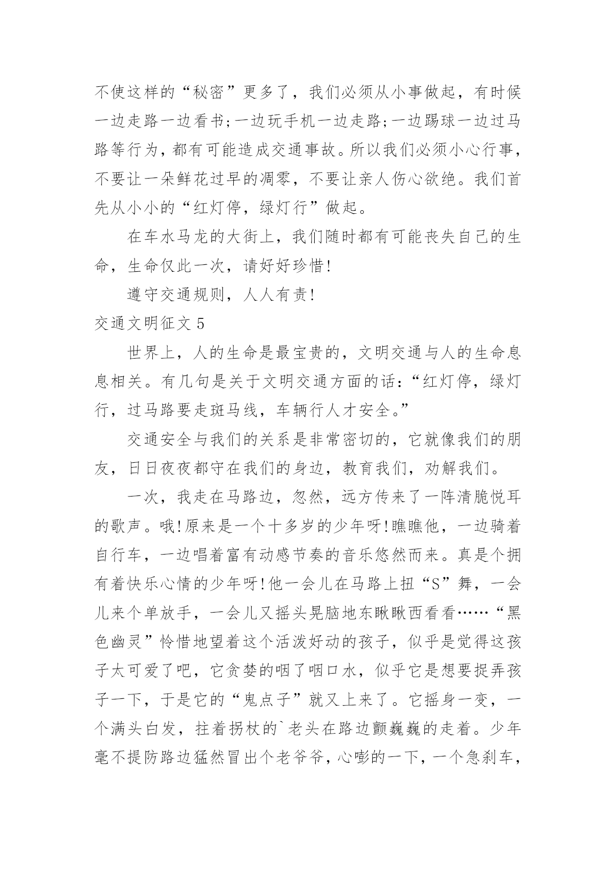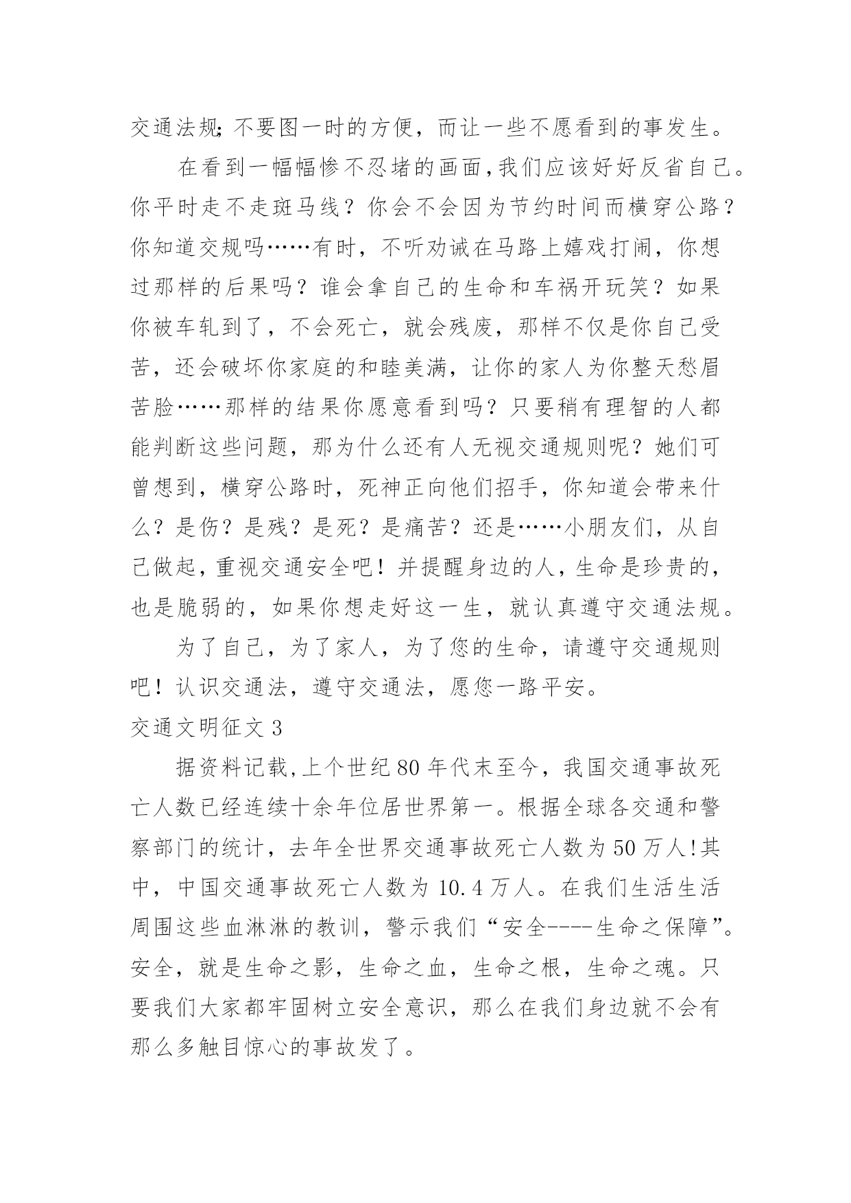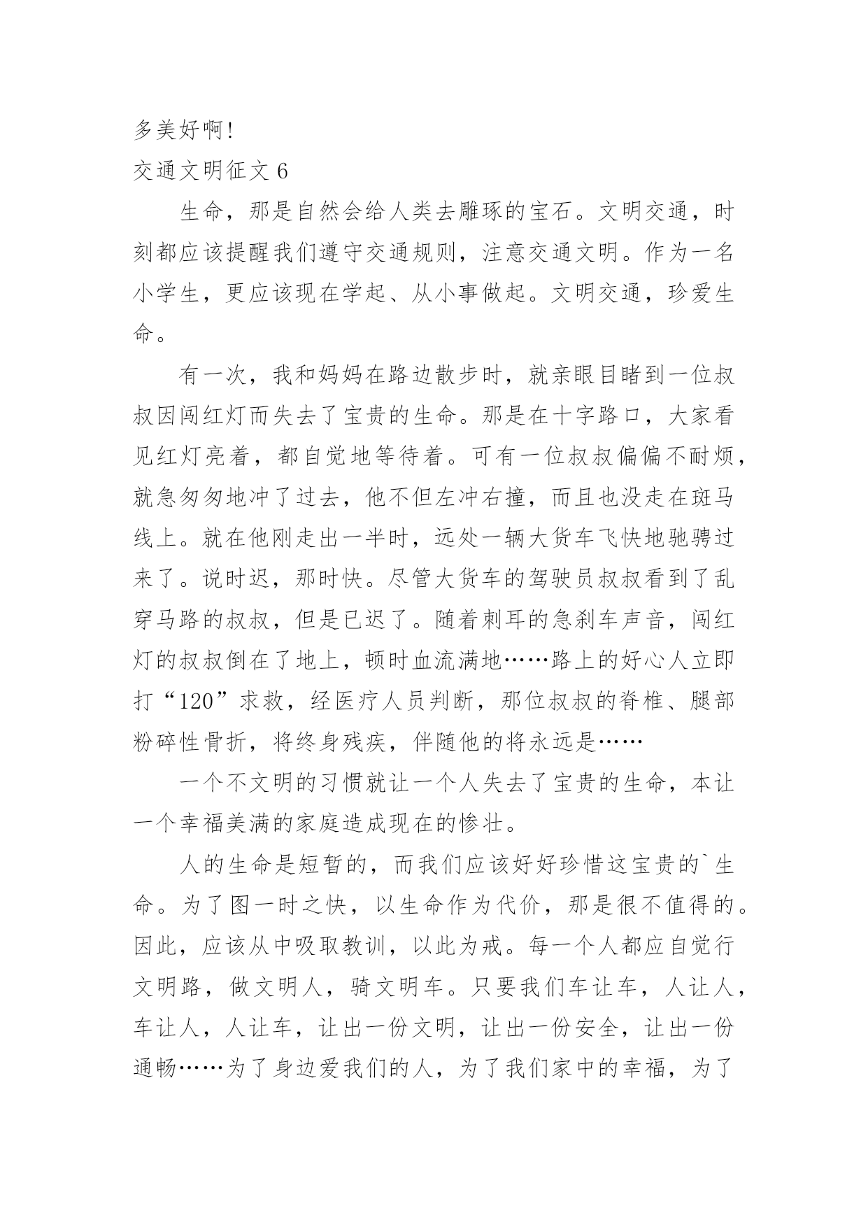 交通文明征文交通文明征文集合15篇在日常学习、工作或生活中,大家一定都接触过征文吧,征文是某个办事部门为了某个活动公开向社会征集的有关文章。如何写一篇有思想、有文采的征文呢?以下是小编收集整理的交通文明征文,欢迎大家借鉴与参考,希望对大家有所帮助。交通文明征文1如今的社会随着经济繁荣的发展,交通事业的发达,马路上的车辆川流不息,随着马路的日益拥挤,交通事故也出现越来越多。记得前一段时间,我听别人说在黄山区发生过一起严重车祸。一辆装满石子的大货车在左拐弯时与迎面而来的另一辆货车相撞,两车身均严重受损,驾驶室被撞得面目全非,两名驾驶员受伤严重,被送往就近医院抢救后来据当地交警称,两车速度过快、应处不当,是这起事故的主要原因。而每年,有多少生命因此被夺走,有多少个家庭被破坏,有多少人要失去亲人。这些都是血的教训,而作为中学生的我们不应该有所醒悟吗?交通事故往往都是人为的不遵守交通法规造成的。"不闯红灯、不翻越护栏、不在马路中间逗留"这些最普及的交通规则说起来是简单,但为什么总是有人不严格遵守呢?因为安全意识的.淡薄,许多人在车水马龙的马路上演了一幕幕不可挽回的悲剧。当你看到一个个鲜活的生命已经消失,当你发现一阵阵欢声笑语已经湮没。当你面对那些触目惊心的场景时,能不感到痛心疾首吗?黄金有价,生命无价。我们的生命属于自己只有一次,交通事故的发生使一个个家庭在遭受巨大精神伤害,使原本美满、幸福的家庭变得支离破碎,使父母、亲人悲痛不已。在我们身边,也存在许多危险的隐患,上学放学时,许多同学骑车又快又猛,他们在许多汽车中来回穿梭,为了炫耀骑车技术,难道就可以拿生命安全来打擦边球吗?有一些步行同学,在上学放学途中,为了争取时间,常常是闯红灯,跨栏杆,不走人行道,还有同学大摇大摆的走在马路中央,和同伴有说有笑,嬉戏打闹,可他们却全然不知,危险正一步步向他们逼近。勿以恶小而为之,勿以善小而不为,切莫把父母、老师的谆谆教诲当作耳边风,我们要树立"安全第一"的意识,严格遵守交通法规,做到警钟常鸣,我想类似的事故就不会发生在我们身边。生命只有一次,我们一定要珍惜它,就请我们从自身做起,严格遵守交通法规,共同倡导"文明交通,安全出行!"交通文明征文2人最宝贵的是生命,生命对每个人来说都只一次,上帝是公平的也是吝啬的,他让每个人的生命都那么脆弱,那么不堪一击,哪怕一次小小的交通事故也可以击败一个人的生命。在这飞速发展的社会中,街上的车辆逐渐增多,在你面前疾驰而过,也许就在这时,因为您的疏忽或违规,会给交通带来不便,也会让你的心灵蒙上一层阴影。作为父母,总会在孩子外出时,说一句:“注意安全。”在过马路时,会说:“看好红绿灯。”也就在红与绿一会儿的转变中,车祸便悄悄降临了。一天,我和妈妈在逛街,猛得听见身后一片惊叫。我急忙向后看去,一辆卡车已经停在一个摔倒在地的小女孩面前。同时,一群人向那边涌去。我和妈妈也挤了过去。那女孩脸色惨白,胸脯急促地起伏着,过了好一会儿,才“哇”地一声哭了起来。年轻的司机慌了,旁边的一位中年妇女俯下身,撩起小女孩的`裤管和衣袖,那血肉模糊的手脚,真让人心疼,那妇女做了紧急处理,便赶快叫司机送到医院。女孩被抱上车后,疾驰而去。周围的群众议论纷纷:“哎,这女孩也真是的,自己不遵守交通规则,弄成这样,幸亏没什么大碍。”从这起车祸中,让我感受到不遵守交通规则的严重性,这次是没什么事,要真出了什么意外,双方都得承受现实的压力,彼此都得受到良心的谴责。像这类的交通事故时有发生,同学们,一定要严格遵守交通法规;不要图一时的方便,而让一些不愿看到的事发生。在看到一幅幅惨不忍堵的画面,我们应该好好反省自己。你平时走不走斑马线?你会不会因为节约时间而横穿公路?你知道交规吗……有时,不听劝诫在马路上嬉戏打闹,你想过那样的后果吗?谁会拿自己的生命和车祸开玩笑?如果你被车轧到了,不会死亡,就会残废,那样不仅是你自己受苦,还会破坏你家庭的和睦美满,让你的家人为你整天愁眉苦脸……那样的结果你愿意看到吗?只要稍有理智的人都能判断这些问题,那为什么还有人无视交通规则呢?她们可曾想到,横穿公路时,死神正向他们招手,你知道会带来什么?是伤?是残?是死?是痛苦?还是……小朋友们,从自己做起,重视交通安全吧!并提醒身边的人,生命是珍贵的,也是脆弱的,如果你想走好这一生,就认真遵守交通法规。为了自己,为了家人,为了您的生命,请遵守交通规则吧!认识交通法,遵守交通法,愿您一路平安。交通文明征文3据资料记载,上个世纪80年代末至今,我国交通事故死亡人数已经连续十余年位居世界第一。根据全球各交通和警察部门的统计,去年全世界交通事故死亡人数为50万人!其中,中国交通事故死亡人数为10.4万人。在我们生活生活周围这些血淋淋的教训,警示我们“安全----生命之保障”。安全,就是生命之影,