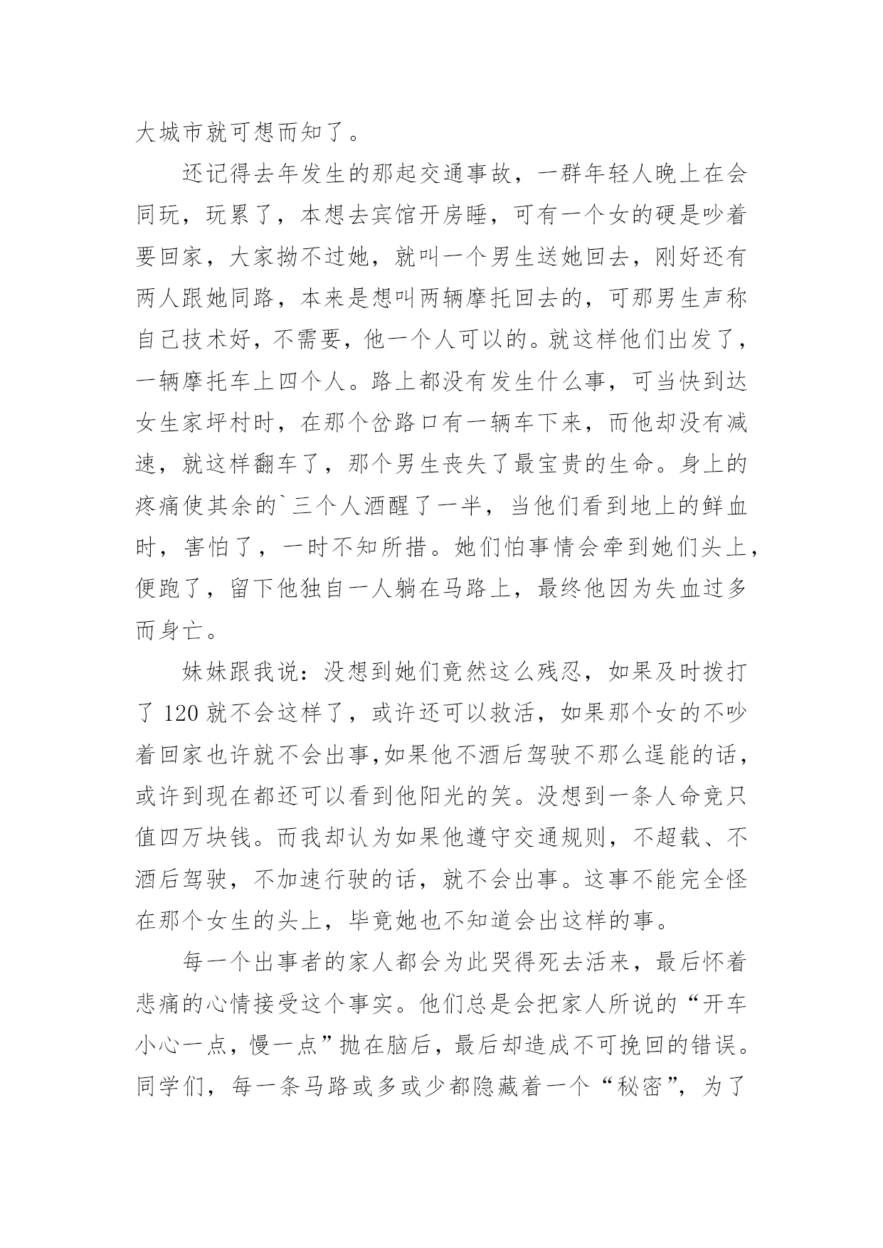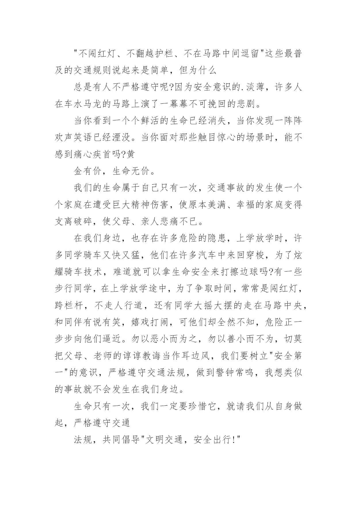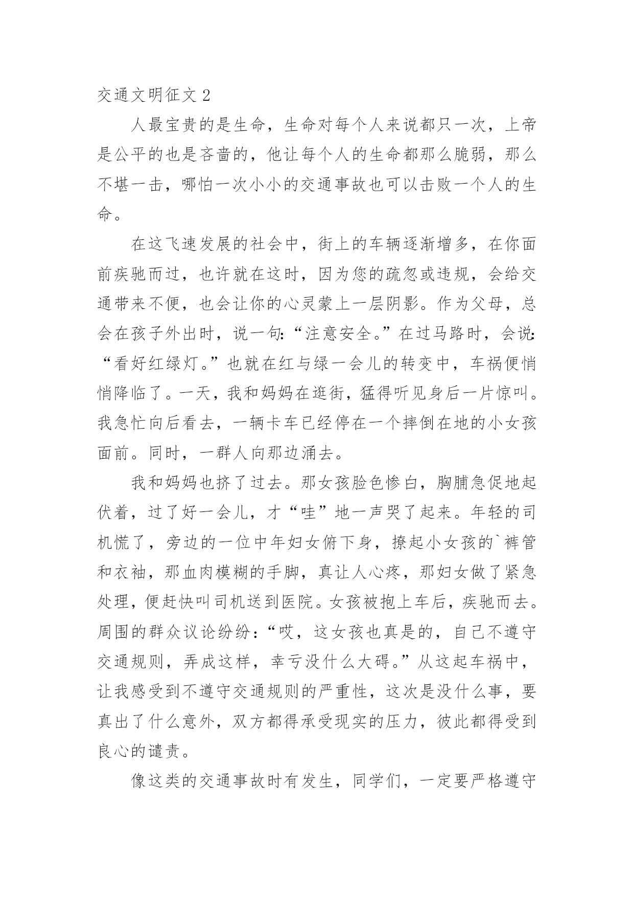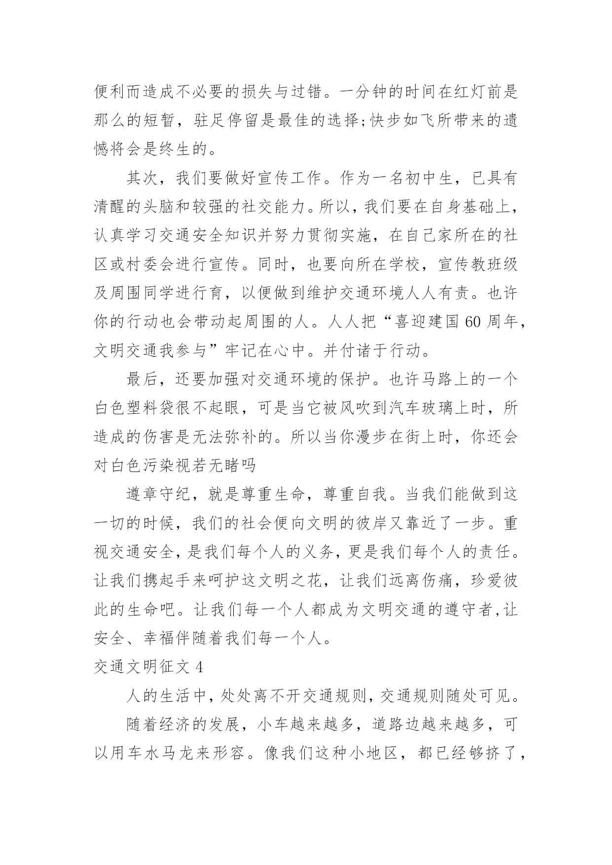 交通文明征文交通文明征文集合15篇在日常学习、工作或生活中,大家一定都接触过征文吧,征文是某个办事部门为了某个活动公开向社会征集的有关文章。如何写一篇有思想、有文采的征文呢?以下是小编收集整理的交通文明征文,欢迎大家借鉴与参考,希望对大家有所帮助。交通文明征文1如今的社会随着经济繁荣的发展,交通事业的发达,马路上的车辆川流不息,随着马路的日益拥挤,交通事故也出现越来越多。记得前一段时间,我听别人说在黄山区发生过一起严重车祸。一辆装满石子的大货车在左拐弯时与迎面而来的另一辆货车相撞,两车身均严重受损,驾驶室被撞得面目全非,两名驾驶员受伤严重,被送往就近医院抢救后来据当地交警称,两车速度过快、应处不当,是这起事故的主要原因。而每年,有多少生命因此被夺走,有多少个家庭被破坏,有多少人要失去亲人。这些都是血的教训,而作为中学生的我们不应该有所醒悟吗?交通事故往往都是人为的不遵守交通法规造成的。"不闯红灯、不翻越护栏、不在马路中间逗留"这些最普及的交通规则说起来是简单,但为什么总是有人不严格遵守呢?因为安全意识的.淡薄,许多人在车水马龙的马路上演了一幕幕不可挽回的悲剧。当你看到一个个鲜活的生命已经消失,当你发现一阵阵欢声笑语已经湮没。当你面对那些触目惊心的场景时,能不感到痛心疾首吗?黄金有价,生命无价。我们的生命属于自己只有一次,交通事故的发生使一个个家庭在遭受巨大精神伤害,使原本美满、幸福的家庭变得支离破碎,使父母、亲人悲痛不已。在我们身边,也存在许多危险的隐患,上学放学时,许多同学骑车又快又猛,他们在许多汽车中来回穿梭,为了炫耀骑车技术,难道就可以拿生命安全来打擦边球吗?有一些步行同学,在上学放学途中,为了争取时间,常常是闯红灯,跨栏杆,不走人行道,还有同学大摇大摆的走在马路中央,和同伴有说有笑,嬉戏打闹,可他们却全然不知,危险正一步步向他们逼近。勿以恶小而为之,勿以善小而不为,切莫把父母、老师的谆谆教诲当作耳边风,我们要树立"安全第一"的意识,严格遵守交通法规,做到警钟常鸣,我想类似的事故就不会发生在我们身边。生命只有一次,我们一定要珍惜它,就请我们从自身做起,严格遵守交通法规,共同倡导"文明交通,安全出行!"交通文明征文2人最宝贵的是生命,生命对每个人来说都只一次,上帝是公平的也是吝啬的,他让每个人的生命都那么脆弱,那么不堪一击,哪怕一次小小的交通事故也可以击败一个人的生命。在这飞速发展的社会中,街上的车辆逐渐增多,在你面前疾驰而过,也许就在这时,因为您的疏忽或违规,会给交通带来不便,也会让你的心灵蒙上一层阴影。作为父母,总会在孩子外出时,说一句:“注意安全。”在过马路时,会说:“看好红绿灯。”也就在红与绿一会儿的转变中,车祸便悄悄降临了。一天,我和妈妈在逛街,猛得听见身后一片惊叫。我急忙向后看去,一辆卡车已经停在一个摔倒在地的小女孩面前。同时,一群人向那边涌去。我和妈妈也挤了过去。那女孩脸色惨白,胸脯急促地起伏着,过了好一会儿,才“哇”地一声哭了起来。年轻的司机慌了,旁边的一位中年妇女俯下身,撩起小女孩的`裤管和衣袖,那血肉模糊的手脚,真让人心疼,那妇女做了紧急处理,便赶快叫司机送到医院。女孩被抱上车后,疾驰而去。周围的群众议论纷纷:“哎,这女孩也真是的,自己不遵守交通规则,弄成这样,幸亏没什么大碍。”从这起车祸中,让我感受到不遵守交通规则的严重性,这次是没什么事,要真出了什么意外,双方都得承受现实的压力,彼此都得受到良心的谴责。像这类的交通事故时有发生,同学们,一定要严格遵守交通法规;不要图一时的方便,而让一些不愿看到的事发生。在看到一幅幅惨不忍堵的画面,我们应该好好反省自己。你平时走不走斑马线?你会不会因为节约时间而横穿公路?你知道交规吗……有时,不听劝诫在马路上嬉戏打闹,你想过那样的后果吗?谁会拿自己的生命和车祸开玩笑?如果你被车轧到了,不会死亡,就会残废,那样不仅是你自己受苦,还会破坏你家庭的和睦美满,让你的家人为你整天愁眉苦脸……那样的结果你愿意看到吗?只要稍有理智的人都能判断这些问题,那为什么还有人无视交通规则呢?她们可曾想到,横穿公路时,死神正向他们招手,你知道会带来什么?是伤?是残?是死?是痛苦?还是……小朋友们,从自己做起,重视交通安全吧!并提醒身边的人,生命是珍贵的,也是脆弱的,如果你想走好这一生,就认真遵守交通法规。为了自己,为了家人,为了您的生命,请遵守交通规则吧!认识交通法,遵守交通法,愿您一路平安。交通文明征文3据资料记载,上个世纪80年代末至今,我国交通事故死亡人数已经连续十余年位居世界第一。根据全球各交通和警察部门的统计,去年全世界交通事故死亡人数为50万人!其中,中国交通事故死亡人数为10.4万人。在我们生活生活周围这些血淋淋的教训,警示我们“安全----生命之保障”。安全,就是生命之影,