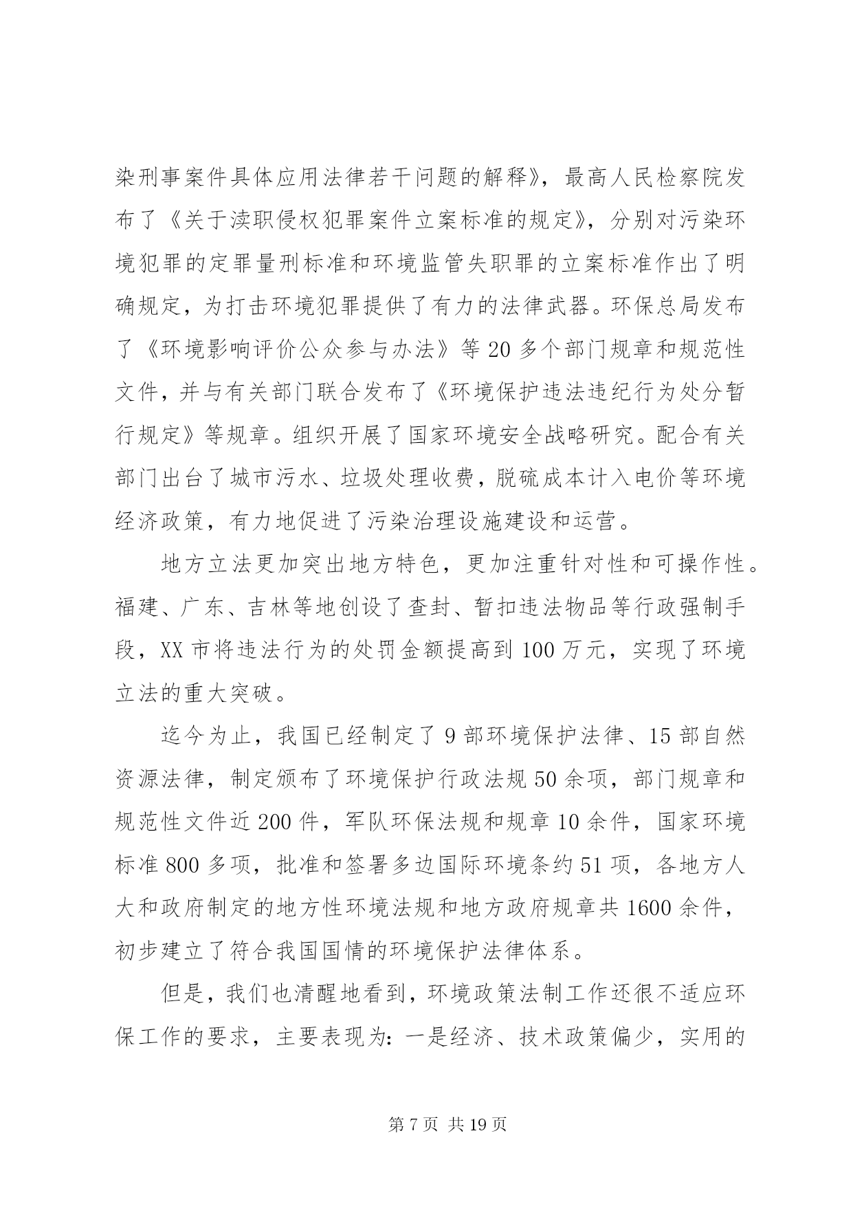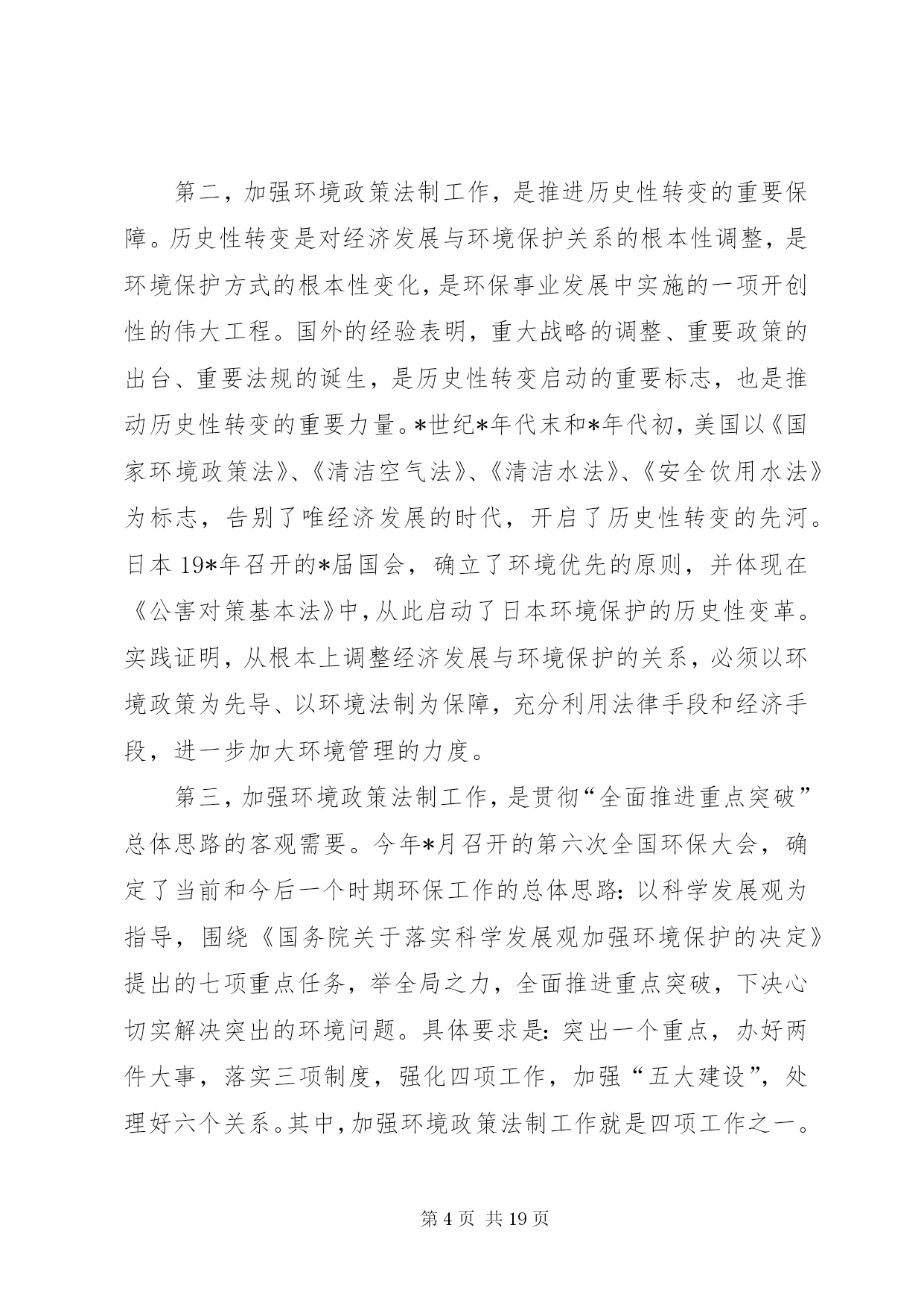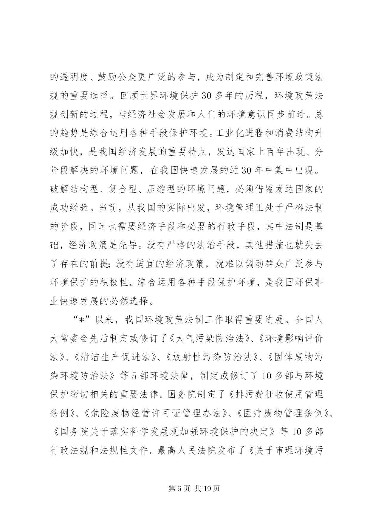 第PAGE\*Arabic\*MERGEFORMAT19页共NUMPAGES\*MERGEFORMAT19页环保局环境政策法制讲话同志们:环境政策法制是推进历史性转变的重要保障。当前,我国的环境保护正处于历史性转变的关键时期,加强这项工作尤为重要。今天召开全国环境政策法制工作会议,针对当前存在的突出问题,特别是前一阶段总局组织的专题调研中各地反映的问题,研究提出对策措施,具有重要意义。下面,我讲三点意见。一、充分认识加强环境政策法制工作的重要意义早在19*年,*同志就强调,“政策和策略是党的生命,各级领导同志务必充分注意,万万不可粗心大意。”邓小平同志指出,“搞四个现代化一定要有两手,只有一手是不行的,所谓两手,即一手抓建设,一手抓法制”。他十分重视环境法制建设,19*年就提出环境保护也要立法。江泽民同志在党的*上提出“依法治国,建设社会主义法治国家”的治国方略,并在第四次全国环境保护会议和中央人口资源环境工作座谈会上明确指出,要“加强环境法制建设”、“完善社会主义市场经济体制下的环境保护法律体系”,要求各级领导干部“带头遵守环境保护法律法规,并为环保部门严格执法撑腰”。胡锦涛同志强调,改革发展稳定的任务越是繁重,越要增强依法治国、依法执政的自觉性和坚定性,越要注重维护法制的统一和尊严。在20*年中央人口资源环境工作座谈会上强调,要“坚持发挥政策的杠杆作用,加强对重要资源供求的宏观调控”,“坚持依法办事,把人口资源环境工作纳入法制轨道”。温家宝总理在第六次全国环保大会上强调,“强化法治是治理污染、保护生态最有效的手段,要把环境保护真正纳入法治化轨道。加强环境立法,健全和完善环境法律体系。建立完备的环境执法监督体系,坚决做到有法必依、执法必严、违法必究,严厉查处环境违法行为和案件”,“决不允许违法排污的行为长期进行下去,决不允许严重危害群众利益的环境违法者逍遥法外。”这些重要指示为加强环境政策法制建设指明了方向。我们必须充分认识加强环境政策法制工作的重要性和紧迫性,切实把这项工作摆上更加重要的战略位置。第一,加强环境政策法制工作,是全面贯彻落实科学发展观、构建和谐社会的必然要求。在传统的经济发展模式下,经济增长在很大程度上是靠牺牲环境换取的,这样的发展必然是难以持续的;贯彻落实科学发展观,必须坚持以保护环境优化经济增长,这是实现国民经济又好又快发展的重要保障。*世纪*年代,美国和日本在实施限制汽车尾气排放的法规方面,采取了两种截然不同的态度。美国以尾气排放管制损失大于效益为借口,暂缓执行了19*年通过的“马斯基法”。日本果断实行了限制汽车尾气排放的政策,不仅促进了环境技术的重大突破,而且迅速提高了日本汽车在全球市场的竞争力。这是环境政策法规优化经济增长的真实写照。国内外的实践反复证明,加强环境政策法制工作,能够促进经济结构优化升级,推进产业布局合理有序,推动科学技术不断创新。和谐社会是中国特色社会主义的本质属性。和谐社会既包括人与人、人与社会的和谐,也包括人与自然的和谐。随着环境成为经济社会发展的“瓶颈”制约,人与自然的矛盾日益突出,直接危及人与人、人与社会的和谐。近年来,群众的环境投诉和因环境问题引发的群体性事件以每年30%左右的速度上升。一些地方污染问题已经成为影响社会稳定的重要因素。当前,我国已经进入改革发展的关键时期,经济体制深刻变革,社会结构深刻变动,利益格局深刻调整,思想观念深刻变化。面对新形势下环境纠纷日益增多的趋势,如果不能依法及时妥善处理,个别问题就可能演变为普遍问题,局部问题就可能演变为整体问题,环境问题就可能演变为政治问题,影响社会和谐稳定。今年*月,科特迪瓦由于毒垃圾事件引发大批群众抗议和游行示威,过渡政府被迫集体辞职。这一事件再次说明正确处理环境问题的极端重要性,也为我们敲响了警钟。党的*全会《中共中央关于构建社会主义和谐社会若干重大问题的决定》提出,要完善法律制度,夯实社会和谐的法治基础。环境法制建设是社会主义法制建设的重要组成部分。加强环境法制建设,既是解决环境问题的有力武器,又是妥善处理环境纠纷、促进社会和谐的重要保障。第二,加强环境政策法制工作,是推进历史性转变的重要保障。历史性转变是对经济发展与环境保护关系的根本性调整,是环境保护方式的根本性变化,是环保事业发展中实施的一项开创性的伟大工程。国外的经验表明,重大战略的调整、重要政策的出台、重要法规的诞生,是历史性转变启动的重要标志,也是推动历史性转变的重要力量。*世纪*年代末和*年代初,美国以《国家环境政策法》、《清洁空气法》、《清洁水法》、《安全饮用水法》为标志,告别了唯经济发展的时代,开启了历史性转变的先河。日本19*年召开的*届国会,确立了环境优先的原则,并体现在《公害对策基本法》中,从此启动了日本环境保护的历史
