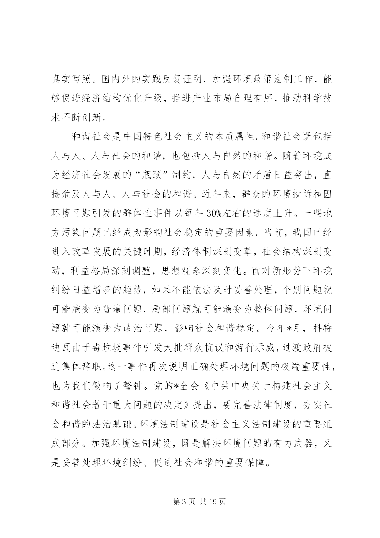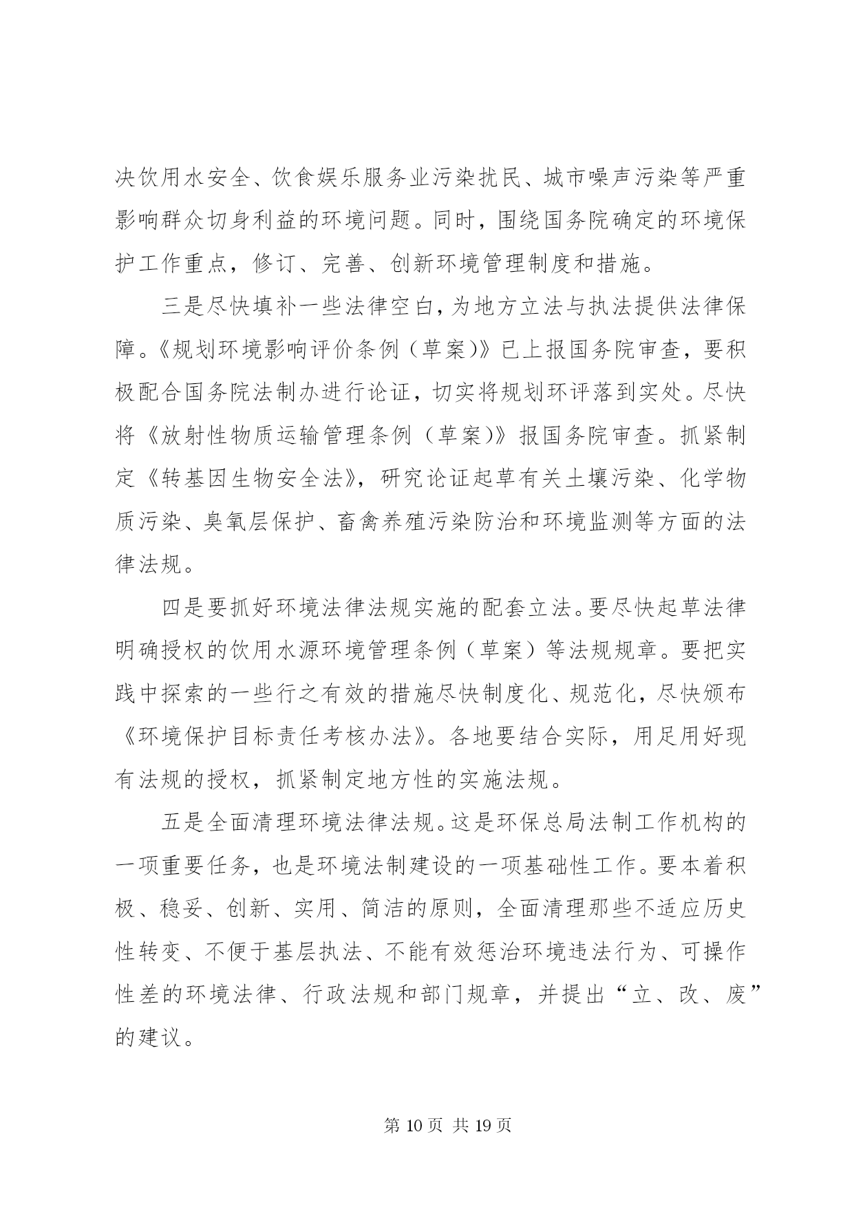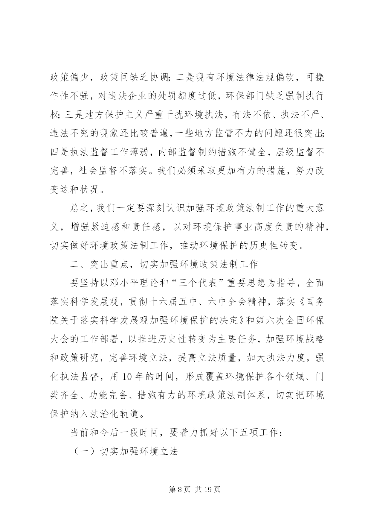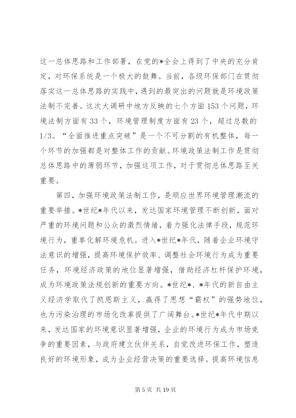 第PAGE\*Arabic\*MERGEFORMAT19页共NUMPAGES\*MERGEFORMAT19页环保局环境政策法制讲话同志们:环境政策法制是推进历史性转变的重要保障。当前,我国的环境保护正处于历史性转变的关键时期,加强这项工作尤为重要。今天召开全国环境政策法制工作会议,针对当前存在的突出问题,特别是前一阶段总局组织的专题调研中各地反映的问题,研究提出对策措施,具有重要意义。下面,我讲三点意见。一、充分认识加强环境政策法制工作的重要意义早在19*年,*同志就强调,“政策和策略是党的生命,各级领导同志务必充分注意,万万不可粗心大意。”邓小平同志指出,“搞四个现代化一定要有两手,只有一手是不行的,所谓两手,即一手抓建设,一手抓法制”。他十分重视环境法制建设,19*年就提出环境保护也要立法。江泽民同志在党的*上提出“依法治国,建设社会主义法治国家”的治国方略,并在第四次全国环境保护会议和中央人口资源环境工作座谈会上明确指出,要“加强环境法制建设”、“完善社会主义市场经济体制下的环境保护法律体系”,要求各级领导干部“带头遵守环境保护法律法规,并为环保部门严格执法撑腰”。胡锦涛同志强调,改革发展稳定的任务越是繁重,越要增强依法治国、依法执政的自觉性和坚定性,越要注重维护法制的统一和尊严。在20*年中央人口资源环境工作座谈会上强调,要“坚持发挥政策的杠杆作用,加强对重要资源供求的宏观调控”,“坚持依法办事,把人口资源环境工作纳入法制轨道”。温家宝总理在第六次全国环保大会上强调,“强化法治是治理污染、保护生态最有效的手段,要把环境保护真正纳入法治化轨道。加强环境立法,健全和完善环境法律体系。建立完备的环境执法监督体系,坚决做到有法必依、执法必严、违法必究,严厉查处环境违法行为和案件”,“决不允许违法排污的行为长期进行下去,决不允许严重危害群众利益的环境违法者逍遥法外。”这些重要指示为加强环境政策法制建设指明了方向。我们必须充分认识加强环境政策法制工作的重要性和紧迫性,切实把这项工作摆上更加重要的战略位置。第一,加强环境政策法制工作,是全面贯彻落实科学发展观、构建和谐社会的必然要求。在传统的经济发展模式下,经济增长在很大程度上是靠牺牲环境换取的,这样的发展必然是难以持续的;贯彻落实科学发展观,必须坚持以保护环境优化经济增长,这是实现国民经济又好又快发展的重要保障。*世纪*年代,美国和日本在实施限制汽车尾气排放的法规方面,采取了两种截然不同的态度。美国以尾气排放管制损失大于效益为借口,暂缓执行了19*年通过的“马斯基法”。日本果断实行了限制汽车尾气排放的政策,不仅促进了环境技术的重大突破,而且迅速提高了日本汽车在全球市场的竞争力。这是环境政策法规优化经济增长的真实写照。国内外的实践反复证明,加强环境政策法制工作,能够促进经济结构优化升级,推进产业布局合理有序,推动科学技术不断创新。和谐社会是中国特色社会主义的本质属性。和谐社会既包括人与人、人与社会的和谐,也包括人与自然的和谐。随着环境成为经济社会发展的“瓶颈”制约,人与自然的矛盾日益突出,直接危及人与人、人与社会的和谐。近年来,群众的环境投诉和因环境问题引发的群体性事件以每年30%左右的速度上升。一些地方污染问题已经成为影响社会稳定的重要因素。当前,我国已经进入改革发展的关键时期,经济体制深刻变革,社会结构深刻变动,利益格局深刻调整,思想观念深刻变化。面对新形势下环境纠纷日益增多的趋势,如果不能依法及时妥善处理,个别问题就可能演变为普遍问题,局部问题就可能演变为整体问题,环境问题就可能演变为政治问题,影响社会和谐稳定。今年*月,科特迪瓦由于毒垃圾事件引发大批群众抗议和游行示威,过渡政府被迫集体辞职。这一事件再次说明正确处理环境问题的极端重要性,也为我们敲响了警钟。党的*全会《中共中央关于构建社会主义和谐社会若干重大问题的决定》提出,要完善法律制度,夯实社会和谐的法治基础。环境法制建设是社会主义法制建设的重要组成部分。加强环境法制建设,既是解决环境问题的有力武器,又是妥善处理环境纠纷、促进社会和谐的重要保障。第二,加强环境政策法制工作,是推进历史性转变的重要保障。历史性转变是对经济发展与环境保护关系的根本性调整,是环境保护方式的根本性变化,是环保事业发展中实施的一项开创性的伟大工程。国外的经验表明,重大战略的调整、重要政策的出台、重要法规的诞生,是历史性转变启动的重要标志,也是推动历史性转变的重要力量。*世纪*年代末和*年代初,美国以《国家环境政策法》、《清洁空气法》、《清洁水法》、《安全饮用水法》为标志,告别了唯经济发展的时代,开启了历史性转变的先河。日本19*年召开的*届国会,确立了环境优先的原则,并体现在《公害对策基本法》中,从此启动了日本环境保护的历史