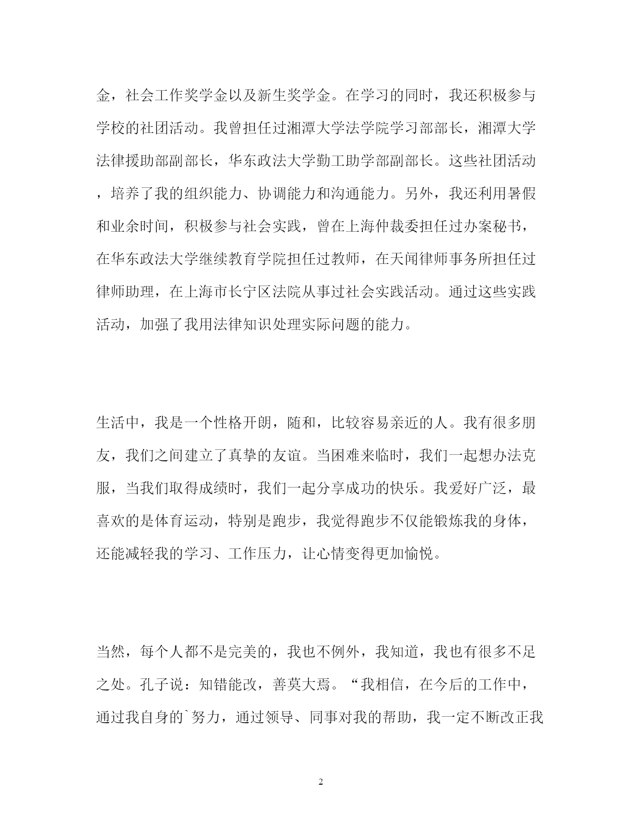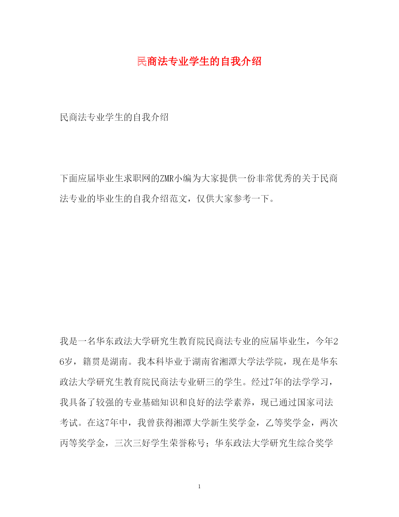 此资料由网络收集而来,如有侵权请告知上传者立即删除。资料共分享,我们负责传递知识。PAGEPAGE3民商法专业学生的自我介绍民商法专业学生的自我介绍下面应届毕业生求职网的ZMR小编为大家提供一份非常优秀的关于民商法专业的毕业生的自我介绍范文,仅供大家参考一下。我是一名华东政法大学研究生教育院民商法专业的应届毕业生,今年26岁,籍贯是湖南。我本科毕业于湖南省湘潭大学法学院,现在是华东政法大学研究生教育院民商法专业研三的学生。经过7年的法学学习,我具备了较强的专业基础知识和良好的法学素养,现已通过国家司法考试。在这7年中,我曾获得湘潭大学新生奖学金,乙等奖学金,两次丙等奖学金,三次三好学生荣誉称号;华东政法大学研究生综合奖学金,社会工作奖学金以及新生奖学金。在学习的同时,我还积极参与学校的社团活动。我曾担任过湘潭大学法学院学习部部长,湘潭大学法律援助部副部长,华东政法大学勤工助学部副部长。这些社团活动,培养了我的组织能力、协调能力和沟通能力。另外,我还利用暑假和业余时间,积极参与社会实践,曾在上海仲裁委担任过办案秘书,在华东政法大学继续教育学院担任过教师,在天闻律师事务所担任过律师助理,在上海市长宁区法院从事过社会实践活动。通过这些实践活动,加强了我用法律知识处理实际问题的能力。生活中,我是一个性格开朗,随和,比较容易亲近的人。我有很多朋友,我们之间建立了真挚的友谊。当困难来临时,我们一起想办法克服,当我们取得成绩时,我们一起分享成功的快乐。我爱好广泛,最喜欢的是体育运动,特别是跑步,我觉得跑步不仅能锻炼我的身体,还能减轻我的学习、工作压力,让心情变得更加愉悦。当然,每个人都不是完美的,我也不例外,我知道,我也有很多不足之处。孔子说:知错能改,善莫大焉。“我相信,在今后的工作中,通过我自身的`努力,通过领导、同事对我的帮助,我一定不断改正我的缺点,成为一名合格的工作人员的。70%的阅读者阅读此文章后还查看了自我介绍以下文章:通信工程专业学生的自我介绍自我介绍应该说些什么好自我介绍能提高面试成功率