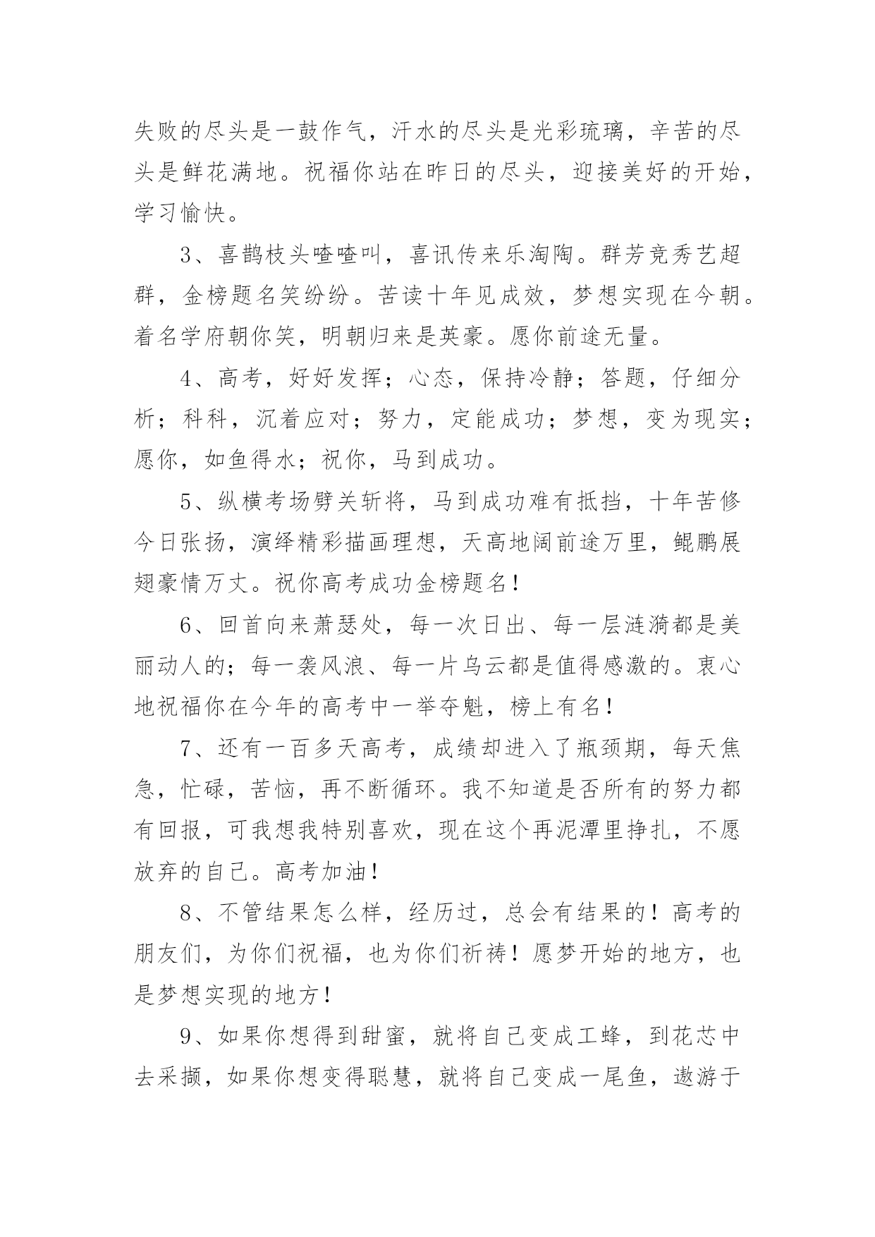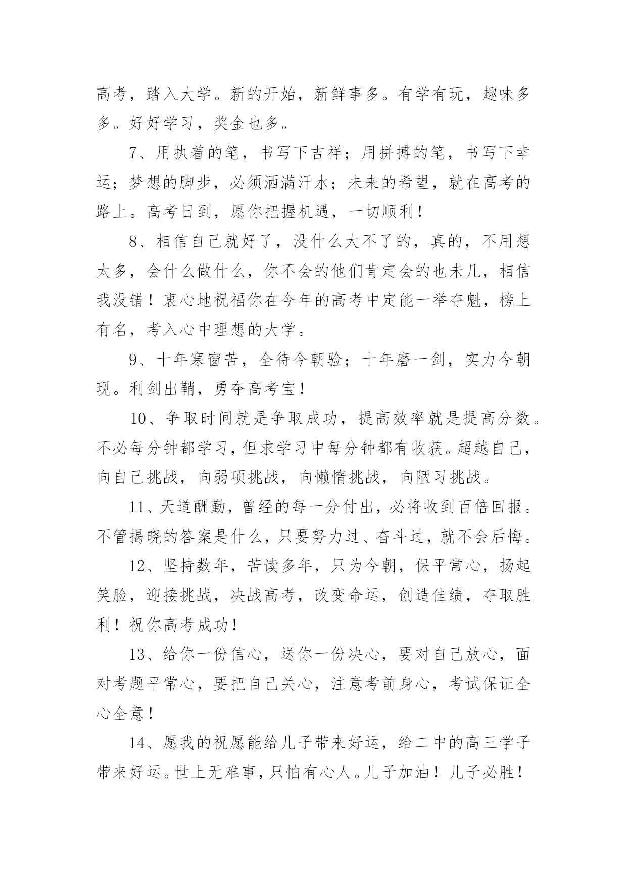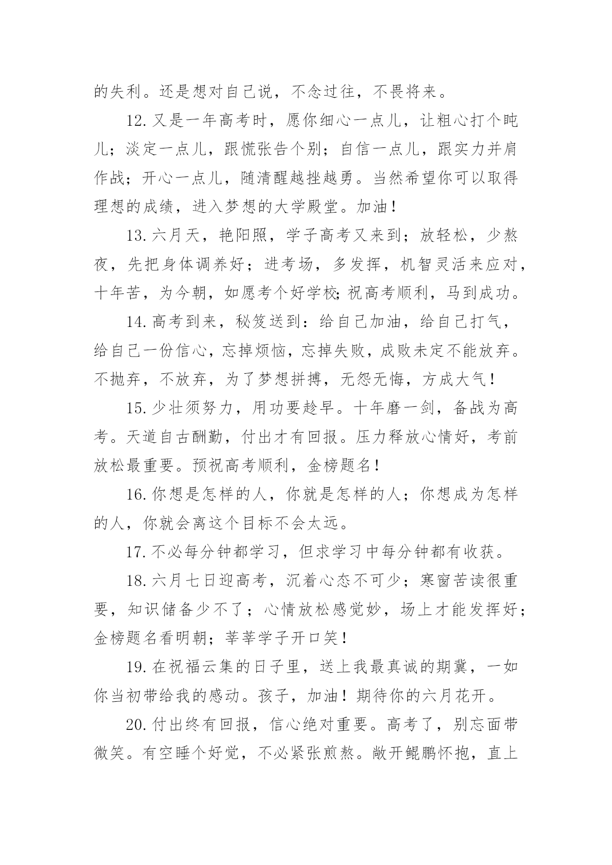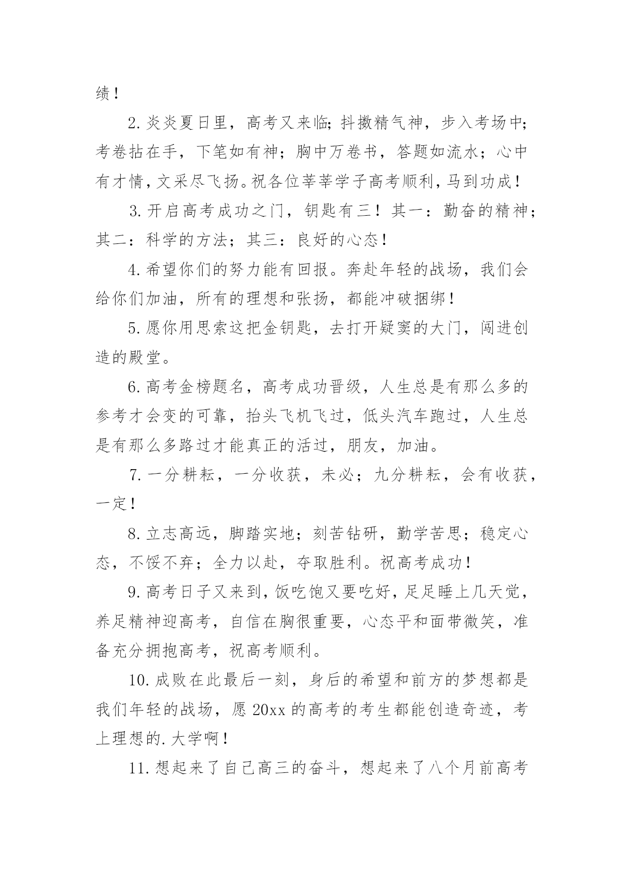 高考祝福语高考祝福语集合在平凡的学习、工作、生活中,大家对祝福语都再熟悉不过了吧,祝福语不限制字数,在运用上较为灵活。你会写祝福语吗?以下是小编整理的高考祝福语,欢迎阅读与收藏。高考祝福语11、花开灿烂正盛放,香气袭人芬芳扬。捷报传来心敞亮,笑语纷纷幸福长。全家商议填志愿,再入学府长才干。关注兴趣和爱好,继续征战在明朝。愿你前程似锦。2、没有付出,就没有收获,人只有上坡路才是最难走的,相信自己能成功,自己就一定能成功。努力吧,希望会属于你的。3、美丽的梦和美丽的诗一样,都是可遇而不可求的。我真喜欢那样的梦,明明知道你已为我跋涉千里,却又觉得芳草鲜美,好像你我才初次相逢!4、决胜高考小常识:高考饮食要均衡,甜食油炸要少吃,睡眠时间要适当,步入考场要从容,心理调节最重要;小小心意献给你,盼你胜利回来时!5、又是一年高考到,一心一意祝福你,二份真心伴你行,三分提醒沉着应考,四份好运陪伴你,五份细心要做到,六六大顺金榜题名。6、步入金秋,迎来丰收。寒窗苦读,收获多多。经历高考,踏入大学。新的开始,新鲜事多。有学有玩,趣味多多。好好学习,奖金也多。7、用执着的笔,书写下吉祥;用拼搏的笔,书写下幸运;梦想的脚步,必须洒满汗水;未来的希望,就在高考的路上。高考日到,愿你把握机遇,一切顺利!8、相信自己就好了,没什么大不了的,真的,不用想太多,会什么做什么,你不会的他们肯定会的也未几,相信我没错!衷心地祝福你在今年的高考中定能一举夺魁,榜上有名,考入心中理想的大学。9、十年寒窗苦,全待今朝验;十年磨一剑,实力今朝现。利剑出鞘,勇夺高考宝!10、争取时间就是争取成功,提高效率就是提高分数。不必每分钟都学习,但求学习中每分钟都有收获。超越自己,向自己挑战,向弱项挑战,向懒惰挑战,向陋习挑战。11、天道酬勤,曾经的每一分付出,必将收到百倍回报。不管揭晓的答案是什么,只要努力过、奋斗过,就不会后悔。12、坚持数年,苦读多年,只为今朝,保平常心,扬起笑脸,迎接挑战,决战高考,改变命运,创造佳绩,夺取胜利!祝你高考成功!13、给你一份信心,送你一份决心,要对自己放心,面对考题平常心,要把自己关心,注意考前身心,考试保证全心全意!14、愿我的祝愿能给儿子带来好运,给二中的高三学子带来好运。世上无难事,只怕有心人。儿子加油!儿子必胜!15、又是一年毕业季,不惜感叹时光似箭。下个周末的今天就是高考,去年的我们为自己加油,今年的我们为学弟学妹们加油。高三加油,高考必胜!16、昨日撒下勤奋种,今朝一搏必成功。鲤鱼一跃便成龙,大鹏展翅震长空。前程似锦圆美梦,锦衣凯旋沐春风。寒窗不负苦心人,金榜有你祝高中。高考顺利,愿你成功!17、人生转折高考点,十数寒窗才气展;心态平和把才亮,冷静应对是关键;把握方法考不难,下笔如神顺心愿;祝你愿望早成真,金榜题名乐无边!18、有一种总文走势叫不紧张,有一种作文格式叫休息好,有一种数学公式叫心态好,有一种英语知识叫你很棒,有一种祝福方式叫放轻松,你能成功!祝你高考OK!19、努力的苦读,就为这一刻!把你的实力全部发挥,所有关爱着你的人,都会为你祝福、祈祷,相信你会考出满意的成绩,榜上有名!20、生命之中最快乐的是拼搏,而非成功,生命之中最痛苦的是懒散,而非失败!21、放开往日学习中的紧张,用一颗平常心去轻松面对,相信你会考出自己理想的成绩的,愿好运一直陪伴着你!22、忍别人所不能忍的痛,吃别人所不能吃的苦,是为了收获别人得不到的收获。高考祝福语21.高考即将临,情绪要稳定。不要太激动,夜晚睡不宁。调整好作息,跟上好节奏。劳逸要结合,才能头脑清。考场信心足,金榜题名成。祝你高考取得好成绩!2.炎炎夏日里,高考又来临;抖擞精气神,步入考场中;考卷拈在手,下笔如有神;胸中万卷书,答题如流水;心中有才情,文采尽飞扬。祝各位莘莘学子高考顺利,马到功成!3.开启高考成功之门,钥匙有三!其一:勤奋的精神;其二:科学的方法;其三:良好的心态!4.希望你们的努力能有回报。奔赴年轻的战场,我们会给你们加油,所有的理想和张扬,都能冲破捆绑!5.愿你用思索这把金钥匙,去打开疑窦的大门,闯进创造的殿堂。6.高考金榜题名,高考成功晋级,人生总是有那么多的参考才会变的可靠,抬头飞机飞过,低头汽车跑过,人生总是有那么多路过才能真正的活过,朋友,加油。7.一分耕耘,一分收获,未必;九分耕耘,会有收获,一定!8.立志高远,脚踏实地;刻苦钻研,勤学苦思;稳定心态,不馁不弃;全力以赴,夺取胜利。祝高考成功!9.高考日子又来到,饭吃饱又要吃好,足足睡上几天觉,养足精神迎高考,自信在胸很重要,心态平和面带微笑,准备充分拥抱高考,祝高考顺利。10.成败在此最后一刻,身后的希望和前方的梦想都是我们年轻的战场,愿20xx的高考的考生都能创造奇迹,考上理想的.大学啊!11.想起来
