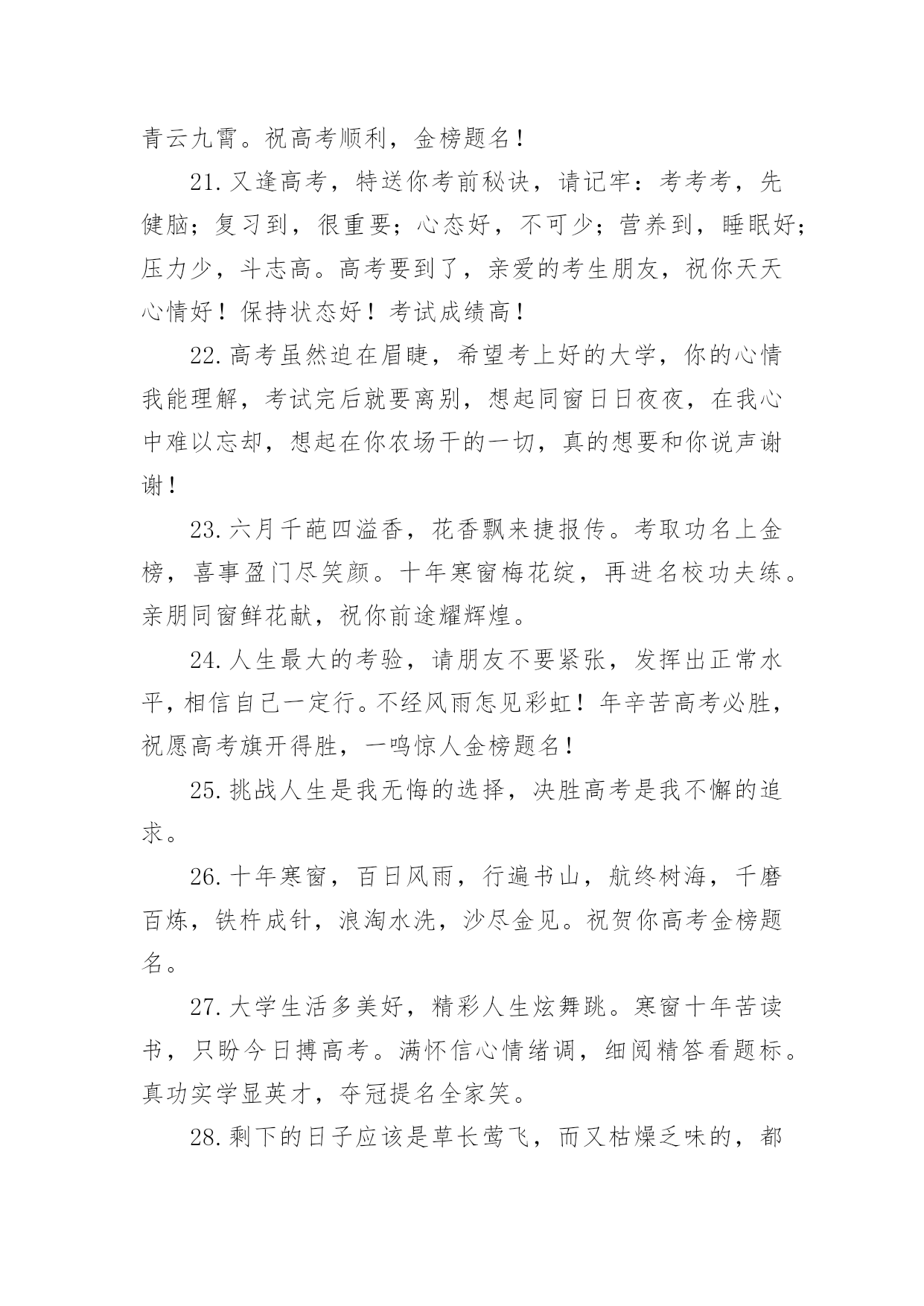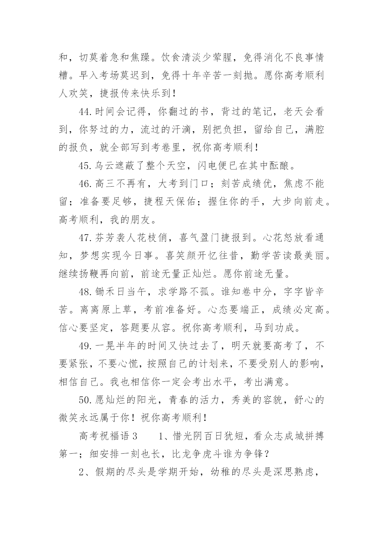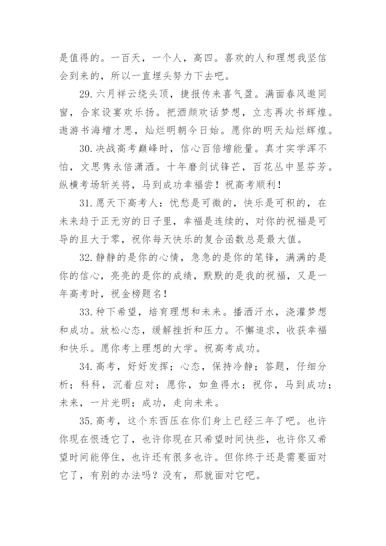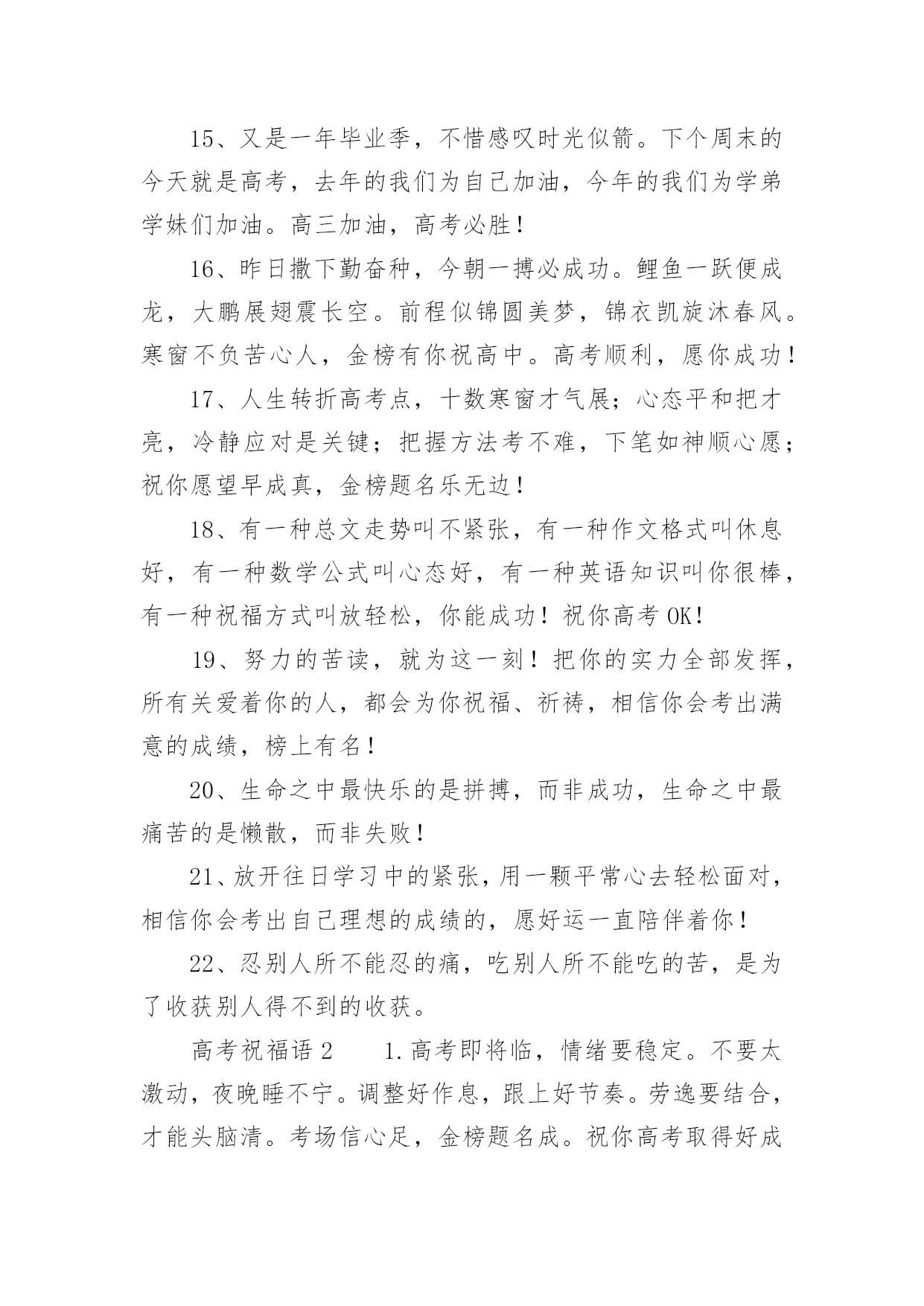 高考祝福语高考祝福语集合在平凡的学习、工作、生活中,大家对祝福语都再熟悉不过了吧,祝福语不限制字数,在运用上较为灵活。你会写祝福语吗?以下是小编整理的高考祝福语,欢迎阅读与收藏。高考祝福语11、花开灿烂正盛放,香气袭人芬芳扬。捷报传来心敞亮,笑语纷纷幸福长。全家商议填志愿,再入学府长才干。关注兴趣和爱好,继续征战在明朝。愿你前程似锦。2、没有付出,就没有收获,人只有上坡路才是最难走的,相信自己能成功,自己就一定能成功。努力吧,希望会属于你的。3、美丽的梦和美丽的诗一样,都是可遇而不可求的。我真喜欢那样的梦,明明知道你已为我跋涉千里,却又觉得芳草鲜美,好像你我才初次相逢!4、决胜高考小常识:高考饮食要均衡,甜食油炸要少吃,睡眠时间要适当,步入考场要从容,心理调节最重要;小小心意献给你,盼你胜利回来时!5、又是一年高考到,一心一意祝福你,二份真心伴你行,三分提醒沉着应考,四份好运陪伴你,五份细心要做到,六六大顺金榜题名。6、步入金秋,迎来丰收。寒窗苦读,收获多多。经历高考,踏入大学。新的开始,新鲜事多。有学有玩,趣味多多。好好学习,奖金也多。7、用执着的笔,书写下吉祥;用拼搏的笔,书写下幸运;梦想的脚步,必须洒满汗水;未来的希望,就在高考的路上。高考日到,愿你把握机遇,一切顺利!8、相信自己就好了,没什么大不了的,真的,不用想太多,会什么做什么,你不会的他们肯定会的也未几,相信我没错!衷心地祝福你在今年的高考中定能一举夺魁,榜上有名,考入心中理想的大学。9、十年寒窗苦,全待今朝验;十年磨一剑,实力今朝现。利剑出鞘,勇夺高考宝!10、争取时间就是争取成功,提高效率就是提高分数。不必每分钟都学习,但求学习中每分钟都有收获。超越自己,向自己挑战,向弱项挑战,向懒惰挑战,向陋习挑战。11、天道酬勤,曾经的每一分付出,必将收到百倍回报。不管揭晓的答案是什么,只要努力过、奋斗过,就不会后悔。12、坚持数年,苦读多年,只为今朝,保平常心,扬起笑脸,迎接挑战,决战高考,改变命运,创造佳绩,夺取胜利!祝你高考成功!13、给你一份信心,送你一份决心,要对自己放心,面对考题平常心,要把自己关心,注意考前身心,考试保证全心全意!14、愿我的祝愿能给儿子带来好运,给二中的高三学子带来好运。世上无难事,只怕有心人。儿子加油!儿子必胜!15、又是一年毕业季,不惜感叹时光似箭。下个周末的今天就是高考,去年的我们为自己加油,今年的我们为学弟学妹们加油。高三加油,高考必胜!16、昨日撒下勤奋种,今朝一搏必成功。鲤鱼一跃便成龙,大鹏展翅震长空。前程似锦圆美梦,锦衣凯旋沐春风。寒窗不负苦心人,金榜有你祝高中。高考顺利,愿你成功!17、人生转折高考点,十数寒窗才气展;心态平和把才亮,冷静应对是关键;把握方法考不难,下笔如神顺心愿;祝你愿望早成真,金榜题名乐无边!18、有一种总文走势叫不紧张,有一种作文格式叫休息好,有一种数学公式叫心态好,有一种英语知识叫你很棒,有一种祝福方式叫放轻松,你能成功!祝你高考OK!19、努力的苦读,就为这一刻!把你的实力全部发挥,所有关爱着你的人,都会为你祝福、祈祷,相信你会考出满意的成绩,榜上有名!20、生命之中最快乐的是拼搏,而非成功,生命之中最痛苦的是懒散,而非失败!21、放开往日学习中的紧张,用一颗平常心去轻松面对,相信你会考出自己理想的成绩的,愿好运一直陪伴着你!22、忍别人所不能忍的痛,吃别人所不能吃的苦,是为了收获别人得不到的收获。高考祝福语21.高考即将临,情绪要稳定。不要太激动,夜晚睡不宁。调整好作息,跟上好节奏。劳逸要结合,才能头脑清。考场信心足,金榜题名成。祝你高考取得好成绩!2.炎炎夏日里,高考又来临;抖擞精气神,步入考场中;考卷拈在手,下笔如有神;胸中万卷书,答题如流水;心中有才情,文采尽飞扬。祝各位莘莘学子高考顺利,马到功成!3.开启高考成功之门,钥匙有三!其一:勤奋的精神;其二:科学的方法;其三:良好的心态!4.希望你们的努力能有回报。奔赴年轻的战场,我们会给你们加油,所有的理想和张扬,都能冲破捆绑!5.愿你用思索这把金钥匙,去打开疑窦的大门,闯进创造的殿堂。6.高考金榜题名,高考成功晋级,人生总是有那么多的参考才会变的可靠,抬头飞机飞过,低头汽车跑过,人生总是有那么多路过才能真正的活过,朋友,加油。7.一分耕耘,一分收获,未必;九分耕耘,会有收获,一定!8.立志高远,脚踏实地;刻苦钻研,勤学苦思;稳定心态,不馁不弃;全力以赴,夺取胜利。祝高考成功!9.高考日子又来到,饭吃饱又要吃好,足足睡上几天觉,养足精神迎高考,自信在胸很重要,心态平和面带微笑,准备充分拥抱高考,祝高考顺利。10.成败在此最后一刻,身后的希望和前方的梦想都是我们年轻的战场,愿20xx的高考的考生都能创造奇迹,考上理想的.大学啊!11.想起来