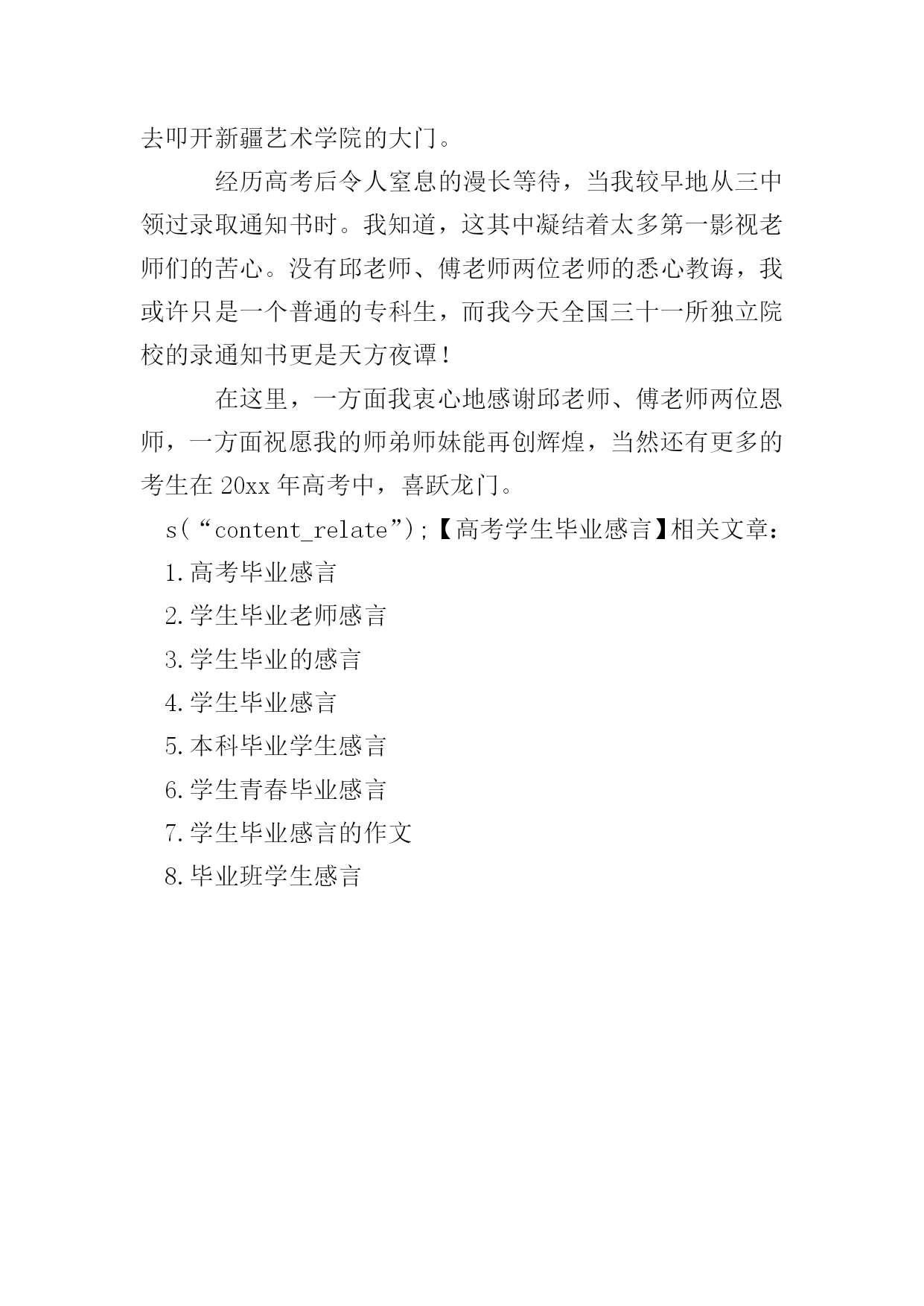 高考学生毕业感言20xx年高考已经渐行渐远,接踵而至的是各式各样学子们酬谢恩师的活动。我无心成为他们中的一员,却有意在静谧的夜里细细回味三年高中生活的苦辣酸咸。毋庸置疑,高中三年对于所有高中生来说,都是最为辛苦最为劳累的三年。日以继夜的埋头苦学,考验着每一位怀揣着大学梦的莘莘学子。无独有偶,我也像大多数同学一样,过着一种拼命三郎式的学习生活。但不知什么原因,每次考试名次,我都是从底下数,并且从不超过十位数。以至于我对“付出总有回报“这句经典名言的正确性产生了怀疑。长期以往的学习打击,让我怠于学业。网吧,滑冰场是彼时的我时常出现的地方。高考,大学对于那时的我来说是那么的遥不可及。赶巧学校那会儿又有很多的文艺活动。为了堂而皇之的逃课,我参加了每次的比赛。伴随着我各种荣誉证书的获得,是我文化课成绩的’直线下降。直至名次不在下跌,坏孩子终于练成。机遇总是不期而至,你能否慧眼独具果断地把握,将会影响你的一生。正当我准备混个毕业证,结束高中生活时,校领导推荐我去走影视高考这条路。出于无所谓的心理,我没有犹豫。但当我在试听的那几天中,我发现,那正是我的高考方式,正是我所适合的用艺术拼高考。幸运女神总是令人捉摸不透。没有给我过硬的成绩,却给了我两位伯乐。让我用影视去放飞久已深藏的大学梦,去叩开新疆艺术学院的大门。经历高考后令人窒息的漫长等待,当我较早地从三中领过录取通知书时。我知道,这其中凝结着太多第一影视老师们的苦心。没有邱老师、傅老师两位老师的悉心教诲,我或许只是一个普通的专科生,而我今天全国三十一所独立院校的录通知书更是天方夜谭!在这里,一方面我衷心地感谢邱老师、傅老师两位恩师,一方面祝愿我的师弟师妹能再创辉煌,当然还有更多的考生在20xx年高考中,喜跃龙门。s(“content_relate”);【高考学生毕业感言】相关文章:1.高考毕业感言2.学生毕业老师感言3.学生毕业的感言4.学生毕业感言5.本科毕业学生感言6.学生青春毕业感言7.学生毕业感言的作文8.毕业班学生感言