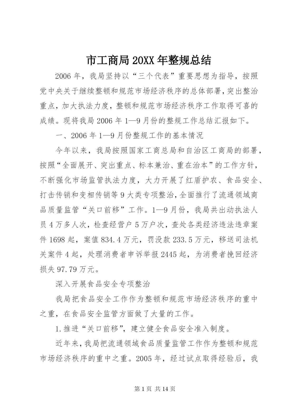 第PAGE\*Arabic\*MERGEFORMAT14页共NUMPAGES\*MERGEFORMAT14页市工商局20XX年整规总结2006年,我局坚持以“三个代表”重要思想为指导,按照党中央关于继续整顿和规范市场经济秩序的总体部署,突出整治重点,加大执法力度,整顿和规范市场经济秩序工作取得可喜的成绩。现将我局2006年1—9月份的整规工作总结汇报如下。一、2006年1—9月份整规工作的基本情况今年以来,我局按照国家工商总局和自治区工商局的部署,按照“全面展开、突出重点、标本兼治、重在治本”的工作方针,不断强化市场监管执法力度,大力开展了红盾护农、食品安全、打击传销和变相传销等9大类专项整治,全面推行了流通领域商品质量监管“关口前移”工作。1—9月份,我局共出动执法人员4万多人次,检查经营户5万户次,查处各类经济违法违章案件1698起,案值834.4万元,罚没款233.5万元,移送司法机关案件4起,处理消费者申诉举报2445起,为消费者挽回经济损失97.79万元。深入开展食品安全专项整治我局把食品安全工作作为整顿和规范市场经济秩序的重中之重,在食品安全监管方面做了大量的工作。1.推进“关口前移”,建立健全食品安全准入制度。近年来,我局把流通领域食品质量监管工作作为整顿和规范市场经济秩序的重中之重。2005年,经过试点取得经验后,我局在全市食品行业全面推行流通领域商品质量监管“关口前移”工作,我们通过督促食品经营户建立了进货检查验收制度、购销台帐制度、销售食品质量承诺制度、流通环节食品退市制度等有关制度,把住食品进入市场的关口,构筑食品安全的防线。对不能提供有效营业执照、卫生许可证、商标注册、产品检验报告以及购货票等相关证件的商品,全面要拒绝进货、进场。同时,为了使食品质量监管工作制度化、规范化,今年,结合我市食品市场监管的实际,我局制定了、、、、等五项制度,要求各分局、工商所严格按照有关制度的要求,规范日常的食品安全监督管理工作。目前,我市各类食品批发市场、商场、超市、食品经营户建立了食品进货检查验收制度,购销台帐制度、食品质量承诺制度、食品退市制度等自律制度的达到85%以上,各类食品经营户企业亮照经营率达100%,工商所实施经营户口管理和巡查责任制达100%。食品监管初步建立了流通环节食品安全行政执法、企业自律、社会监督“三位一体”的监管机制。2.加大执法力度,严厉打击食品违法行为。加强日常的巡查,认真开展“六查六看”。一是查经营资格,看证照是否齐全,是否属超范围经营;二是查进货票证,看来源是否合法、票证是否齐全,进货是否履行了检查验收职责;三是查经销食品,看有无质量、卫生检验检疫合格等证明;四是查包装标识,看标识是否虚假,是否属“三无”、仿冒或过期失效食品;五是查商标广告,看食品商标是否侵犯他人注册商标专用权,食品广告有无虚假、误导宣传等内容;六是查市场开办者,看管理制度是否健全,是否对进场经营者履行了资格审查、质量监督等责任。工商所每星期对辖区内的食品经营户的检查不得少于2次,对“六查六看”中发现的问题,要及时依法查处。扎实开展专项整治。今年以来,我局根据自治区工商局的部署和XX市的消费特点,开展了食品安全三次集中整治行动,分别是:包装食品安全专项执法检查;农产品、水产品、畜产品安全专项执法检查;重点市场重点区域食品安全专项执法检查。在专项整治工作中,主要抓好三个重点环节:一是加大对分散在社区、城乡结合部和村镇的食品批发市场、集贸市场、小加工作坊、小食店、小餐馆的监管力度;二是严把市场准入关,严厉打击无照经营食品的违法行为;三是依托12315网络,建立食品消费安全预警机制,及时查处损害消费者权益的违法行为。在今年1—9月份的食品质量监管工作中,我局共出动执法人员25349人次,车辆6156台次,检查食品经营户4万多户次,共取缔无照经营食品217户,查获私宰肉3478公斤,劣质酒类、饮料7547瓶,劣质奶制品125.8公斤,过期变质的饼干、糖果等食品一大批。加强对上市食品的检测工作。一是快速检测。我局投入资金30多万元购置了食品快速检测车,可检测的项目包括农药残留超标、吊白块等8大项;每个分局还配备了食品快速检测箱,定期不定期地对我市的上市食品进行快速检测。到9月份止,我局共出动工商食品快速检测车120多车次,检测蔬菜农药残留、豆制品吊白块等项目268批次500多个品种,检出农药残留超标蔬菜173.5公斤、含吊白块豆制品195.8公斤,甲醛超标水产品32.6公斤。二是定期检测。根据流通领域商品质量存在的问题、人民群众集中反映的商品质量投诉情况以及消费的季节性特点,每月制定食品检测计划。如今年7月份是检测饮料类,主要检验项目包括菌落总数、大肠菌群、蛋白质等。通过有重点、步骤地开展商品质量抽查,并及