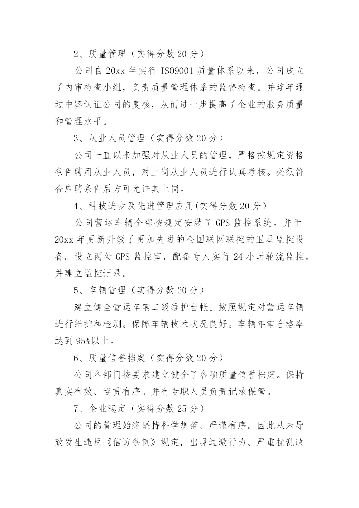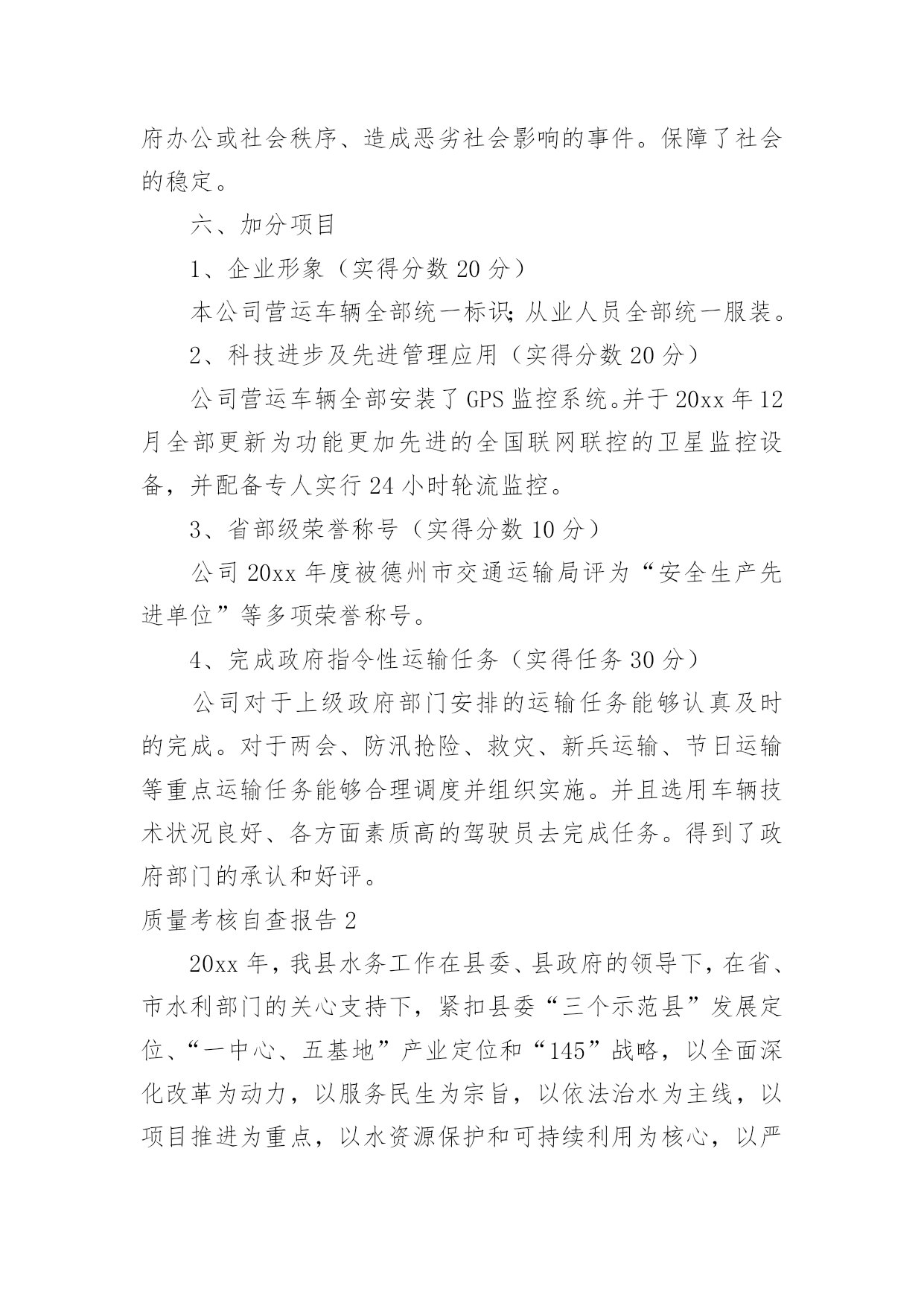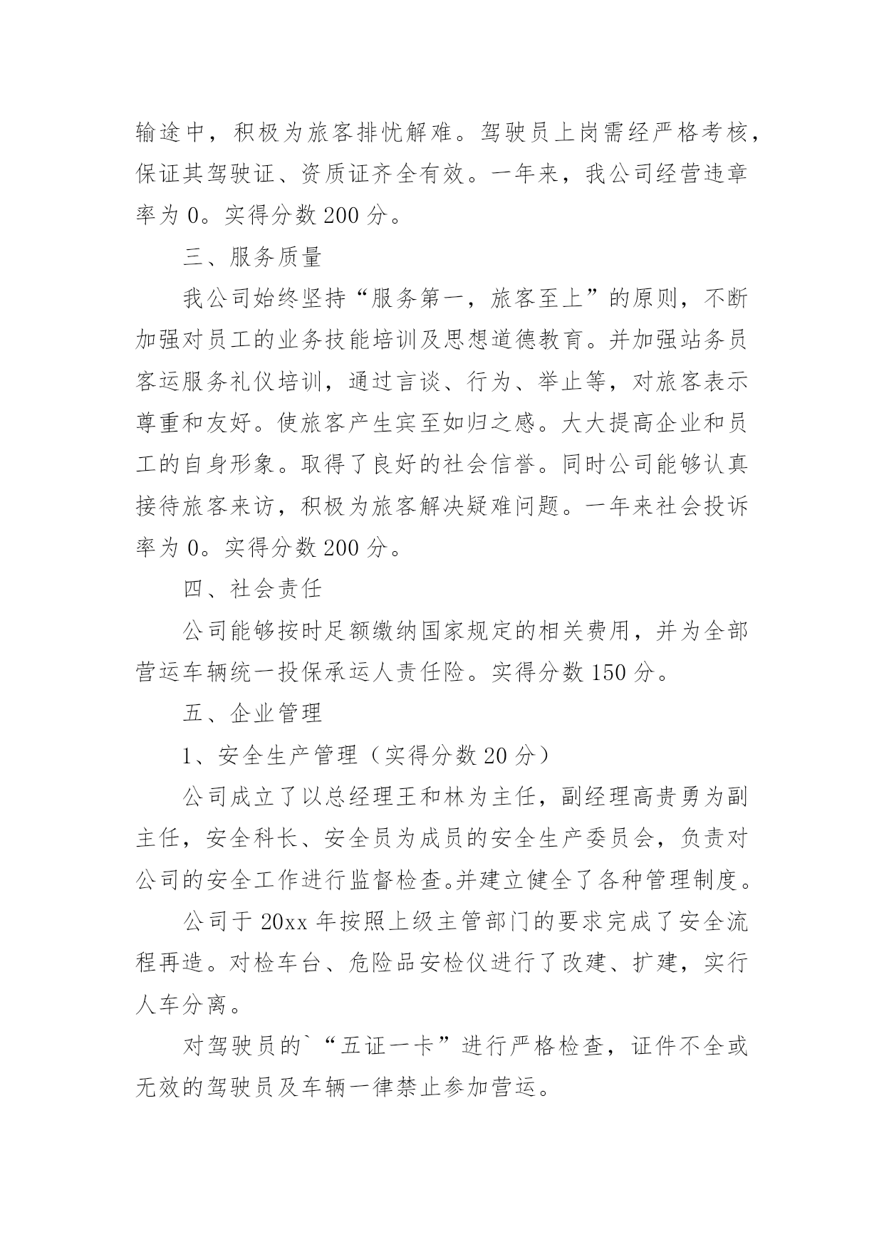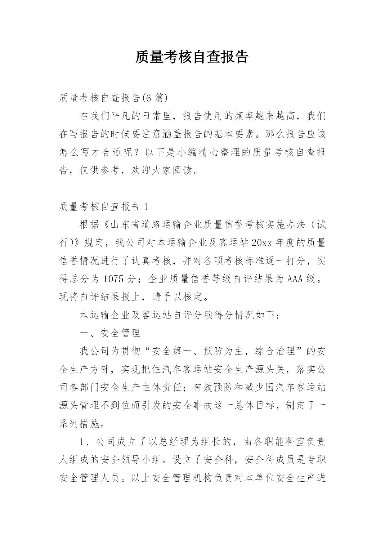 质量考核自查报告质量考核自查报告(6篇)在我们平凡的日常里,报告使用的频率越来越高,我们在写报告的时候要注意涵盖报告的基本要素。那么报告应该怎么写才合适呢?以下是小编精心整理的质量考核自查报告,仅供参考,欢迎大家阅读。质量考核自查报告1根据《山东省道路运输企业质量信誉考核实施办法(试行)》规定,我公司对本运输企业及客运站20xx年度的质量信誉情况进行了认真考核,并对各项考核标准逐一打分,实得总分为1075分;企业质量信誉等级自评结果为AAA级。现将自评结果报上,请予以核定。本运输企业及客运站自评分项得分情况如下:一、安全管理我公司为贯彻“安全第一、预防为主,综合治理”的安全生产方针,实现把住汽车客运站安全生产源头关,落实公司各部门安全生产主体责任;有效预防和减少因汽车客运站源头管理不到位而引发的安全事故这一总体目标,制定了一系列措施。1、公司成立了以总经理为组长的,由各职能科室负责人组成的安全领导小组。设立了安全科,安全科成员是专职安全管理人员。以上安全管理机构负责对本单位安全生产进行管理、指导、监督、检查。2、落实安全生产责任制.层层分解安全生产主体责任,落实安全生产目标,逐级签订安全生产目标责任书,建立安全生产目标管理体系,并逐级建立安全生产责任追究制。3、按规定提取和使用安全生产经费,确保资金投入满足安全生产条件;按规定存储安全生产风险抵押金;依法为从业人员缴纳工伤保险费。依法为从业人员提供防护用品,并监督教育其正确佩戴和使用。4、公司定期组织所有员工及驾驶员召开安全会议。对从业人员进行安全知识培训,贯彻传达政府部门有关安全生产方面的文件、政策。不断提高所有从业人员的安全意识,充实安全知识。5、按照上级主管部门的规定,实施了安全流程再造。建立健全了公司各岗位的安全生产制度。扩建、完善了安全生产所需的设施设备。公司通过以上措施的制定与实施,在20xx年度,实现了交通肇事率为0,交通责任事故伤亡率为0,交通事故伤人率为0。实得分数300分。二、经营行为公司不断加强对驾乘人员的管理。督促其严格执行“三不进站、六不出站”规定,遵守《客运安全告知制度》以及其他相关制度及客规。并保障营运车辆的正班正点率。坚决杜绝倒客、甩客、宰客、私抬票价现象的发生。教育驾乘人员文明服务、礼貌待客,避免“冷、横、硬”的态度。在运输途中,积极为旅客排忧解难。驾驶员上岗需经严格考核,保证其驾驶证、资质证齐全有效。一年来,我公司经营违章率为0。实得分数200分。三、服务质量我公司始终坚持“服务第一,旅客至上”的原则,不断加强对员工的业务技能培训及思想道德教育。并加强站务员客运服务礼仪培训,通过言谈、行为、举止等,对旅客表示尊重和友好。使旅客产生宾至如归之感。大大提高企业和员工的自身形象。取得了良好的社会信誉。同时公司能够认真接待旅客来访,积极为旅客解决疑难问题。一年来社会投诉率为0。实得分数200分。四、社会责任公司能够按时足额缴纳国家规定的相关费用,并为全部营运车辆统一投保承运人责任险。实得分数150分。五、企业管理1、安全生产管理(实得分数20分)公司成立了以总经理王和林为主任,副经理高贵勇为副主任,安全科长、安全员为成员的安全生产委员会,负责对公司的安全工作进行监督检查。并建立健全了各种管理制度。公司于20xx年按照上级主管部门的要求完成了安全流程再造。对检车台、危险品安检仪进行了改建、扩建,实行人车分离。对驾驶员的`“五证一卡”进行严格检查,证件不全或无效的驾驶员及车辆一律禁止参加营运。2、质量管理(实得分数20分)公司自20xx年实行ISO9001质量体系以来,公司成立了内审检查小组,负责质量管理体系的监督检查。并连年通过中鉴认证公司的复核,从而进一步提高了企业的服务质量和管理水平。3、从业人员管理(实得分数20分)公司一直以来加强对从业人员的管理,严格按规定资格条件聘用从业人员,对上岗从业人员进行认真考核。必须符合应聘条件后方可允许其上岗。4、科技进步及先进管理应用(实得分数20分)公司营运车辆全部按规定安装了GPS监控系统。并于20xx年更新升级了更加先进的全国联网联控的卫星监控设备。设立两处GPS监控室,配备专人实行24小时轮流监控。并建立监控记录。5、车辆管理(实得分数20分)建立健全营运车辆二级维护台帐。按照规定对营运车辆进行维护和检测。保障车辆技术状况良好。车辆年审合格率达到95%以上。6、质量信誉档案(实得分数20分)公司各部门按要求建立健全了各项质量信誉档案。保持真实有效、连贯有序。并有专职人员负责记录保管。7、企业稳定(实得分数25分)公司的管理始终坚持科学规范、严谨有序。因此从未导致发生违反《信访条例》规定,出现过激行为、严重扰乱政府办公或社会秩序、造成恶劣社会影响的事件。保障了社会的稳定。六、加分项目1、企业形象(实得分