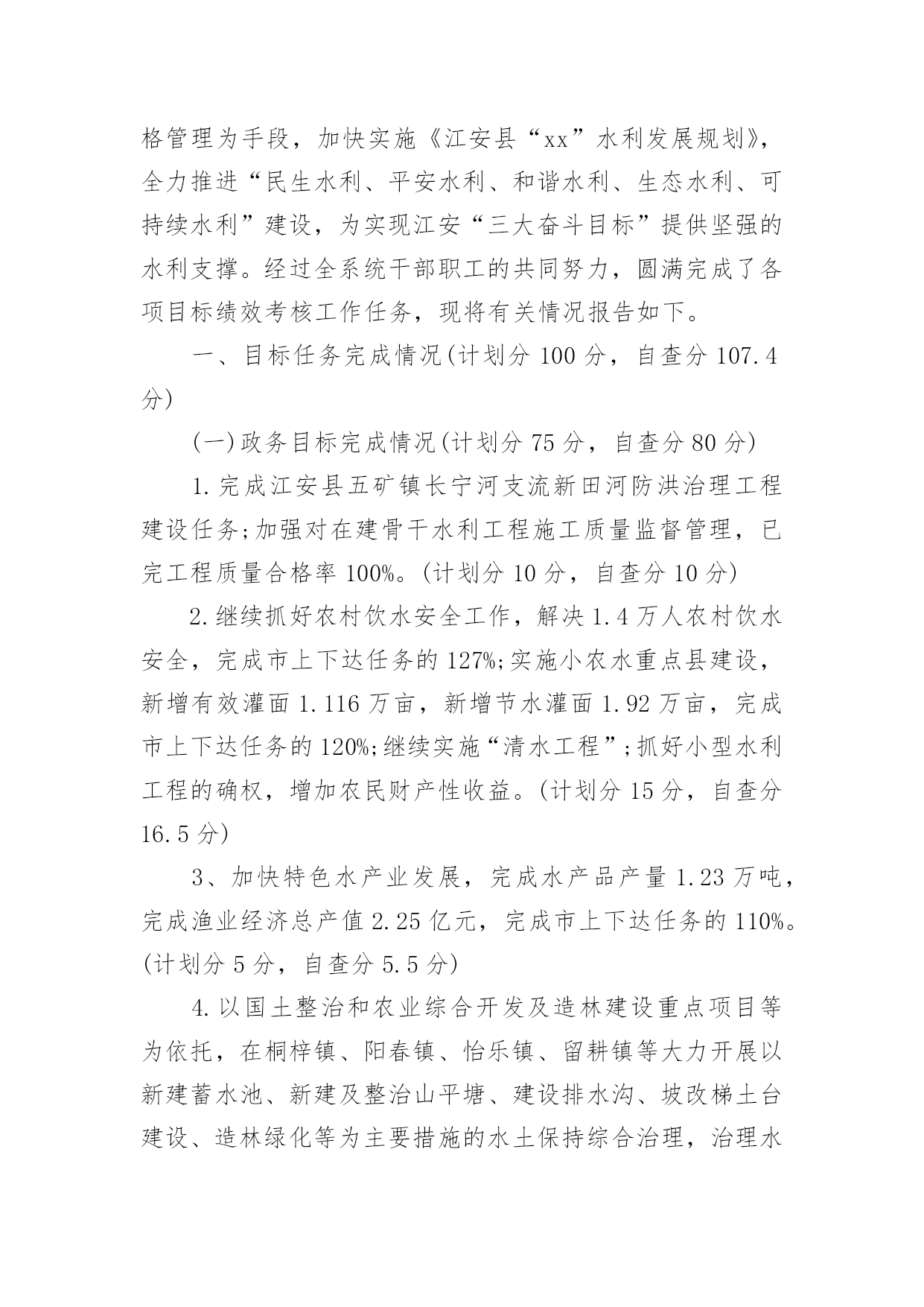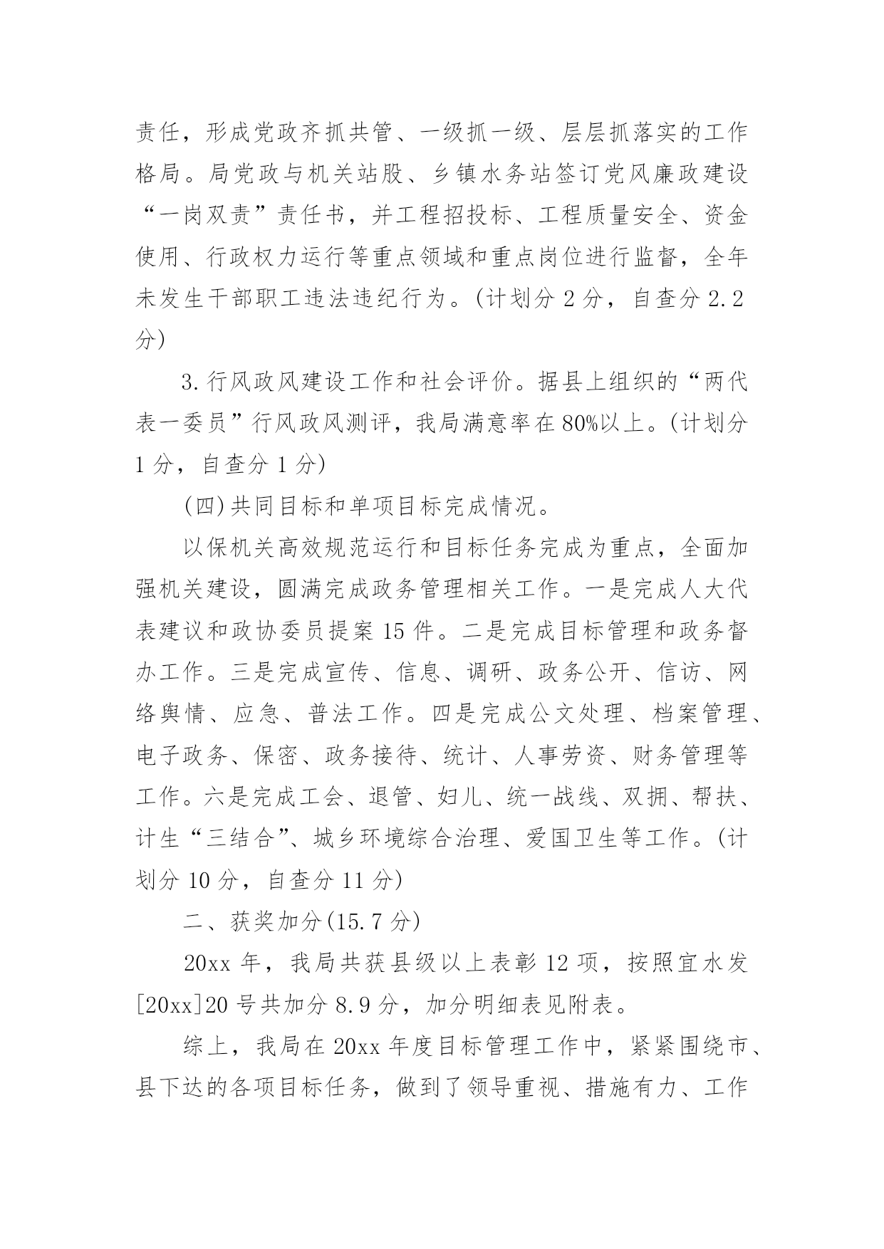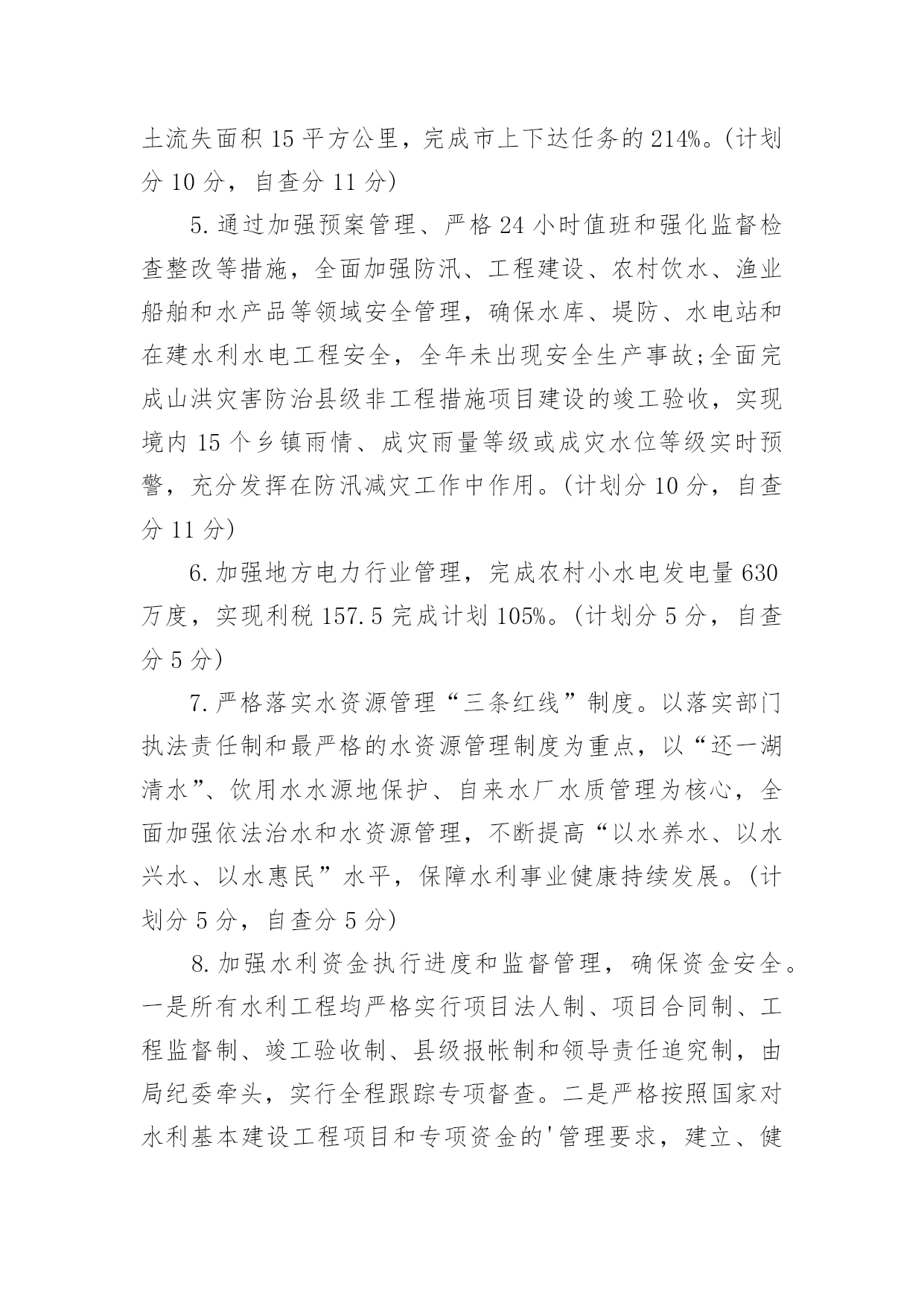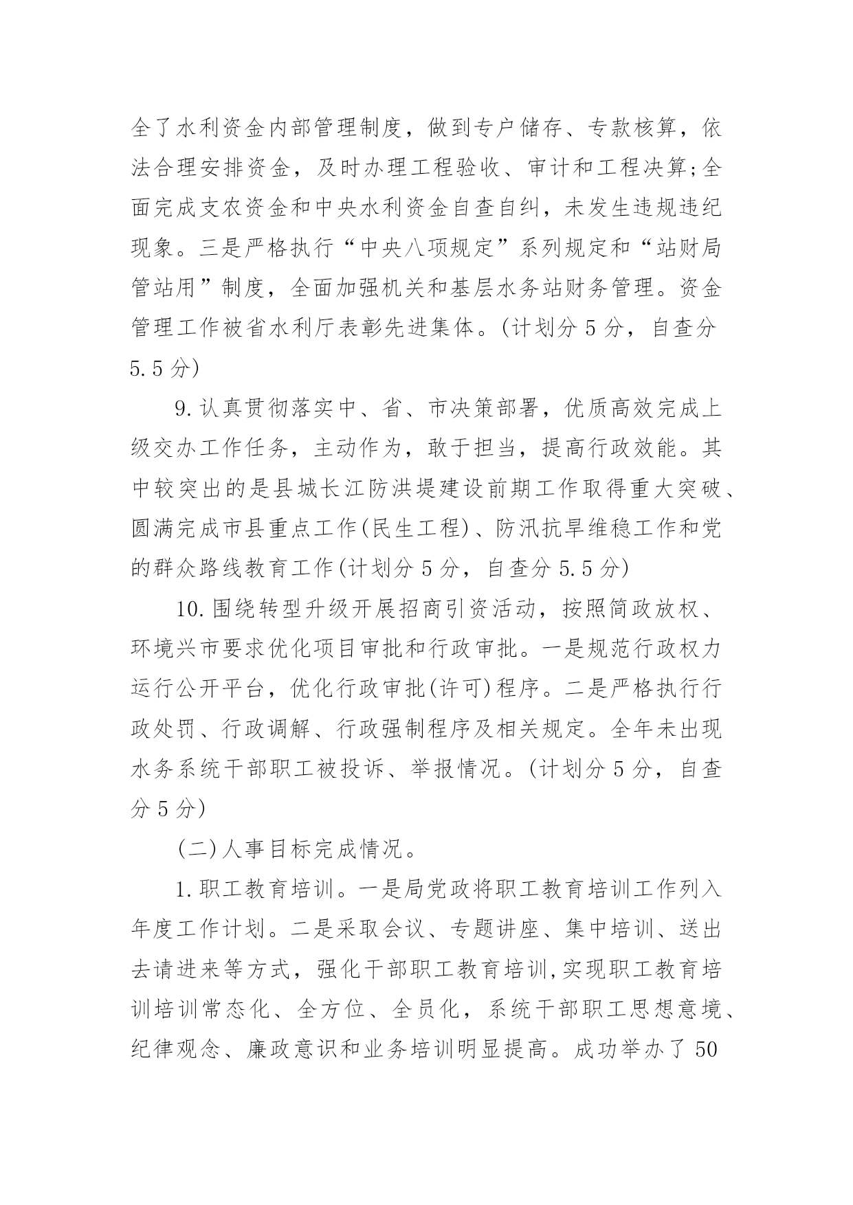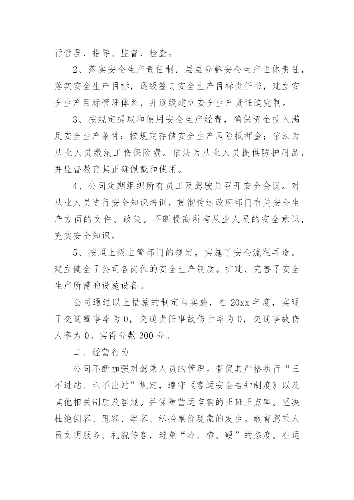 质量考核自查报告质量考核自查报告(6篇)在我们平凡的日常里,报告使用的频率越来越高,我们在写报告的时候要注意涵盖报告的基本要素。那么报告应该怎么写才合适呢?以下是小编精心整理的质量考核自查报告,仅供参考,欢迎大家阅读。质量考核自查报告1根据《山东省道路运输企业质量信誉考核实施办法(试行)》规定,我公司对本运输企业及客运站20xx年度的质量信誉情况进行了认真考核,并对各项考核标准逐一打分,实得总分为1075分;企业质量信誉等级自评结果为AAA级。现将自评结果报上,请予以核定。本运输企业及客运站自评分项得分情况如下:一、安全管理我公司为贯彻“安全第一、预防为主,综合治理”的安全生产方针,实现把住汽车客运站安全生产源头关,落实公司各部门安全生产主体责任;有效预防和减少因汽车客运站源头管理不到位而引发的安全事故这一总体目标,制定了一系列措施。1、公司成立了以总经理为组长的,由各职能科室负责人组成的安全领导小组。设立了安全科,安全科成员是专职安全管理人员。以上安全管理机构负责对本单位安全生产进行管理、指导、监督、检查。2、落实安全生产责任制.层层分解安全生产主体责任,落实安全生产目标,逐级签订安全生产目标责任书,建立安全生产目标管理体系,并逐级建立安全生产责任追究制。3、按规定提取和使用安全生产经费,确保资金投入满足安全生产条件;按规定存储安全生产风险抵押金;依法为从业人员缴纳工伤保险费。依法为从业人员提供防护用品,并监督教育其正确佩戴和使用。4、公司定期组织所有员工及驾驶员召开安全会议。对从业人员进行安全知识培训,贯彻传达政府部门有关安全生产方面的文件、政策。不断提高所有从业人员的安全意识,充实安全知识。5、按照上级主管部门的规定,实施了安全流程再造。建立健全了公司各岗位的安全生产制度。扩建、完善了安全生产所需的设施设备。公司通过以上措施的制定与实施,在20xx年度,实现了交通肇事率为0,交通责任事故伤亡率为0,交通事故伤人率为0。实得分数300分。二、经营行为公司不断加强对驾乘人员的管理。督促其严格执行“三不进站、六不出站”规定,遵守《客运安全告知制度》以及其他相关制度及客规。并保障营运车辆的正班正点率。坚决杜绝倒客、甩客、宰客、私抬票价现象的发生。教育驾乘人员文明服务、礼貌待客,避免“冷、横、硬”的态度。在运输途中,积极为旅客排忧解难。驾驶员上岗需经严格考核,保证其驾驶证、资质证齐全有效。一年来,我公司经营违章率为0。实得分数200分。三、服务质量我公司始终坚持“服务第一,旅客至上”的原则,不断加强对员工的业务技能培训及思想道德教育。并加强站务员客运服务礼仪培训,通过言谈、行为、举止等,对旅客表示尊重和友好。使旅客产生宾至如归之感。大大提高企业和员工的自身形象。取得了良好的社会信誉。同时公司能够认真接待旅客来访,积极为旅客解决疑难问题。一年来社会投诉率为0。实得分数200分。四、社会责任公司能够按时足额缴纳国家规定的相关费用,并为全部营运车辆统一投保承运人责任险。实得分数150分。五、企业管理1、安全生产管理(实得分数20分)公司成立了以总经理王和林为主任,副经理高贵勇为副主任,安全科长、安全员为成员的安全生产委员会,负责对公司的安全工作进行监督检查。并建立健全了各种管理制度。公司于20xx年按照上级主管部门的要求完成了安全流程再造。对检车台、危险品安检仪进行了改建、扩建,实行人车分离。对驾驶员的`“五证一卡”进行严格检查,证件不全或无效的驾驶员及车辆一律禁止参加营运。2、质量管理(实得分数20分)公司自20xx年实行ISO9001质量体系以来,公司成立了内审检查小组,负责质量管理体系的监督检查。并连年通过中鉴认证公司的复核,从而进一步提高了企业的服务质量和管理水平。3、从业人员管理(实得分数20分)公司一直以来加强对从业人员的管理,严格按规定资格条件聘用从业人员,对上岗从业人员进行认真考核。必须符合应聘条件后方可允许其上岗。4、科技进步及先进管理应用(实得分数20分)公司营运车辆全部按规定安装了GPS监控系统。并于20xx年更新升级了更加先进的全国联网联控的卫星监控设备。设立两处GPS监控室,配备专人实行24小时轮流监控。并建立监控记录。5、车辆管理(实得分数20分)建立健全营运车辆二级维护台帐。按照规定对营运车辆进行维护和检测。保障车辆技术状况良好。车辆年审合格率达到95%以上。6、质量信誉档案(实得分数20分)公司各部门按要求建立健全了各项质量信誉档案。保持真实有效、连贯有序。并有专职人员负责记录保管。7、企业稳定(实得分数25分)公司的管理始终坚持科学规范、严谨有序。因此从未导致发生违反《信访条例》规定,出现过激行为、严重扰乱政府办公或社会秩序、造成恶劣社会影响的事件。保障了社会的稳定。六、加分项目1、企业形象(实得分