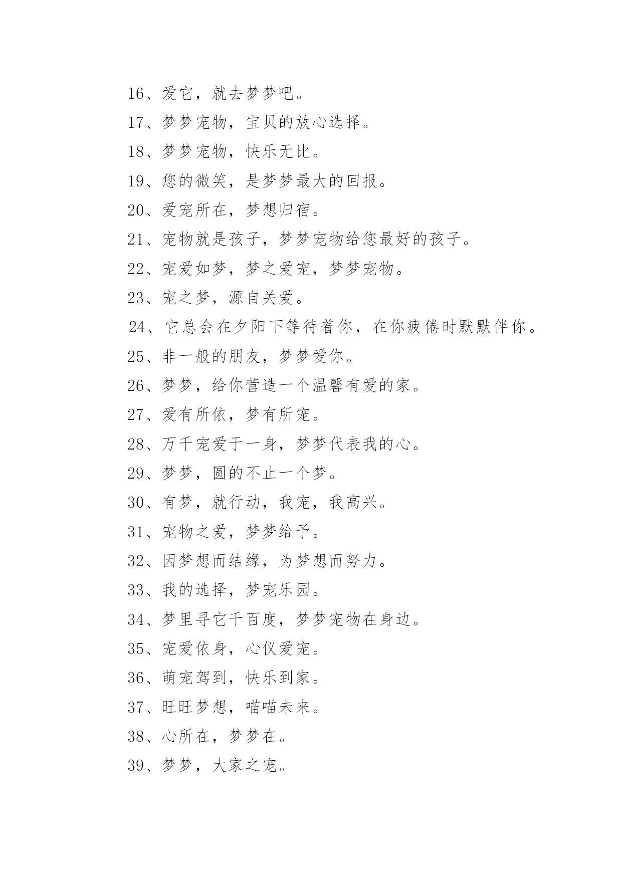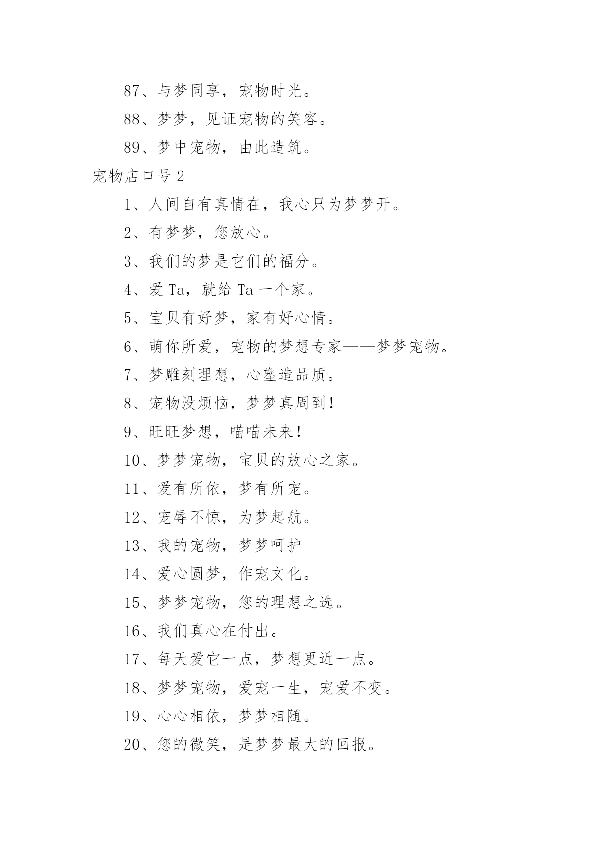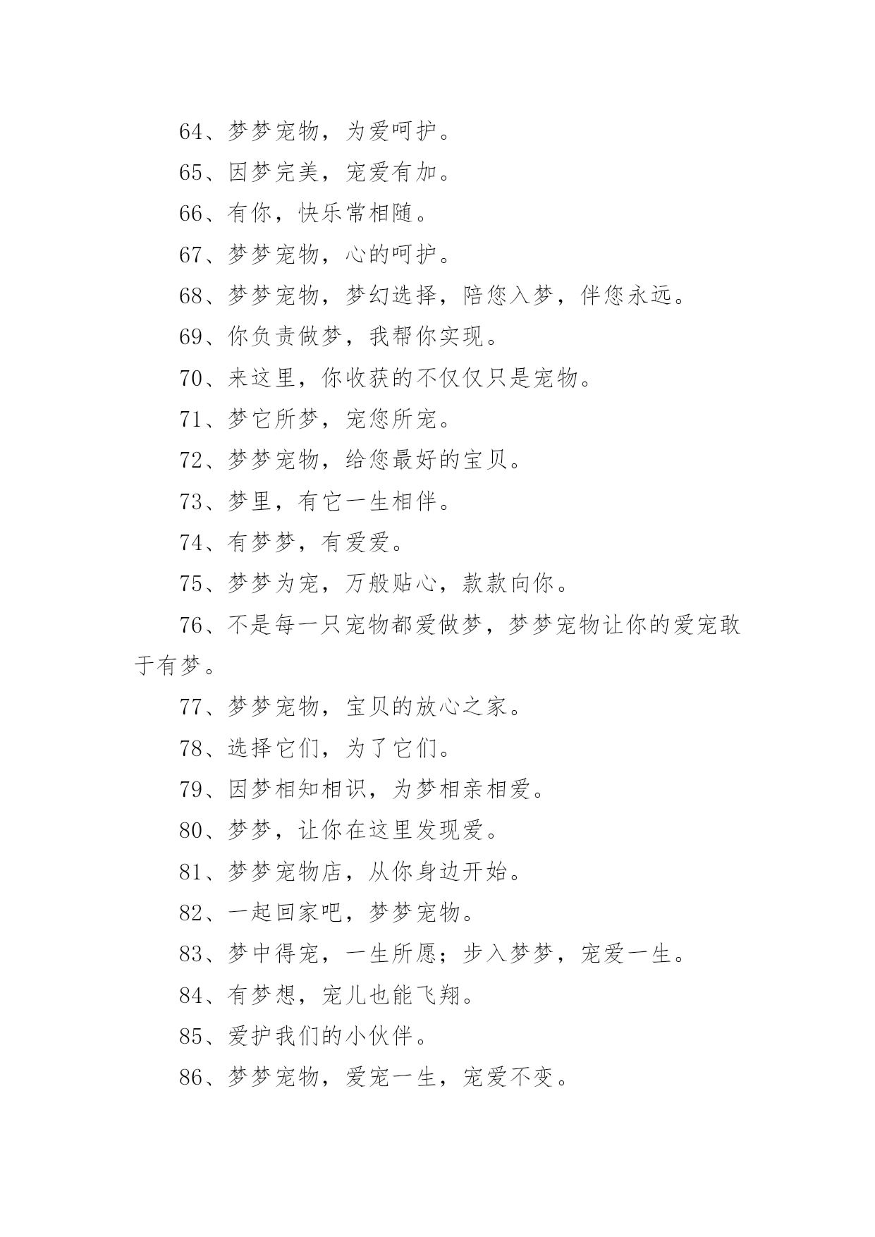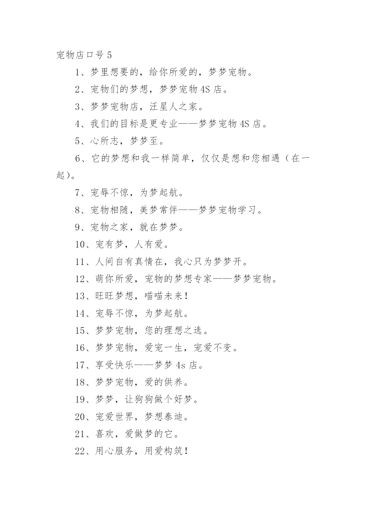 宠物店口号宠物店口号汇编5篇在生活、工作和学习中,大家都不可避免地会接触到口号吧,口号的作用是便于“造势”,形成一种氛围。那么什么样的口号才是好的口号呢?下面是小编精心整理的宠物店口号,供大家参考借鉴,希望可以帮助到有需要的朋友。宠物店口号11、宠物没烦恼,梦梦真周到。2、一切期待,尽在梦梦宠物。3、可能,这是最好的宠物店。4、摇曳着梦幻的光环,蕴含优秀团队文化。5、宠物之家,快乐之家。6、爱上梦家更爱它。7、梦梦圆梦,相伴永远。8、梦梦宠物,您的理想之选。9、因爱相知相识,为梦相亲相爱。10、每一天,每一刻,我们都在为您打造完美。11、宠物世界,梦幻天堂。12、享受自然的和谐,尽在梦梦宠物。13、用爱缔造梦想,萌宠一生相伴。14、我们的梦是它们的福分。15、宠物常伴您,健康来梦梦。16、爱它,就去梦梦吧。17、梦梦宠物,宝贝的放心选择。18、梦梦宠物,快乐无比。19、您的微笑,是梦梦最大的回报。20、爱宠所在,梦想归宿。21、宠物就是孩子,梦梦宠物给您最好的孩子。22、宠爱如梦,梦之爱宠,梦梦宠物。23、宠之梦,源自关爱。24、它总会在夕阳下等待着你,在你疲倦时默默伴你。25、非一般的朋友,梦梦爱你。26、梦梦,给你营造一个温馨有爱的家。27、爱有所依,梦有所宠。28、万千宠爱于一身,梦梦代表我的心。29、梦梦,圆的不止一个梦。30、有梦,就行动,我宠,我高兴。31、宠物之爱,梦梦给予。32、因梦想而结缘,为梦想而努力。33、我的选择,梦宠乐园。34、梦里寻它千百度,梦梦宠物在身边。35、宠爱依身,心仪爱宠。36、萌宠驾到,快乐到家。37、旺旺梦想,喵喵未来。38、心所在,梦梦在。39、梦梦,大家之宠。40、梦梦宠物,一生呵护。41、梦梦宠物,用爱呵护。42、梦梦,因爱而宠。43、用真诚的服务,换您完美的微笑。44、做事先做人,为爱来梦梦。45、梦梦宠物,爱的关怀。46、宠有梦,人有爱。47、梦在前行,唯爱宠物。48、它们的梦想,我们来实现。49、用百分百的爱和百分百的专业,给您百分百的放心。50、梦梦,给宠物一个温暖的家。51、梦梦宠物,绝对贵族。52、梦梦宠物店,爱心永不变。53、梦梦泰迪熊,萌萌您爱宠。54、梦的世界,爱的小窝。55、一梦一世界,一宠一天堂。56、健康宠物,梦梦最好。57、宠爱,仅仅一份给予;信任,从来都是梦梦。58、倾听宠物的好声音,就在梦梦,相信我们的实力。59、梦里想要的,给你所爱的,梦梦宠物。60、梦你所梦,宠你所宠。61、爱你所爱,梦你所梦,伴你一生。62、宠之所意,梦之所至。63、心之所宠,梦梦圆梦。64、梦梦宠物,为爱呵护。65、因梦完美,宠爱有加。66、有你,快乐常相随。67、梦梦宠物,心的呵护。68、梦梦宠物,梦幻选择,陪您入梦,伴您永远。69、你负责做梦,我帮你实现。70、来这里,你收获的不仅仅只是宠物。71、梦它所梦,宠您所宠。72、梦梦宠物,给您最好的宝贝。73、梦里,有它一生相伴。74、有梦梦,有爱爱。75、梦梦为宠,万般贴心,款款向你。76、不是每一只宠物都爱做梦,梦梦宠物让你的爱宠敢于有梦。77、梦梦宠物,宝贝的放心之家。78、选择它们,为了它们。79、因梦相知相识,为梦相亲相爱。80、梦梦,让你在这里发现爱。81、梦梦宠物店,从你身边开始。82、一起回家吧,梦梦宠物。83、梦中得宠,一生所愿;步入梦梦,宠爱一生。84、有梦想,宠儿也能飞翔。85、爱护我们的小伙伴。86、梦梦宠物,爱宠一生,宠爱不变。87、与梦同享,宠物时光。88、梦梦,见证宠物的笑容。89、梦中宠物,由此造筑。宠物店口号21、人间自有真情在,我心只为梦梦开。2、有梦梦,您放心。3、我们的梦是它们的福分。4、爱Ta,就给Ta一个家。5、宝贝有好梦,家有好心情。6、萌你所爱,宠物的梦想专家——梦梦宠物。7、梦雕刻理想,心塑造品质。8、宠物没烦恼,梦梦真周到!9、旺旺梦想,喵喵未来!10、梦梦宠物,宝贝的放心之家。11、爱有所依,梦有所宠。12、宠辱不惊,为梦起航。13、我的宠物,梦梦呵护14、爱心圆梦,作宠文化。15、梦梦宠物,您的理想之选。16、我们真心在付出。17、每天爱它一点,梦想更近一点。18、梦梦宠物,爱宠一生,宠爱不变。19、心心相依,梦梦相随。20、您的微笑,是梦梦最大的回报。21、爱让我们相遇,梦让我们相聚。22、宠物相随,美梦常伴——梦梦宠物学习。23、享受快乐——梦梦4s店。24、狗文化,够文化——梦梦宠物。25、梦梦宠物,爱的供养。26、宠有梦,人有爱。27、梦梦,让狗狗做个好梦。28、宠爱世界,梦想泰迪。29、喜欢,爱做梦的它。30、用心服务,用爱构筑!31、苟富贵,勿相忘——梦梦宠物4S店。32、梦里想要的,给你所爱的,梦梦宠物。33、因为是你,梦才真实!34、选择梦梦,拥有好品