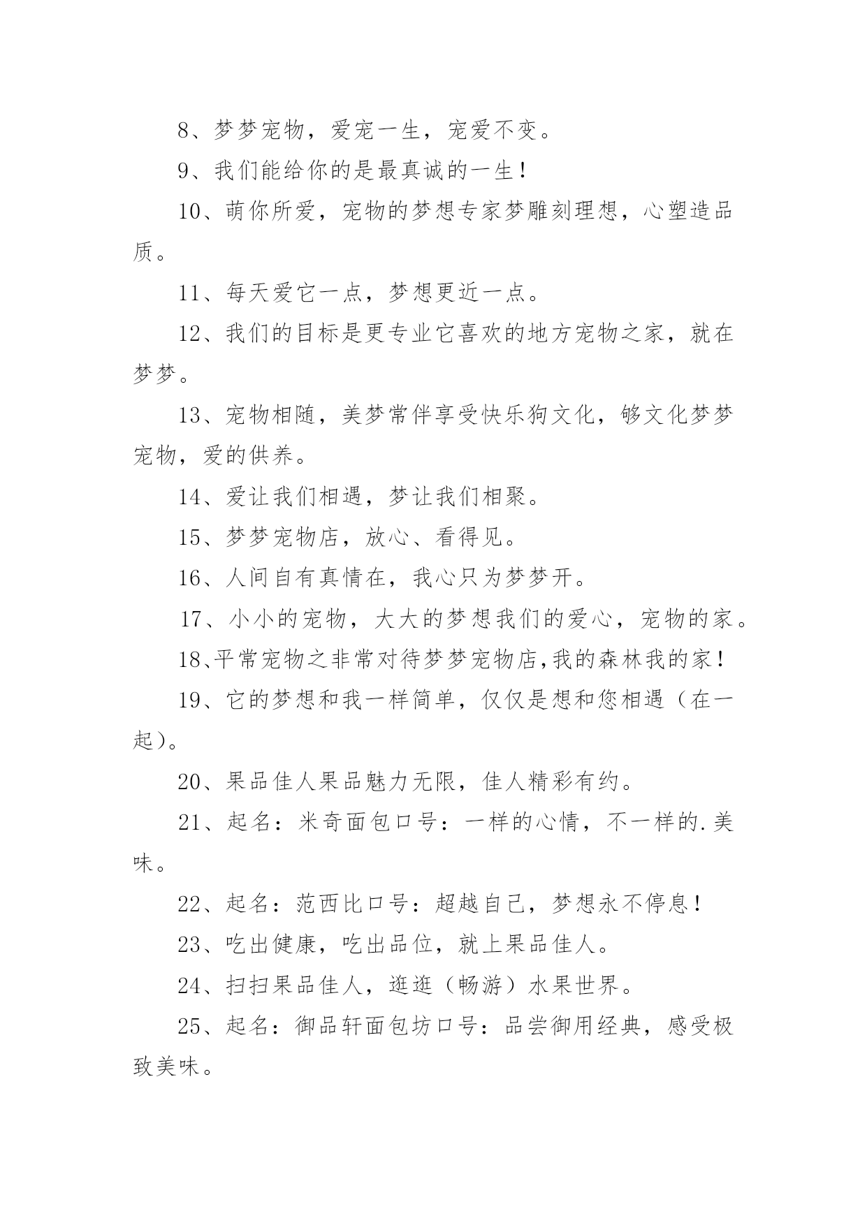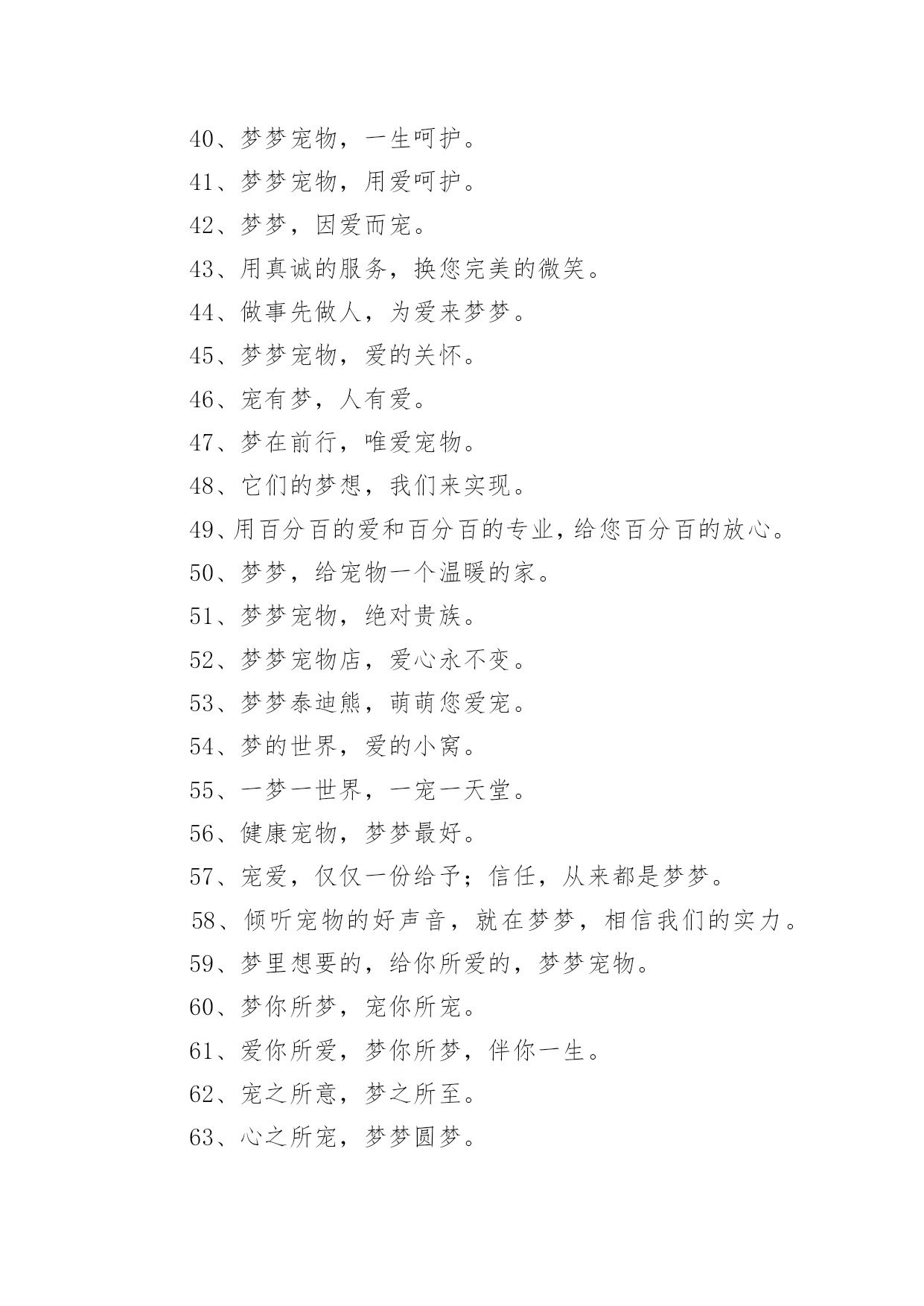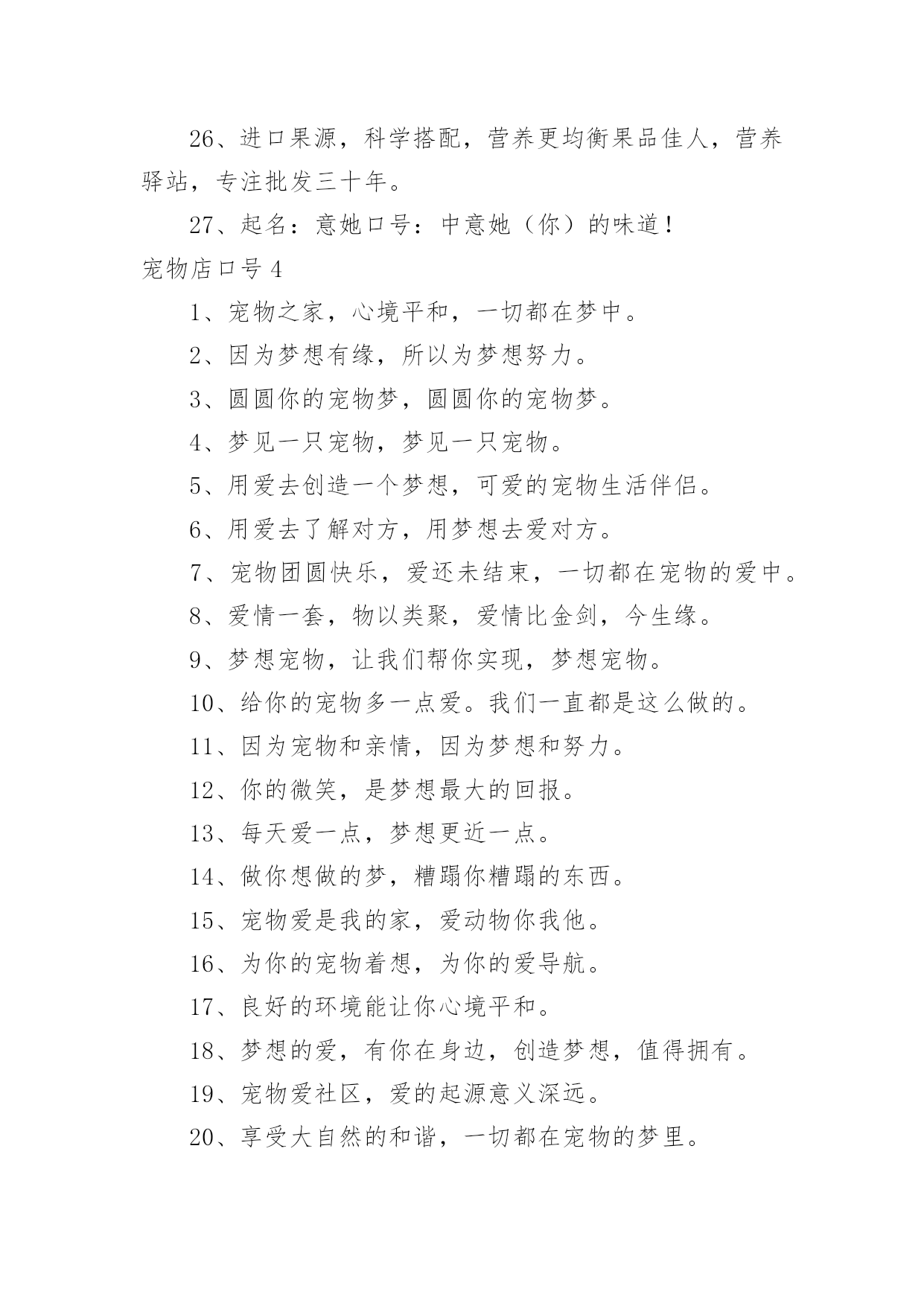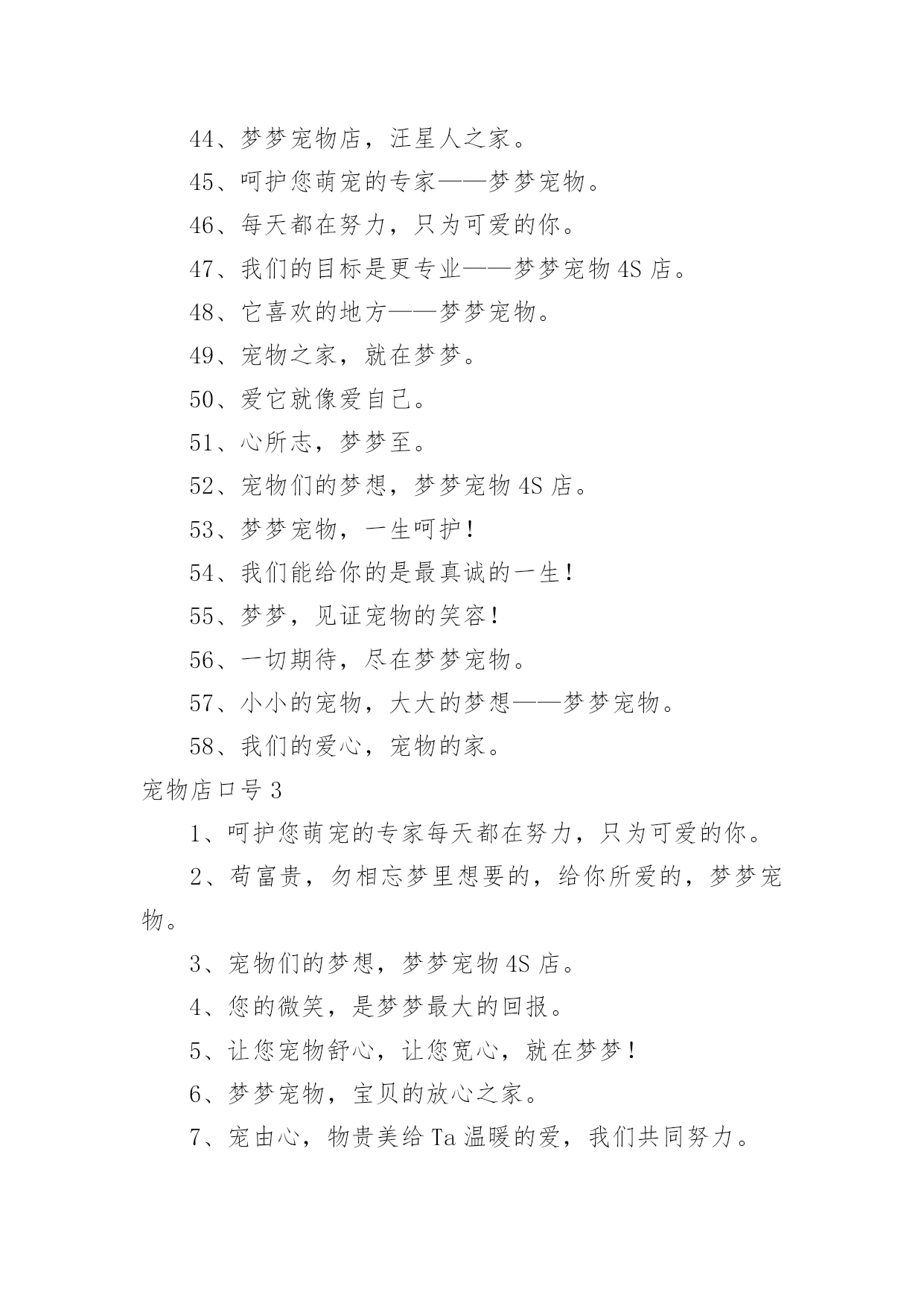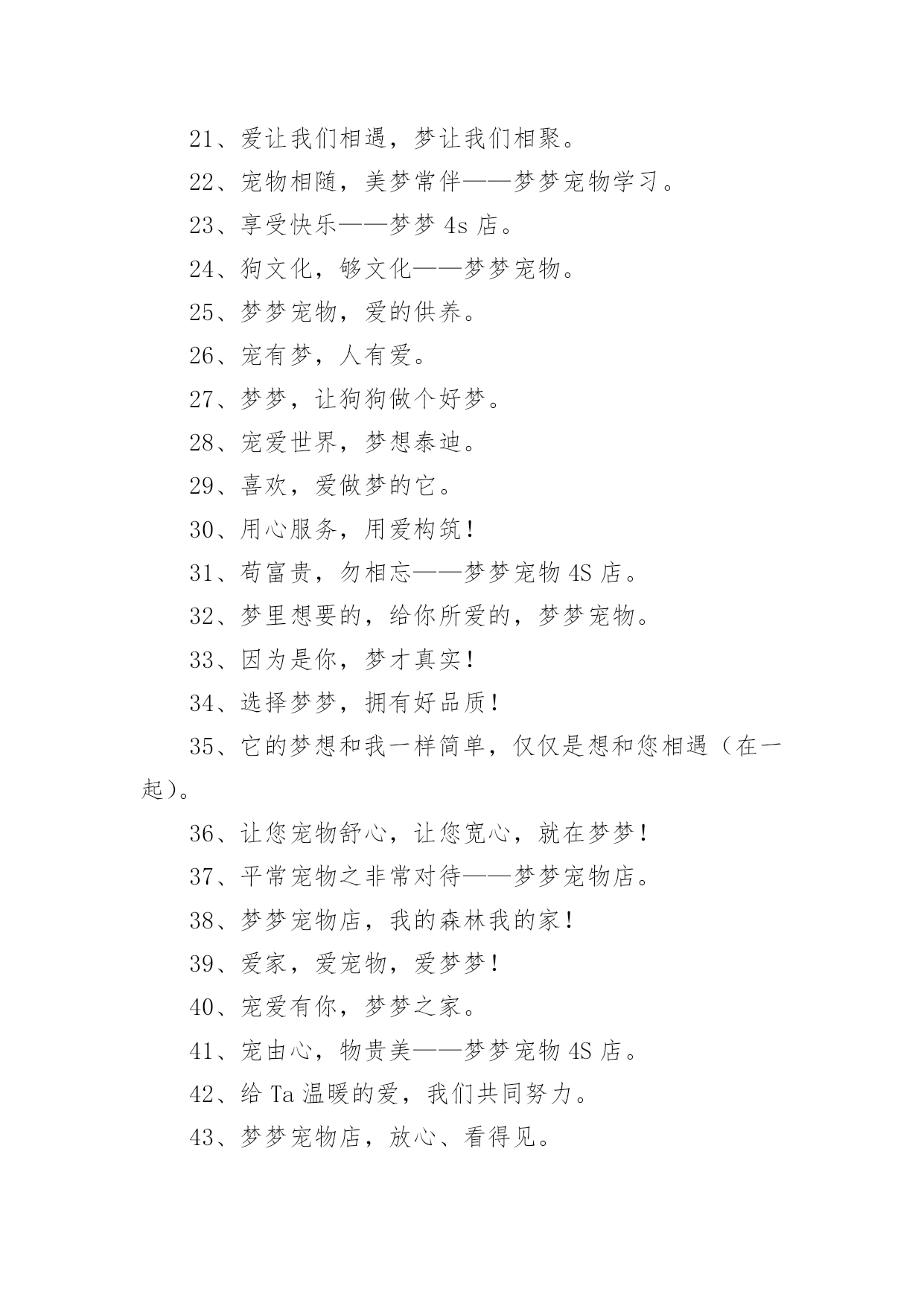 宠物店口号宠物店口号汇编5篇在生活、工作和学习中,大家都不可避免地会接触到口号吧,口号的作用是便于“造势”,形成一种氛围。那么什么样的口号才是好的口号呢?下面是小编精心整理的宠物店口号,供大家参考借鉴,希望可以帮助到有需要的朋友。宠物店口号11、宠物没烦恼,梦梦真周到。2、一切期待,尽在梦梦宠物。3、可能,这是最好的宠物店。4、摇曳着梦幻的光环,蕴含优秀团队文化。5、宠物之家,快乐之家。6、爱上梦家更爱它。7、梦梦圆梦,相伴永远。8、梦梦宠物,您的理想之选。9、因爱相知相识,为梦相亲相爱。10、每一天,每一刻,我们都在为您打造完美。11、宠物世界,梦幻天堂。12、享受自然的和谐,尽在梦梦宠物。13、用爱缔造梦想,萌宠一生相伴。14、我们的梦是它们的福分。15、宠物常伴您,健康来梦梦。16、爱它,就去梦梦吧。17、梦梦宠物,宝贝的放心选择。18、梦梦宠物,快乐无比。19、您的微笑,是梦梦最大的回报。20、爱宠所在,梦想归宿。21、宠物就是孩子,梦梦宠物给您最好的孩子。22、宠爱如梦,梦之爱宠,梦梦宠物。23、宠之梦,源自关爱。24、它总会在夕阳下等待着你,在你疲倦时默默伴你。25、非一般的朋友,梦梦爱你。26、梦梦,给你营造一个温馨有爱的家。27、爱有所依,梦有所宠。28、万千宠爱于一身,梦梦代表我的心。29、梦梦,圆的不止一个梦。30、有梦,就行动,我宠,我高兴。31、宠物之爱,梦梦给予。32、因梦想而结缘,为梦想而努力。33、我的选择,梦宠乐园。34、梦里寻它千百度,梦梦宠物在身边。35、宠爱依身,心仪爱宠。36、萌宠驾到,快乐到家。37、旺旺梦想,喵喵未来。38、心所在,梦梦在。39、梦梦,大家之宠。40、梦梦宠物,一生呵护。41、梦梦宠物,用爱呵护。42、梦梦,因爱而宠。43、用真诚的服务,换您完美的微笑。44、做事先做人,为爱来梦梦。45、梦梦宠物,爱的关怀。46、宠有梦,人有爱。47、梦在前行,唯爱宠物。48、它们的梦想,我们来实现。49、用百分百的爱和百分百的专业,给您百分百的放心。50、梦梦,给宠物一个温暖的家。51、梦梦宠物,绝对贵族。52、梦梦宠物店,爱心永不变。53、梦梦泰迪熊,萌萌您爱宠。54、梦的世界,爱的小窝。55、一梦一世界,一宠一天堂。56、健康宠物,梦梦最好。57、宠爱,仅仅一份给予;信任,从来都是梦梦。58、倾听宠物的好声音,就在梦梦,相信我们的实力。59、梦里想要的,给你所爱的,梦梦宠物。60、梦你所梦,宠你所宠。61、爱你所爱,梦你所梦,伴你一生。62、宠之所意,梦之所至。63、心之所宠,梦梦圆梦。64、梦梦宠物,为爱呵护。65、因梦完美,宠爱有加。66、有你,快乐常相随。67、梦梦宠物,心的呵护。68、梦梦宠物,梦幻选择,陪您入梦,伴您永远。69、你负责做梦,我帮你实现。70、来这里,你收获的不仅仅只是宠物。71、梦它所梦,宠您所宠。72、梦梦宠物,给您最好的宝贝。73、梦里,有它一生相伴。74、有梦梦,有爱爱。75、梦梦为宠,万般贴心,款款向你。76、不是每一只宠物都爱做梦,梦梦宠物让你的爱宠敢于有梦。77、梦梦宠物,宝贝的放心之家。78、选择它们,为了它们。79、因梦相知相识,为梦相亲相爱。80、梦梦,让你在这里发现爱。81、梦梦宠物店,从你身边开始。82、一起回家吧,梦梦宠物。83、梦中得宠,一生所愿;步入梦梦,宠爱一生。84、有梦想,宠儿也能飞翔。85、爱护我们的小伙伴。86、梦梦宠物,爱宠一生,宠爱不变。87、与梦同享,宠物时光。88、梦梦,见证宠物的笑容。89、梦中宠物,由此造筑。宠物店口号21、人间自有真情在,我心只为梦梦开。2、有梦梦,您放心。3、我们的梦是它们的福分。4、爱Ta,就给Ta一个家。5、宝贝有好梦,家有好心情。6、萌你所爱,宠物的梦想专家——梦梦宠物。7、梦雕刻理想,心塑造品质。8、宠物没烦恼,梦梦真周到!9、旺旺梦想,喵喵未来!10、梦梦宠物,宝贝的放心之家。11、爱有所依,梦有所宠。12、宠辱不惊,为梦起航。13、我的宠物,梦梦呵护14、爱心圆梦,作宠文化。15、梦梦宠物,您的理想之选。16、我们真心在付出。17、每天爱它一点,梦想更近一点。18、梦梦宠物,爱宠一生,宠爱不变。19、心心相依,梦梦相随。20、您的微笑,是梦梦最大的回报。21、爱让我们相遇,梦让我们相聚。22、宠物相随,美梦常伴——梦梦宠物学习。23、享受快乐——梦梦4s店。24、狗文化,够文化——梦梦宠物。25、梦梦宠物,爱的供养。26、宠有梦,人有爱。27、梦梦,让狗狗做个好梦。28、宠爱世界,梦想泰迪。29、喜欢,爱做梦的它。30、用心服务,用爱构筑!31、苟富贵,勿相忘——梦梦宠物4S店。32、梦里想要的,给你所爱的,梦梦宠物。33、因为是你,梦才真实!34、选择梦梦,拥有好品