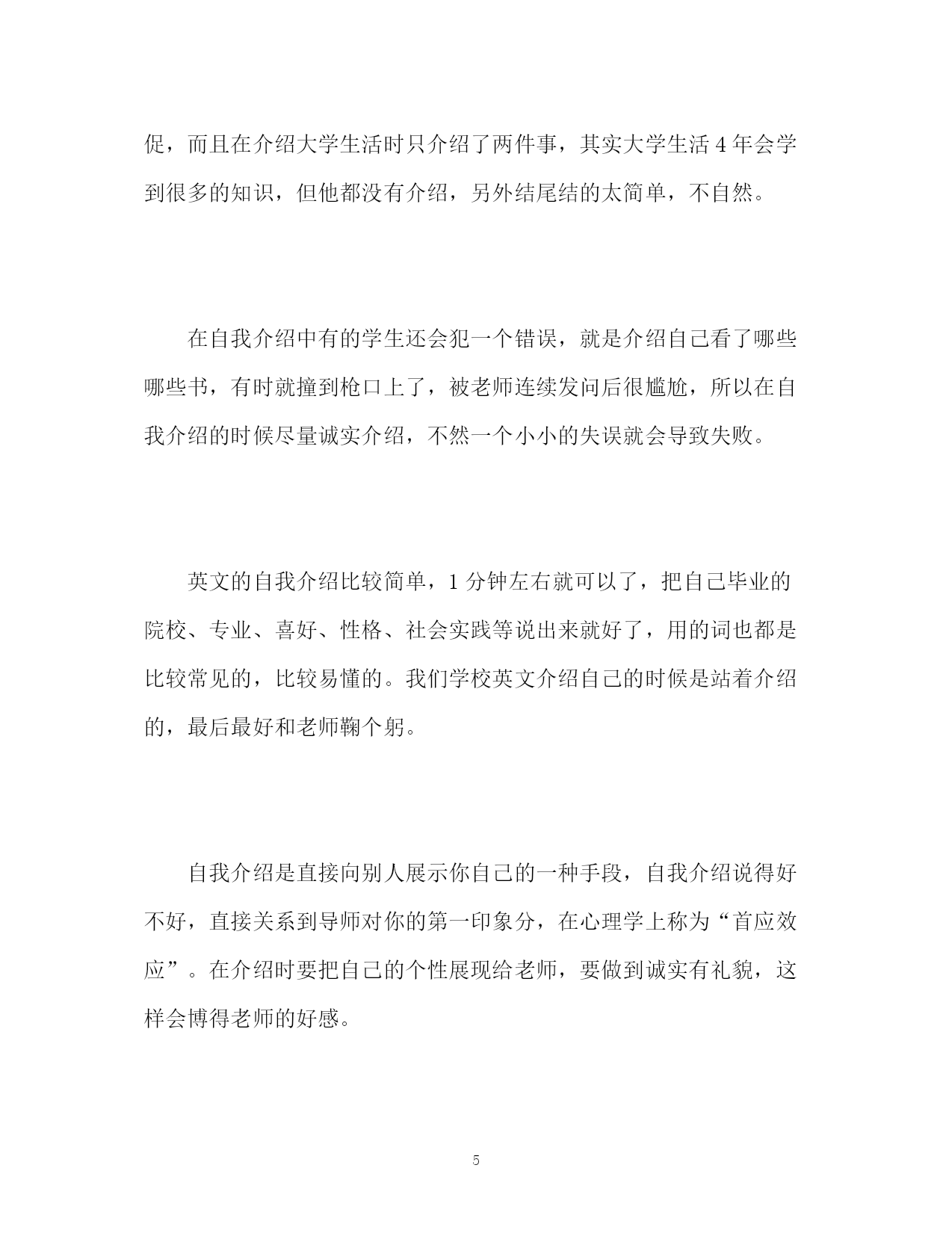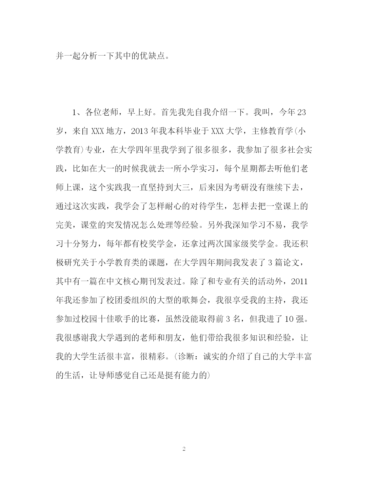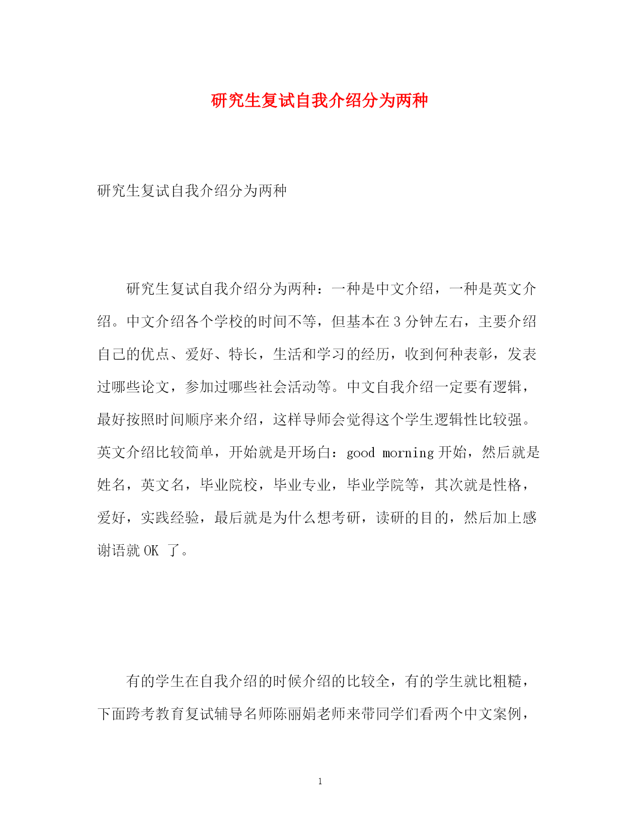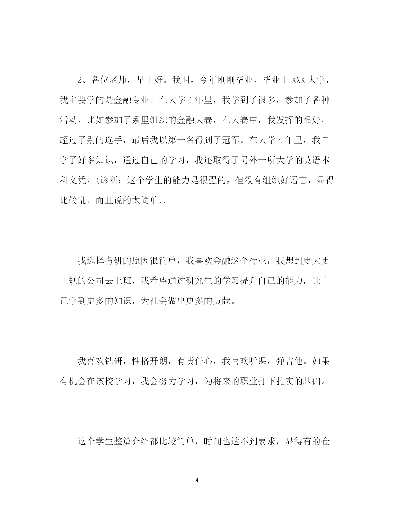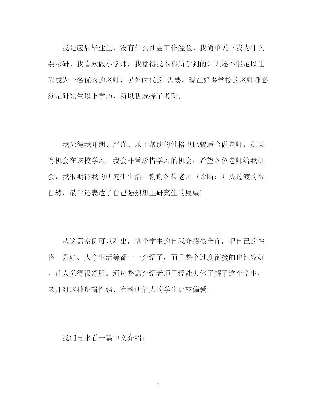 此资料由网络收集而来,如有侵权请告知上传者立即删除。资料共分享,我们负责传递知识。PAGEPAGE6研究生复试自我介绍分为两种研究生复试自我介绍分为两种研究生复试自我介绍分为两种:一种是中文介绍,一种是英文介绍。中文介绍各个学校的时间不等,但基本在3分钟左右,主要介绍自己的优点、爱好、特长,生活和学习的经历,收到何种表彰,发表过哪些论文,参加过哪些社会活动等。中文自我介绍一定要有逻辑,最好按照时间顺序来介绍,这样导师会觉得这个学生逻辑性比较强。英文介绍比较简单,开始就是开场白:goodmorning开始,然后就是姓名,英文名,毕业院校,毕业专业,毕业学院等,其次就是性格,爱好,实践经验,最后就是为什么想考研,读研的目的,然后加上感谢语就OK了。有的学生在自我介绍的时候介绍的比较全,有的学生就比粗糙,下面跨考教育复试辅导名师陈丽娟老师来带同学们看两个中文案例,并一起分析一下其中的优缺点。1、各位老师,早上好。首先我先自我介绍一下。我叫,今年23岁,来自XXX地方,2013年我本科毕业于XXX大学,主修教育学(小学教育)专业,在大学四年里我学到了很多很多,我参加了很多社会实践,比如在大一的时候我就去一所小学实习,每个星期都去听他们老师上课,这个实践我一直坚持到大三,后来因为考研没有继续下去,通过这次实践,我学会了怎样耐心的对待学生,怎样去把一堂课上的完美,课堂的突发情况怎么处理等经验。另外我深知学习不易,我学习十分努力,每年都有校奖学金,还拿过两次国家级奖学金。我还积极研究关于小学教育类的课题,在大学四年期间我发表了3篇论文,其中有一篇在中文核心期刊发表过。除了和专业有关的活动外,2011年我还参加了校团委组织的大型的歌舞会,我很享受我的主持,我还参加过校园十佳歌手的比赛,虽然没能取得前3名,但我进了10强。我很感谢我大学遇到的老师和朋友,他们带给我很多知识和经验,让我的大学生活很丰富,很精彩。(诊断:诚实的介绍了自己的大学丰富的生活,让导师感觉自己还是挺有能力的)我是应届毕业生,没有什么社会工作经验。我简单说下我为什么要考研。我喜欢做小学师,我觉得我本科所学到的知识还不能足以让我成为一名优秀的老师,另外时代的`需要,现在好多学校的老师都必须是研究生以上学历,所以我选择了考研。我觉得我开朗、严谨、乐于帮助的性格也比较适合做老师,如果有机会在该校学习,我会非常珍惜学习的机会,希望各位老师给我机会,我很期待我的研究生生活。谢谢各位老师!(诊断:开头过渡的很自然,最后还表达了自己强烈想上研究生的愿望)从这篇案例可以看出,这个学生的自我介绍很全面,把自己的性格、爱好、大学生活等都一一介绍了,而且整个过度衔接的也比较好,让人觉得很舒服。通过整篇介绍老师已经能大体了解了这个学生,老师对这种逻辑性强、有科研能力的学生比较偏爱。我们再来看一篇中文介绍:2、各位老师,早上好。我叫,今年刚刚毕业,毕业于XXX大学,我主要学的是金融专业。在大学4年里,我学到了很多,参加了各种活动,比如参加了系里组织的金融大赛,在大赛中,我发挥的很好,超过了别的选手,最后我以第一名得到了冠军。在大学4年里,我自学了好多知识,通过自己的学习,我还取得了另外一所大学的英语本科文凭。(诊断:这个学生的能力是很强的,但没有组织好语言,显得比较乱,而且说的太简单)。我选择考研的原因很简单,我喜欢金融这个行业,我想到更大更正规的公司去上班,我希望通过研究生的学习提升自己的能力,让自己学到更多的知识,为社会做出更多的贡献。我喜欢钻研,性格开朗,有责任心,我喜欢听课,弹吉他。如果有机会在该校学习,我会努力学习,为将来的职业打下扎实的基础。这个学生整篇介绍都比较简单,时间也达不到要求,显得有的仓促,而且在介绍大学生活时只介绍了两件事,其实大学生活4年会学到很多的知识,但他都没有介绍,另外结尾结的太简单,不自然。在自我介绍中有的学生还会犯一个错误,就是介绍自己看了哪些哪些书,有时就撞到枪口上了,被老师连续发问后很尴尬,所以在自我介绍的时候尽量诚实介绍,不然一个小小的失误就会导致失败。英文的自我介绍比较简单,1分钟左右就可以了,把自己毕业的院校、专业、喜好、性格、社会实践等说出来就好了,用的词也都是比较常见的,比较易懂的。我们学校英文介绍自己的时候是站着介绍的,最后最好和老师鞠个躬。自我介绍是直接向别人展示你自己的一种手段,自我介绍说得好不好,直接关系到导师对你的第一印象分,在心理学上称为“首应效应”。在介绍时要把自己的个性展现给老师,要做到诚实有礼貌,这样会博得老师的好感。